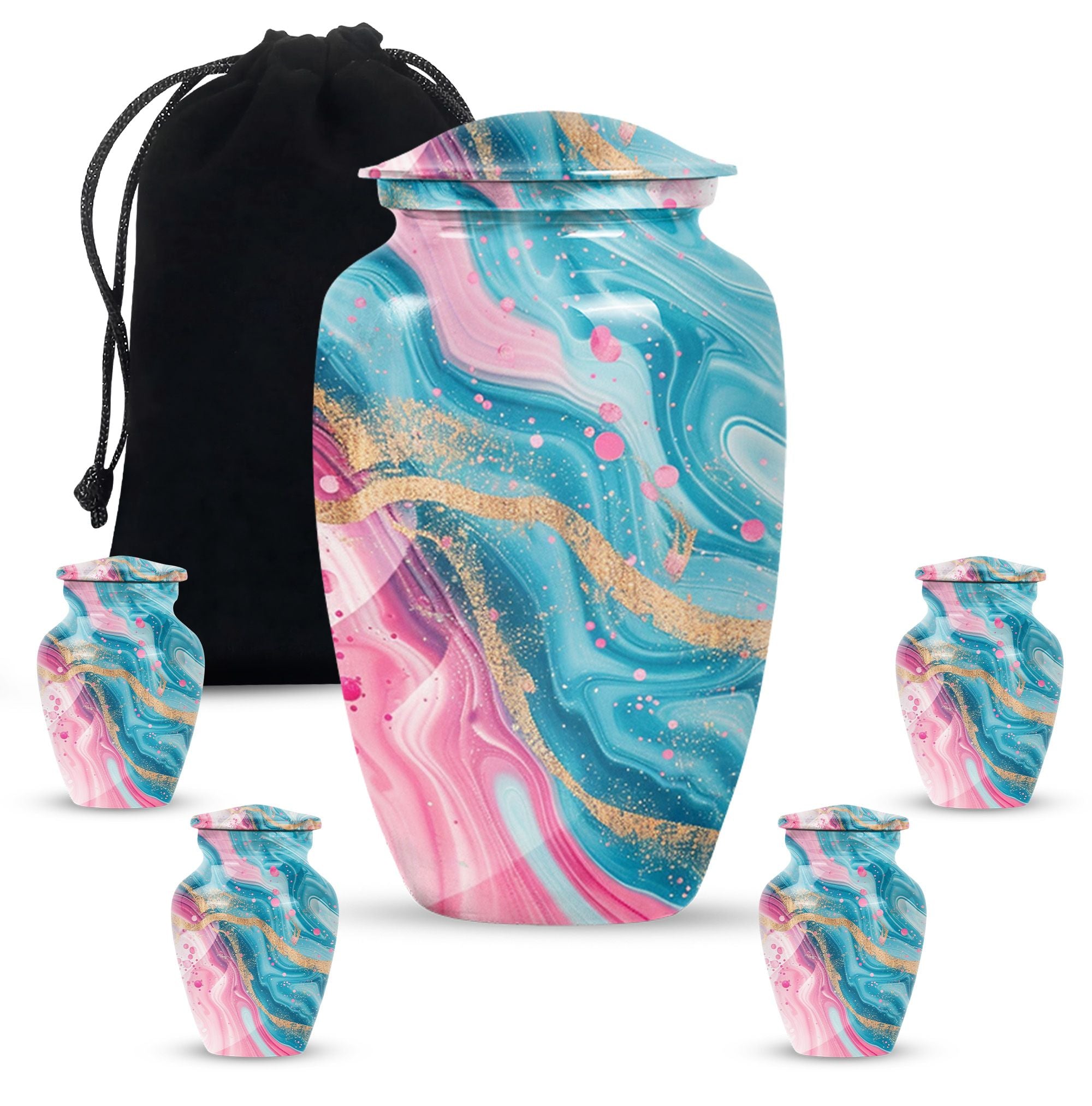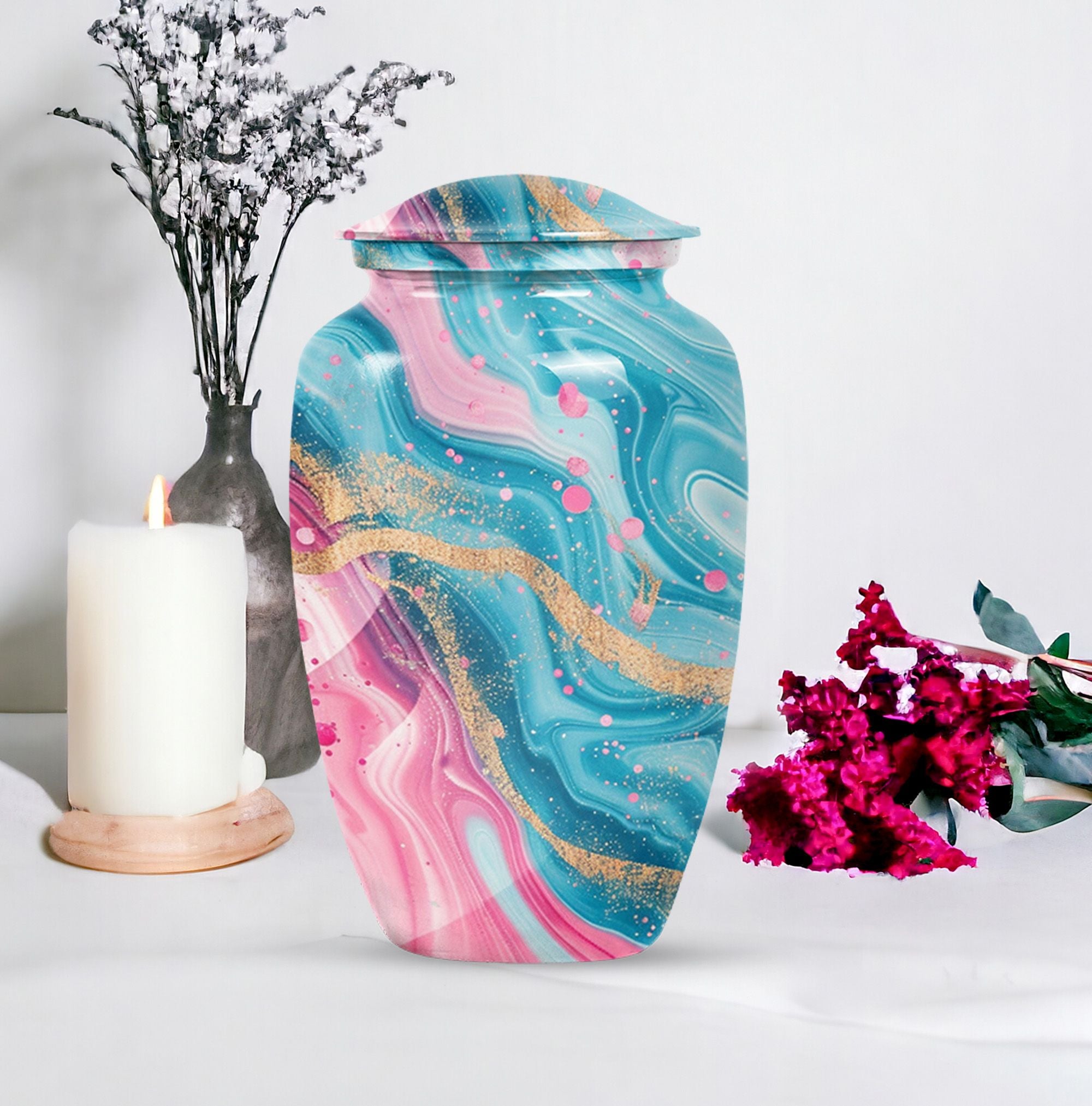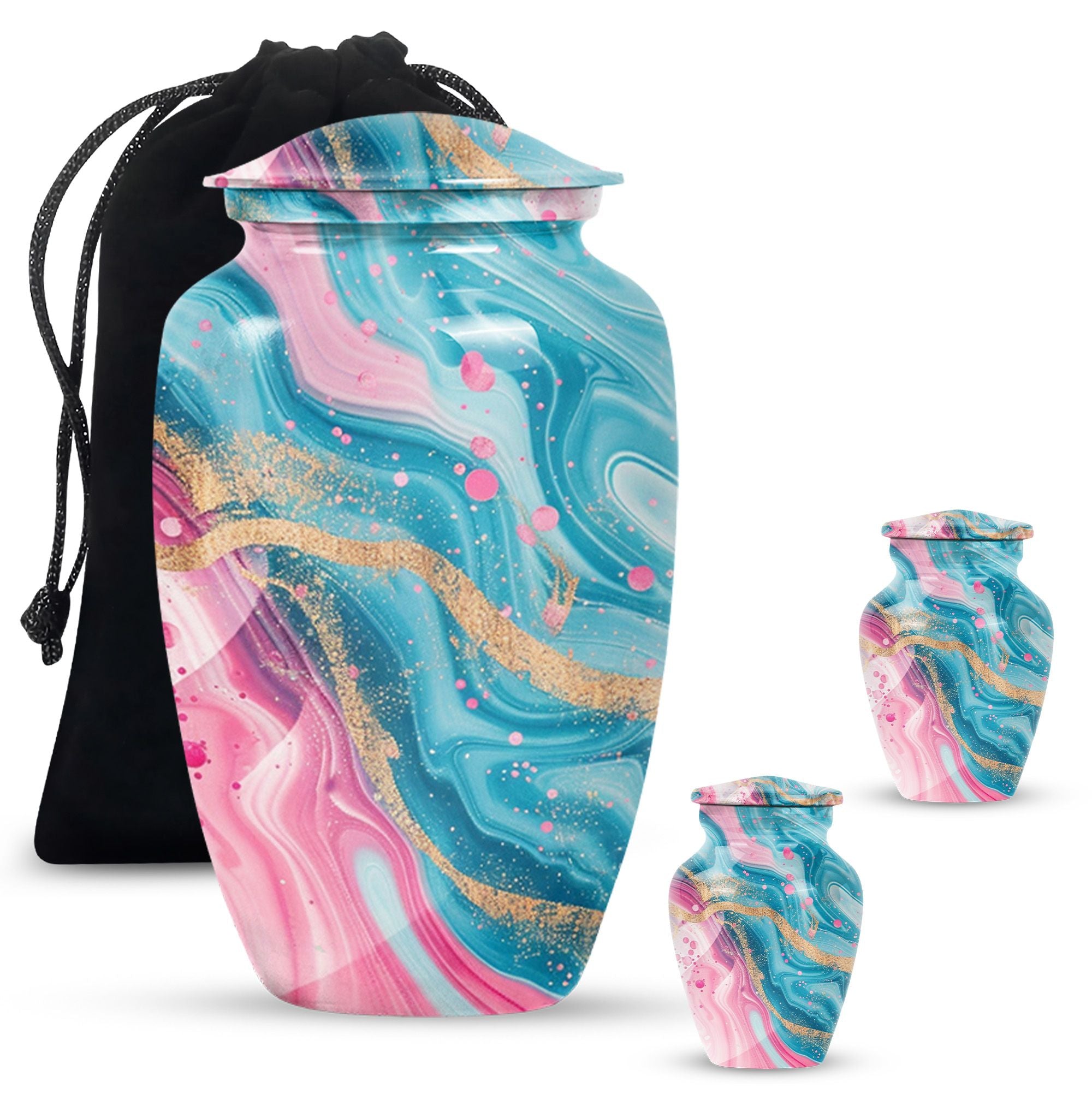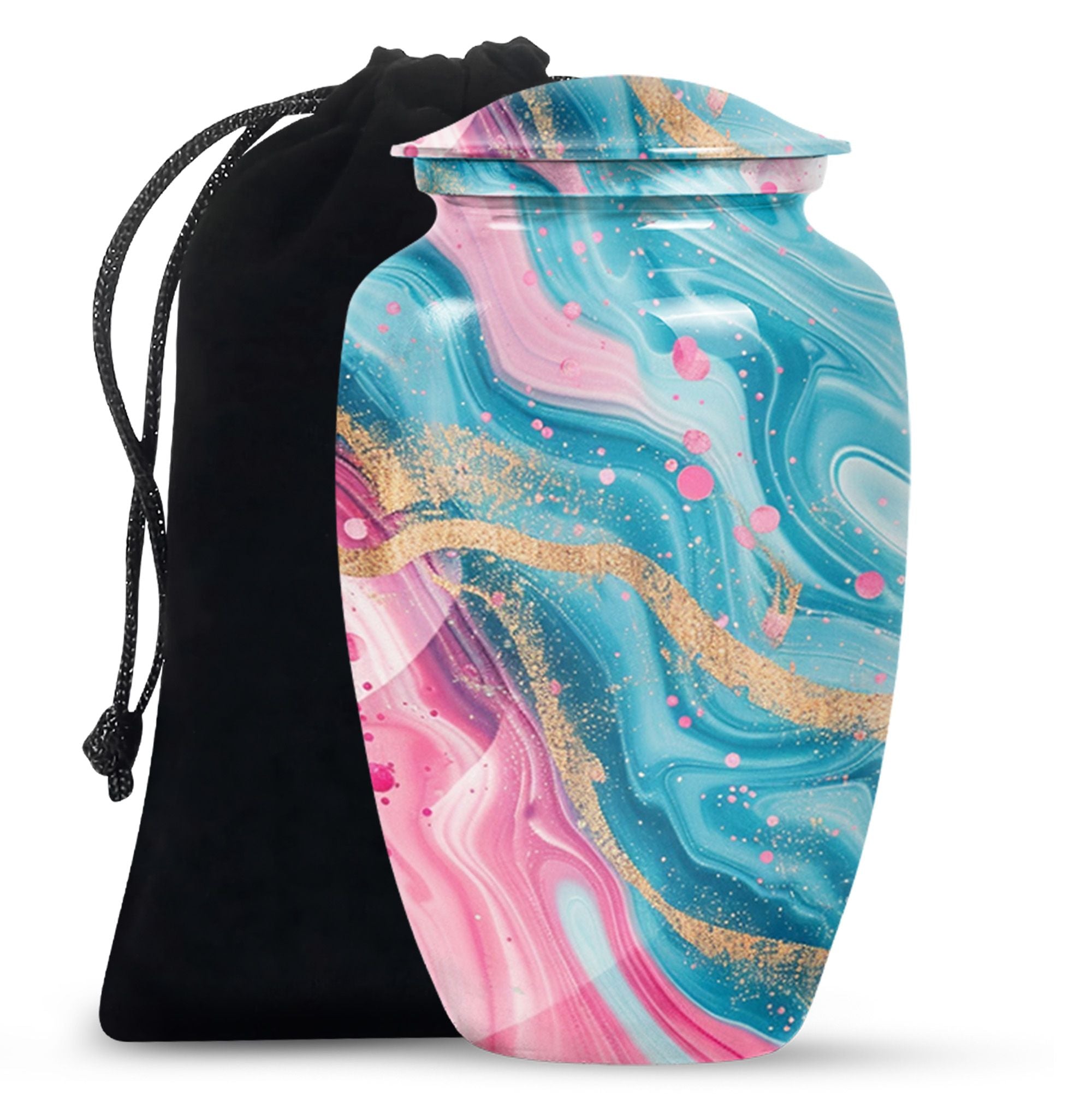 Experience lasting peace with our Abstract Urn. Serving as the perfect medium for a loved one's memorial, this 10-inch Aluminium urn is beauty embodied. More than just an object, it's a statement of remembrance, ensuring that your loved one is as much a part of your home as they were in life. Weighing in a solid 3.3 pounds, the urn is substantial yet not overwhelming, and can accommodate up to 200 cubic inches of ashes. Given its dimensions, it classifies as a Large Urn, and comes with a velvet pouch for secure containment of the cremated remains. Add that personal touch and keep your memories close with the option of engraving names on its surface. Our abstract urn stands as a fitting tribute, inviting reflection and providing comfort. Infuse your commemoration with dignity and reverence, nestled in the rich traditions of memorial urns. This item is an ideal choice for those seeking ash burial urns, funeral burial urns, or cremation urns for human ashes. The Abstract Urn is more than just a resting place. It's a symbol, a promise of togetherness beyond the physical realm. Note: This product does not include its design as part of its attributes.