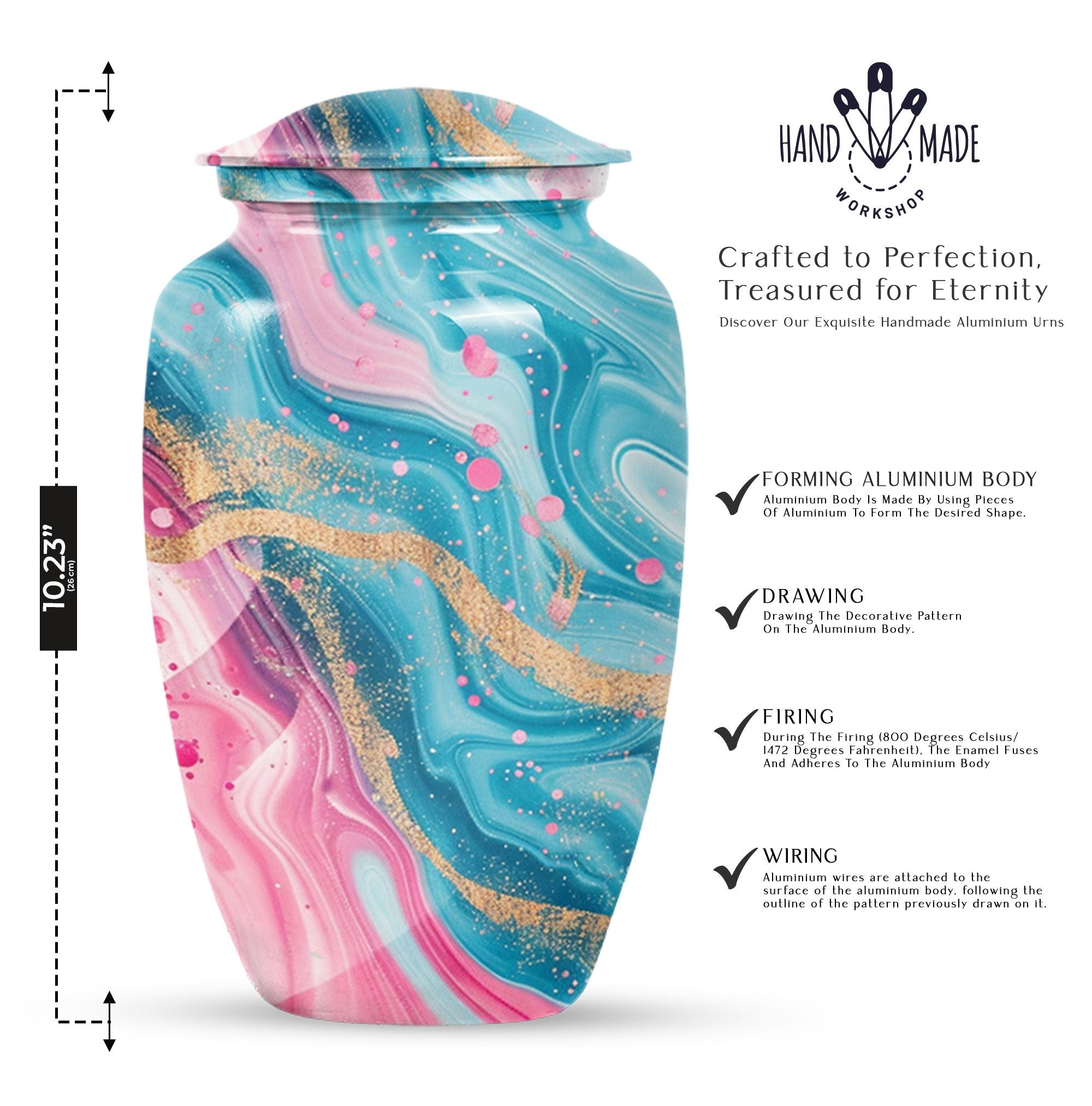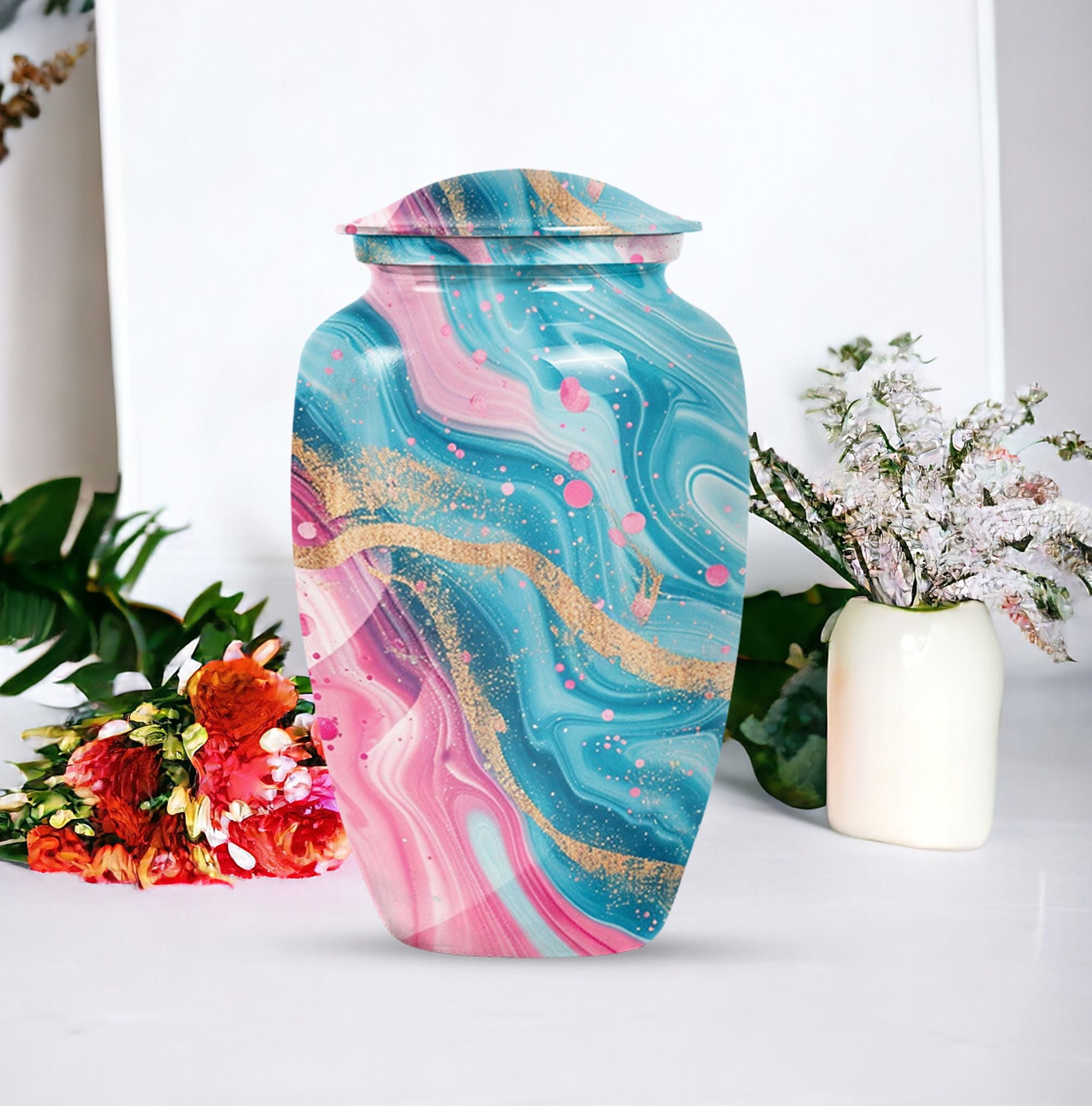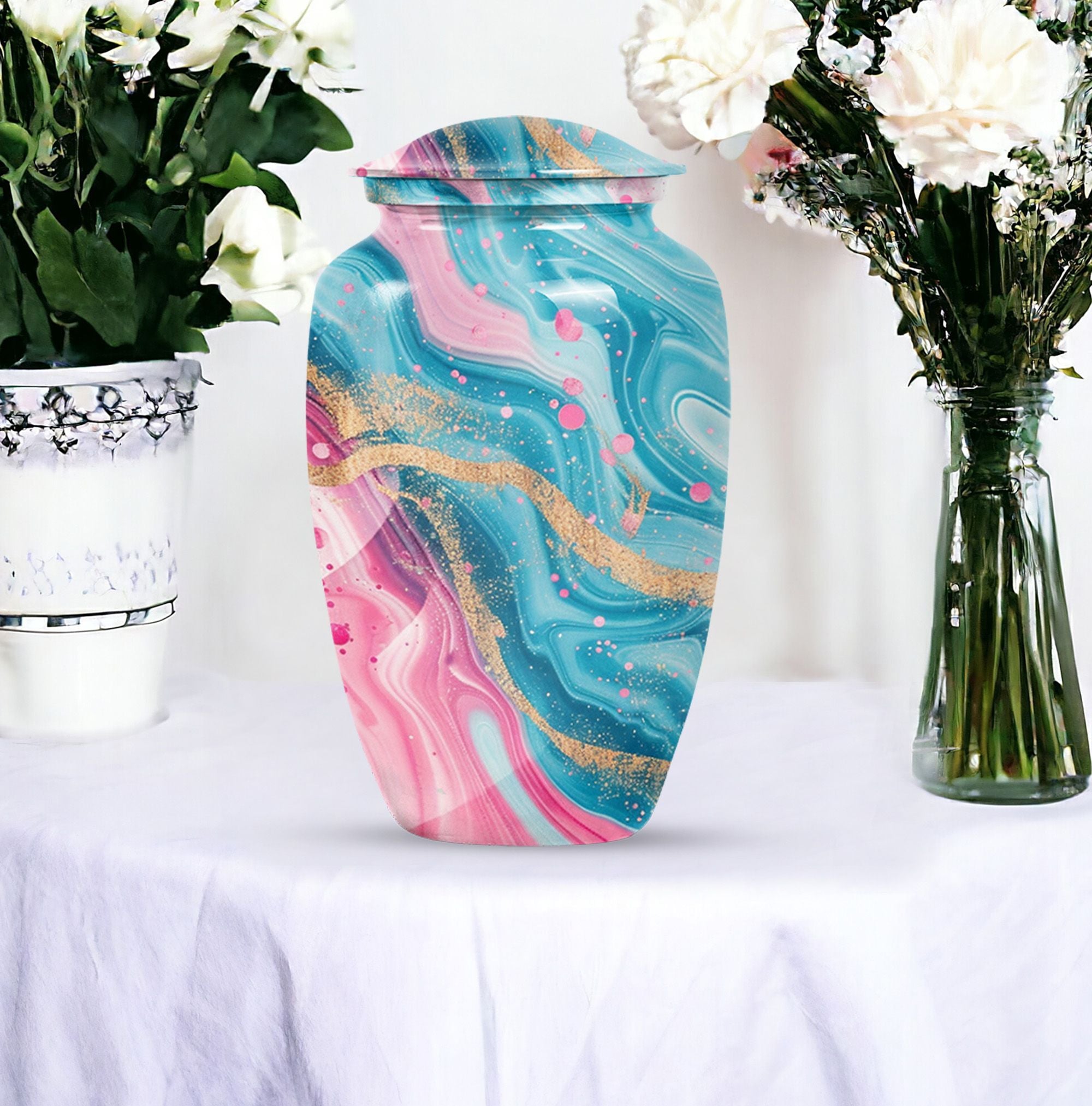 Experience lasting peace with our Abstract Urn. Serving as the perfect medium for a loved one's memorial, this 10-inch Aluminium urn is beauty embodied. More than just an object, it's a statement of remembrance, ensuring that your loved one is as much a part of your home as they were in life. Weighing in a solid 3.3 pounds, the urn is substantial yet not overwhelming, and can accommodate up to 200 cubic inches of ashes. Given its dimensions, it classifies as a Large Urn, and comes with a velvet pouch for secure containment of the cremated remains. Add that personal touch and keep your memories close with the option of engraving names on its surface. Our abstract urn stands as a fitting tribute, inviting reflection and providing comfort. Infuse your commemoration with dignity and reverence, nestled in the rich traditions of memorial urns. This item is an ideal choice for those seeking ash burial urns, funeral burial urns, or cremation urns for human ashes. The Abstract Urn is more than just a resting place. It's a symbol, a promise of togetherness beyond the physical realm. Note: This product does not include its design as part of its attributes.