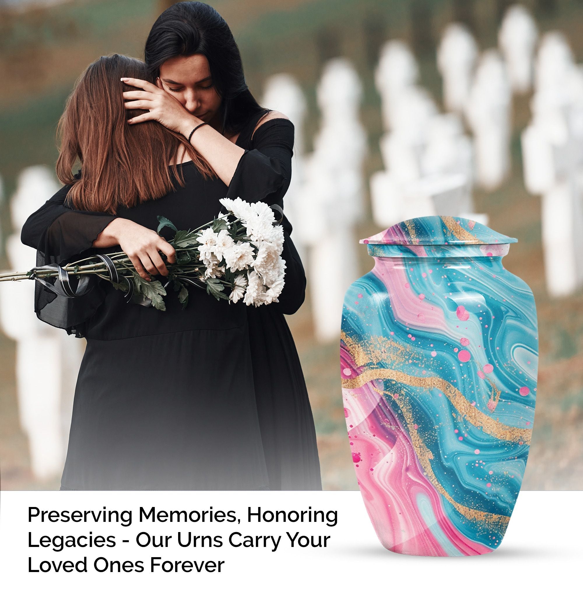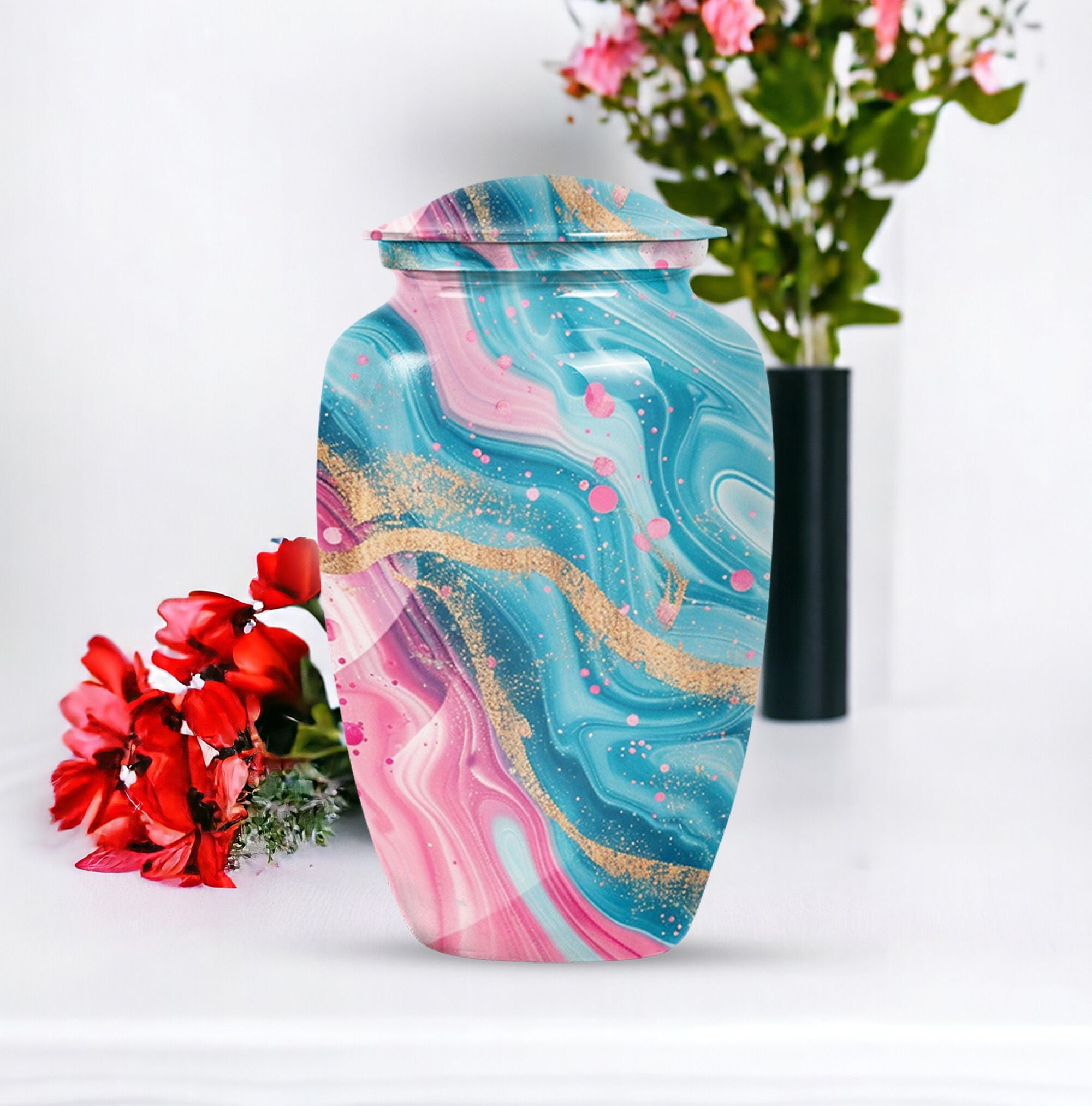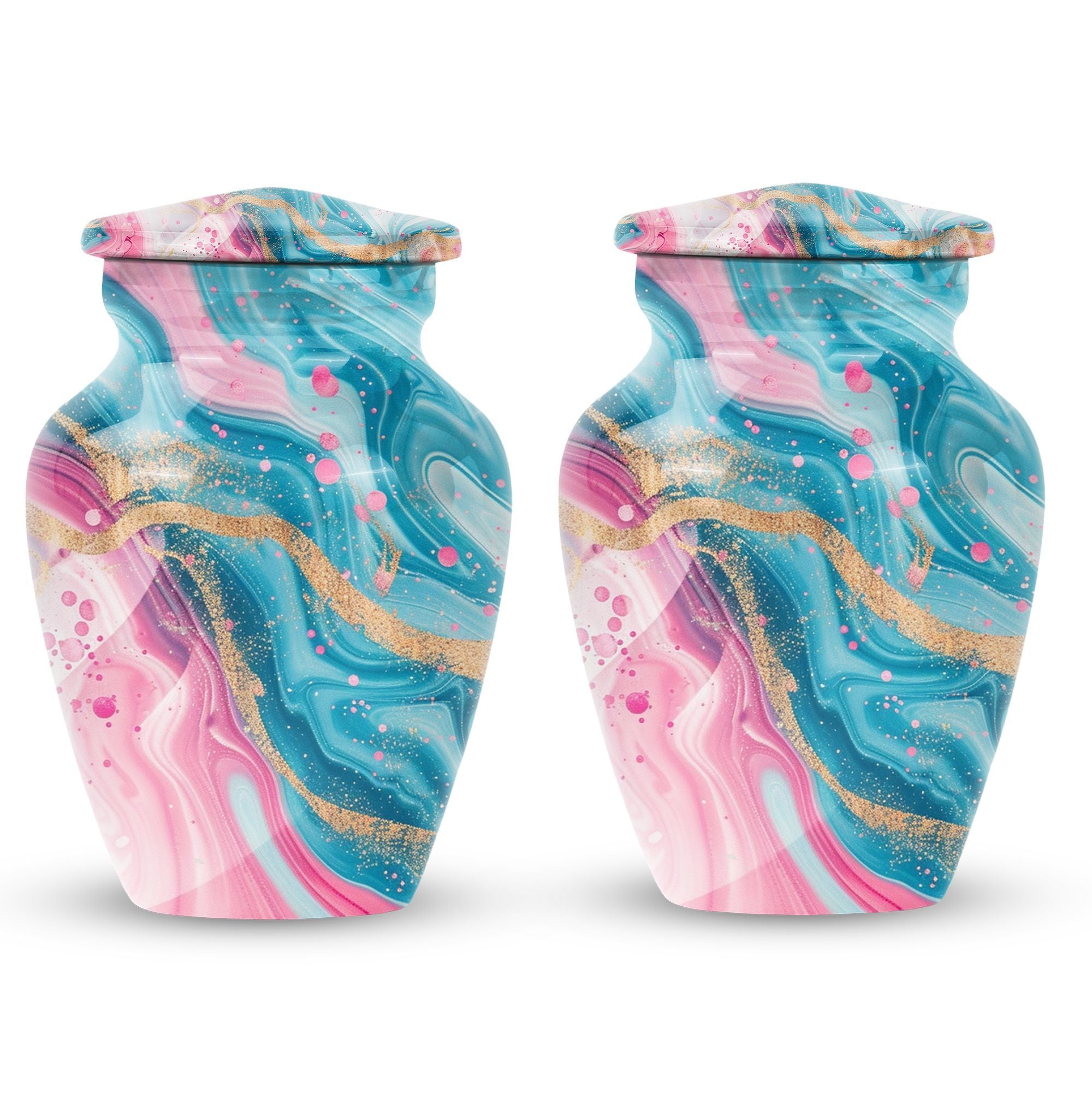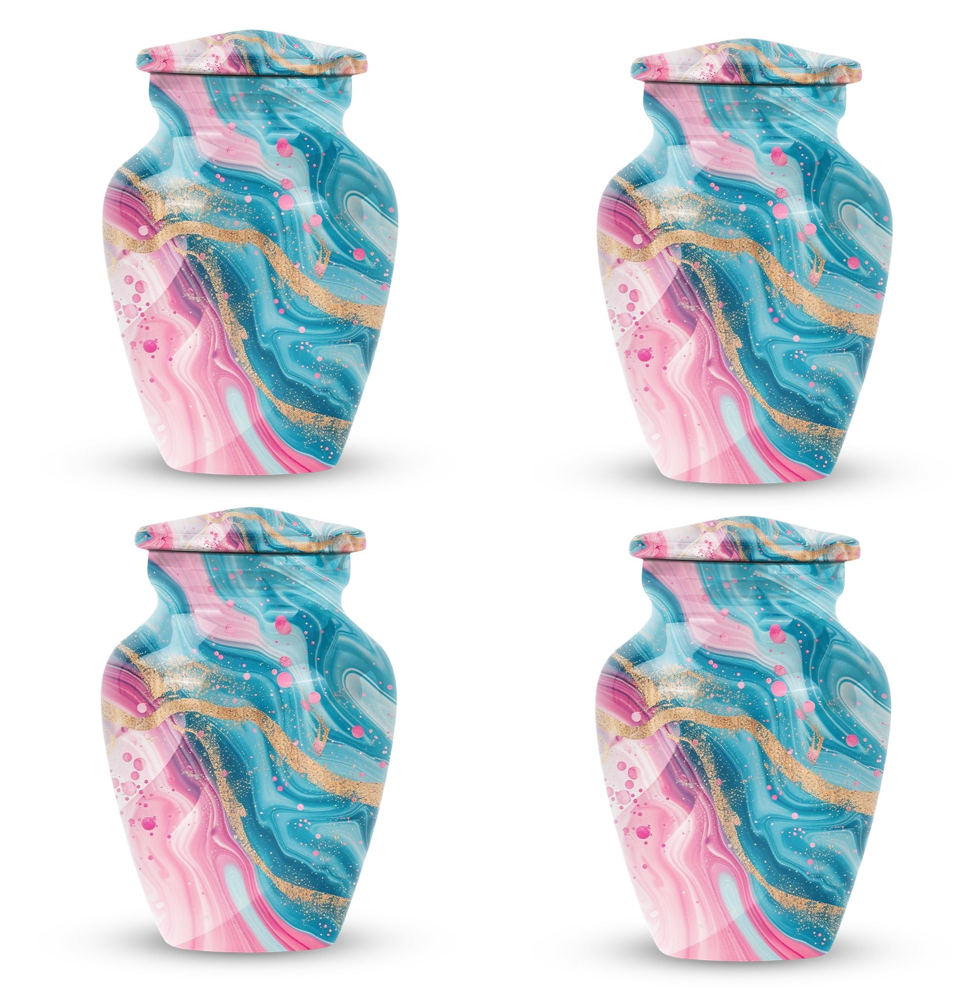 Experience lasting peace with our Abstract Urn. Serving as the perfect medium for a loved one's memorial, this 10-inch Aluminium urn is beauty embodied. More than just an object, it's a statement of remembrance, ensuring that your loved one is as much a part of your home as they were in life. Weighing in a solid 3.3 pounds, the urn is substantial yet not overwhelming, and can accommodate up to 200 cubic inches of ashes. Given its dimensions, it classifies as a Large Urn, and comes with a velvet pouch for secure containment of the cremated remains. Add that personal touch and keep your memories close with the option of engraving names on its surface. Our abstract urn stands as a fitting tribute, inviting reflection and providing comfort. Infuse your commemoration with dignity and reverence, nestled in the rich traditions of memorial urns. This item is an ideal choice for those seeking ash burial urns, funeral burial urns, or cremation urns for human ashes. The Abstract Urn is more than just a resting place. It's a symbol, a promise of togetherness beyond the physical realm. Note: This product does not include its design as part of its attributes.