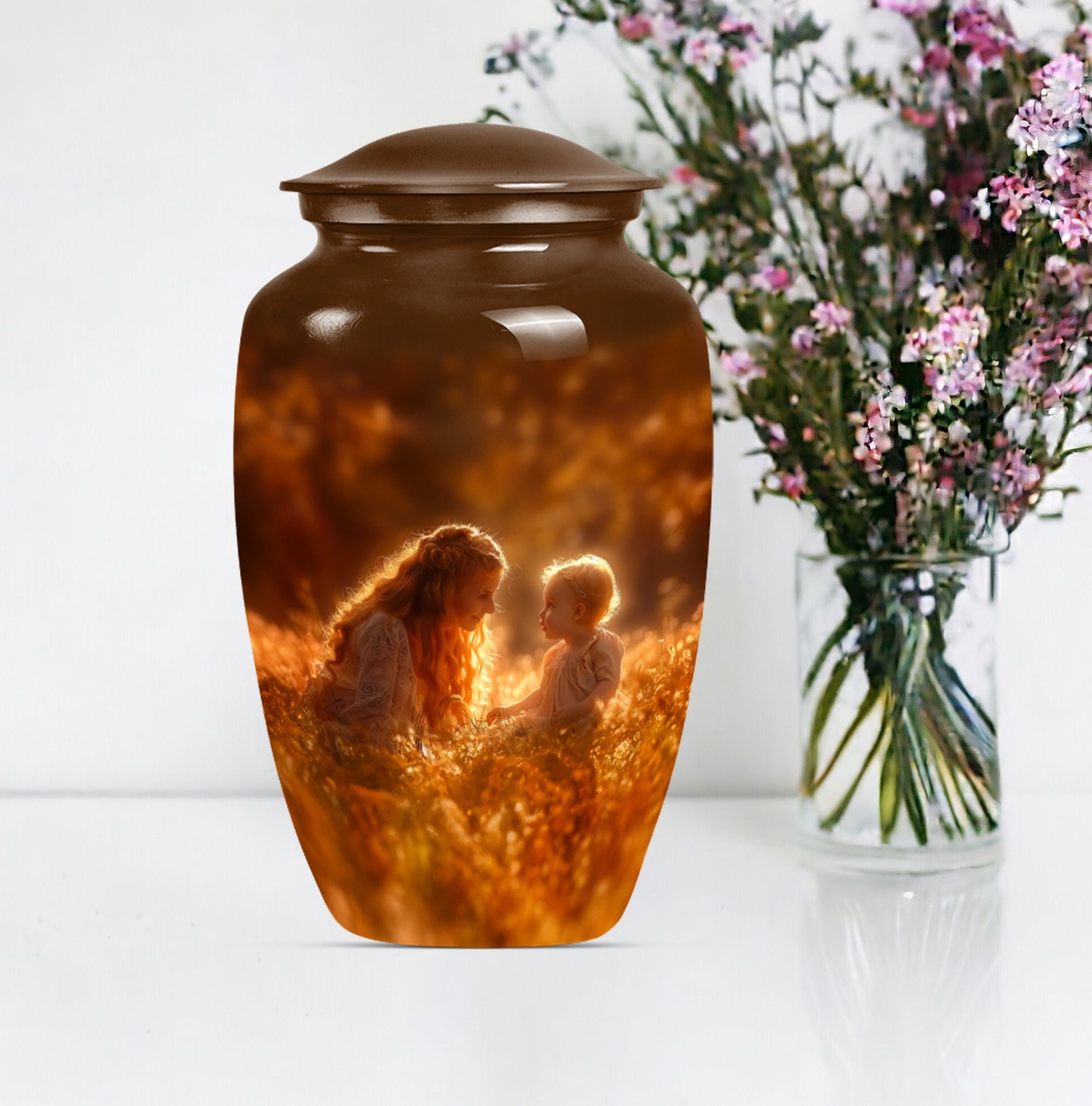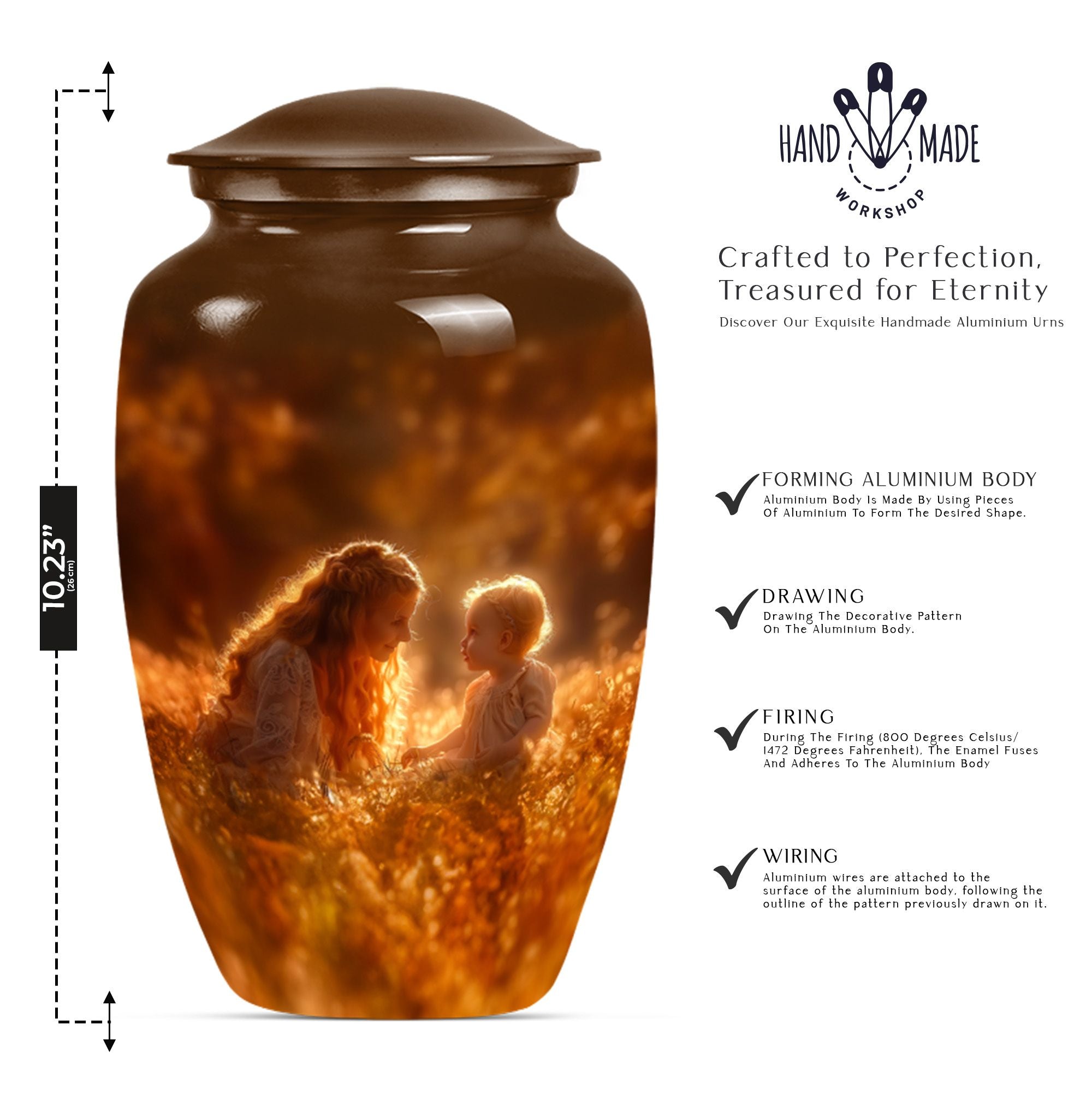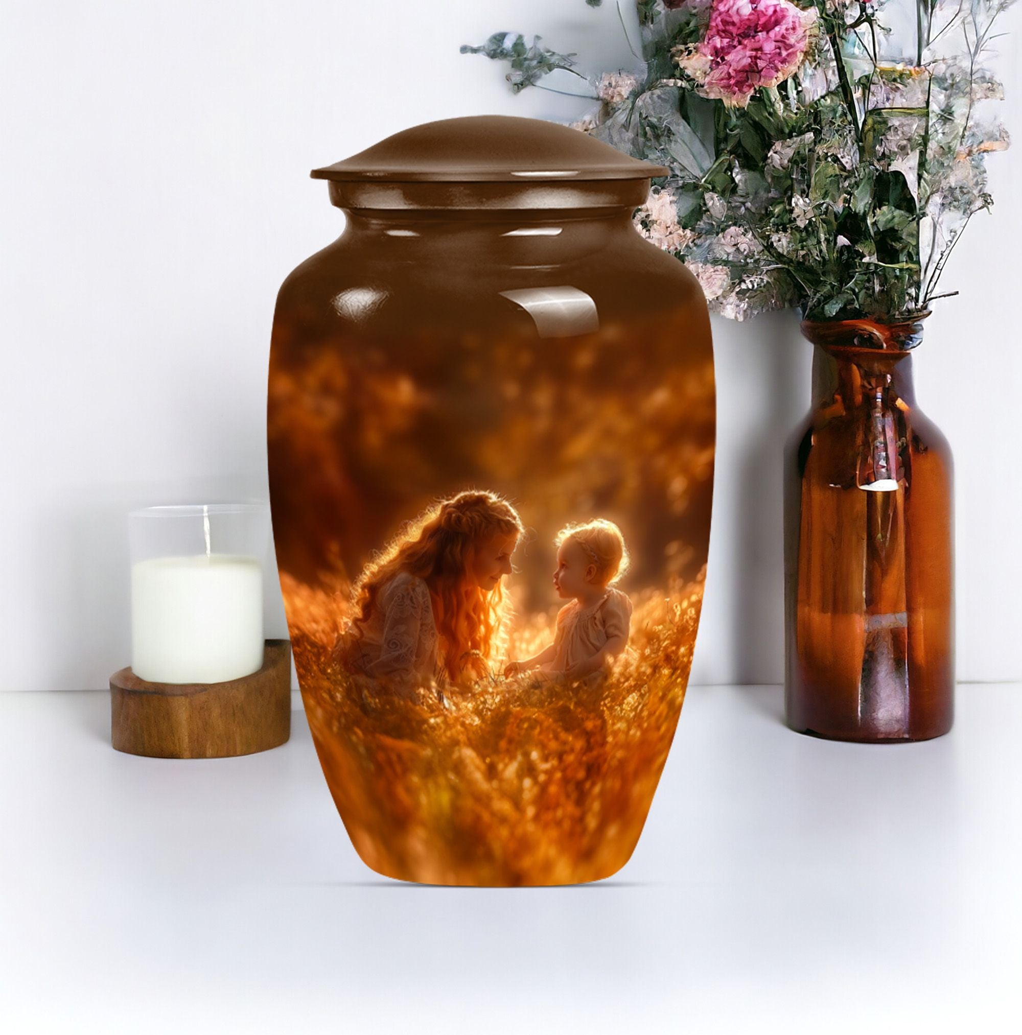 Honor the memory of your beloved mother with this uniquely designed 10 inch Aluminium cremation urn, designed for those seeking to memorialize their loved ones in a special and meaningful way. With a weight of 3.3 lbs and dimensions of 10 inches in height, this large urn offers a capacity of 200 cubic inches, ideally suited for storing human ashes. The distinct abstract theme beautifully complements the classy, timeless appeal of the urn. The product package also includes a soft velvet pouch for respectable containment of ashes. Make it more personal by engraving names on this masterpiece, adding a touch of intimacy to the memorial. From mother urn to burial cremation urn, this product offers an exclusive platform for keeping your loved one's memory burning bright. For exceptional, solid, and exquisite memorial urns for mom or any adult, this cremation urn provides an incomparable touch of dignity, respect, and love.