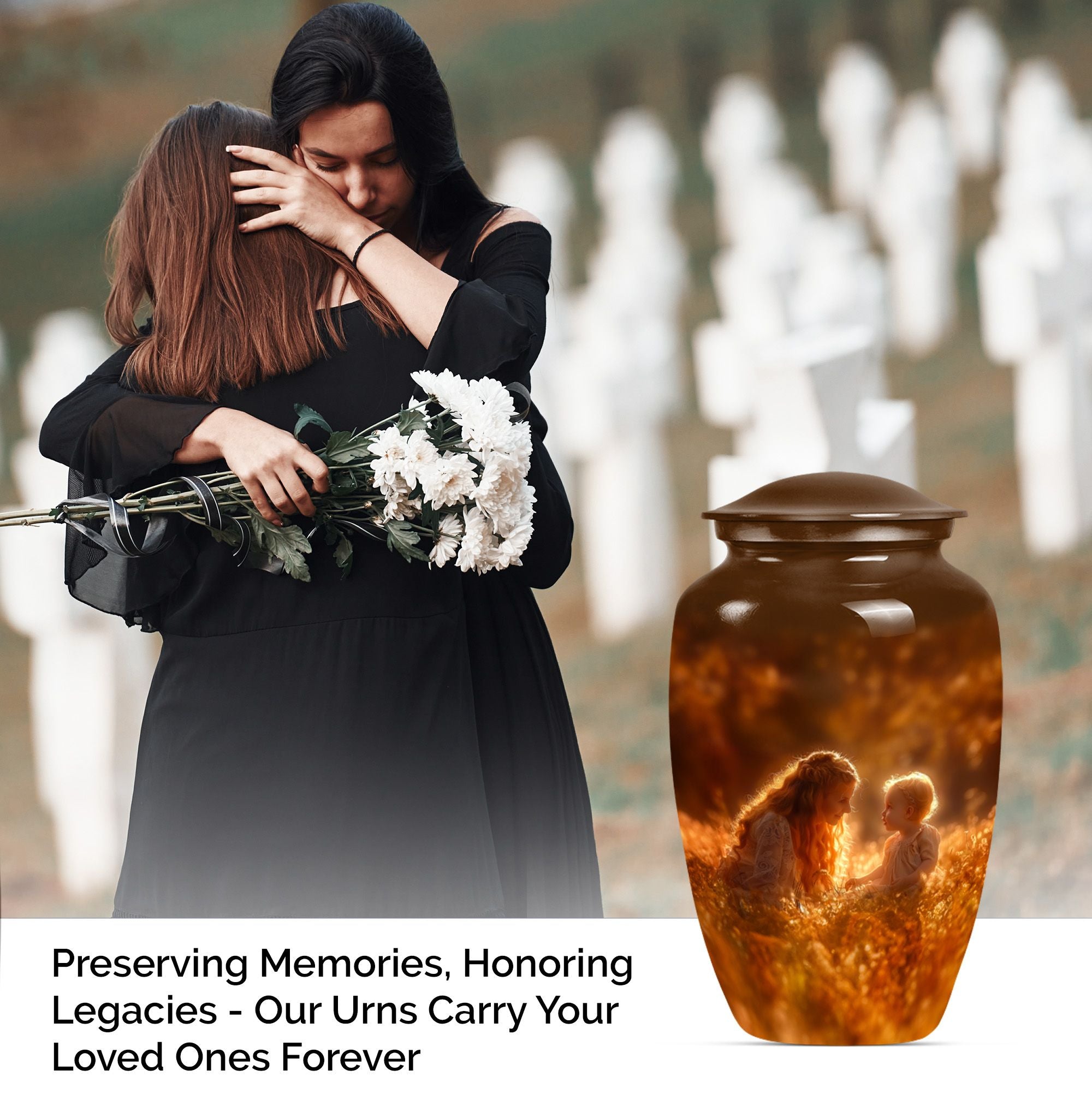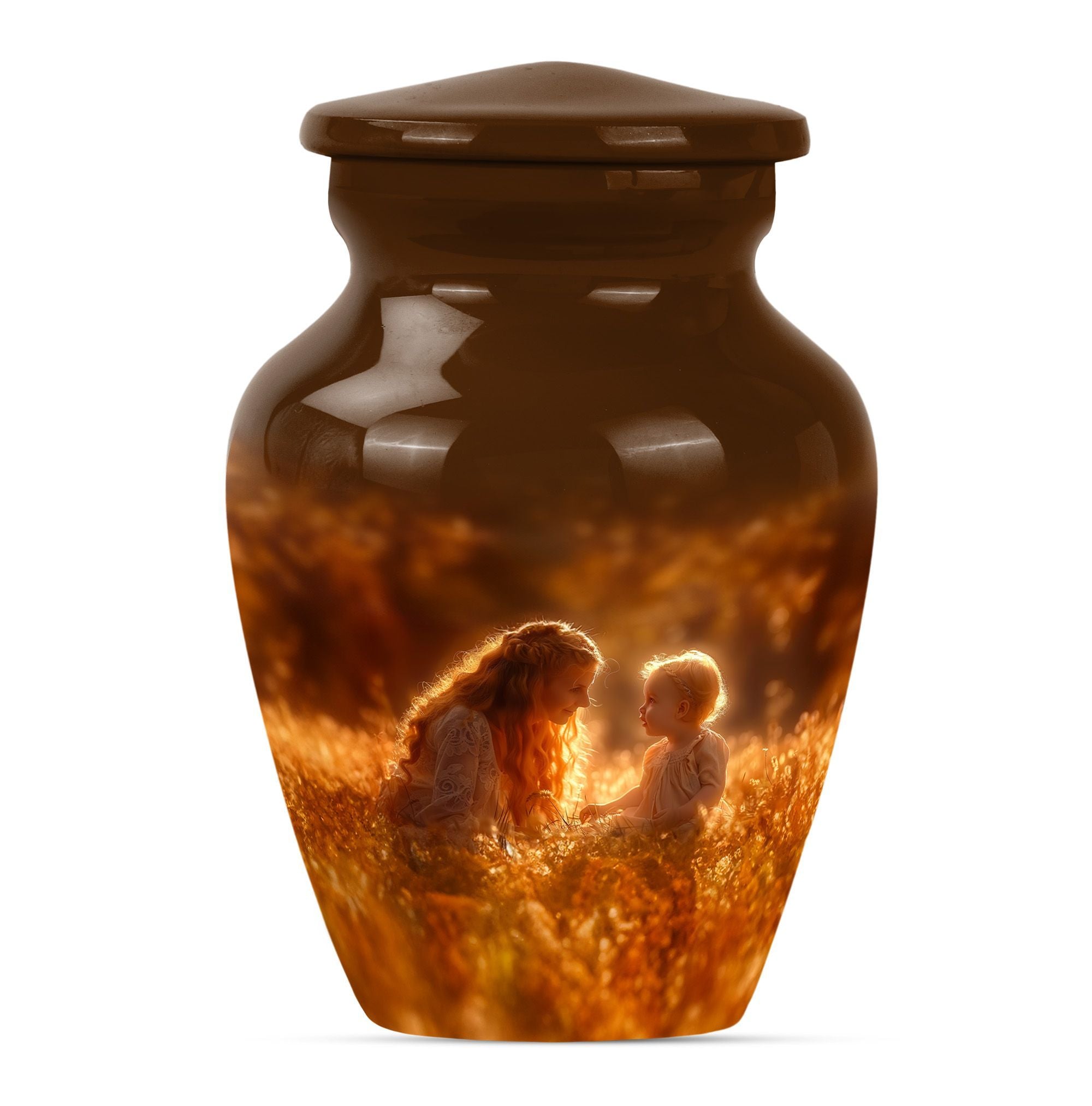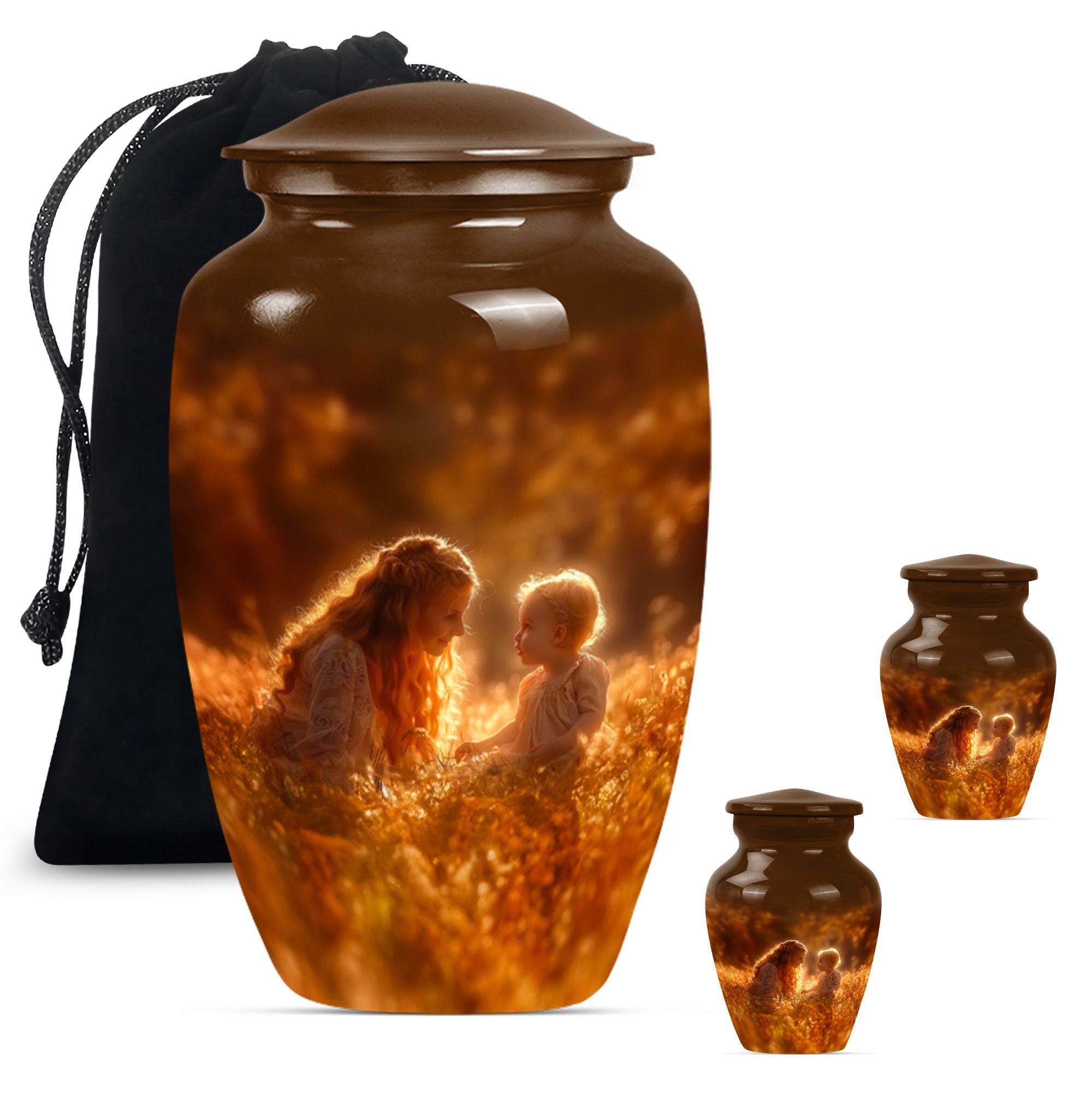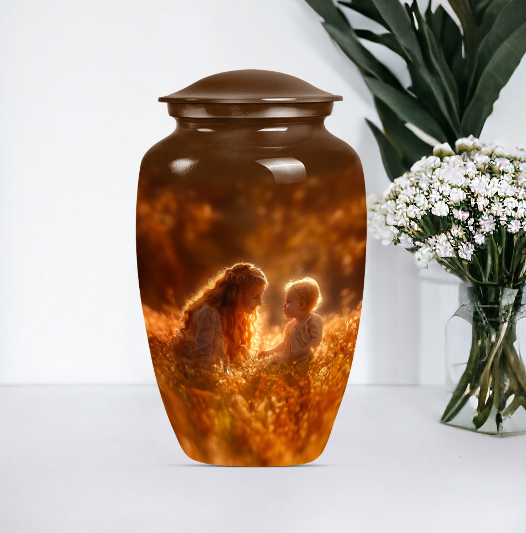 Honor the memory of your beloved mother with this uniquely designed 10 inch Aluminium cremation urn, designed for those seeking to memorialize their loved ones in a special and meaningful way. With a weight of 3.3 lbs and dimensions of 10 inches in height, this large urn offers a capacity of 200 cubic inches, ideally suited for storing human ashes. The distinct abstract theme beautifully complements the classy, timeless appeal of the urn. The product package also includes a soft velvet pouch for respectable containment of ashes. Make it more personal by engraving names on this masterpiece, adding a touch of intimacy to the memorial. From mother urn to burial cremation urn, this product offers an exclusive platform for keeping your loved one's memory burning bright. For exceptional, solid, and exquisite memorial urns for mom or any adult, this cremation urn provides an incomparable touch of dignity, respect, and love.