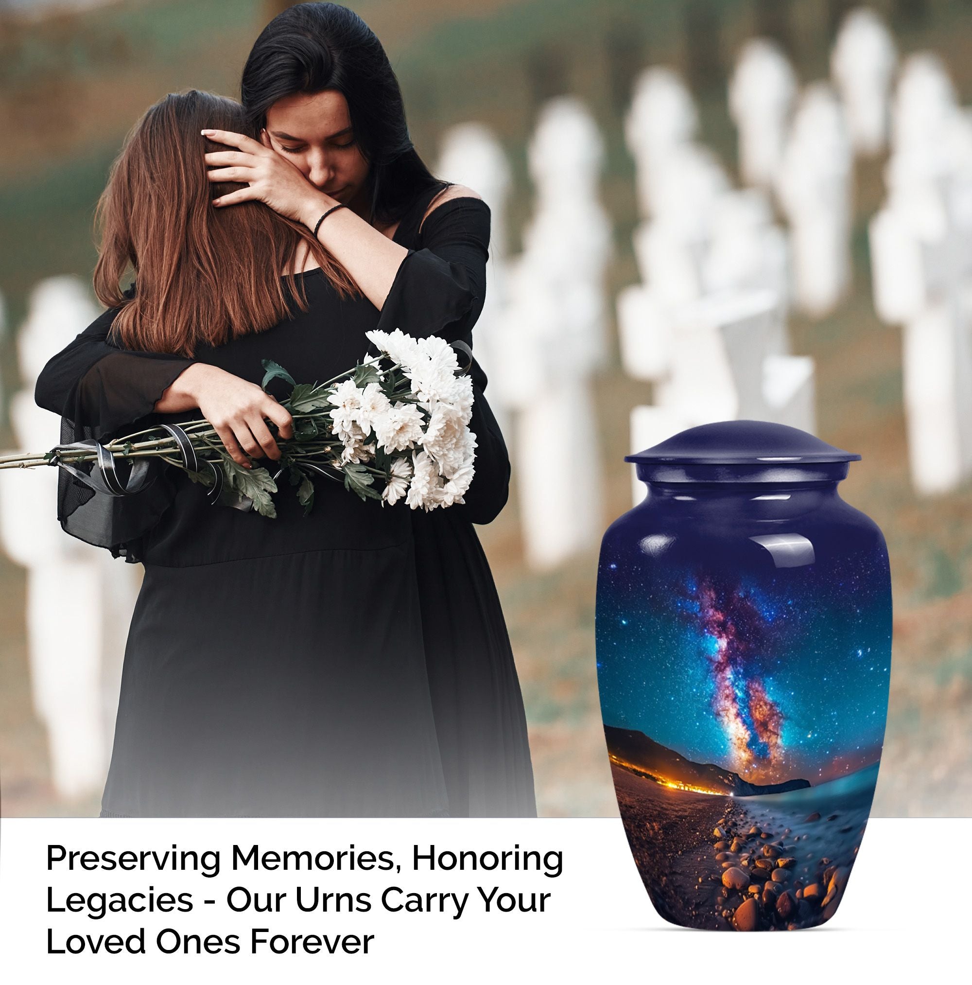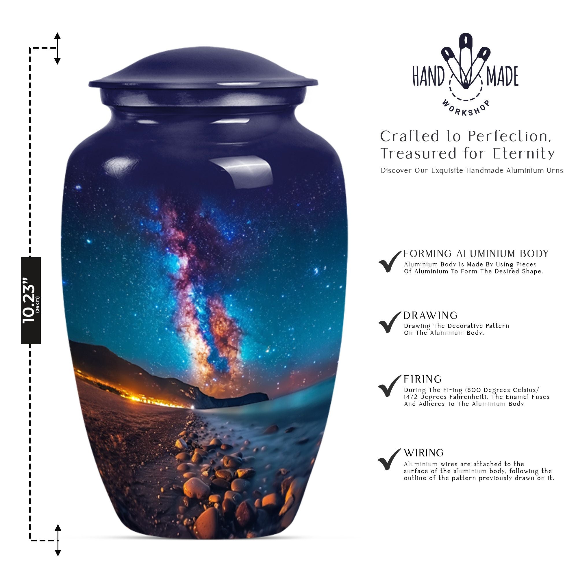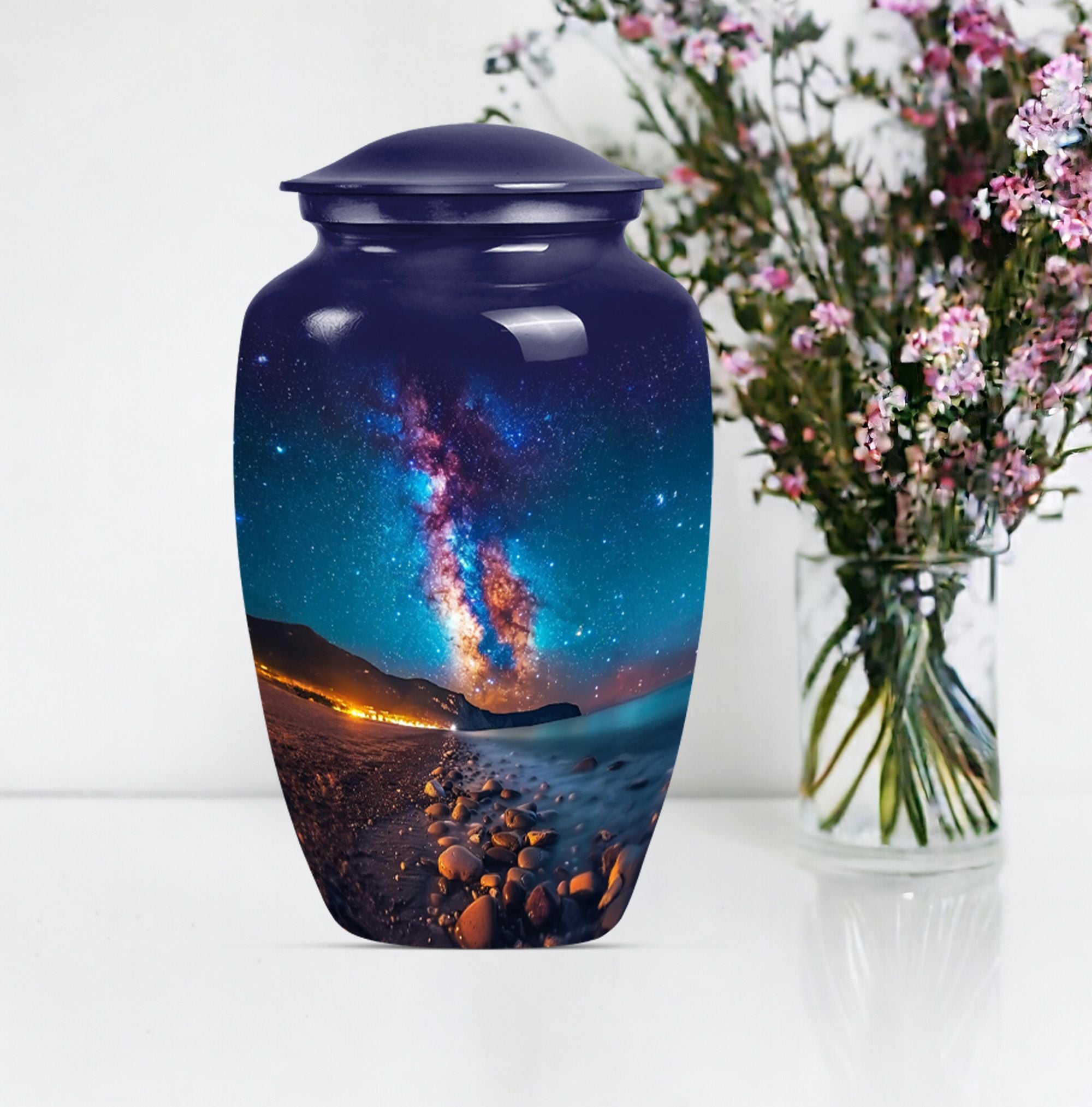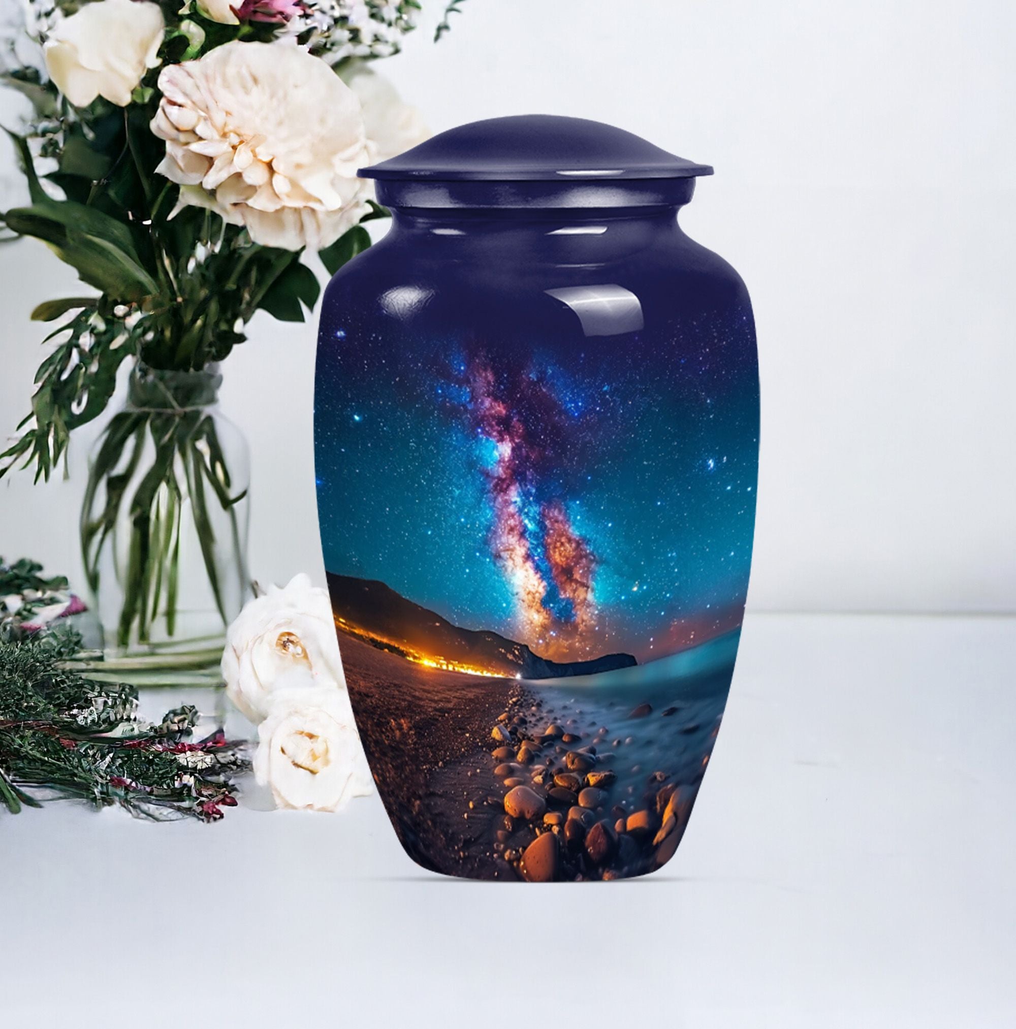 One's journey in this temporal world may cease, but the memories remain forever. The 'Classic Urn' is a celebration of those cherished moments - a respectful and secure memorial for your beloved. The 10-inch height makes this large urn ample enough to hold 200 cubic inches of ashes, and it weighs a substantial 3.3 pounds indicating its robust construction. Its abstract theme provides an understated yet striking reminder of the cycle of life. This urn, constructed from long-lasting aluminium, comes with personalised engraving options for that uniquely touching tribute to your departed. A supplementary velvet pouch offers discreet inclusion of ashes. Keep in mind, 'Milkyway Urn' or 'funeral funeral urns for human ashes adult' when searching online. Some use the term 'memorial urn for burial in the ground' or 'human ash urn ash adult', while 'cremation rings for ashes' and 'large metal urn for ashes' are also common terms associated with this item. Please note that our urn design excludes the 'Design' attribute. Maintain your loved one's memory in an honorable, dignified manner with our classic urn.