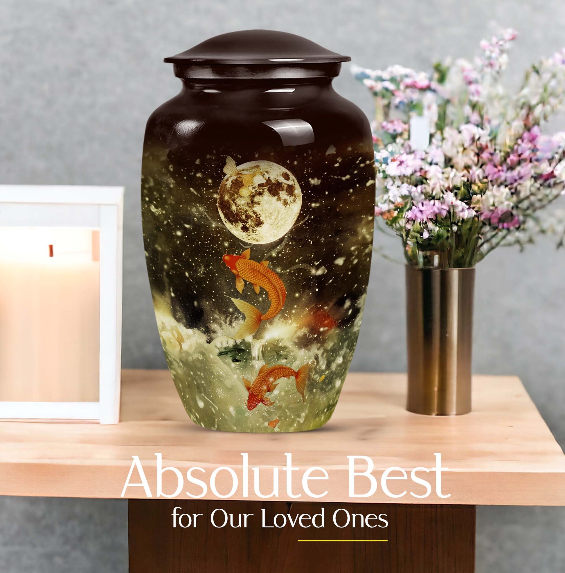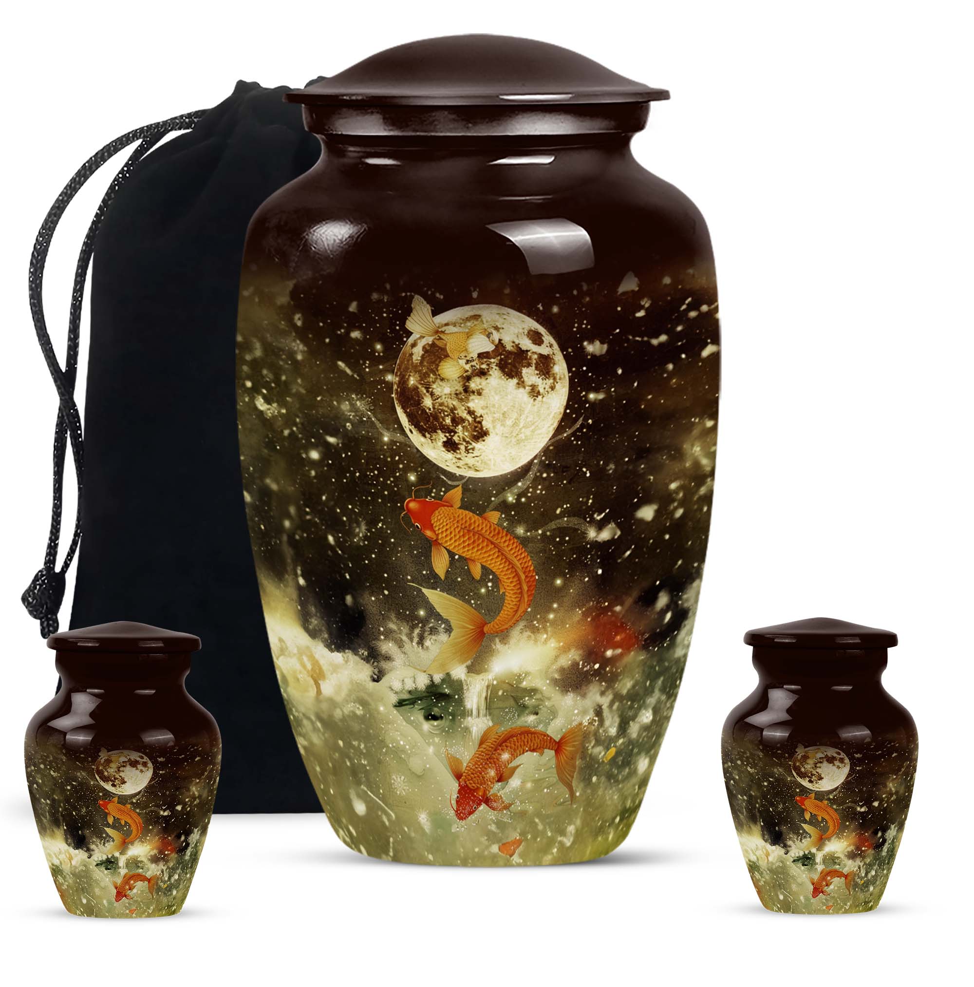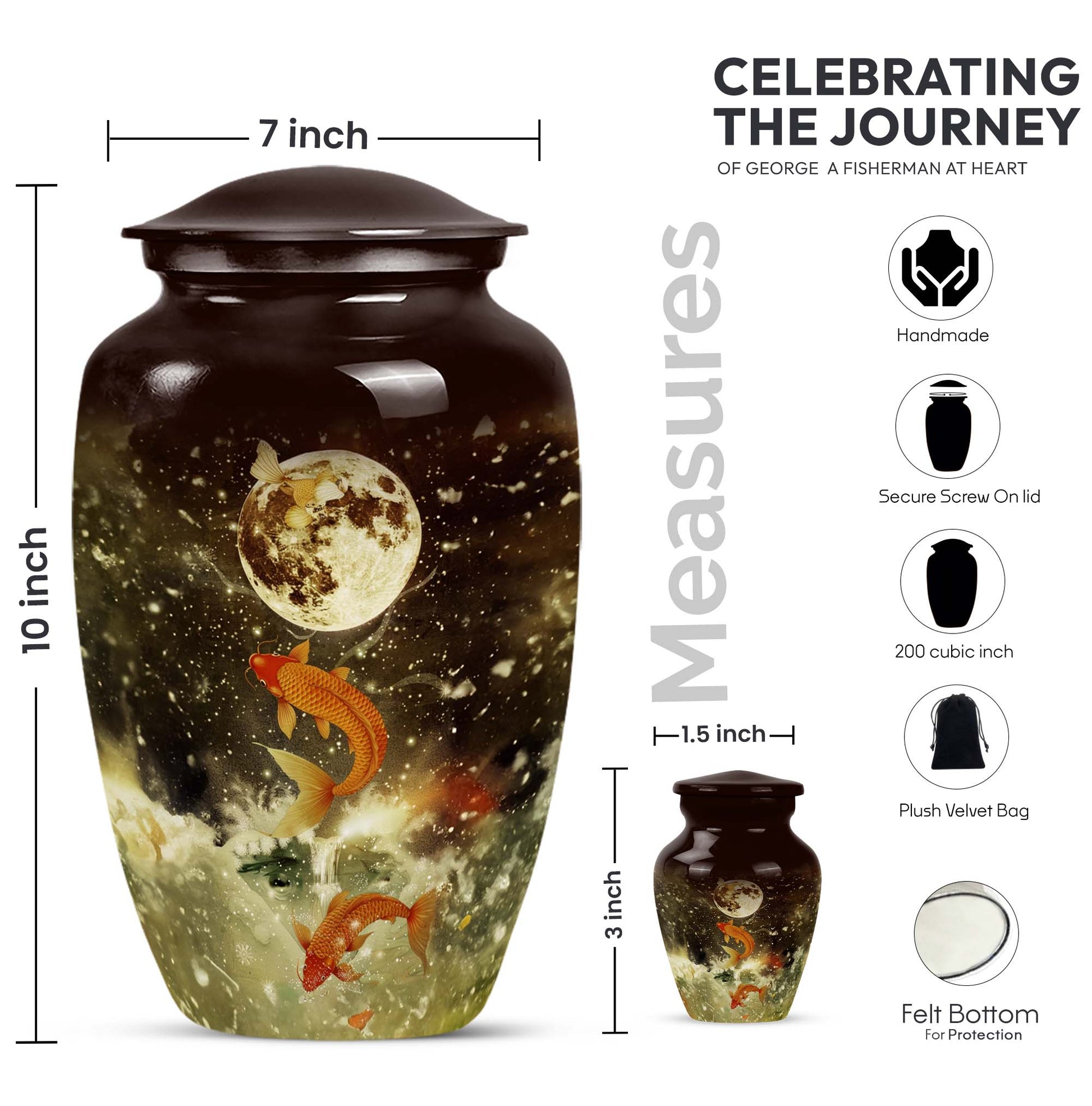 This majestic 10-inch fish urn, a large, fitting tribute for adult male ashes, wraps the solemnity of your emotions into a tangible memorial. Our selection from funeral urns for ashes adult has an abstract theme, embodying a deep respect for the realm of the unknown from which nobody ever returns. Weighing 3.3 pounds, its strong aluminium frame confers an enduring presence, reminding us that every remembrance can form a lasting bond. It can support 200 cubic inches of matter, ample space to hold ashes safely. Its features are underscored by its tangible substance, offering a thoughtful touch of customization - personalize it with engraved names to give your homage a more personal touch. Your purchase includes a premium quality velvet pouch for containment of the ashes. Let this memorial urn, an item of the Memorial Ceremony Supplies inspire you in cherishing the memories while embracing the cycle of life.