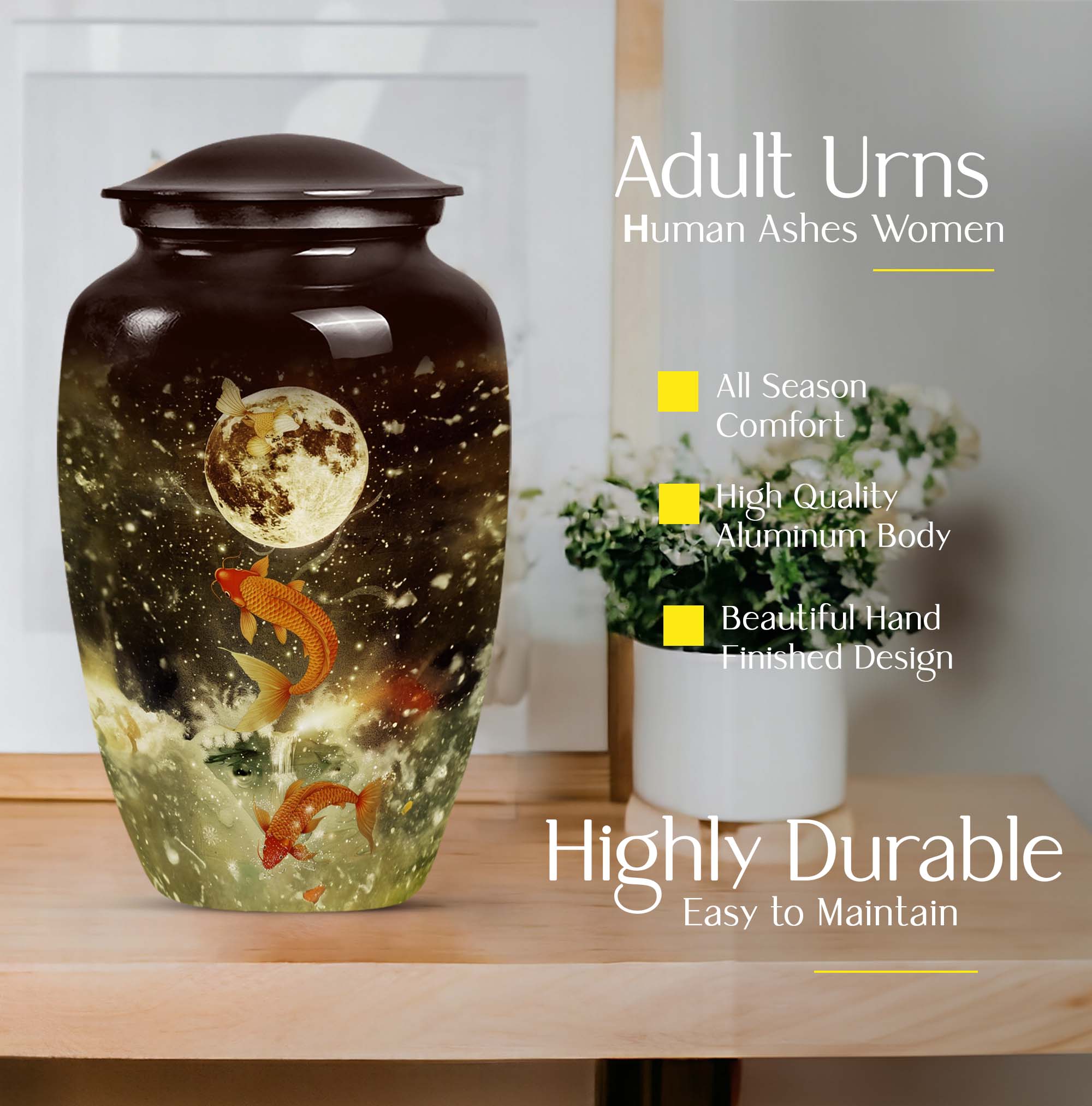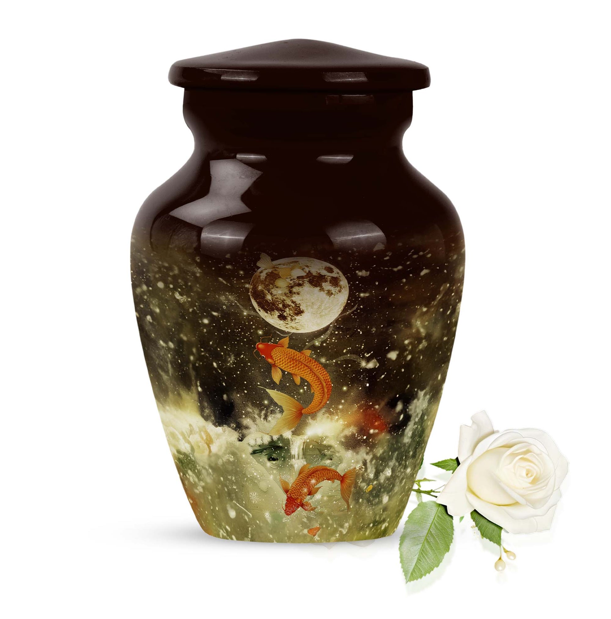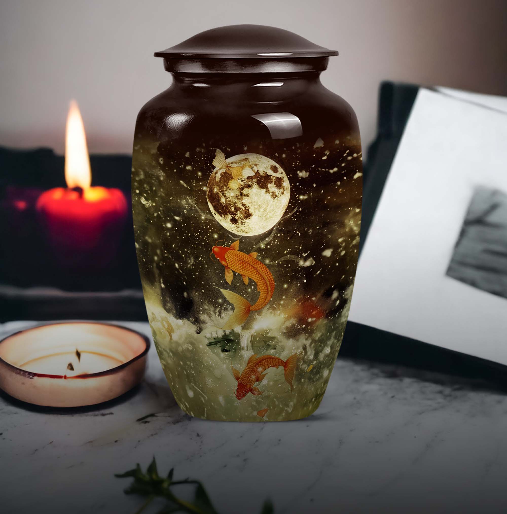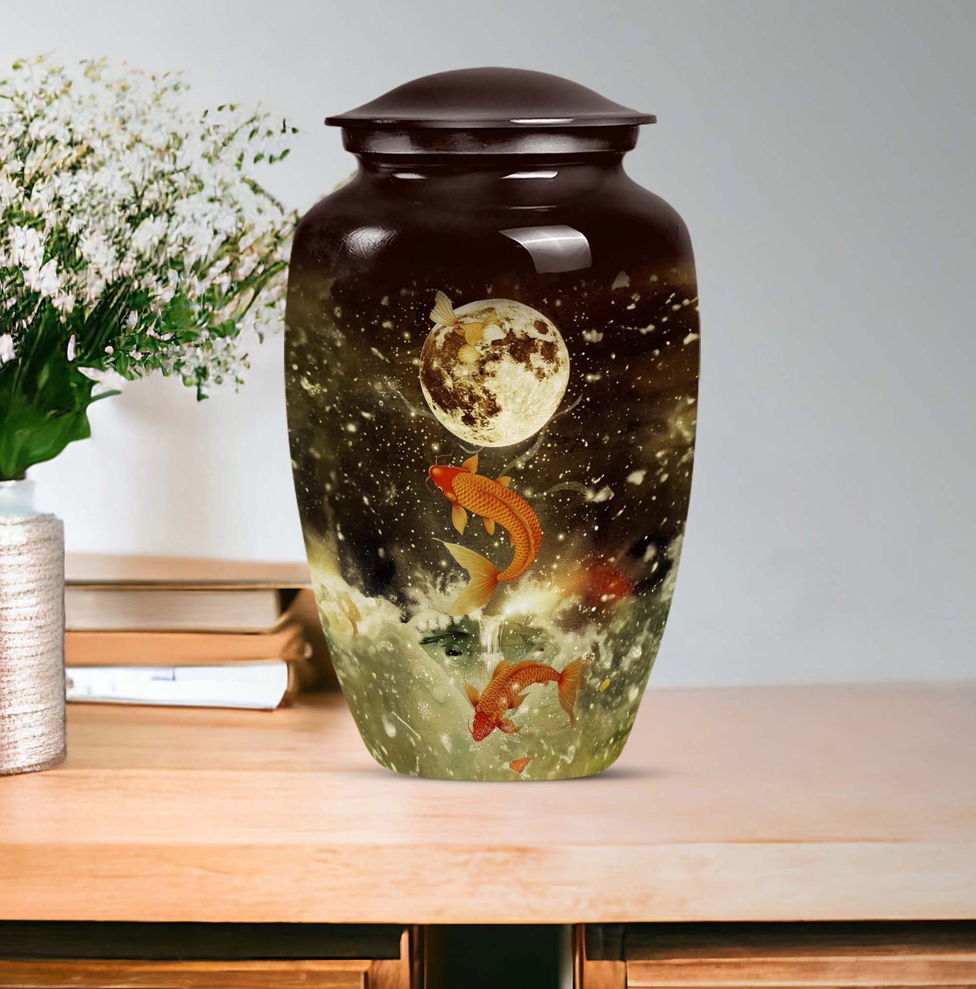 This majestic 10-inch fish urn, a large, fitting tribute for adult male ashes, wraps the solemnity of your emotions into a tangible memorial. Our selection from funeral urns for ashes adult has an abstract theme, embodying a deep respect for the realm of the unknown from which nobody ever returns. Weighing 3.3 pounds, its strong aluminium frame confers an enduring presence, reminding us that every remembrance can form a lasting bond. It can support 200 cubic inches of matter, ample space to hold ashes safely. Its features are underscored by its tangible substance, offering a thoughtful touch of customization - personalize it with engraved names to give your homage a more personal touch. Your purchase includes a premium quality velvet pouch for containment of the ashes. Let this memorial urn, an item of the Memorial Ceremony Supplies inspire you in cherishing the memories while embracing the cycle of life.