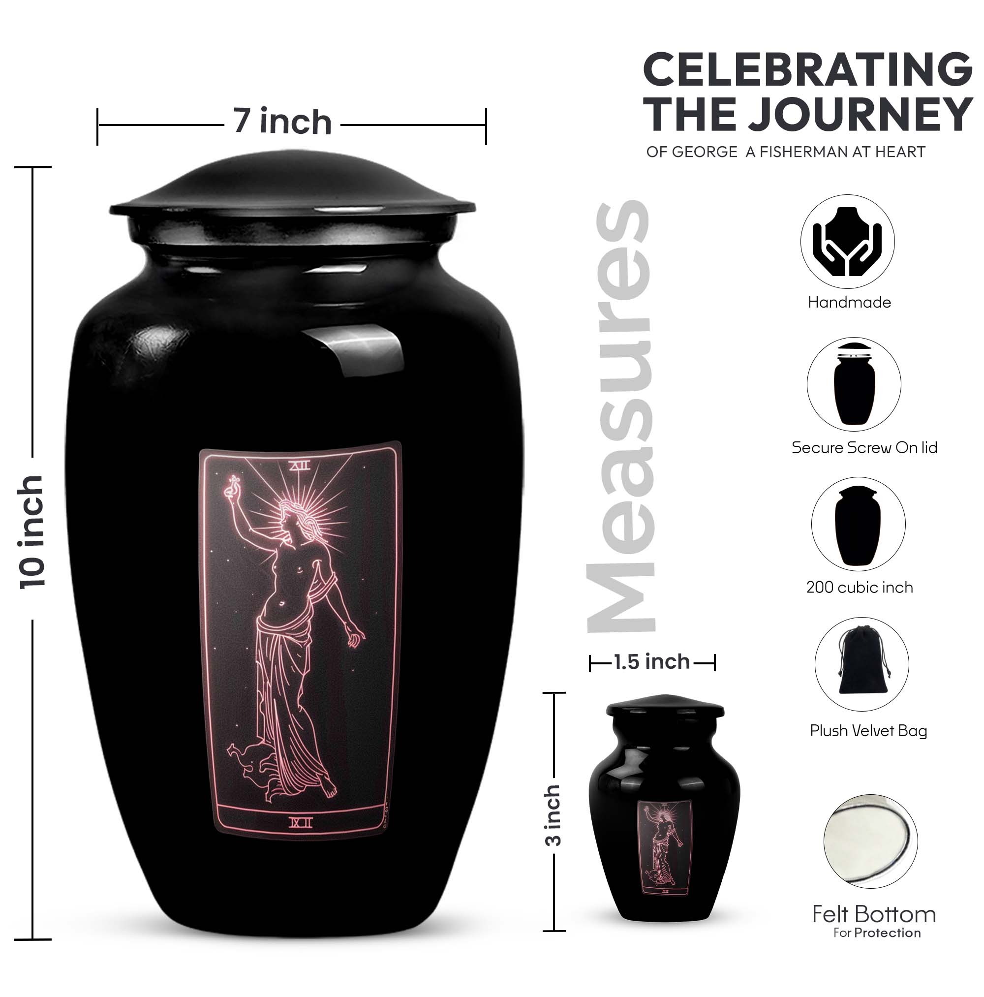 Honor your departed loved ones in a dignified manner with our Tarot Urn, a masterpiece in the category of Memorial Ceremony Supplies. This magnificent, 10-inch cremation urn distinguishes itself with its Classic Urn design, exuding a pious touch. Specially curated for adults and seniors, this large urn has a capacity of 200 cubic inches, suitable for enclosing the ashes of one adult. Made from durable Aluminium, the urn weighs 3.3 pounds and is notable for its stable design. This memorial ash urn can be personalized with engraved names, allowing for a cherished rememberance. The urn accompanies a velvet pouch for respectful containment of ashes, underscored with an abstract theme that signifies the eternal nature of life. Elegantly crafted, this urn serves as a fitting tribute for men and makes a stately addition to any memorial ceremony. Forget the run-off-the-mill, opt for our Tarot Urn, where art meets remembrance. Note: This product is only available in the locale of 'en'. So, remember your loved ones, cherish their memories, and celebrate their lives with our memorial urns.