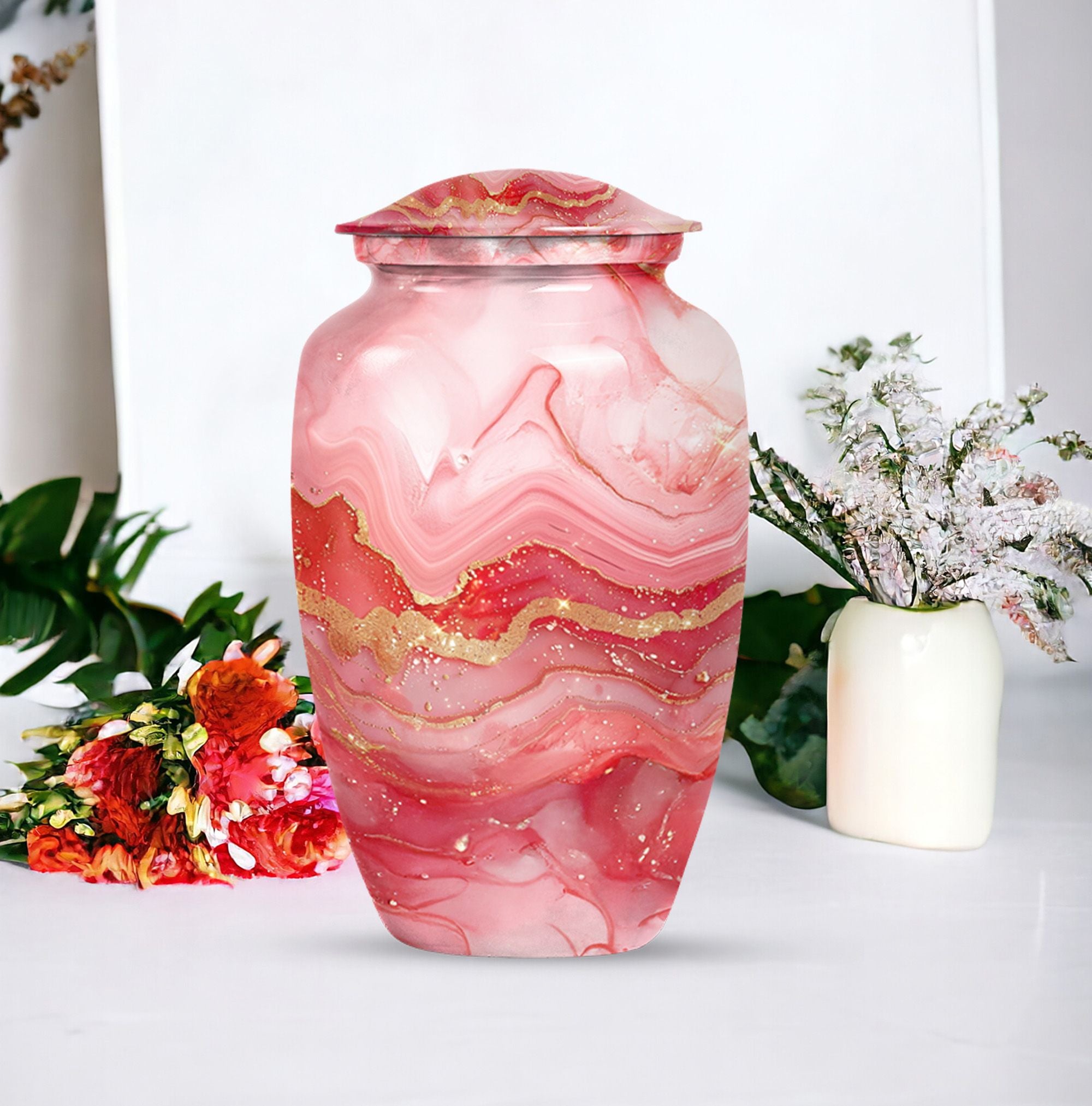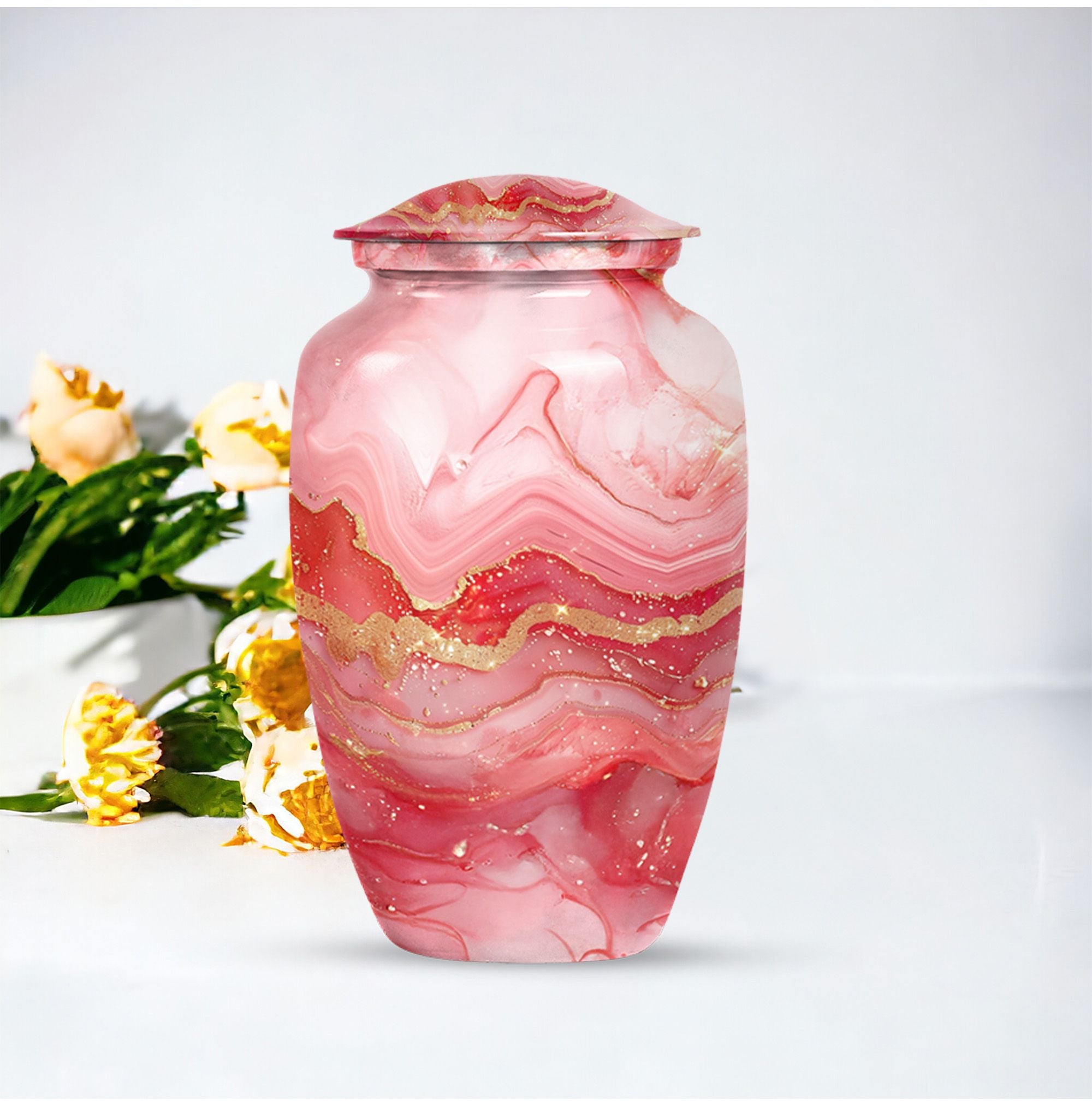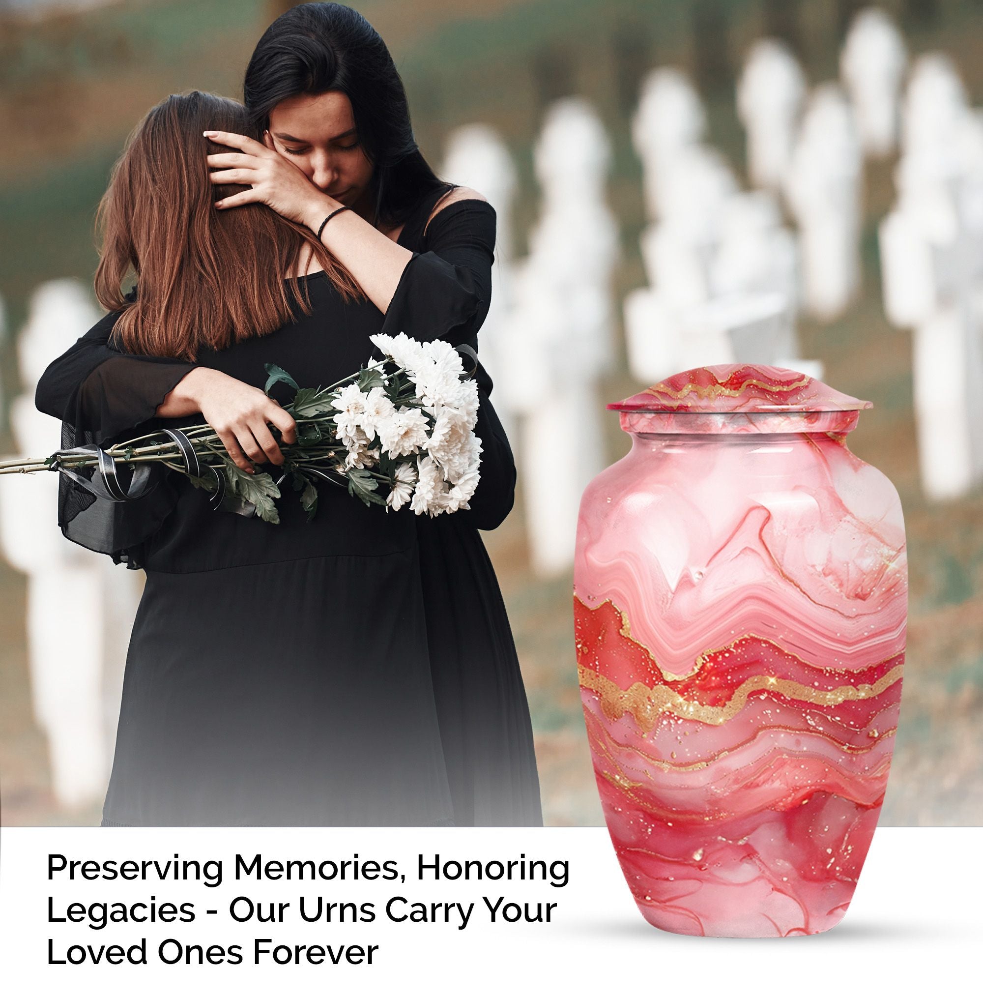 Presenting the Vibrant Swirl Urn, a medium-sized memorial urn for ashes that marries sentiment with style. Crafted from premium aluminium, this 10 inch, 3.3 pound urn can house up to 200 cubic inches of ash. Exhibiting an abstract theme, its classic urn type carries an air of tradition, as the silhouettes of your cherished ones continue to live on within your home. Further enhancing its appeal, we offer personal customization, allowing you to engrave the names of your loved ones onto the urn's surface. The urn arrives with an additional velvet pouch, ideal for containing the ashes safely. Without limiting its potential, this urn can serve as a fitting tribute for both men and women. Whether you're in search of burial urns for human ashes adult or a cremation urn for your loved ones, our Vibrant Swirl Urn aptly accommodates your needs, encapsulating treasured remnants in an enduring vessel that's both sophisticated and heartwarming.