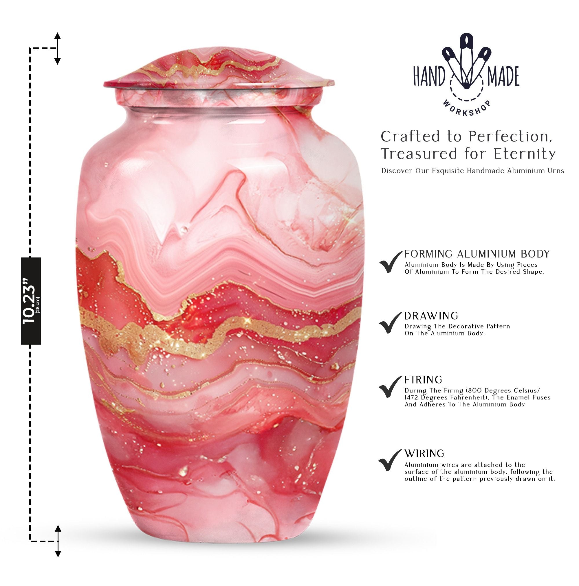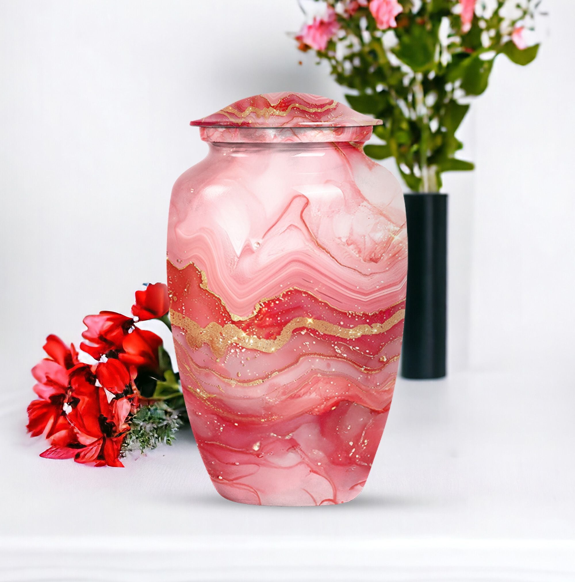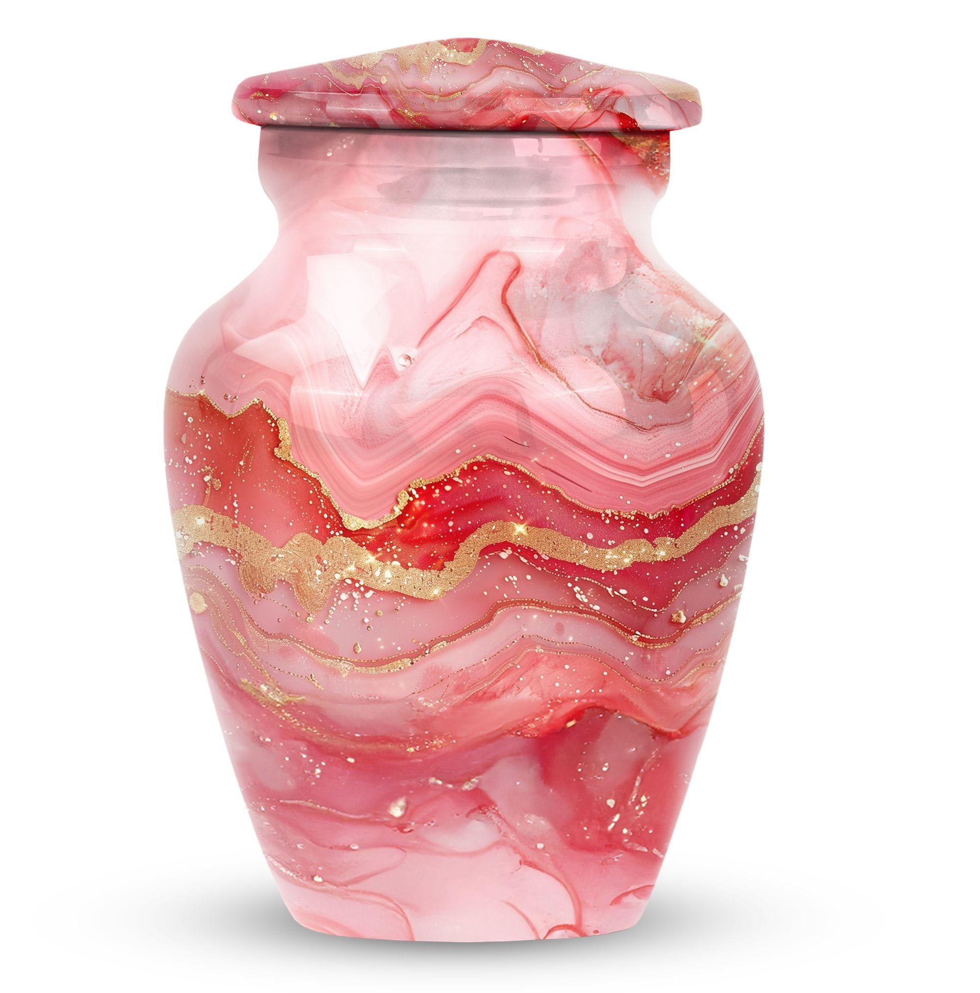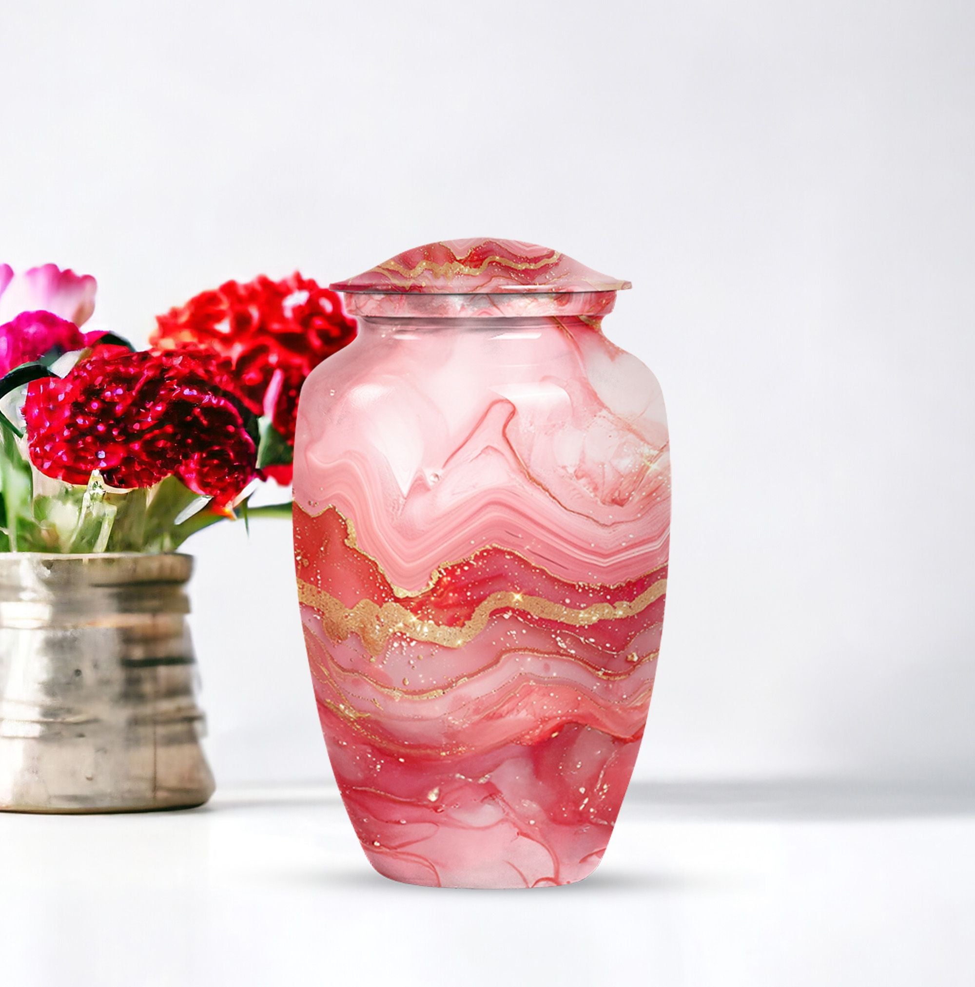 Presenting the Vibrant Swirl Urn, a medium-sized memorial urn for ashes that marries sentiment with style. Crafted from premium aluminium, this 10 inch, 3.3 pound urn can house up to 200 cubic inches of ash. Exhibiting an abstract theme, its classic urn type carries an air of tradition, as the silhouettes of your cherished ones continue to live on within your home. Further enhancing its appeal, we offer personal customization, allowing you to engrave the names of your loved ones onto the urn's surface. The urn arrives with an additional velvet pouch, ideal for containing the ashes safely. Without limiting its potential, this urn can serve as a fitting tribute for both men and women. Whether you're in search of burial urns for human ashes adult or a cremation urn for your loved ones, our Vibrant Swirl Urn aptly accommodates your needs, encapsulating treasured remnants in an enduring vessel that's both sophisticated and heartwarming.