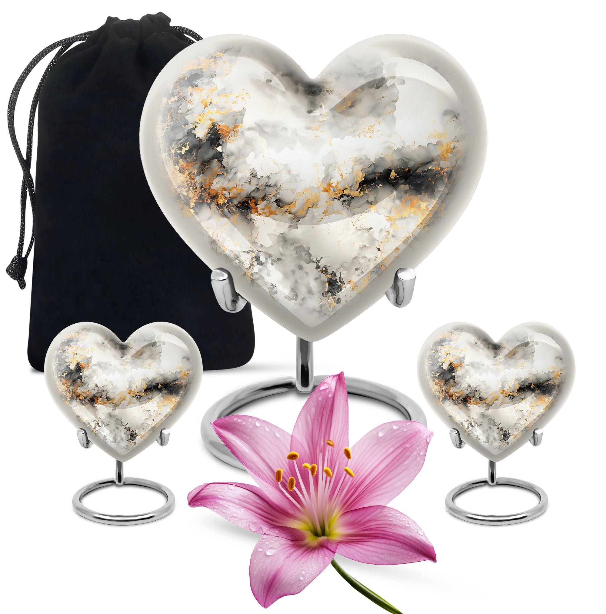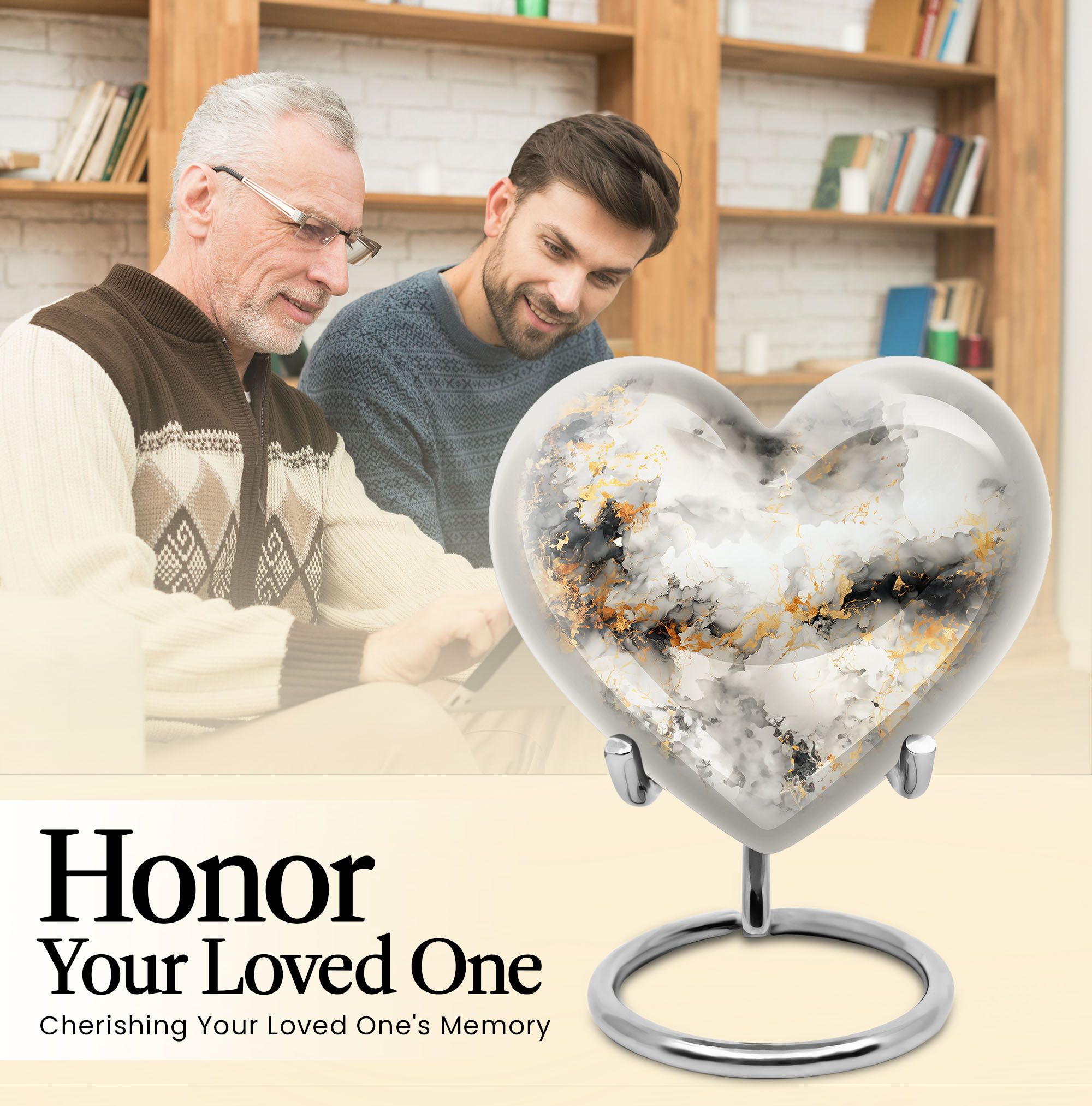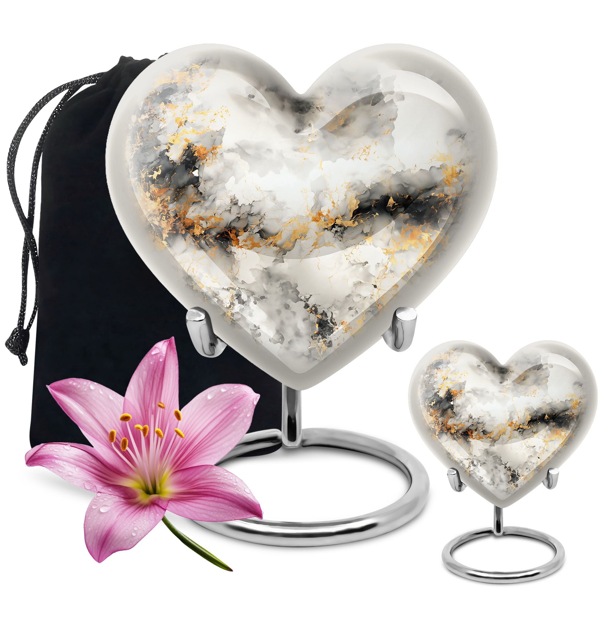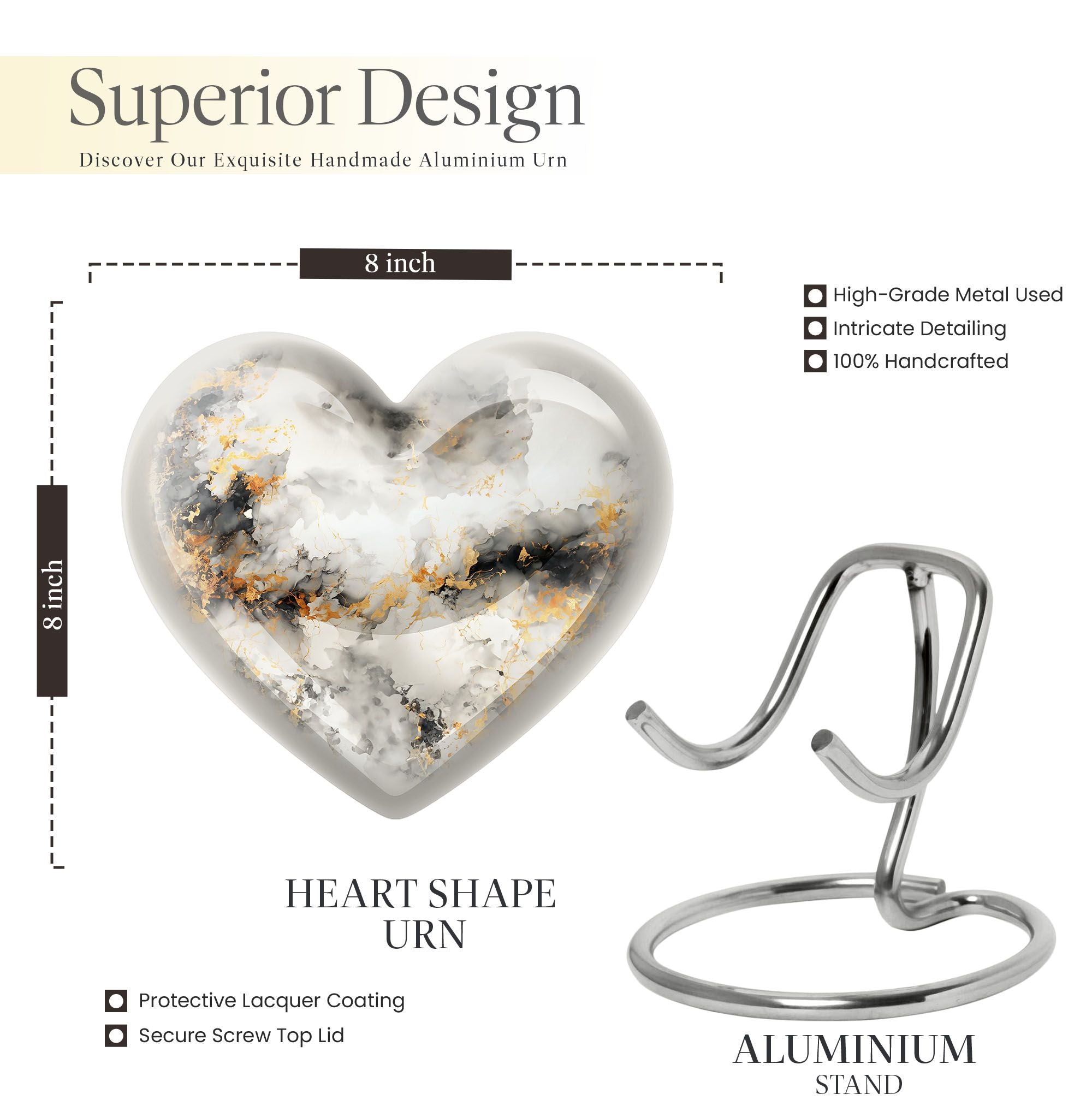 Discover the distinct elegance of the Vibrant Swirl Urn, an exquisite memorial urn for an adult male. This large-sized urn, standing 10 inches in height, offers you a dignified and heartfelt way to commemorate a loved one's life. Constructed from high-quality aluminum, our urn is stout-weighted at 3.3 pounds with a capacity of 200 cubic inches. This sizeable urn is an excellent choice for an adult's ashes. Each urn comes nestled in a velvety pouch to ensure safe containment of the ashes. What sets this urn apart is its abstract theme and heart design, reflecting the love and memories shared with the departed soul. Personalize this vibrant urn with engraved names to emphasize its uniqueness. Perfectly suited for those seeking Funeral medium size urns for human ashes, human urn adult, or companion cremation urns for 2 adults. This urn is a blend of value, craftsmanship, and love that goes beyond the typical memorial urns.