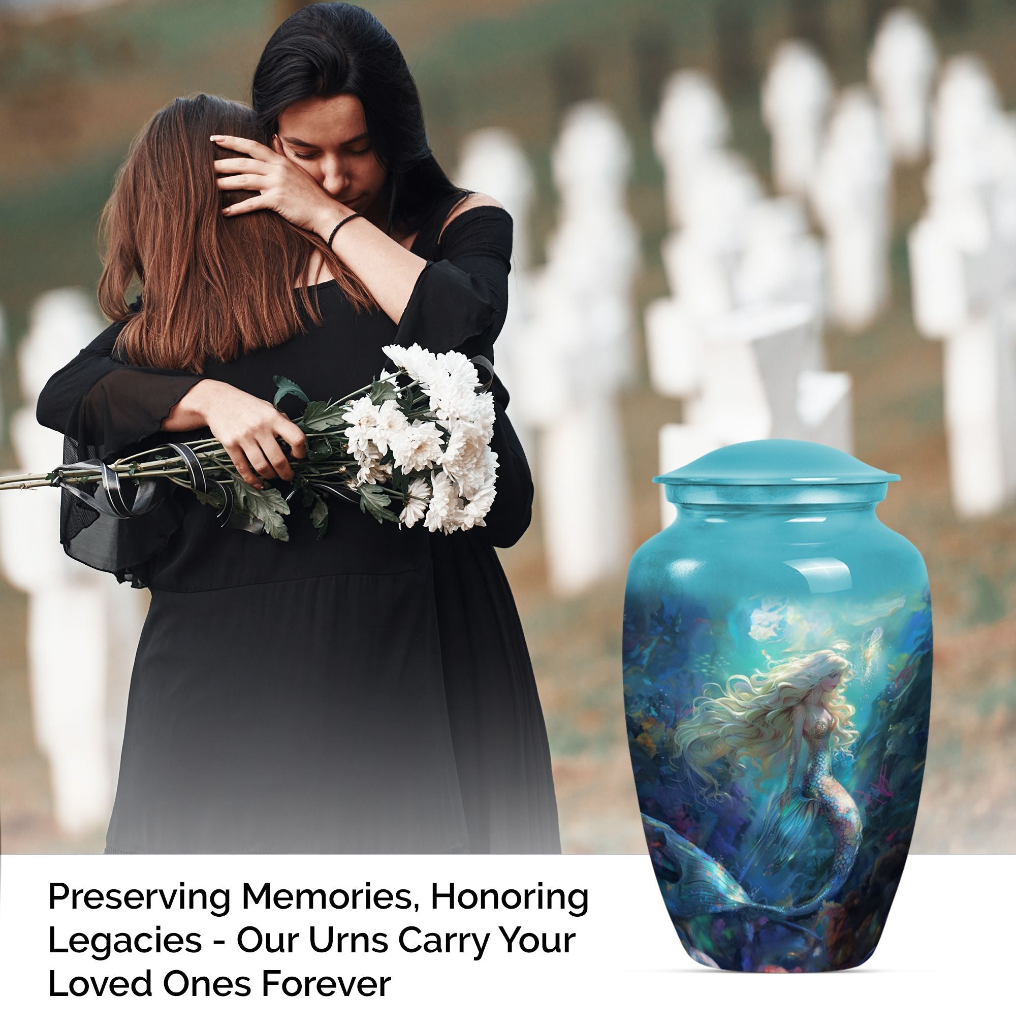 Showcase your treasured memories with the meticulously crafted 10-inch Classic Mermaid Urn. This large size urn is crafted from premium aluminium to guarantee longevity, even when placed outside, such as for burial in the ground. Tipping the scales at a firm 3.3 pounds, this urn possesses a 200-cubic inch internal capacity, ensuring to encase a lifetime of cherished memories. The butterfly themed urn radiates a serene and calming aura symbolizing freedom, transformation, and life's soulful journey. To make it intimate, you can personalize this memory keeper with the option of engraved names. Included is a velvet pouch designed for safe containment of human ashes. This tastefully designed funnel urn is ideal for ceremonial use and its large metal form makes it a strong contender in the cremation rings for ashes category. Transform your memorial service with this unique, large urn that aesthetically marries honor with lasting legacy.