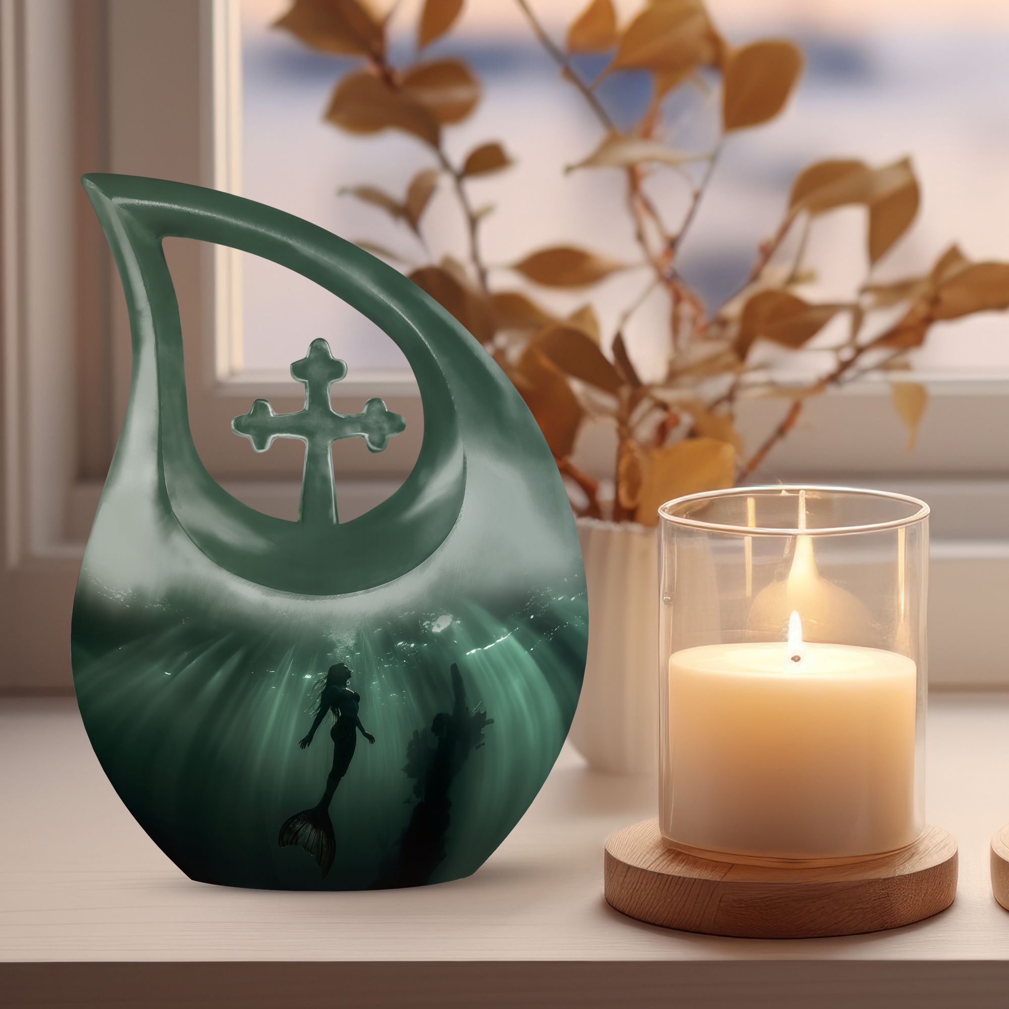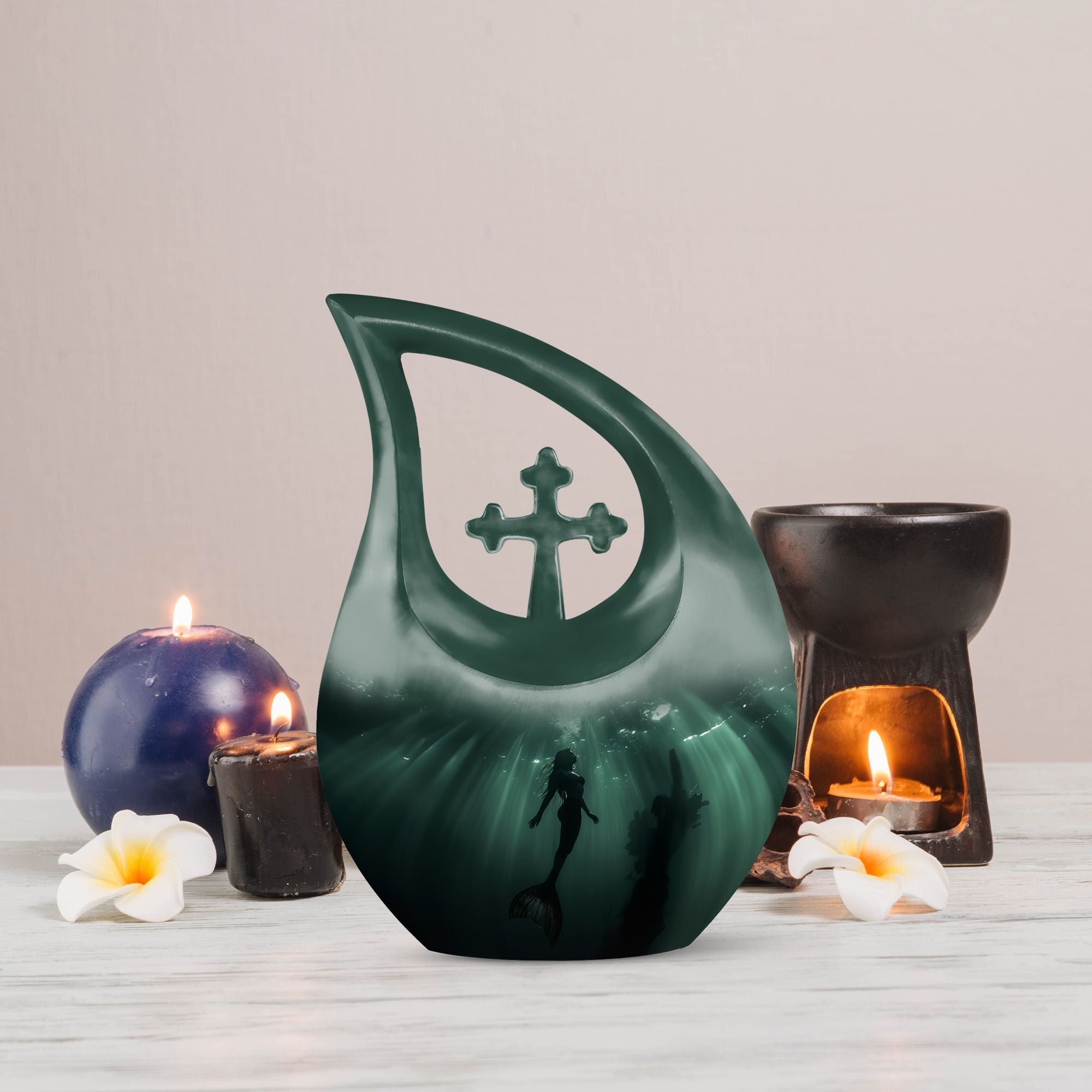 Honor your departed beloved with this sublime 10-inch Mermaid Urn. Fashioned from high-quality Aluminium, this commemorative piece weighs 3.3 pounds and has an exquisite 'Cross Drop' design. This Large Urn boasts a capacity of 200 cubic inches, making it suitable as a fitting final resting place for a cherished one. It comes complete with a sophisticated velvet pouch, providing an elegant, safe haven for the preserved ashes. What makes this item unique? We offer the opportunity to add a personal touch with engraved names, turning the urn into a heartfelt tribute. It's not just an urn; it's a beautifully curated memorial piece resonating love and therefore recommended for those searching for 'Urns for Mom' or 'Urns with Love.' Looking out for eco-friendly cremation alternatives? Our Mermaid Urn rightly suits those keyword phrases such as 'Cremation Vaults,' and 'Cremation Urns For Human Ashes.' Pay your respects in a unforgettable way with this distinguished Mermaid Urn.