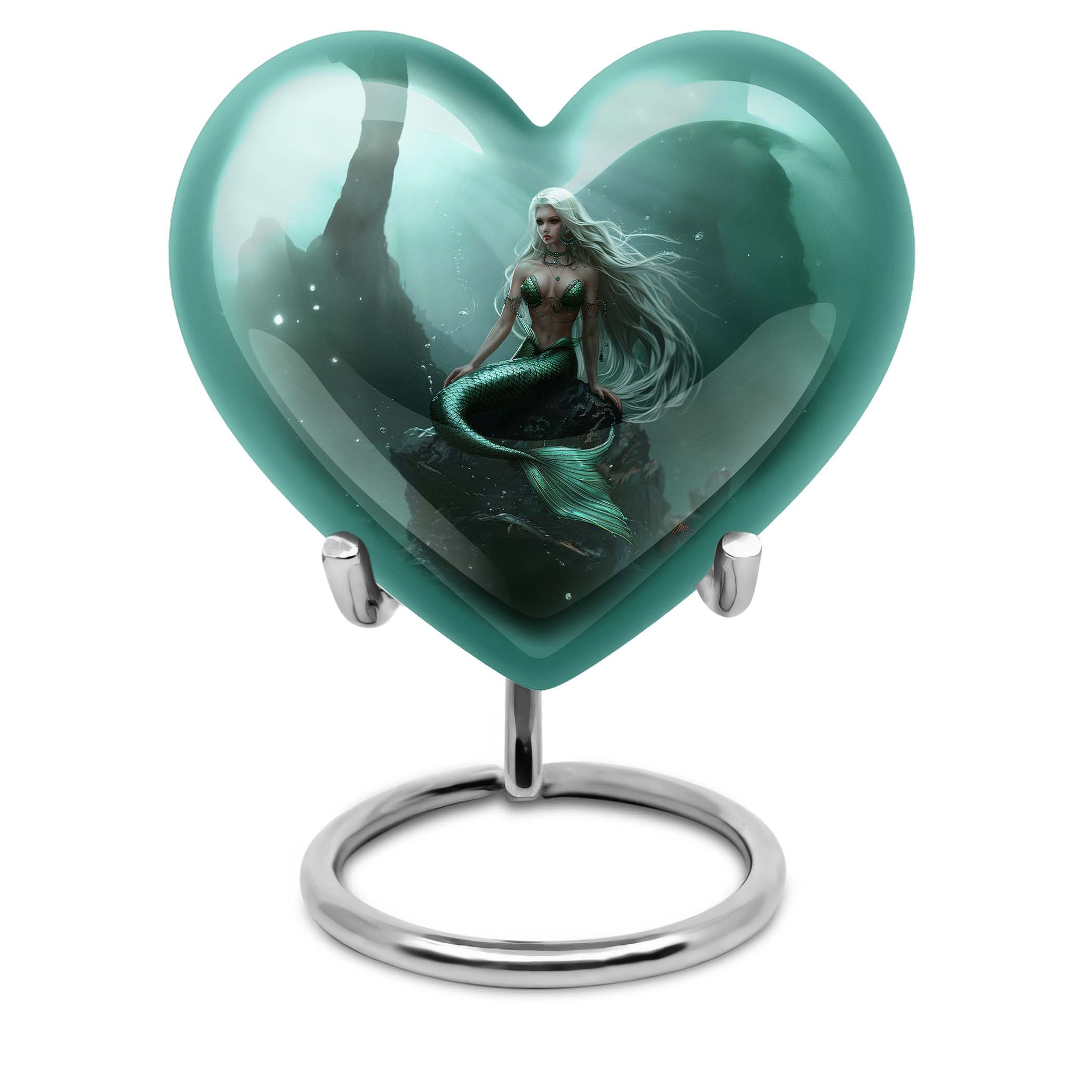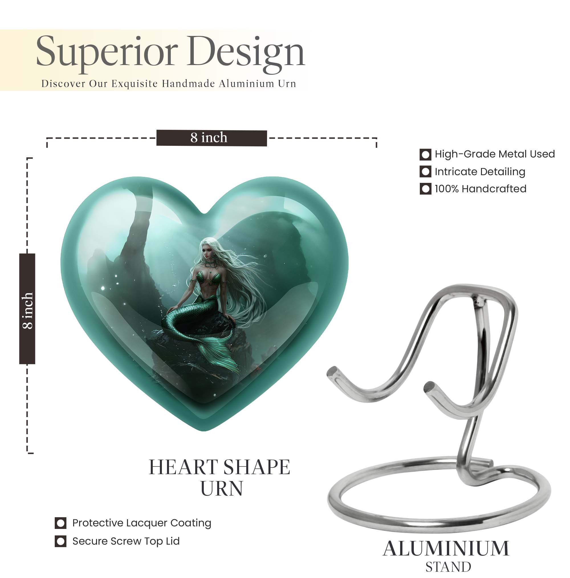 Delicately crafted, the Mermaid Urn is more than just an elegantly designed object; it's a commemorative vessel that pays tribute to the life of a loved one. Styled with the enchanting motif of a Butterfly, this 10-inch Heart Urn serves as a comforting symbol of remembrance. It boasts a capacity of 200 cubic inches and perfect size to hold the precious memories and ashes of an adult female. This cremation urn, made with the robustness of aluminium, weighs a solid 3.3 pounds – a testament to its quality and durability. A velvet pouch is part of this package, providing tasteful containment for ashes. Furthermore, personalization of this large urn is possible, with the option to engrave names and render it extra special. Poised eloquently between art and function, the Mermaid Urn is a poignant selection among funeral urns ashes and stands out amongst cremation urns for women, making a unique unisex gift for adults. Emphasizing the importance of remembrance, it harmonizes ceremonial traditions with a modern appeal.