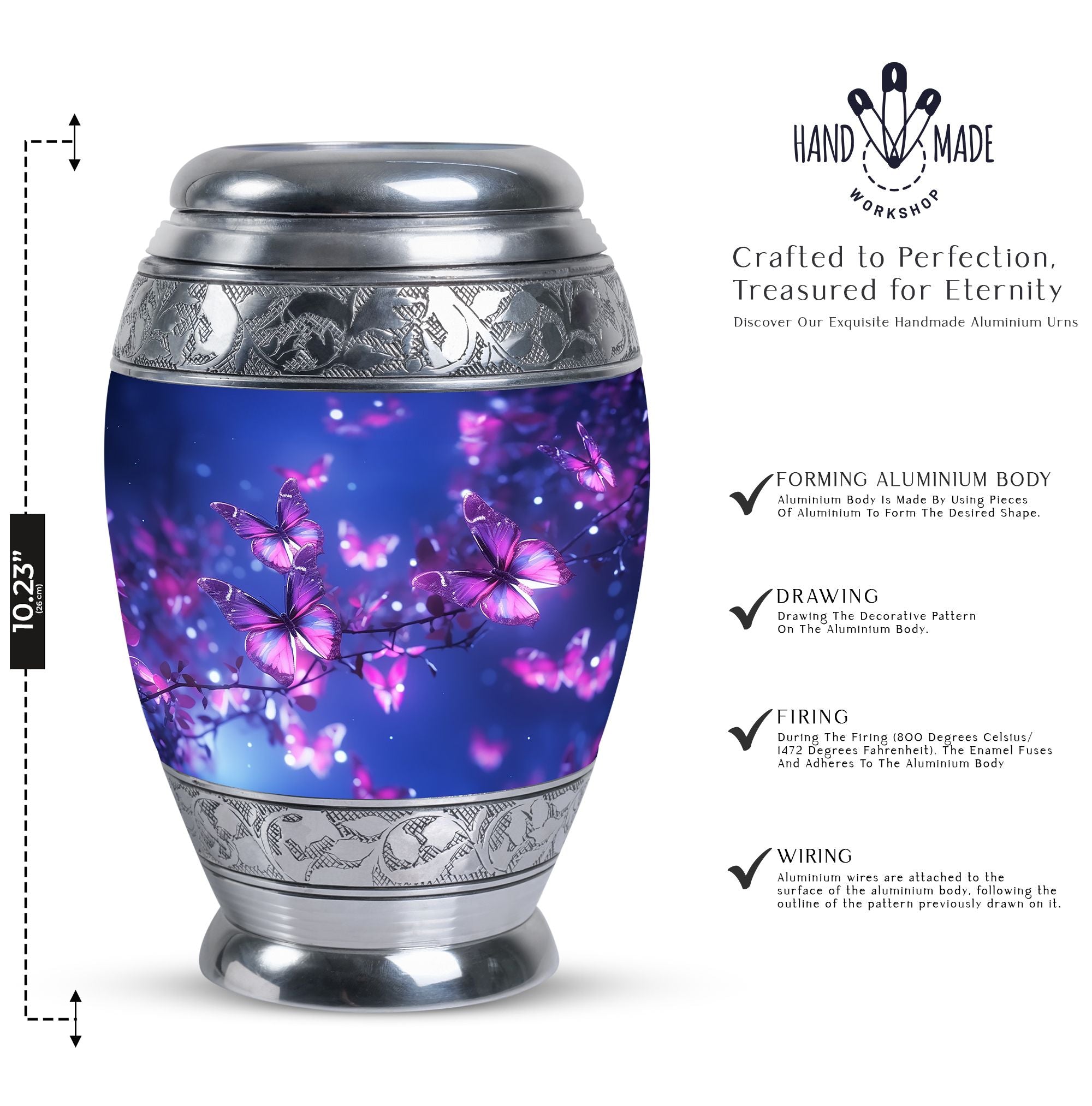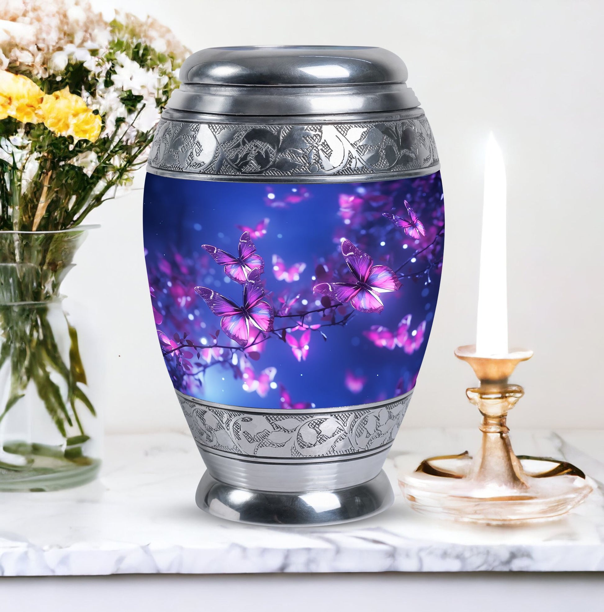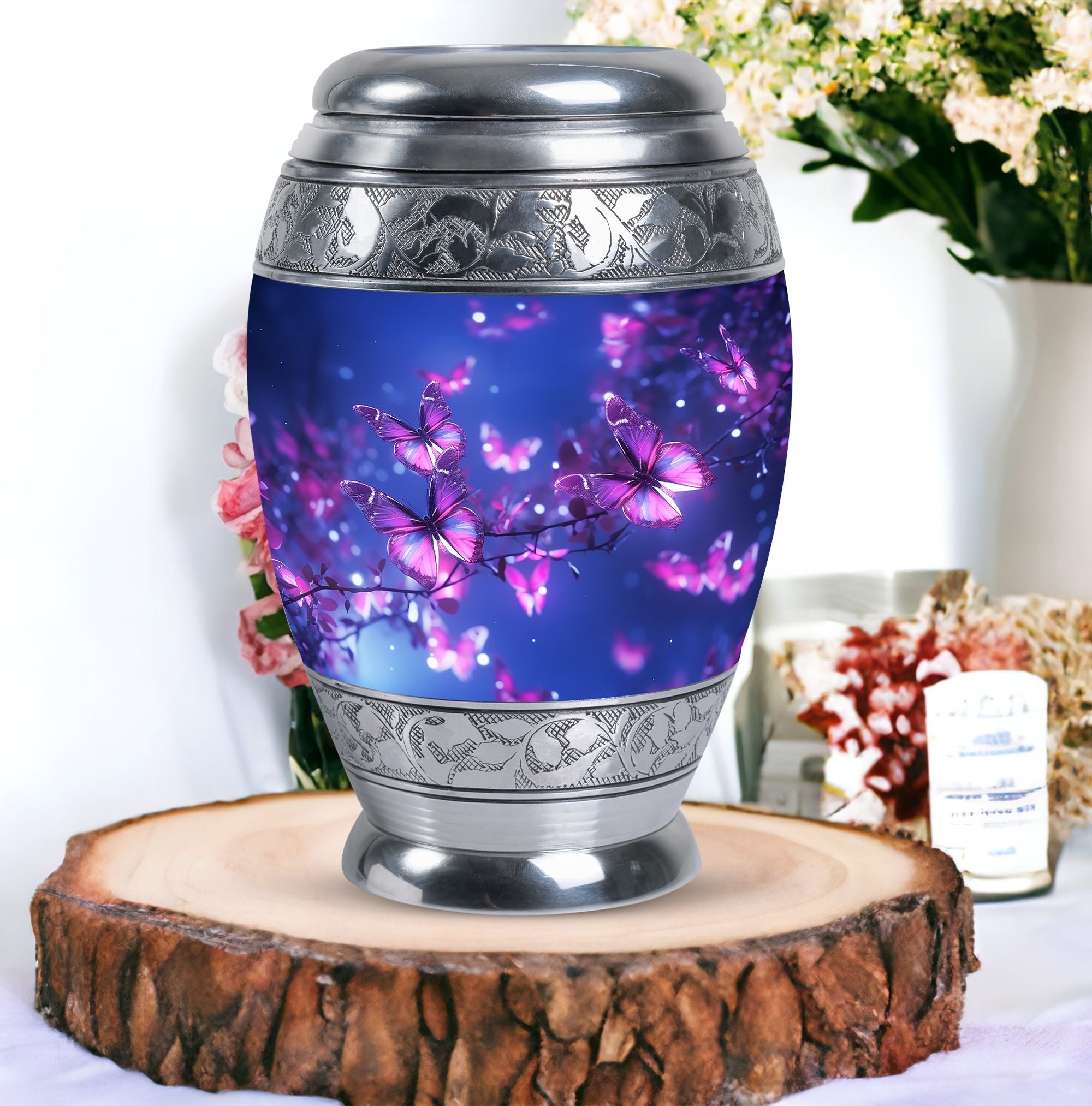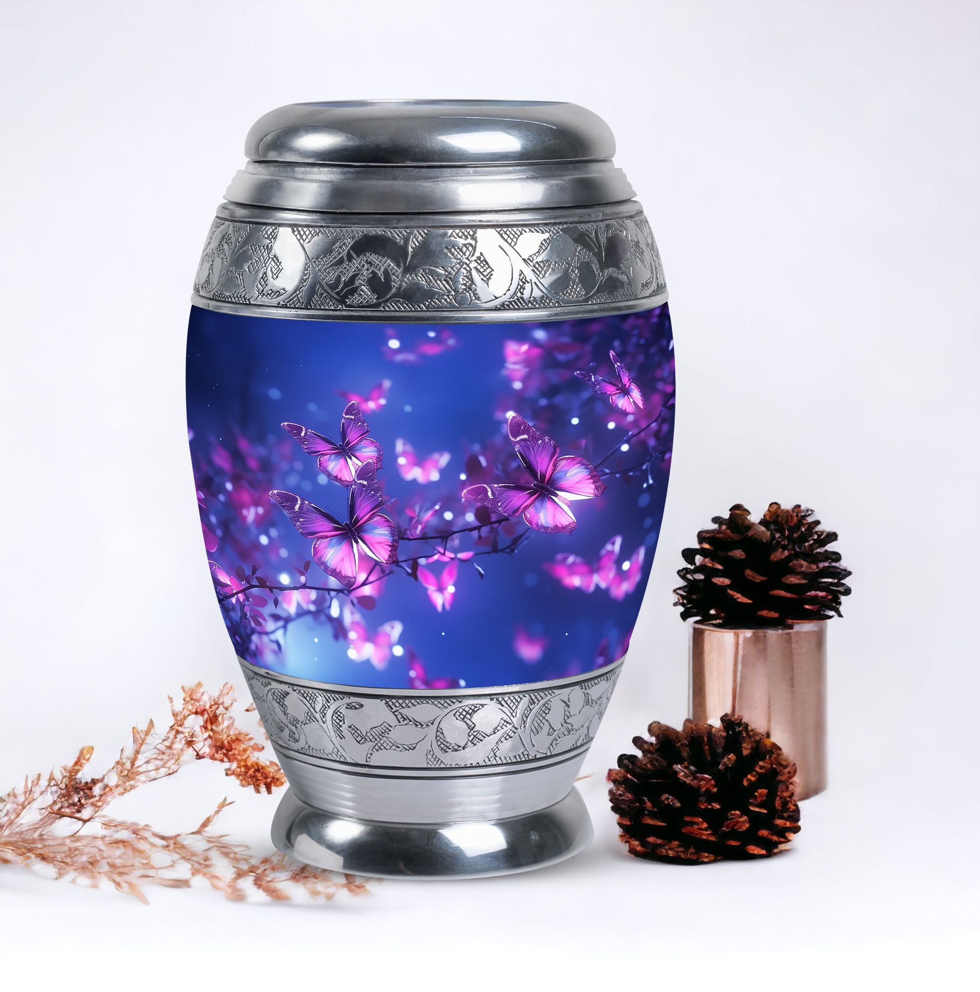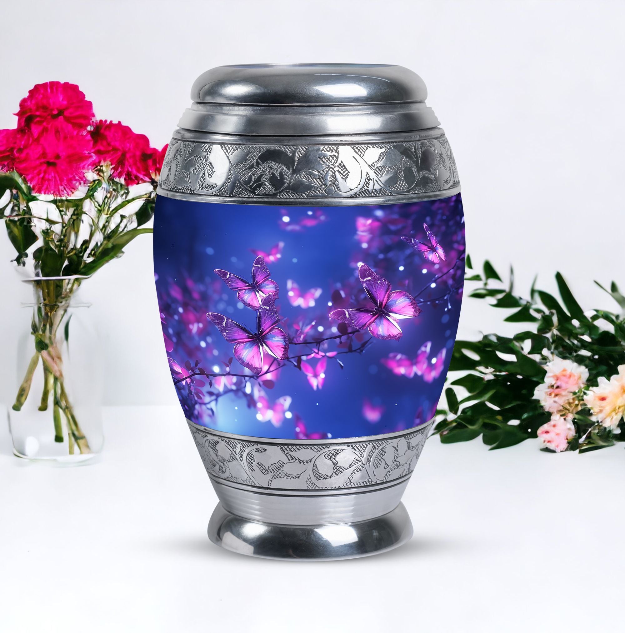 Conclude your loved one's life journey in a beautiful way with our 'Pink Butterfly Urn.' Crafted with intricate detailing, it provides a dignified and tranquil final resting place. This urn is perfect to store not just ashes, but an array of precious memories as well. Made from high-quality metal, it promises longevity and timeless grace. The pastel pink hue symbolizes love, serenity, and the blissful flight of a butterfly. Our large urn is designed to respectfully contain human ashes. However, we also offer an option for a miniature urn that can hold a small quantity of memorial ashes, ideal for sharing remembrances among family. The 'Pink Butterfly Urn' is more than just a funeral urn, it's a beautiful tribute paying homage to the eternity of a soul. It ebbs away from banality, steering clear of commonly used phrases to illustrate its originality. It is all you need for a peaceful memorial ceremony.