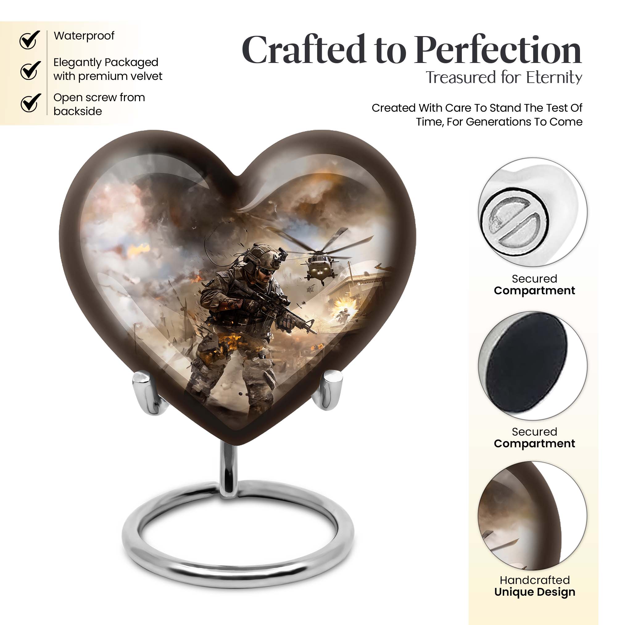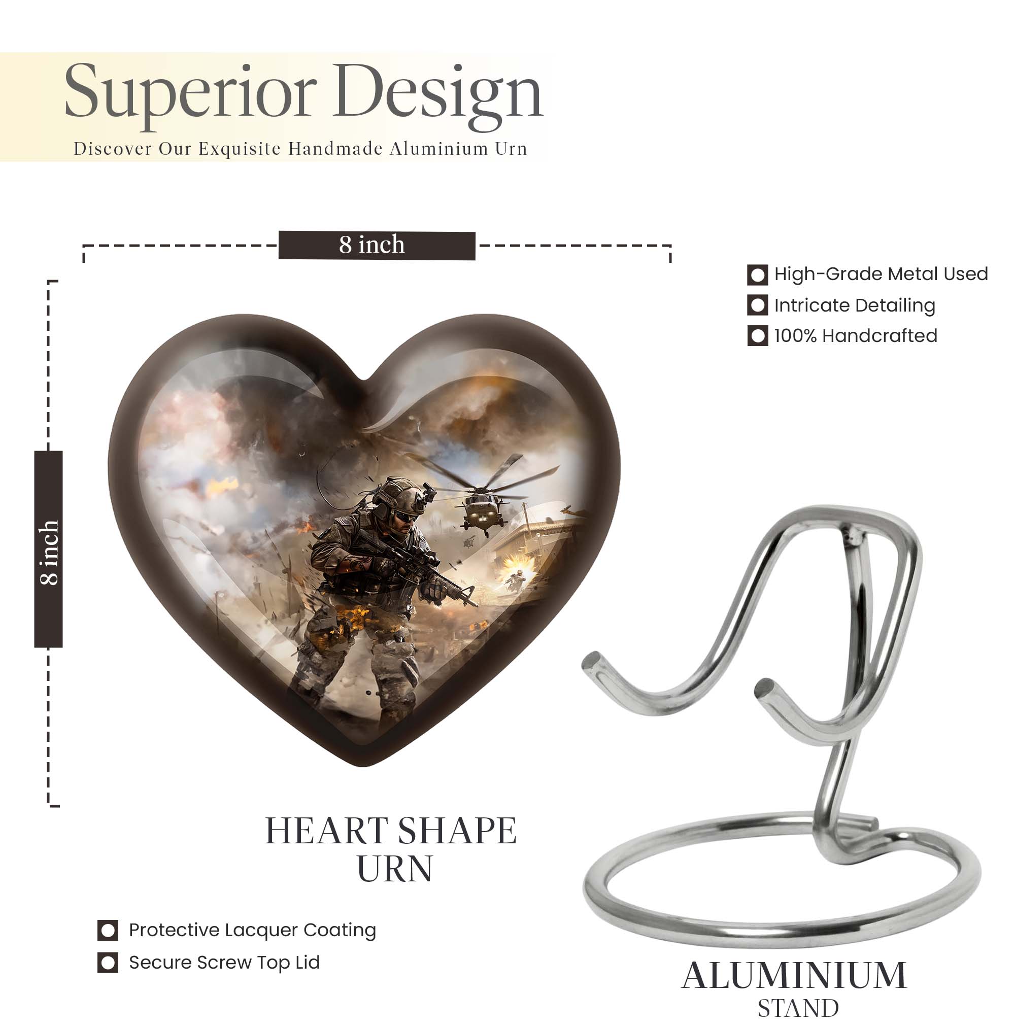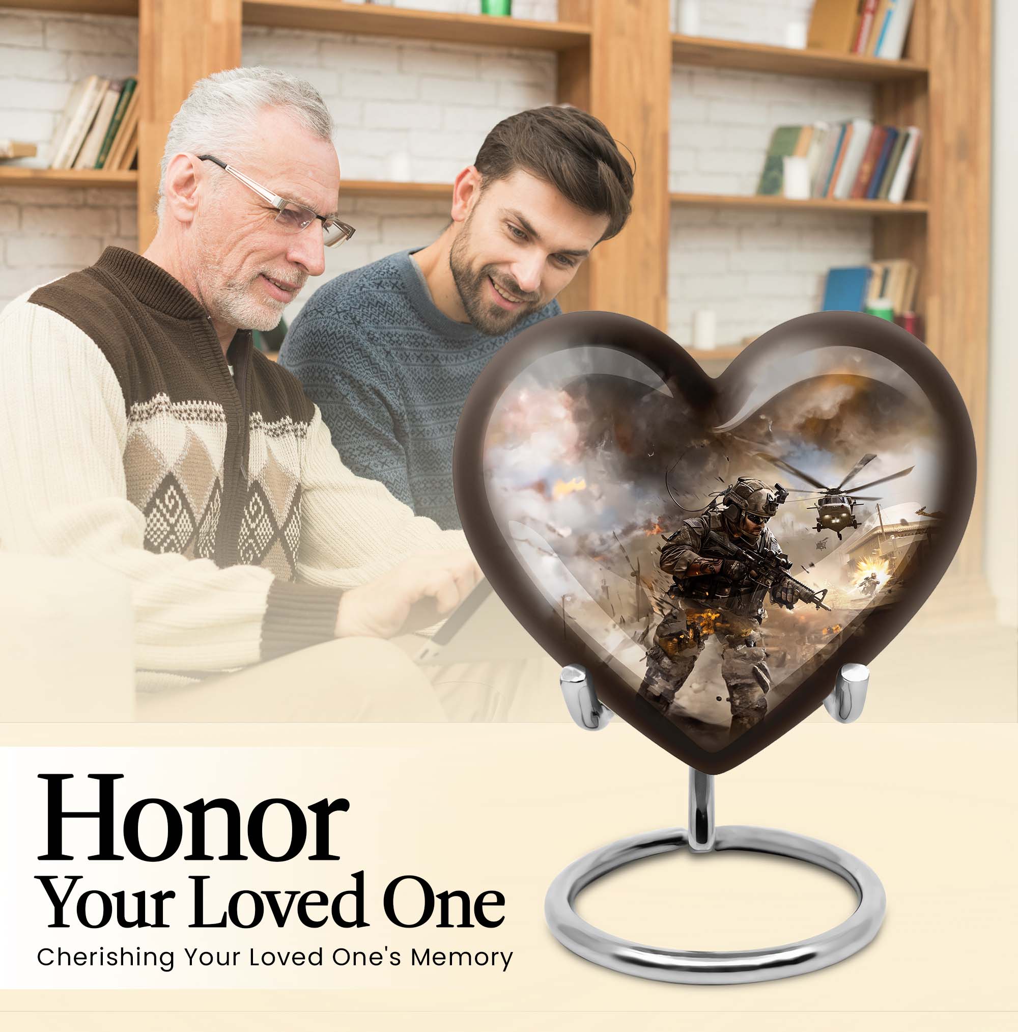Pay tribute to your loved ones with our specially crafted large military Urn, designed to tastefully hold the ashes of adults. This elegant 10-inch Aluminium heart urn, weighing 3.3 pounds, stands tall as a testament to their memory. The distinctive urn showcases an inspiring Abstract theme, delicately touching your deepest emotions. It doesn't just serve as a memento, but astoundingly strikes a chord with its sublime design. This urn's capacity is 200 cubic inches, signifying its capability to hold significant volumes. Personalized with engraved names, this cremation urn forms a meaningful connection and warmth that outlives time itself. The package also includes a luxury velvet pouch for safe containment of the precious remnants. Immerse yourself in the memories of your beloved with our Large Urns, profoundly resonating with your feelings. Keywords to note include 'military Urn', 'cremation personalized urns for human ashes adult', 'memorial urns', 'Cremation large urn, urn ash burial urn', 'urns for cremation ashes for men', and 'personalized urns for cremation ashes mother'.