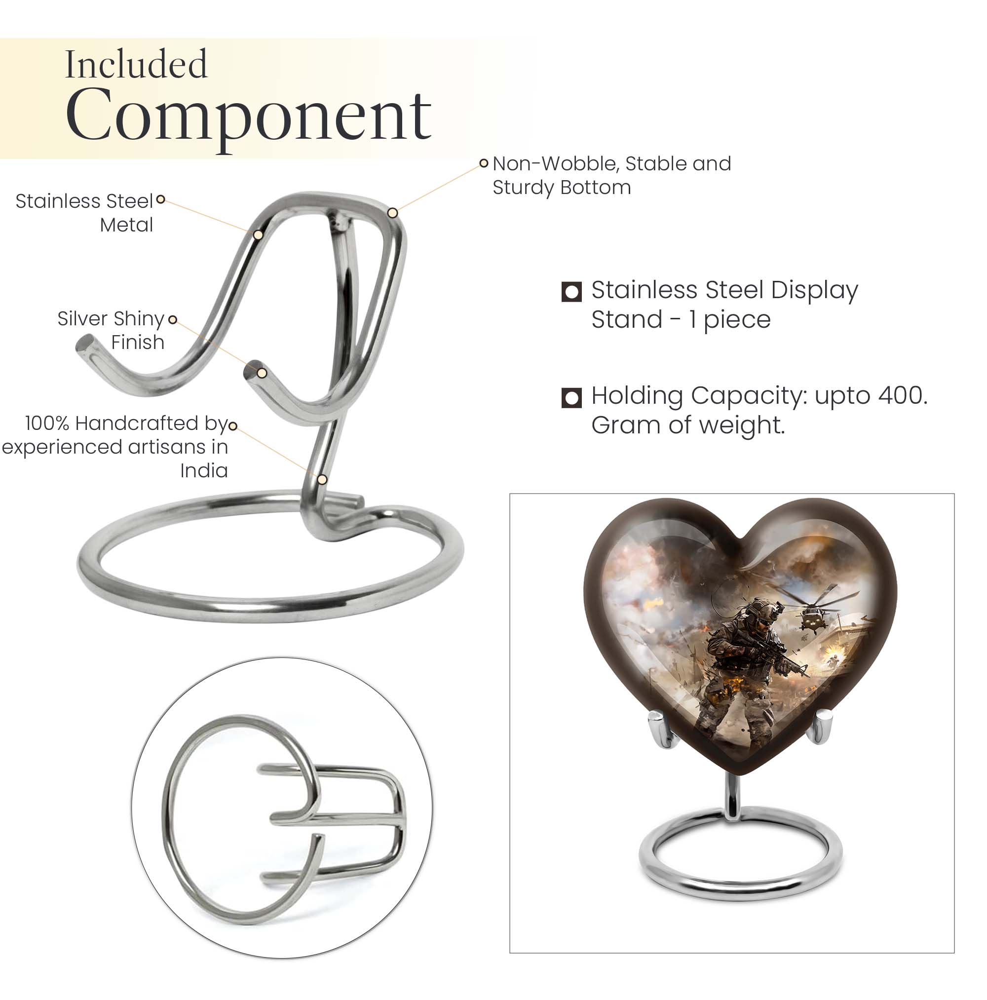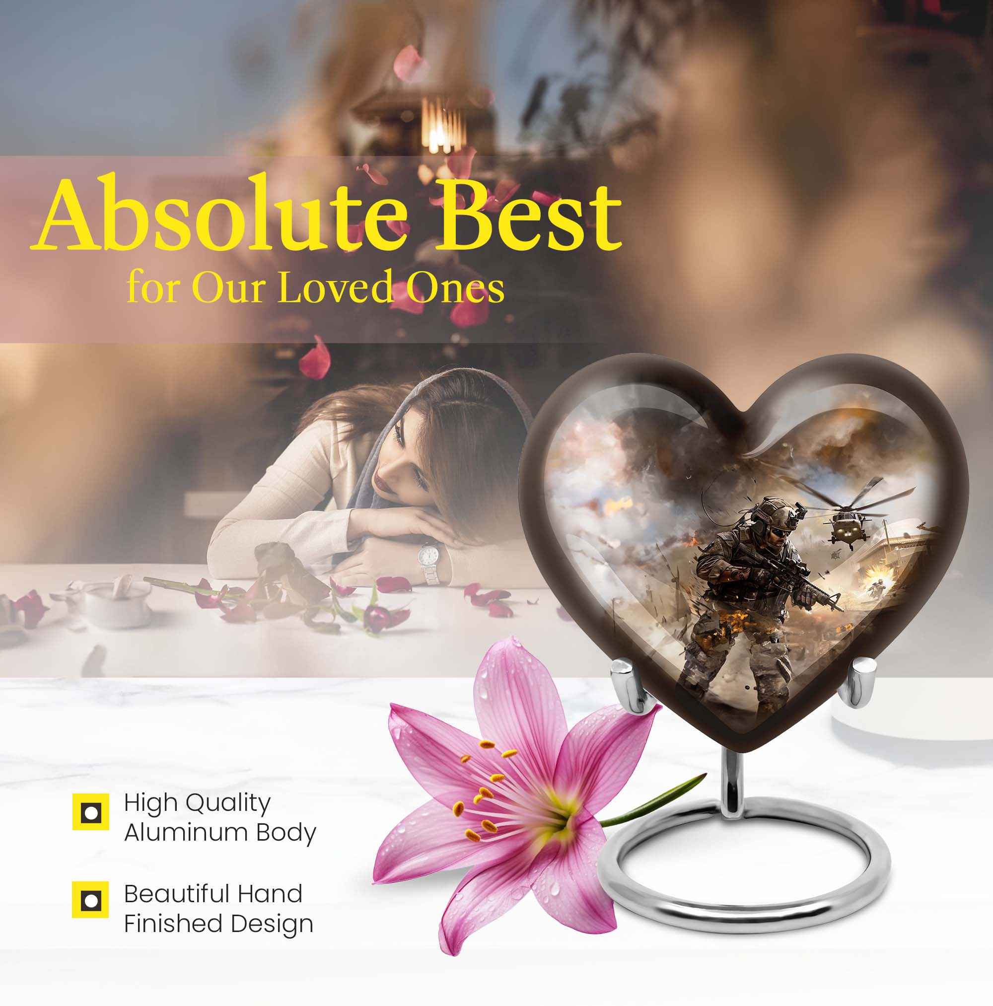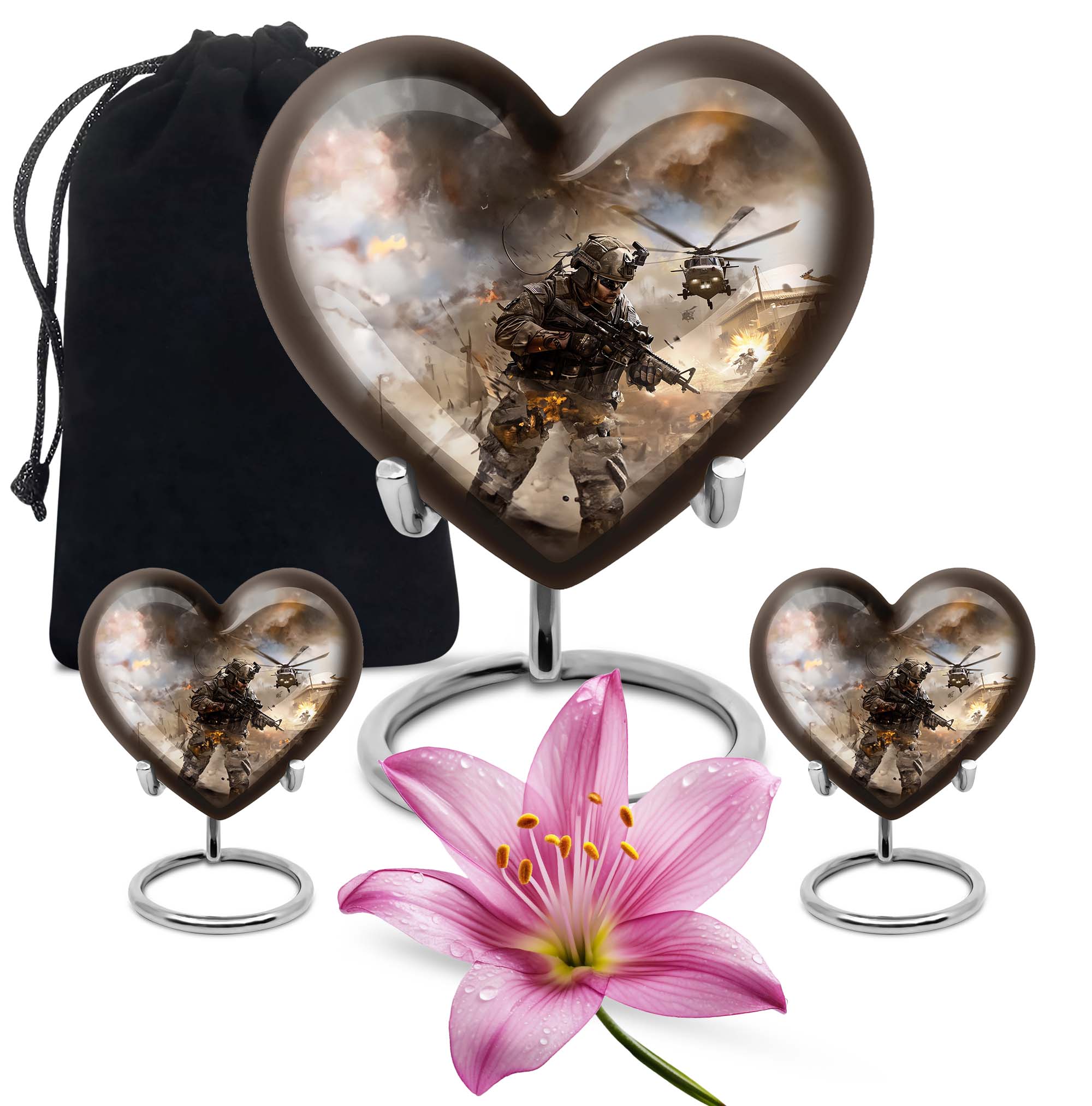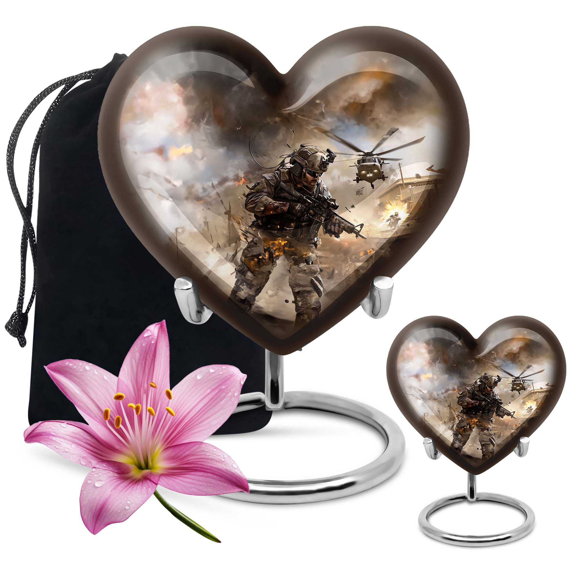 Pay tribute to your loved ones with our specially crafted large military Urn, designed to tastefully hold the ashes of adults. This elegant 10-inch Aluminium heart urn, weighing 3.3 pounds, stands tall as a testament to their memory. The distinctive urn showcases an inspiring Abstract theme, delicately touching your deepest emotions. It doesn't just serve as a memento, but astoundingly strikes a chord with its sublime design. This urn's capacity is 200 cubic inches, signifying its capability to hold significant volumes. Personalized with engraved names, this cremation urn forms a meaningful connection and warmth that outlives time itself. The package also includes a luxury velvet pouch for safe containment of the precious remnants. Immerse yourself in the memories of your beloved with our Large Urns, profoundly resonating with your feelings. Keywords to note include 'military Urn', 'cremation personalized urns for human ashes adult', 'memorial urns', 'Cremation large urn, urn ash burial urn', 'urns for cremation ashes for men', and 'personalized urns for cremation ashes mother'.