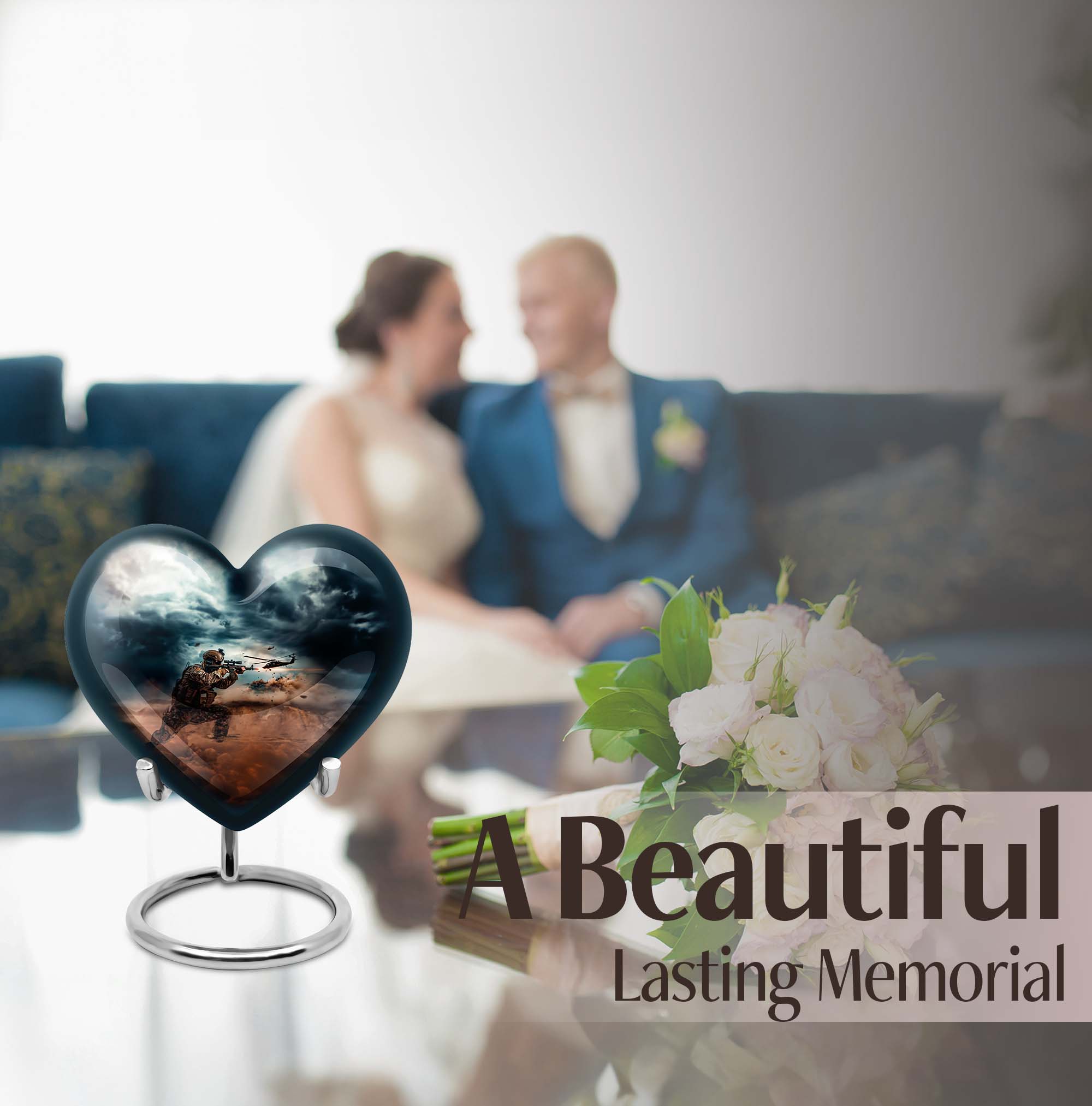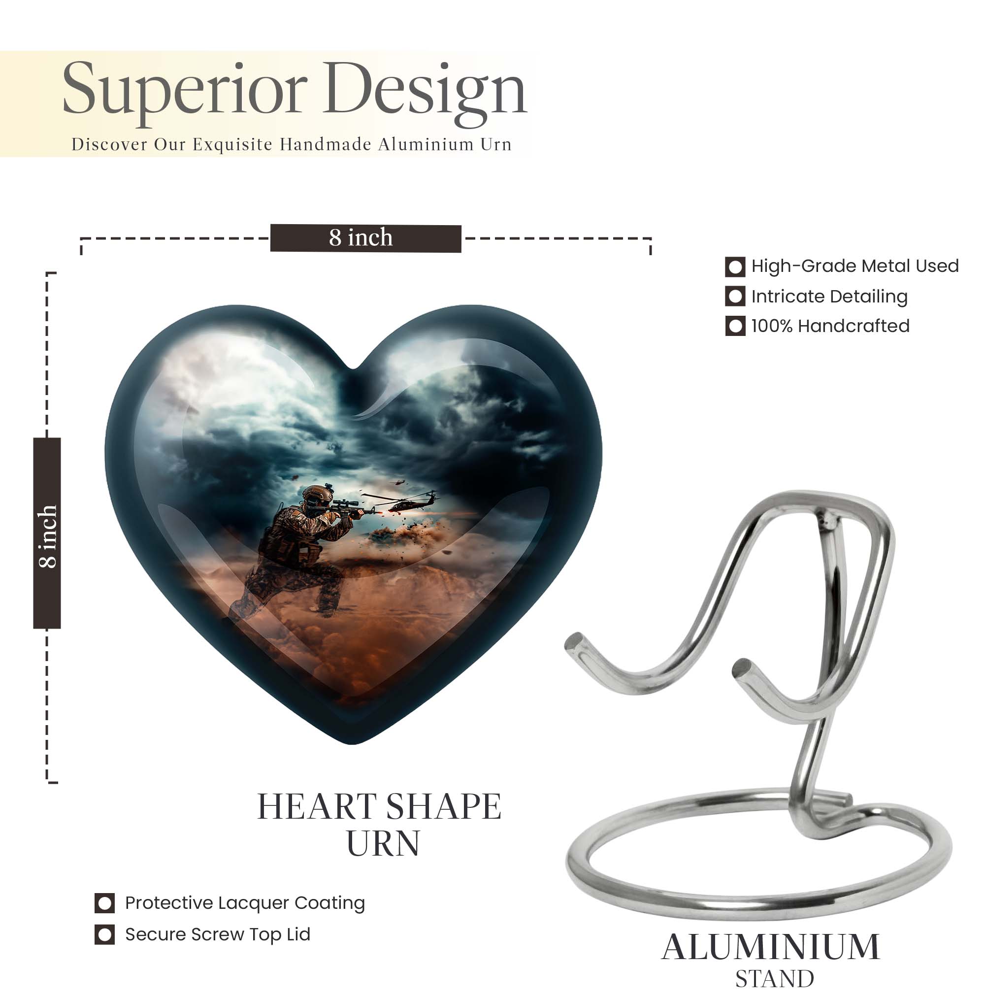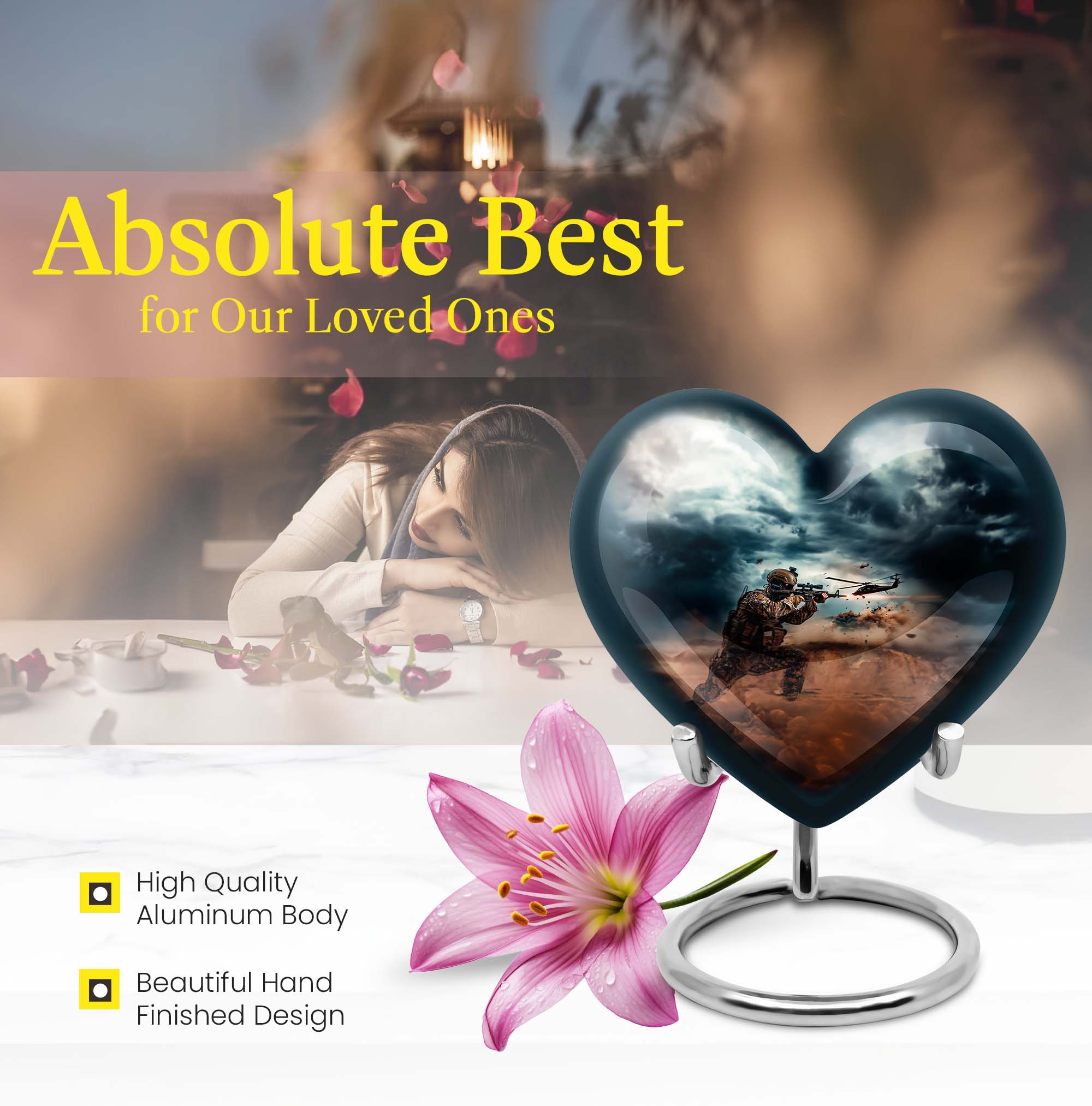 Honor your dearly departed with this meticulously crafted 10-inch military urn intended for human ashes. Our burial urn weighs 3.3 pounds and possesses a robust capacity of 200 cubic inches, culminating in an impressive memorial urn that nods respectfully to your loved ones. Molded from the highest quality aluminium, this high-capacity urn features an abstract theme that adds a serene touch to any memorial ceremony. It comes with a tasteful velvet pouch for sentimental containment of ashes. This large urn is more than just a token. Personalization options are available, allowing for the engraving of names to make a truly distinctive memorial piece. Frequently searched phrases such as 'funeral urn for mom', 'urn ash ashes adult', 'burial urns', and 'cremation urn adult' sum up this piece perfectly. Note: The urn design excluded from this description. Let this tastefully designed urn celebrate the eternal journey of your loved ones.