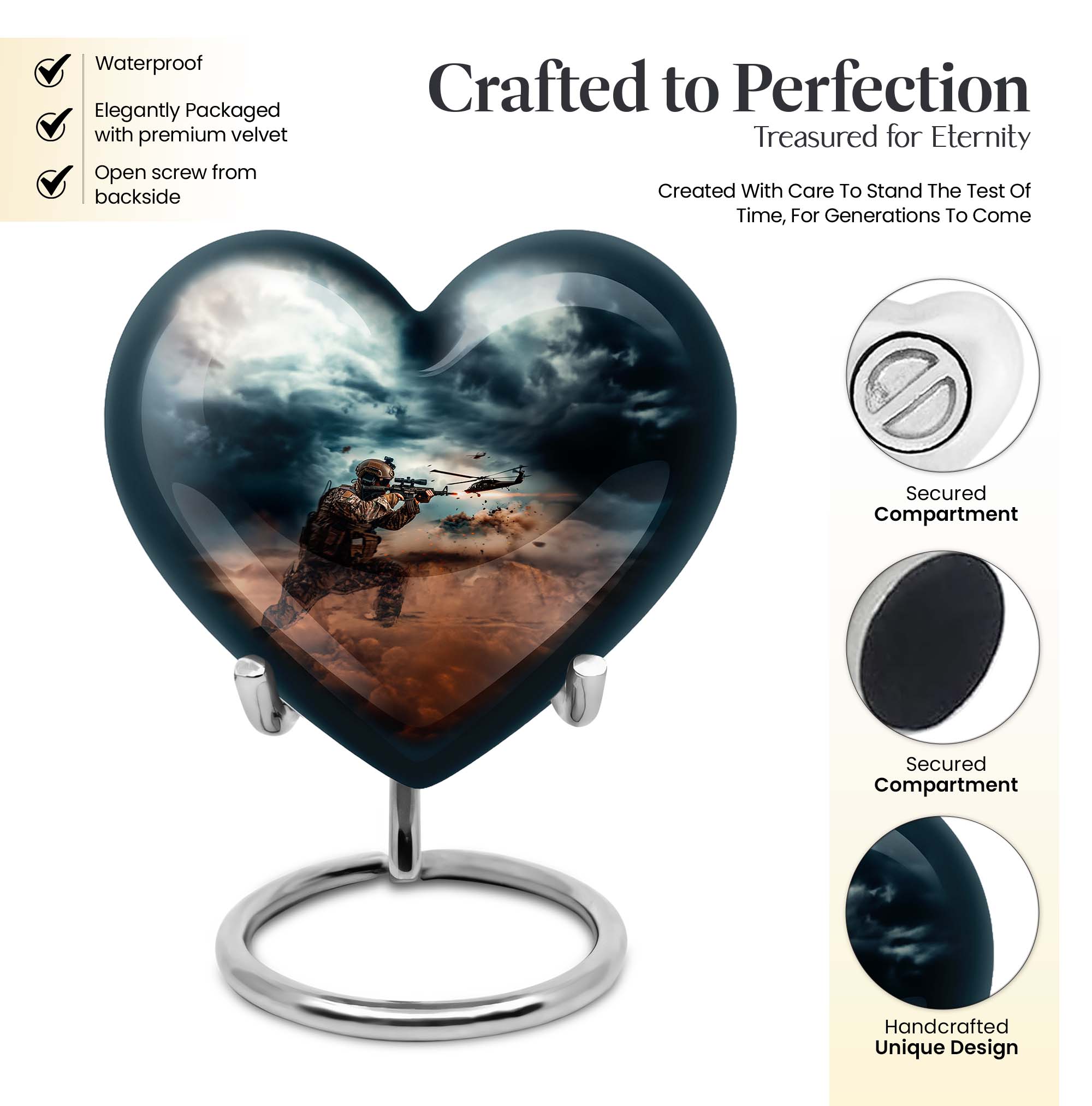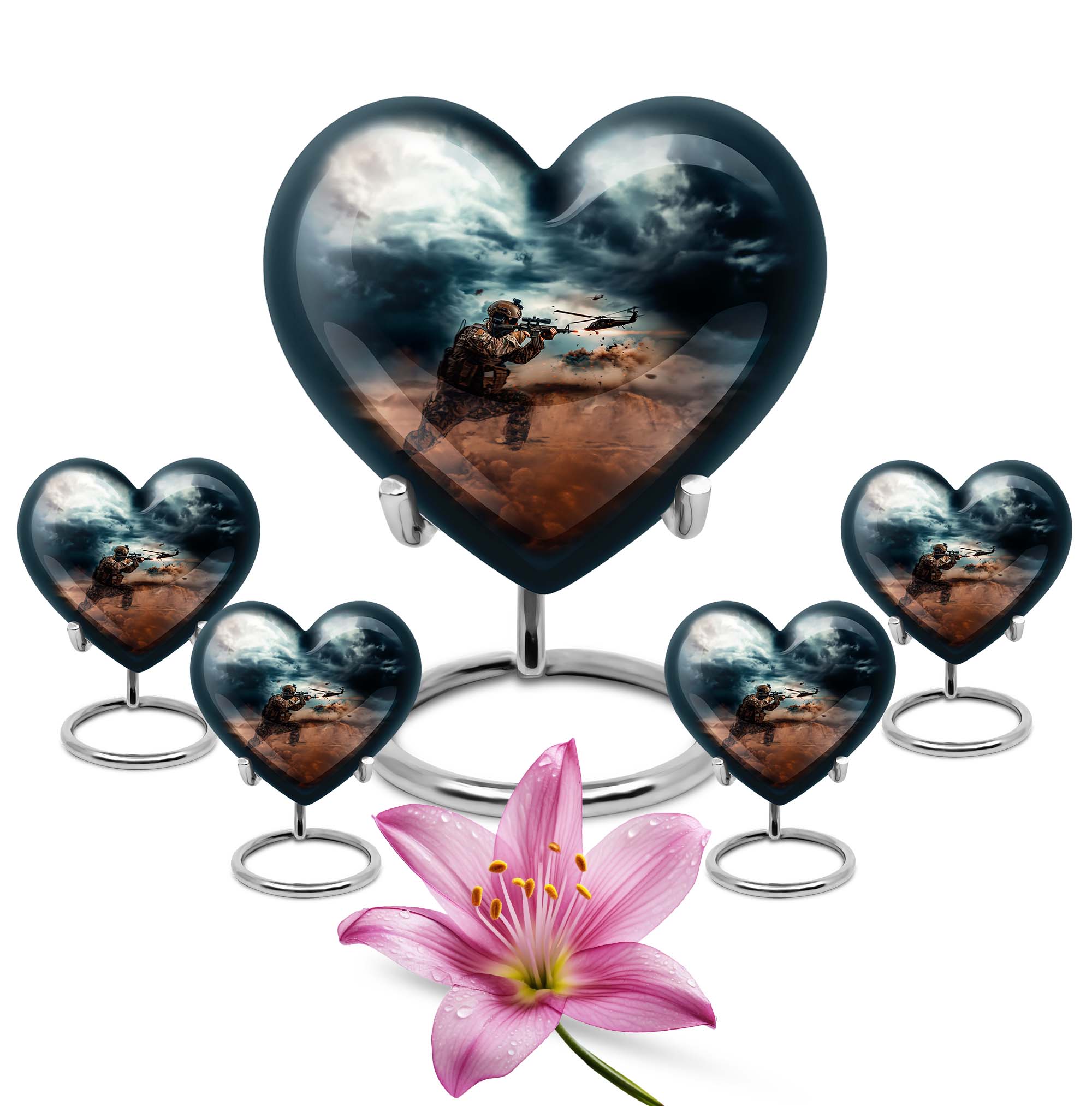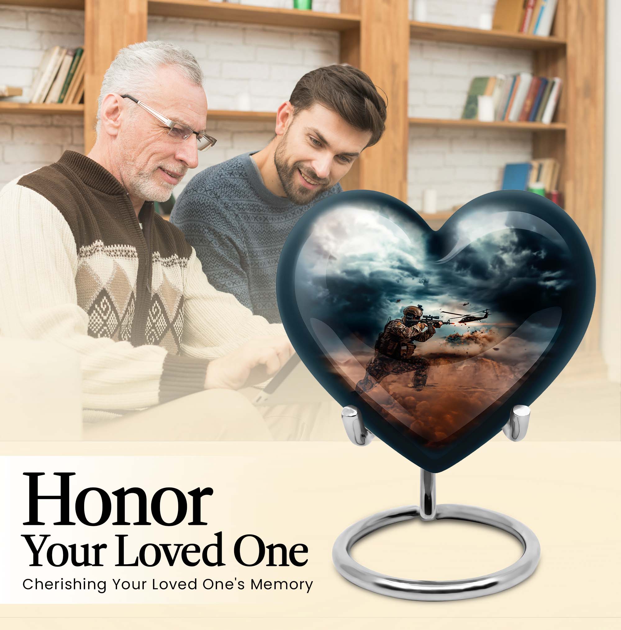 Honor your dearly departed with this meticulously crafted 10-inch military urn intended for human ashes. Our burial urn weighs 3.3 pounds and possesses a robust capacity of 200 cubic inches, culminating in an impressive memorial urn that nods respectfully to your loved ones. Molded from the highest quality aluminium, this high-capacity urn features an abstract theme that adds a serene touch to any memorial ceremony. It comes with a tasteful velvet pouch for sentimental containment of ashes. This large urn is more than just a token. Personalization options are available, allowing for the engraving of names to make a truly distinctive memorial piece. Frequently searched phrases such as 'funeral urn for mom', 'urn ash ashes adult', 'burial urns', and 'cremation urn adult' sum up this piece perfectly. Note: The urn design excluded from this description. Let this tastefully designed urn celebrate the eternal journey of your loved ones.