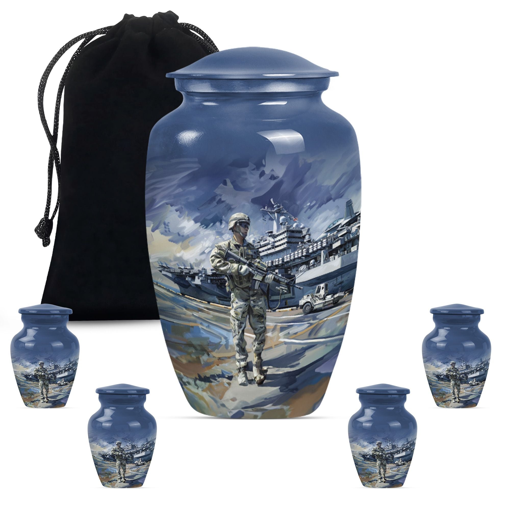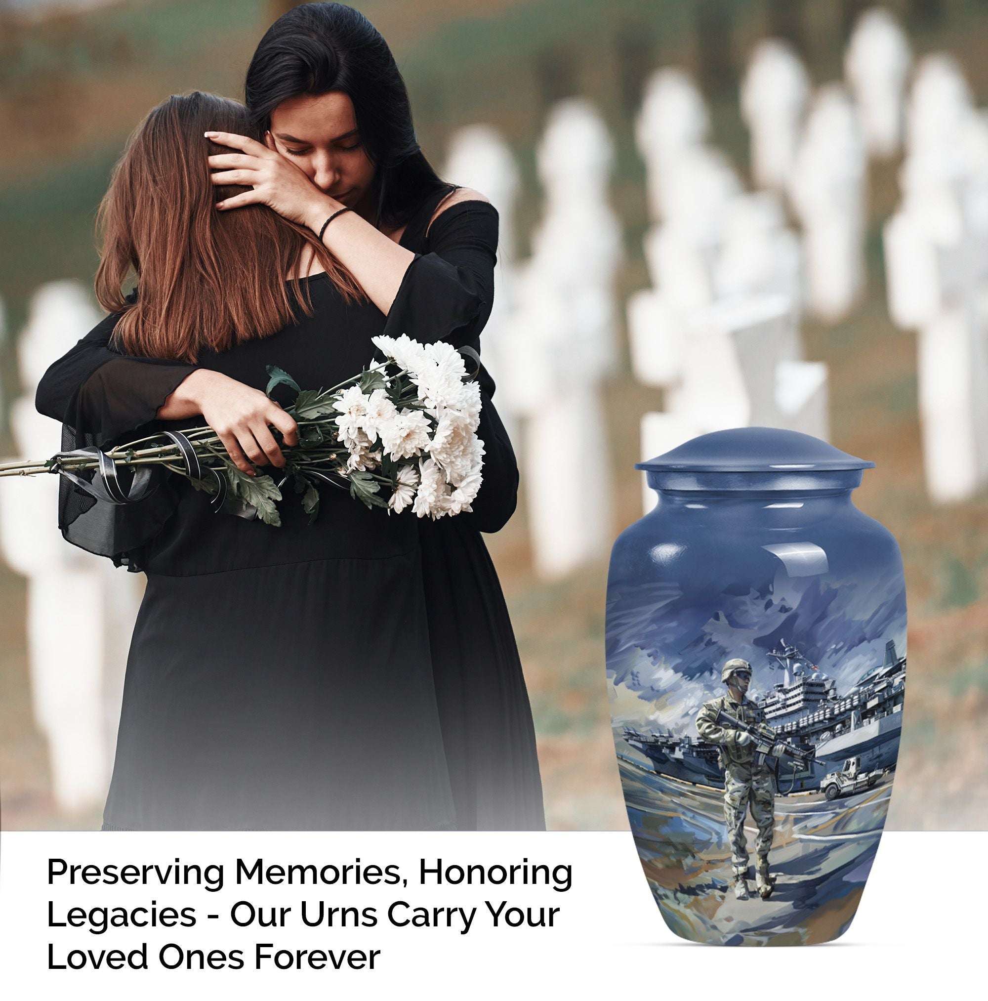 Preserve the memory of your lost loved ones with our distinguished military urn. An elegant and durable solution, this cremation urn boasts a 10-inch size, making it notably large and robust. With its classic urn design, it manifests an abstract theme that invokes poignant sentiments of nostalgia and honour. Made of premium quality Aluminium material, it bears a weight of 3.3 pounds, maintaining its stability whether placed at home or a mausoleum. Its 200 cubic inch capacity accommodates a considerable amount of ashes, kept secured within an accompanying velvet pouch. Our military urn allows for personalization with engraved names, adding an intimate touch to this keepsake. It's in demand among adults and seniors who commemorate their dear ones in profound dignity. Sought often under the keywords burial ashes urn, human ash urns, funeral urns and cremation urn for human ashes, this piece of memorial urn adds solemn respect to your cherished memories.