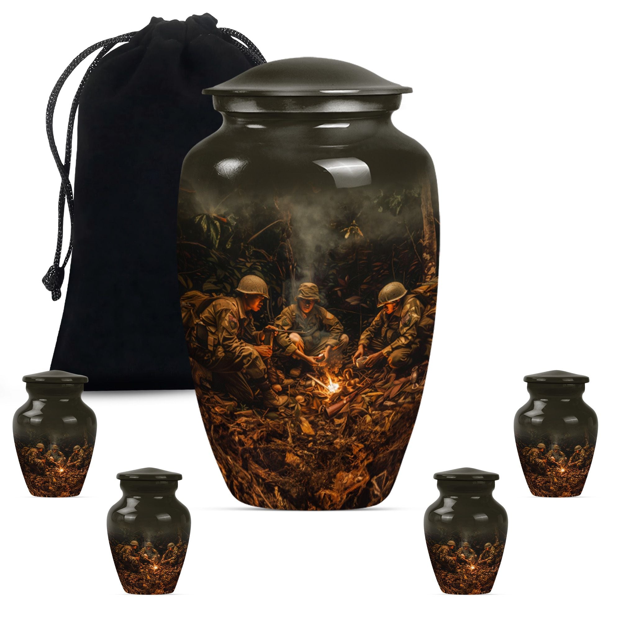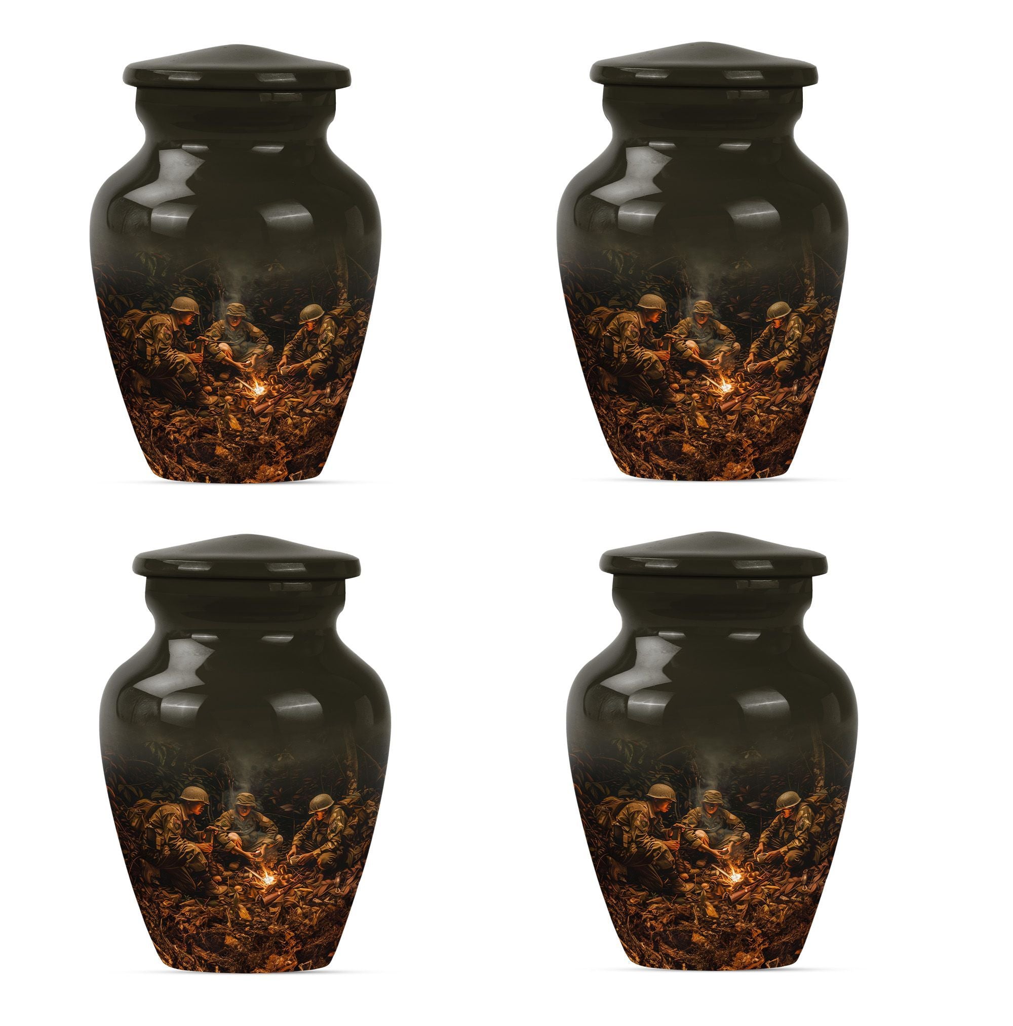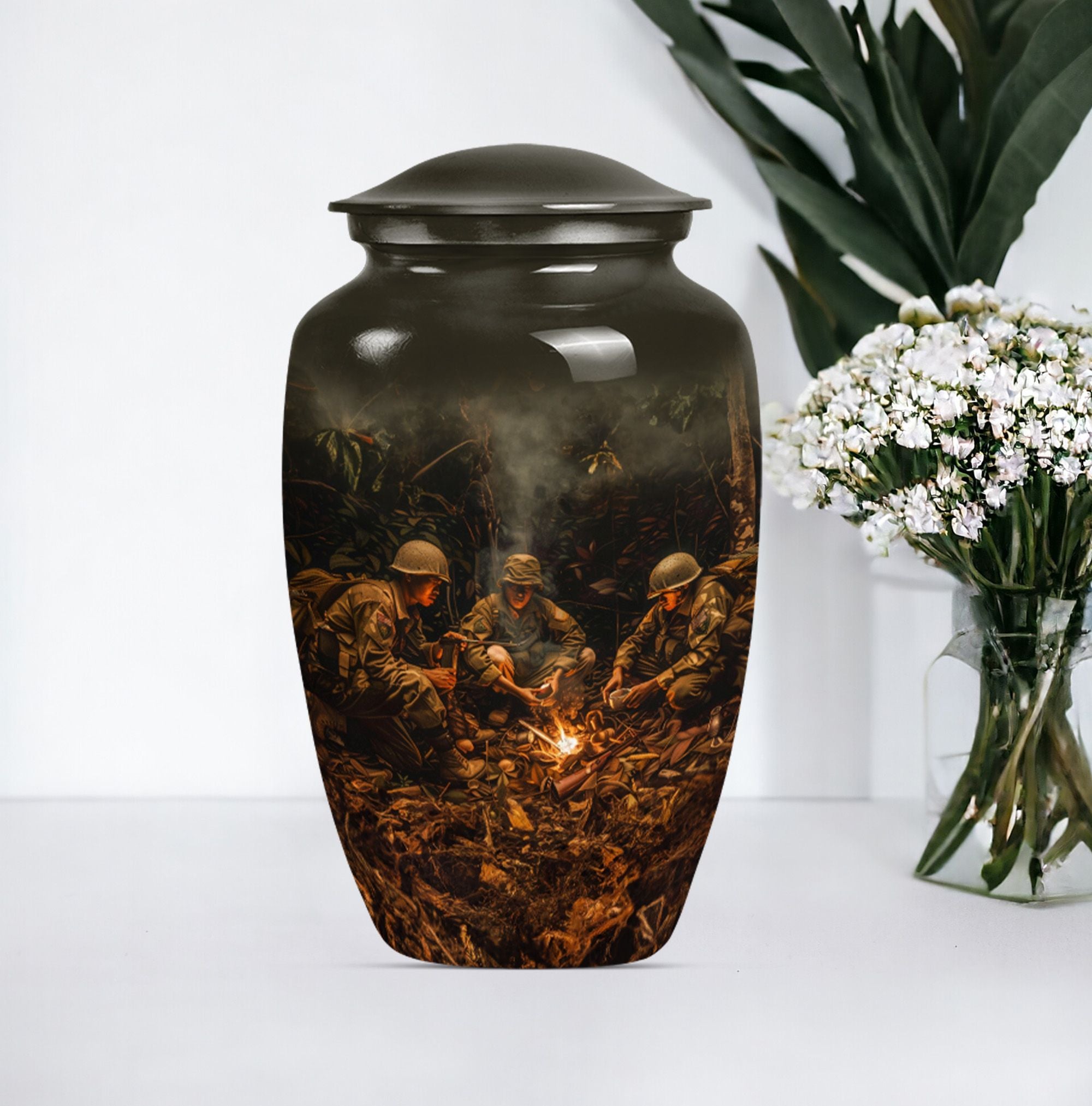 Our 'Classic Urn' epitomizes the union of elegance and simplicity. This piece, designed as a military urn, resonates with a feeling of solemn respect and honor. Crafted from high-quality aluminium, this urn is robust and has a substantial weight of 3.3 pounds. It stands at a dignified 10-inch height and can securely store up to 200 cubic inches of ashes. The urn comes complete with a velvet pouch, providing a tasteful and respectful means of containment for your cherished one's ashes. Personalization with engraved names is available, enabling you to commemorate your loved one in an intimate and personal manner. This makes an ideal choice for 'memorial adult urns for human ashes' catering to both women and men. Its unique abstract theme sets it apart, appealing to those seeking 'large urns for cremation ashes', 'adult urns', 'large funeral urns' or 'cremation urns for women'. Honor your loved one's memory with our distinct and dignified 'Classic Urn'.