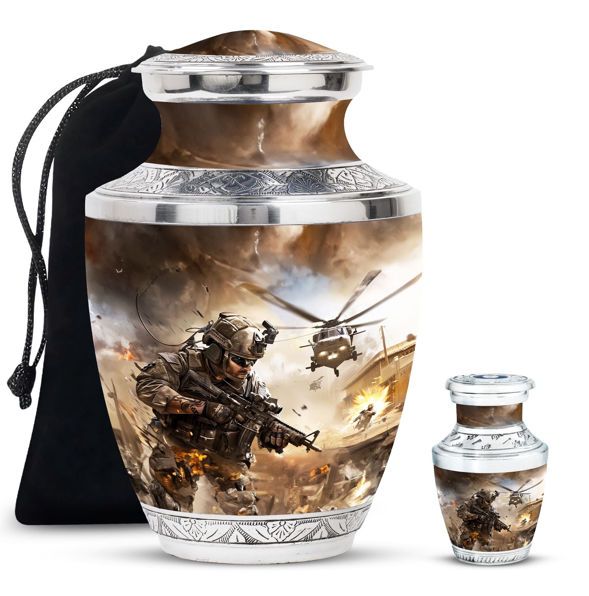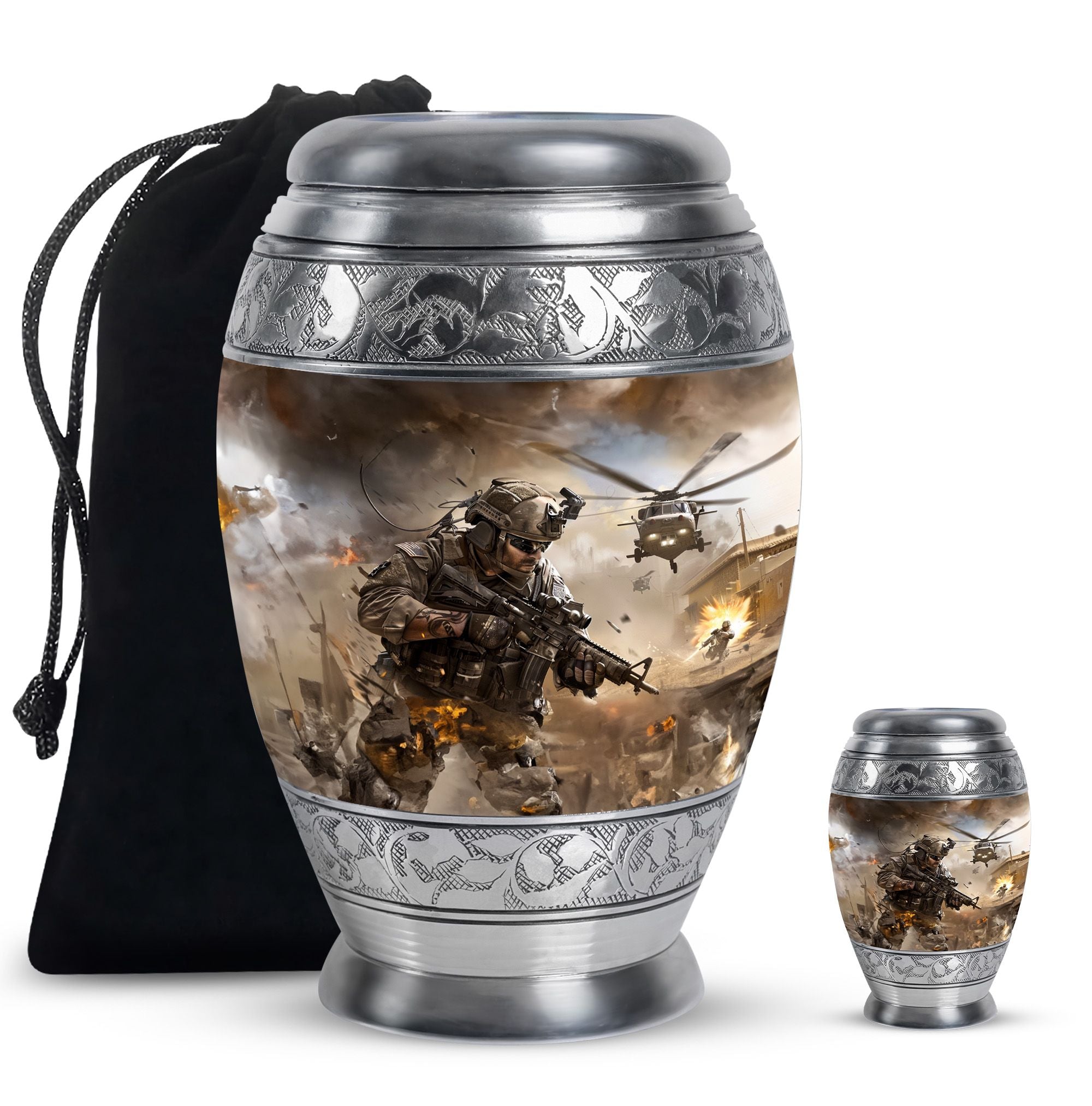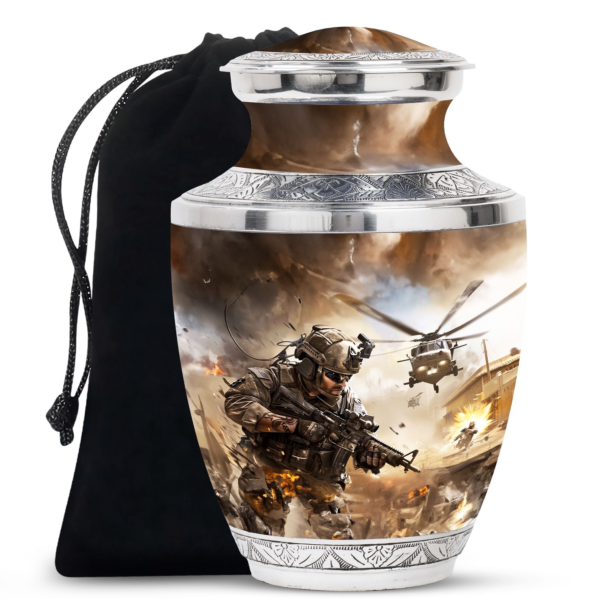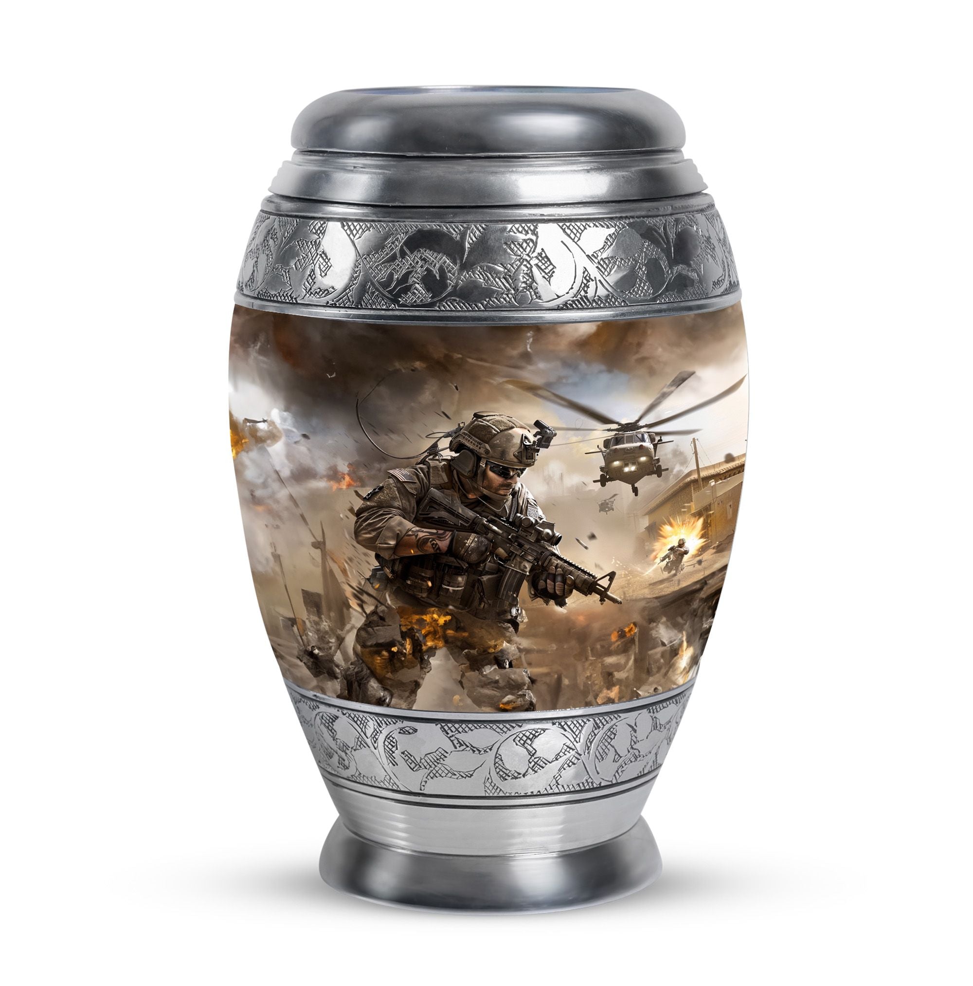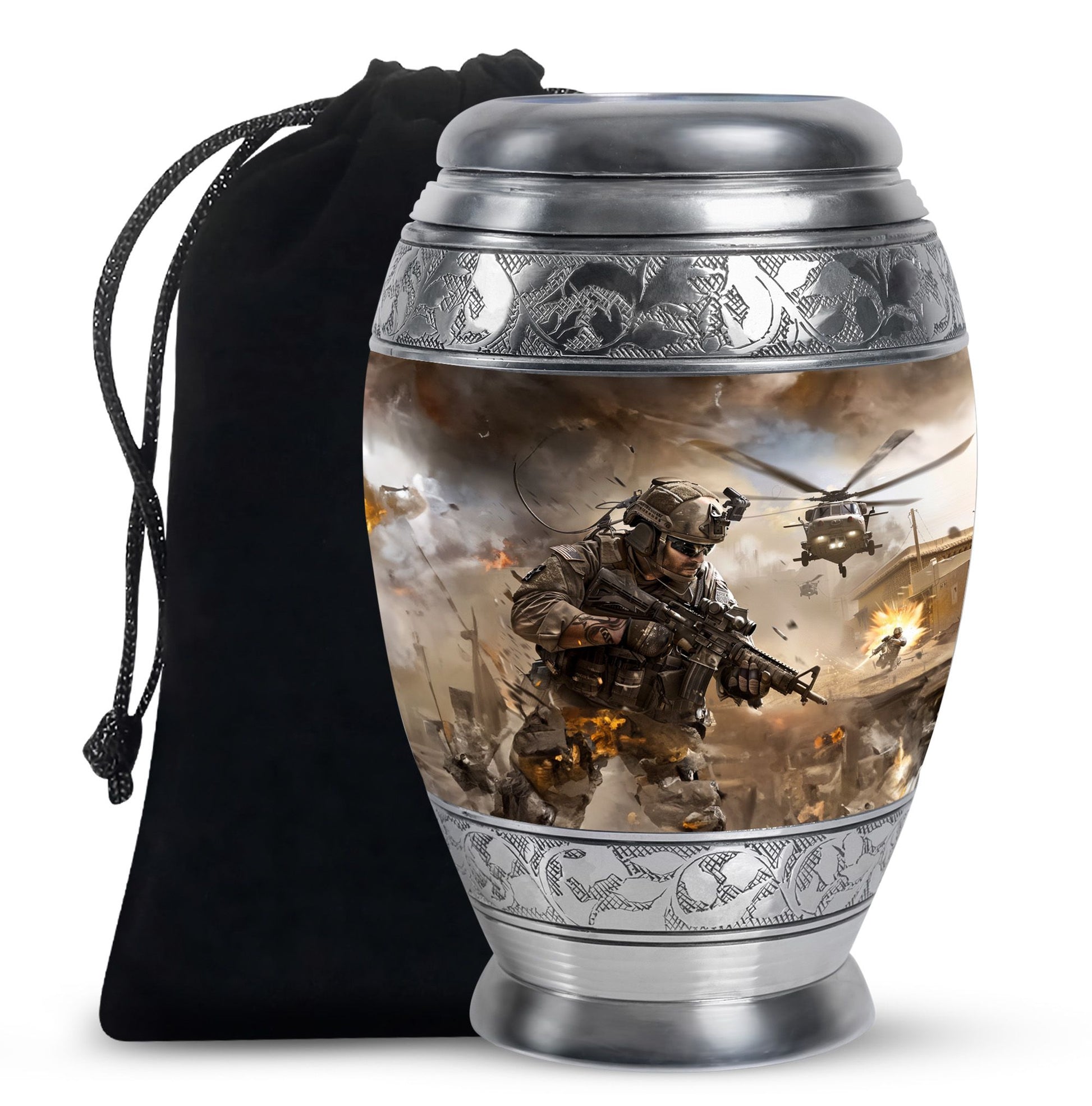 This **cremation urn for human ashes** **is designed to represent the honor and sacrifice of a devoted soldier, ensuring their memory is preserved with dignity**.