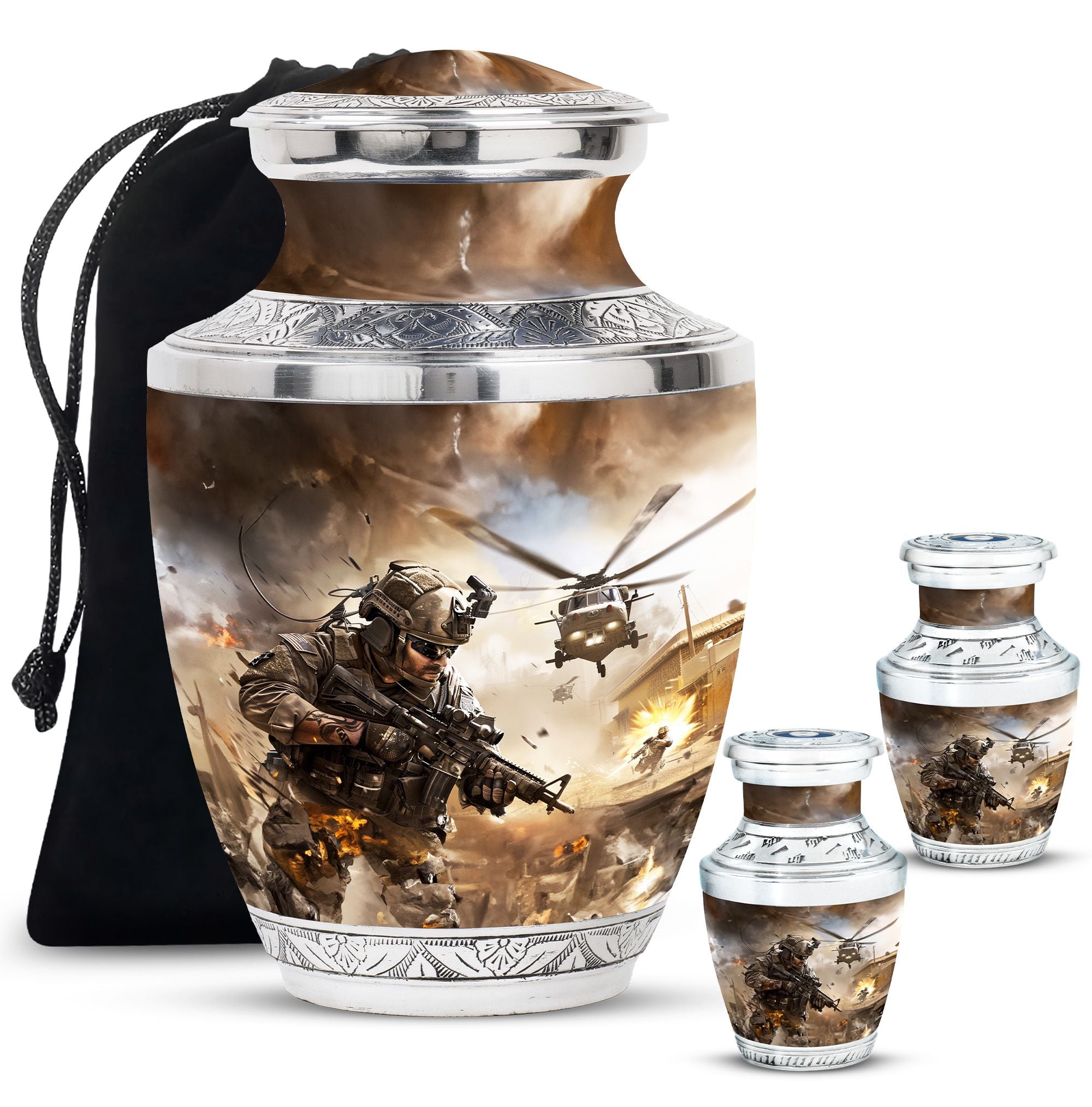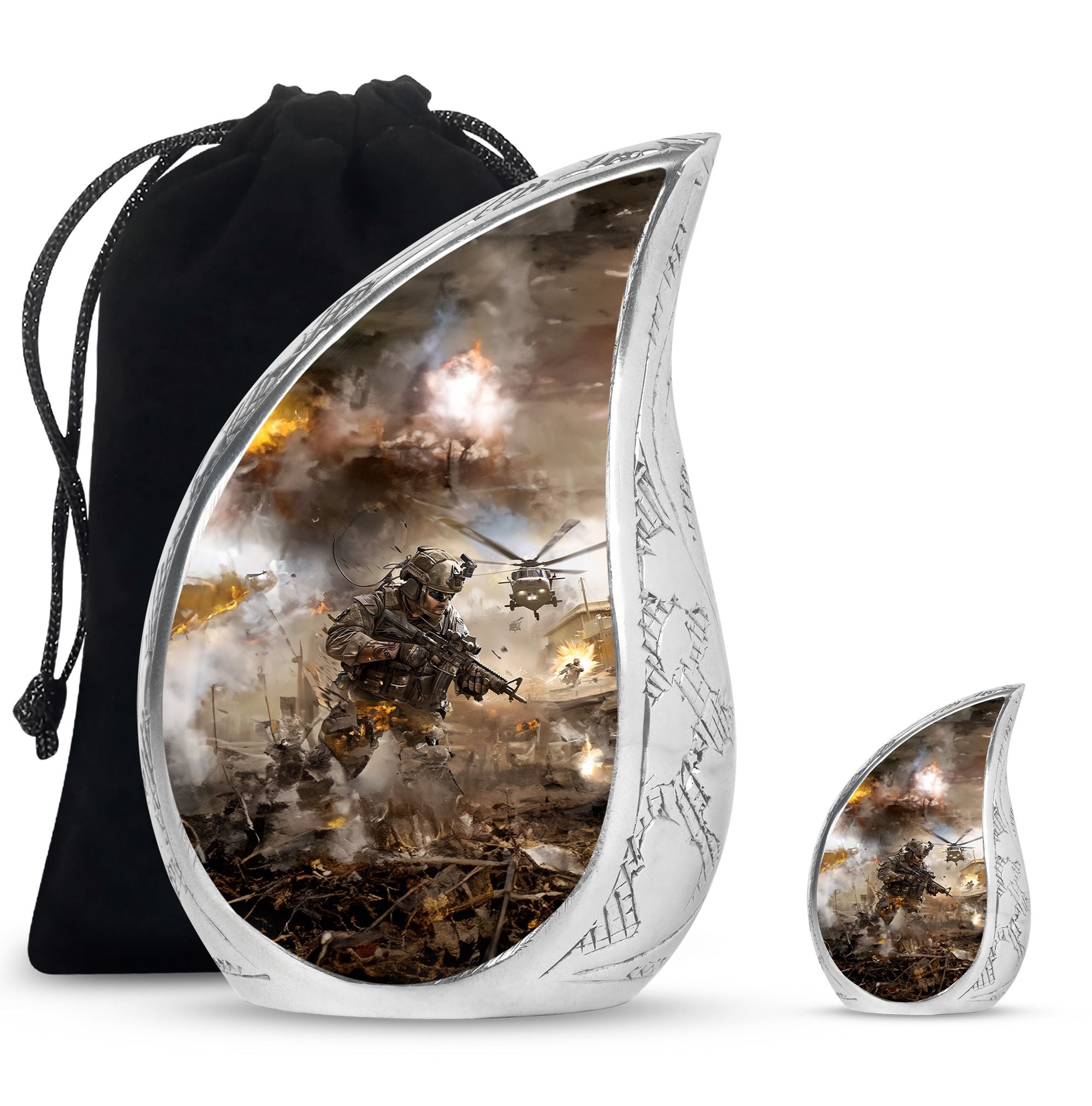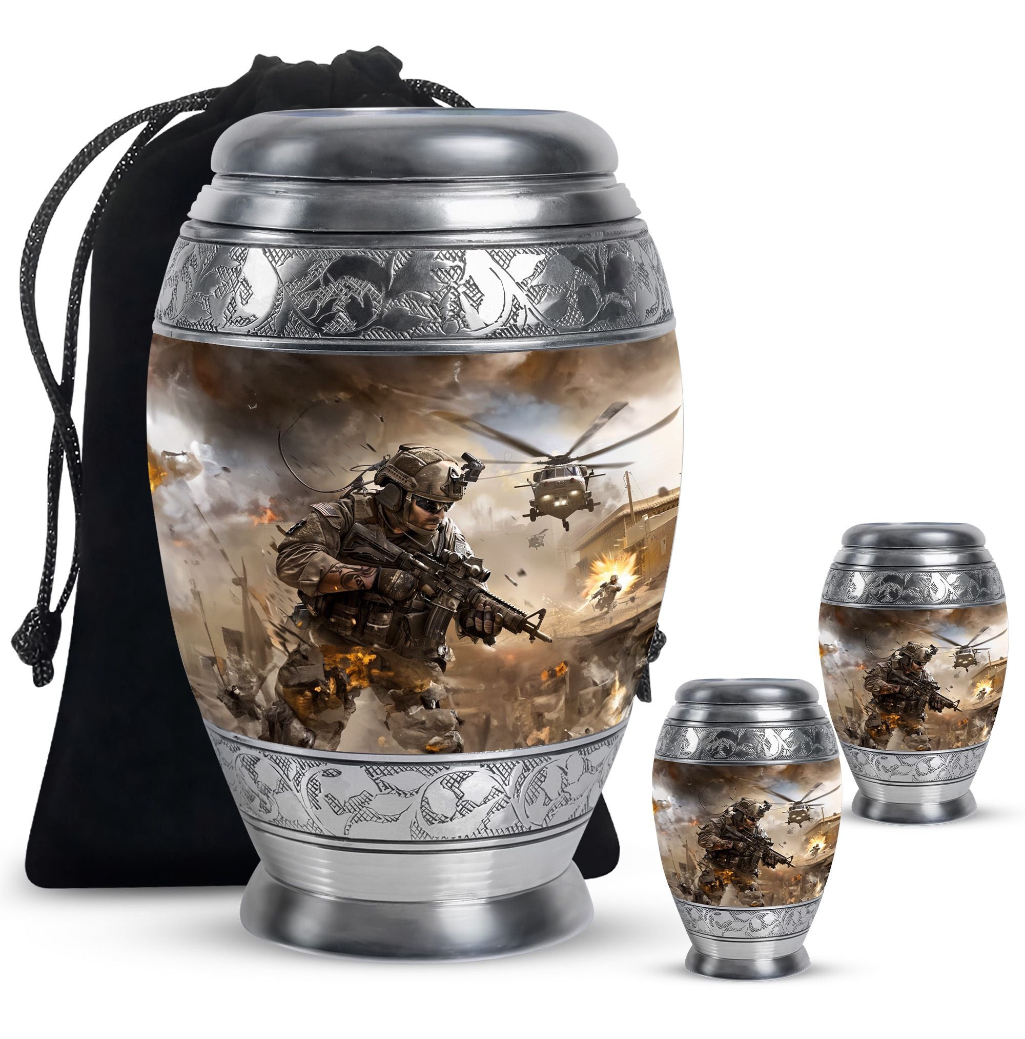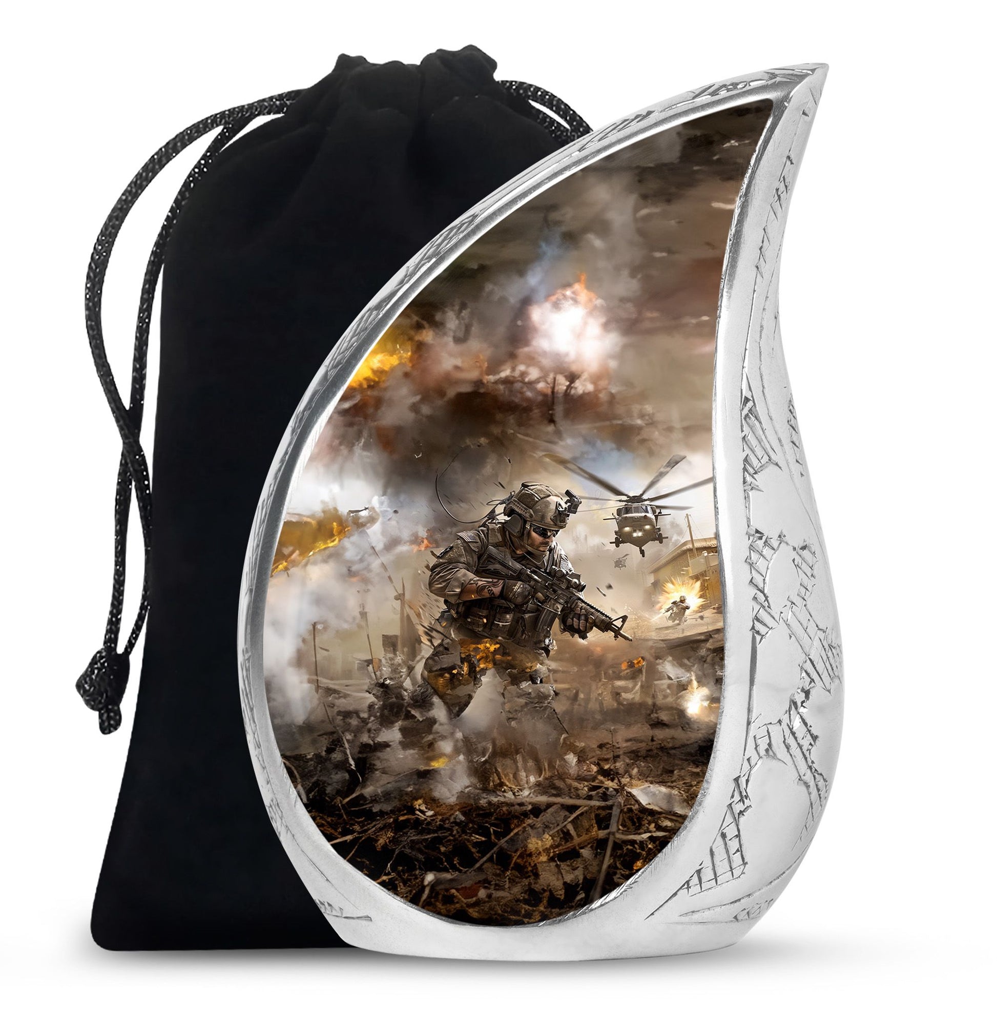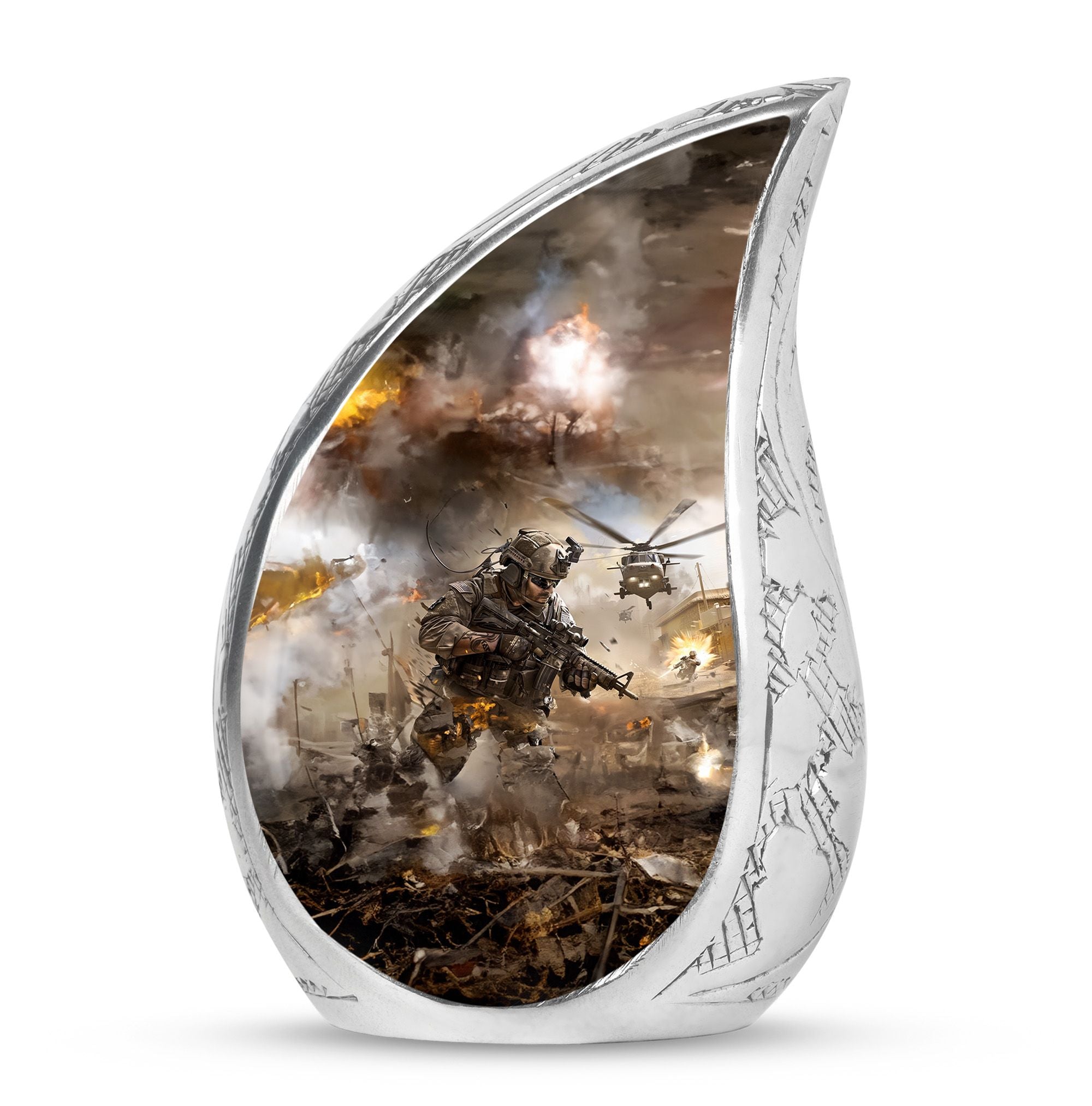 This **cremation urn for human ashes** **is designed to represent the honor and sacrifice of a devoted soldier, ensuring their memory is preserved with dignity**.