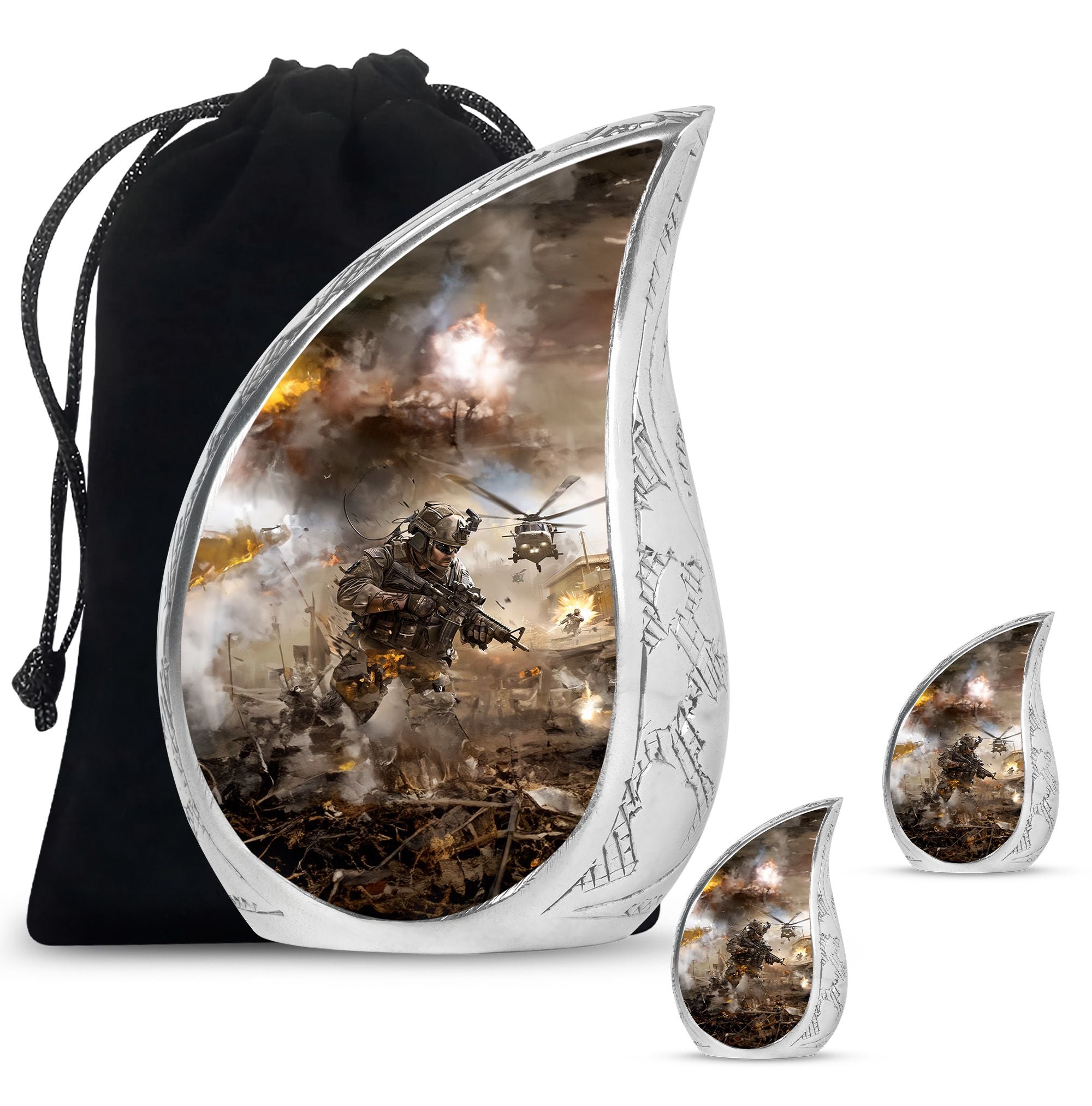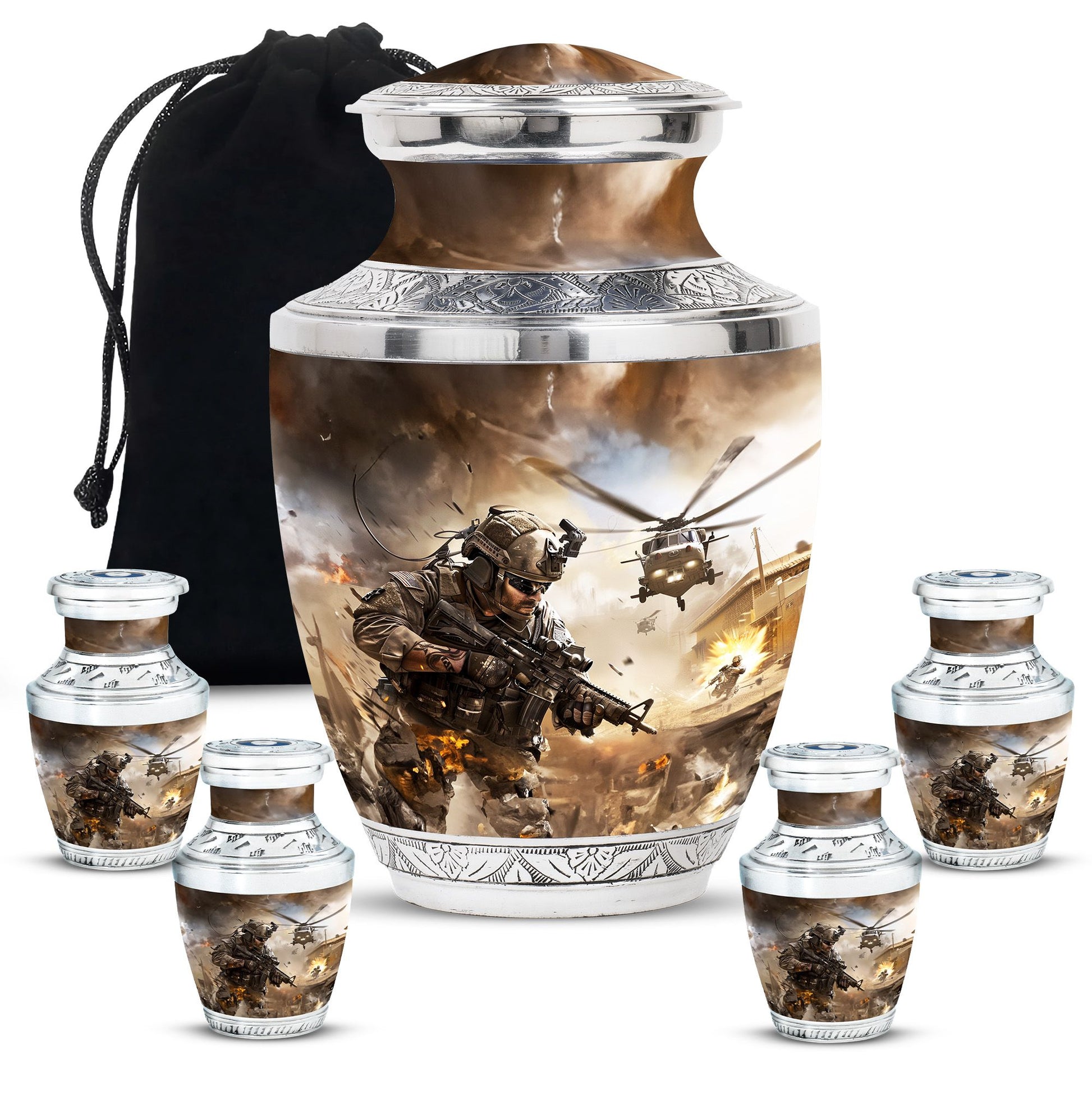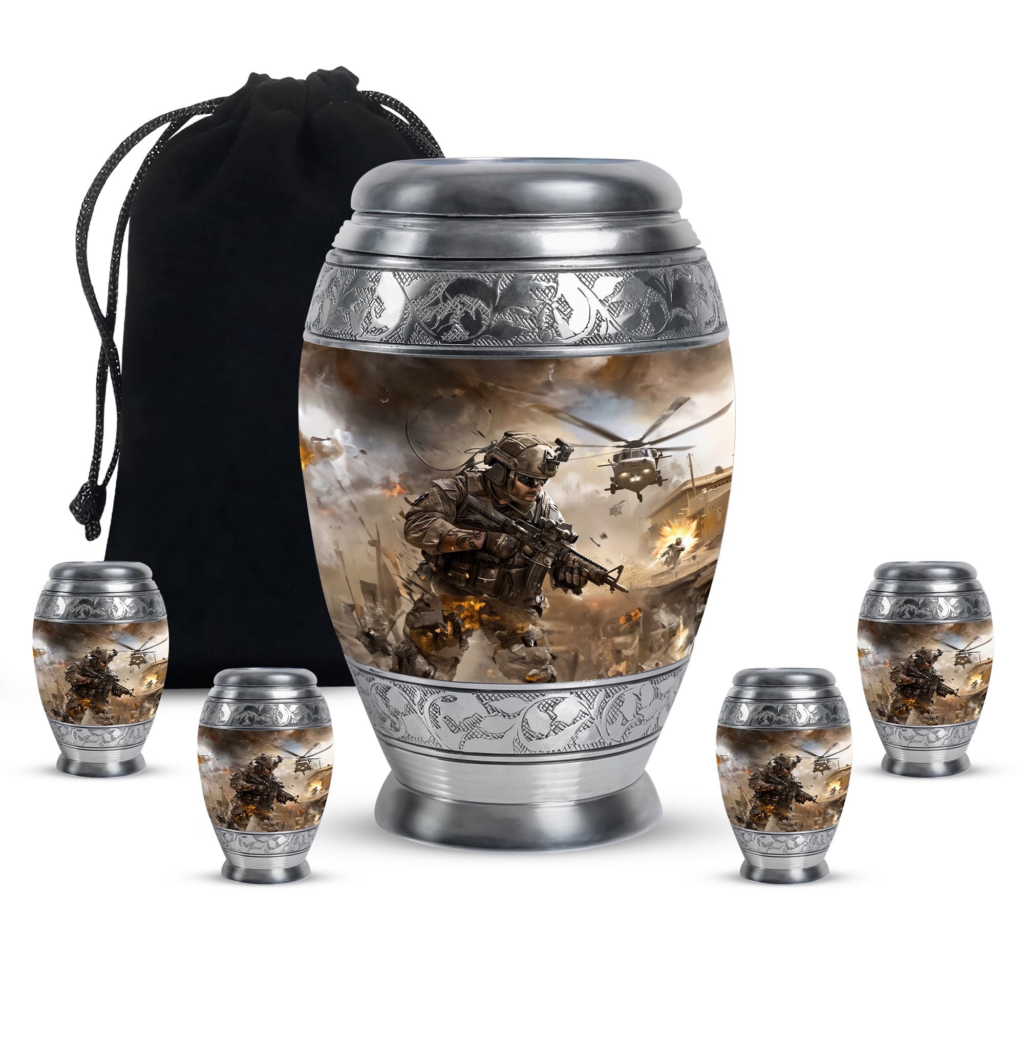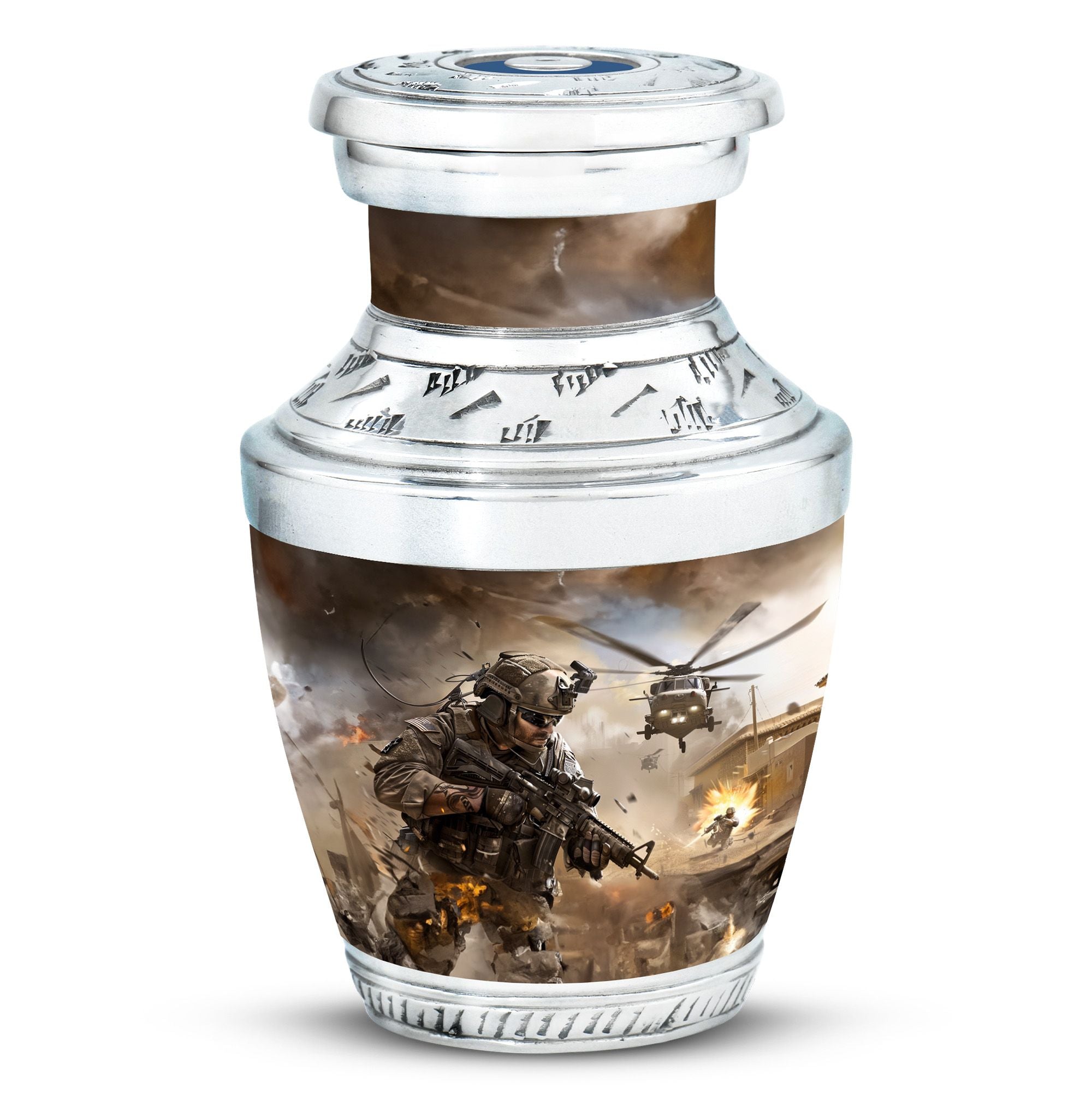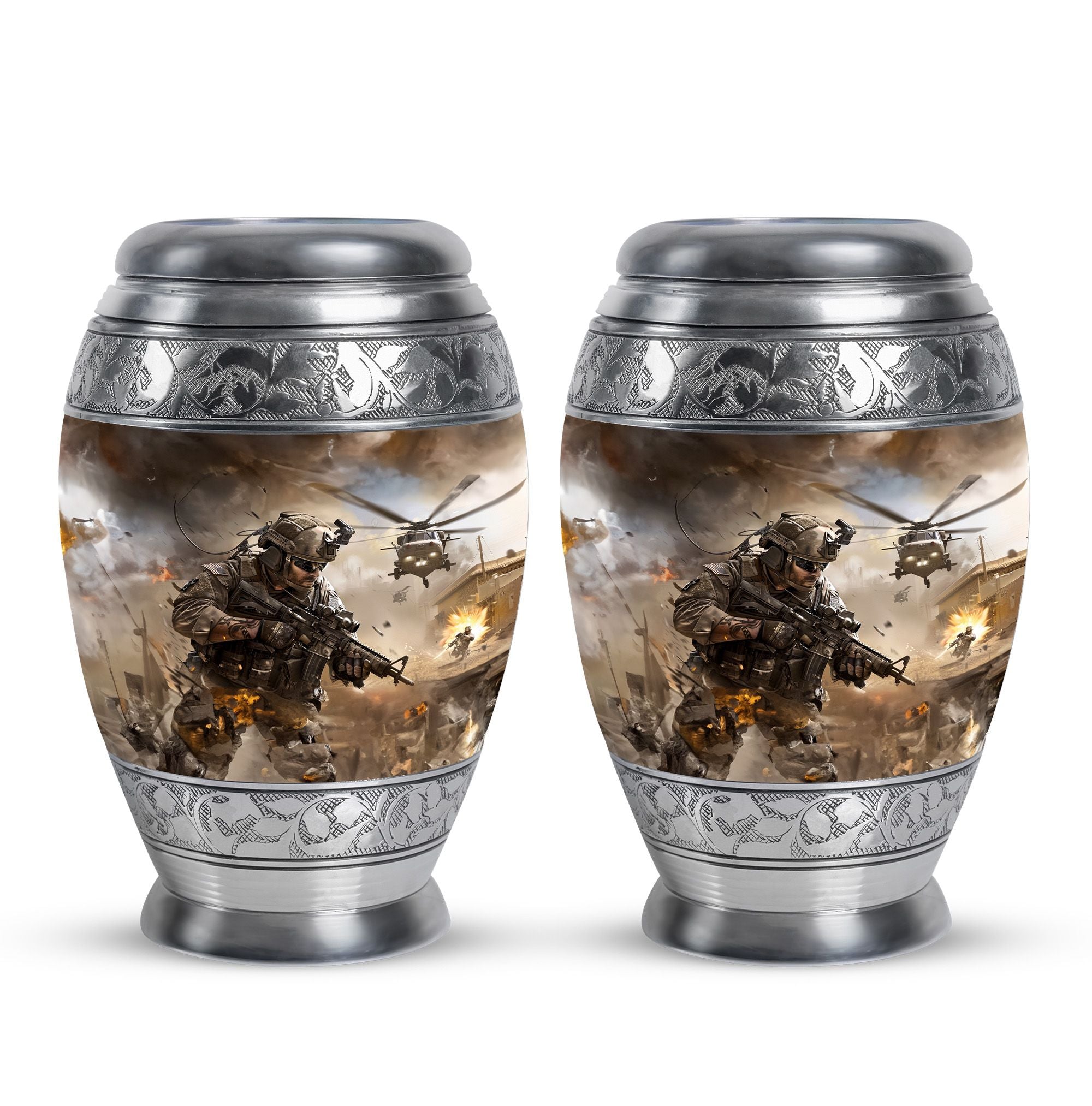 This **cremation urn for human ashes** **is designed to represent the honor and sacrifice of a devoted soldier, ensuring their memory is preserved with dignity**.