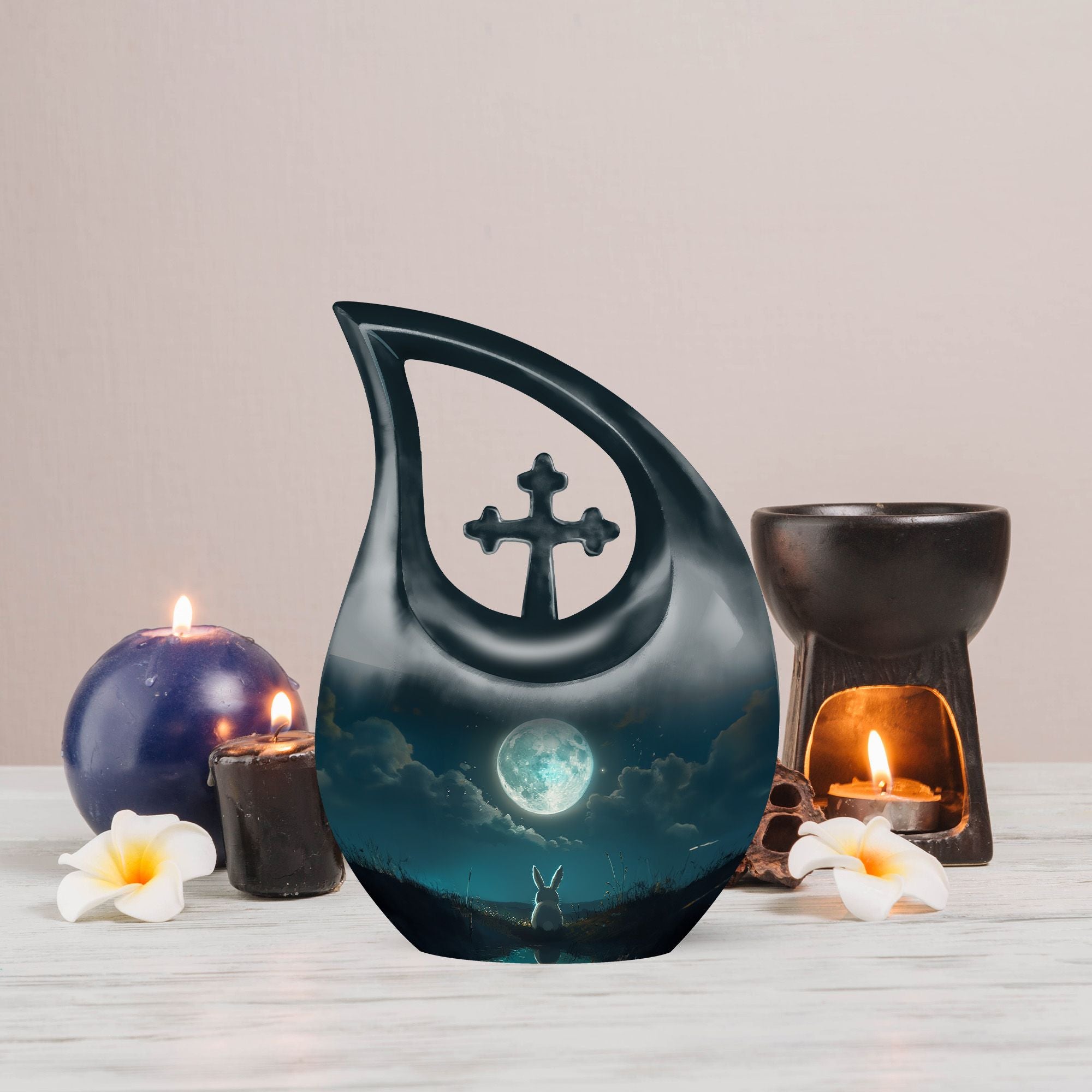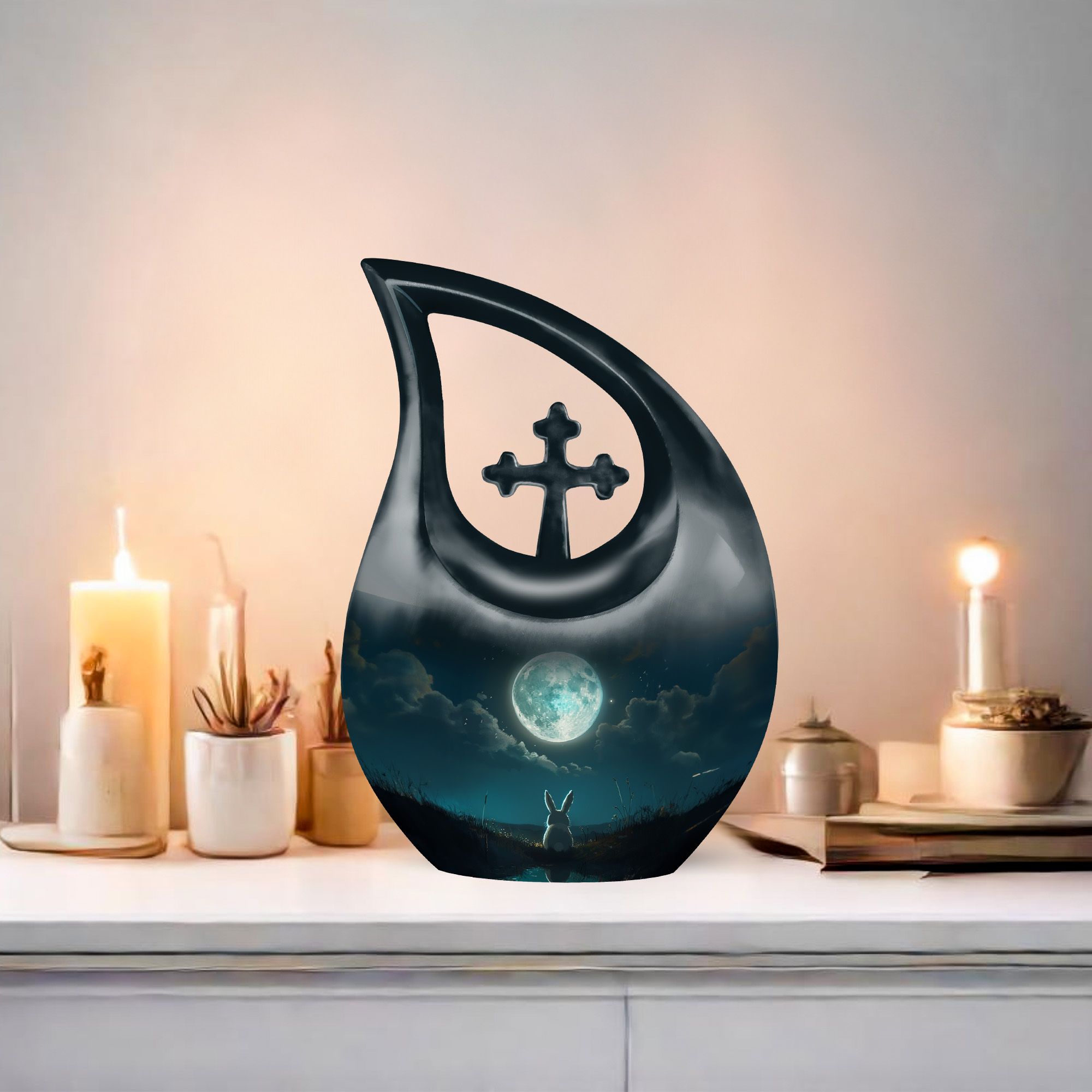 Seek solace in the unique and serene, White Bunny Moon Urn. This large urn is unrivaled in its beauty and symbolism, elegantly forged from durable Aluminium. Measuring at 10 inches in height, and with a weight of 3.3 pounds, it holds an impressive capacity of 200 cubic inches. Its robust construction, combined with an unusual and compelling 'Cross Drop' theme, makes for a significant keepsake or a striking centrepiece. Beyond its aesthetic appeal, this memorial urn comes with the opportunity for customization. Add a personal touch to your tribute by engraving names on it, creating an enduring connection with your loved ones. The product arrives ready for use, inclusive of a velvet pouch for respectful containment of ashes. Whether in search of Custom Mom Urn, Decorative Urns or Unusual Urns For Ashes, this White Bunny Moon Urn offers an exclusive yet thoughtful option to remember and honour your cherished ones.