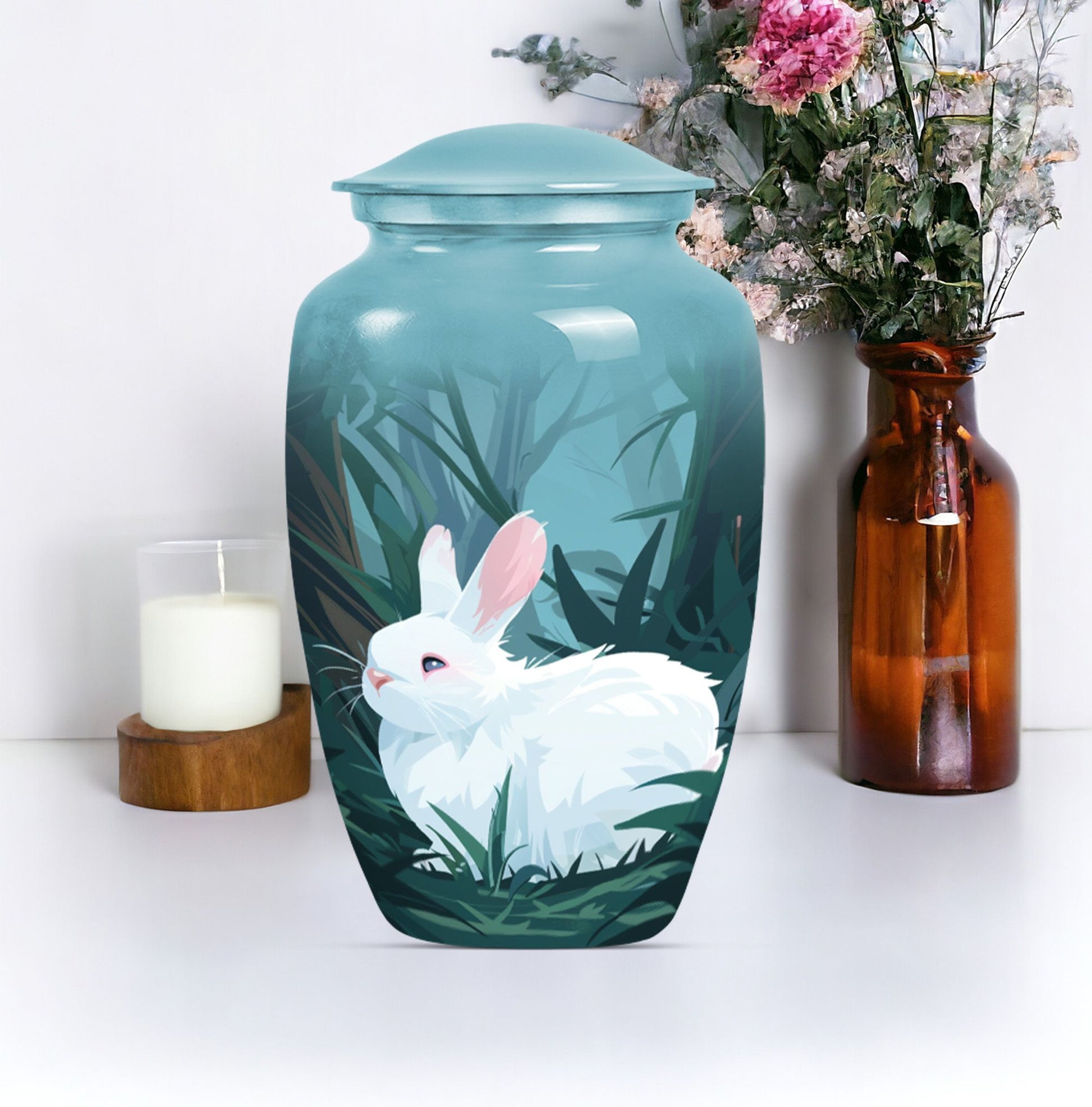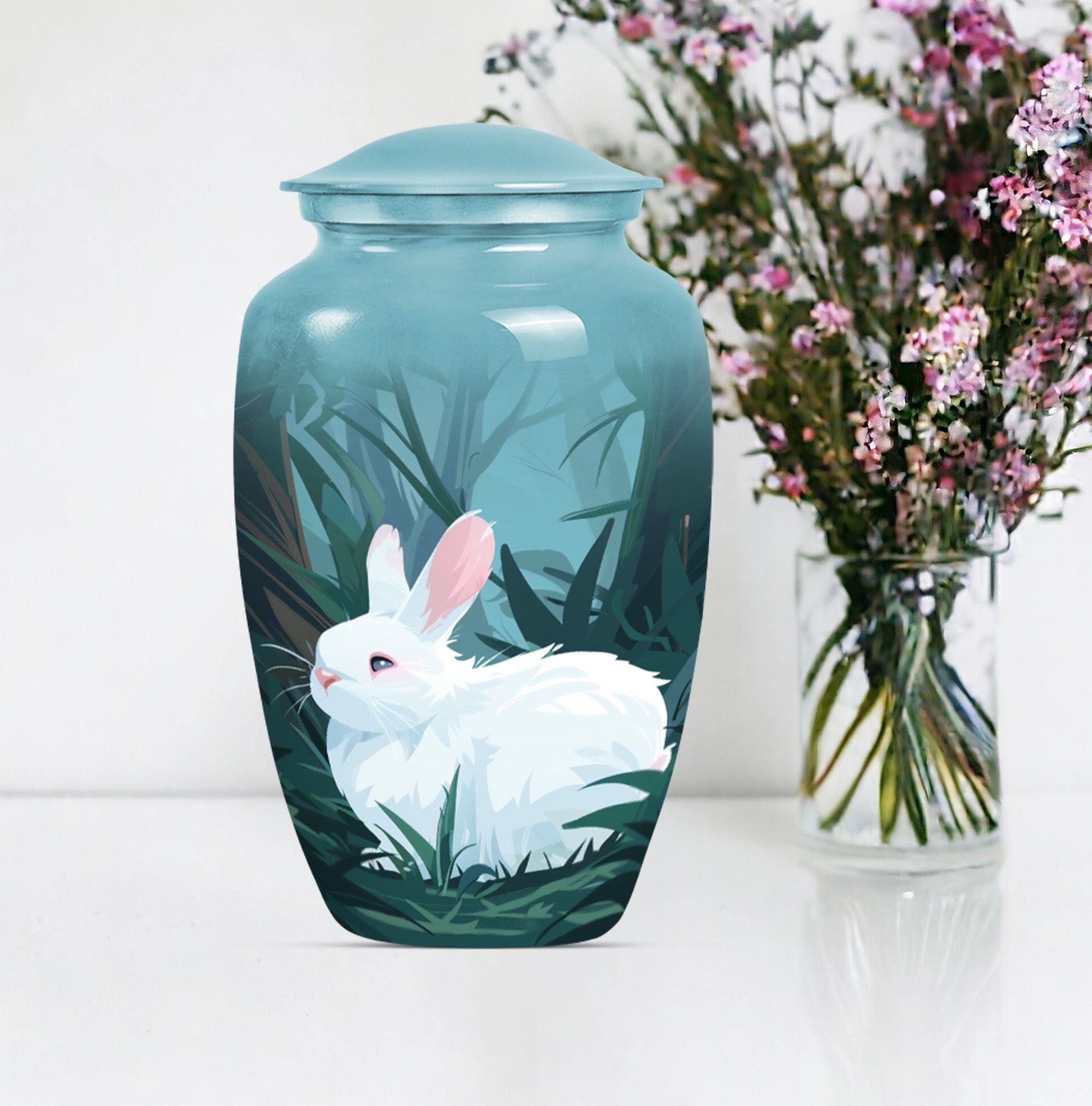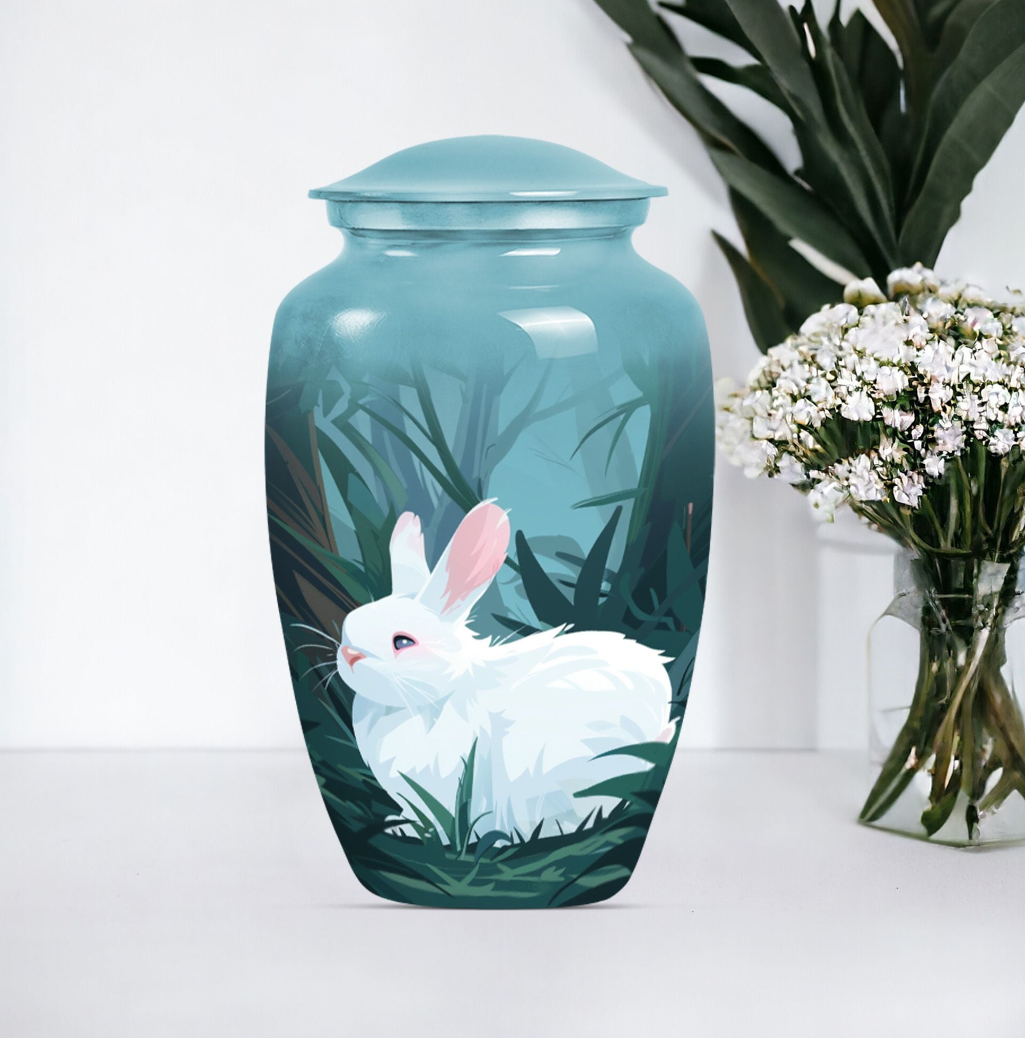 Commanding reverence with its timeless elegance, this white bunny moon urn serves as the noble final resting place for your loved ones. Resiliently built using aluminium, this 10-inch large urn is capable of securely containing around 200 cubic inches of sacred human ashes. The abstract theme further lends a sense of profound peace and tranquillity to the piece. The urn comes with a velvety pouch, delicately crafted for the containment of the treasured remnants. To add a personal touch, customization options are available where you may inscribe engraved names onto the urn. Specially catering to your memorial ceremony needs, this cremation urn straddles the spectrum of being both high-quality and weighty at 3.3 pounds presenting uncompromising stability. Whether you envision a burial in the ground or desire to store the ashes at home, this urn easily stands up to your requirements. Not to mention, it's an empathetic addition for those longing for wearable tributes like cremation rings for ashes. As a poignant reminder of your enduring love, this urn encapsulates cherished memories with eminent serenity.