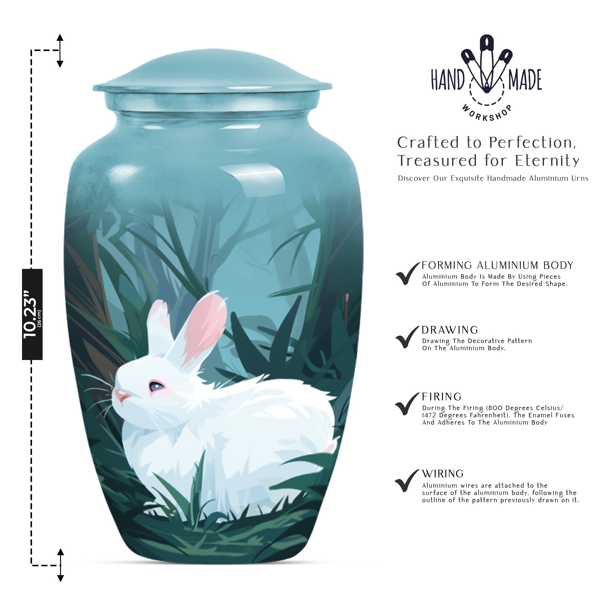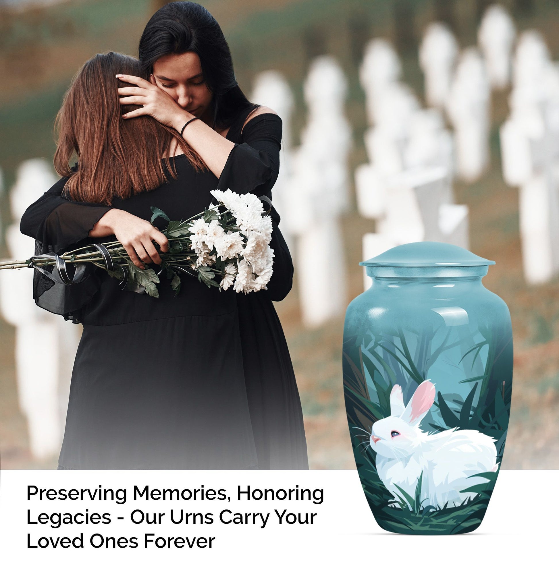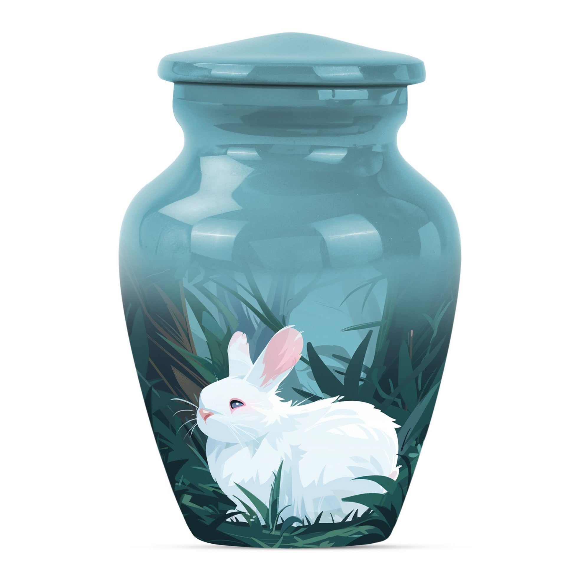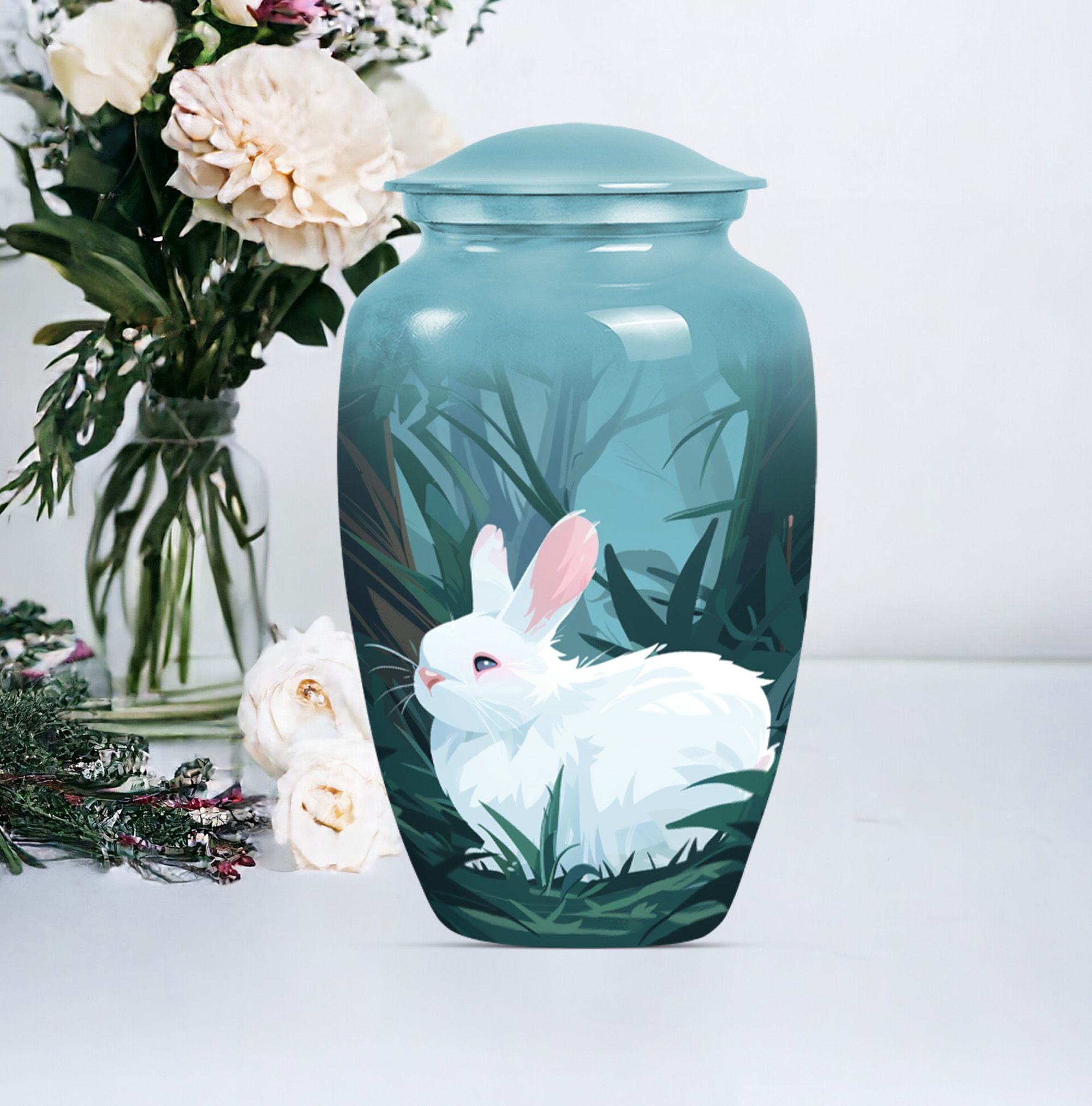 Commanding reverence with its timeless elegance, this white bunny moon urn serves as the noble final resting place for your loved ones. Resiliently built using aluminium, this 10-inch large urn is capable of securely containing around 200 cubic inches of sacred human ashes. The abstract theme further lends a sense of profound peace and tranquillity to the piece. The urn comes with a velvety pouch, delicately crafted for the containment of the treasured remnants. To add a personal touch, customization options are available where you may inscribe engraved names onto the urn. Specially catering to your memorial ceremony needs, this cremation urn straddles the spectrum of being both high-quality and weighty at 3.3 pounds presenting uncompromising stability. Whether you envision a burial in the ground or desire to store the ashes at home, this urn easily stands up to your requirements. Not to mention, it's an empathetic addition for those longing for wearable tributes like cremation rings for ashes. As a poignant reminder of your enduring love, this urn encapsulates cherished memories with eminent serenity.