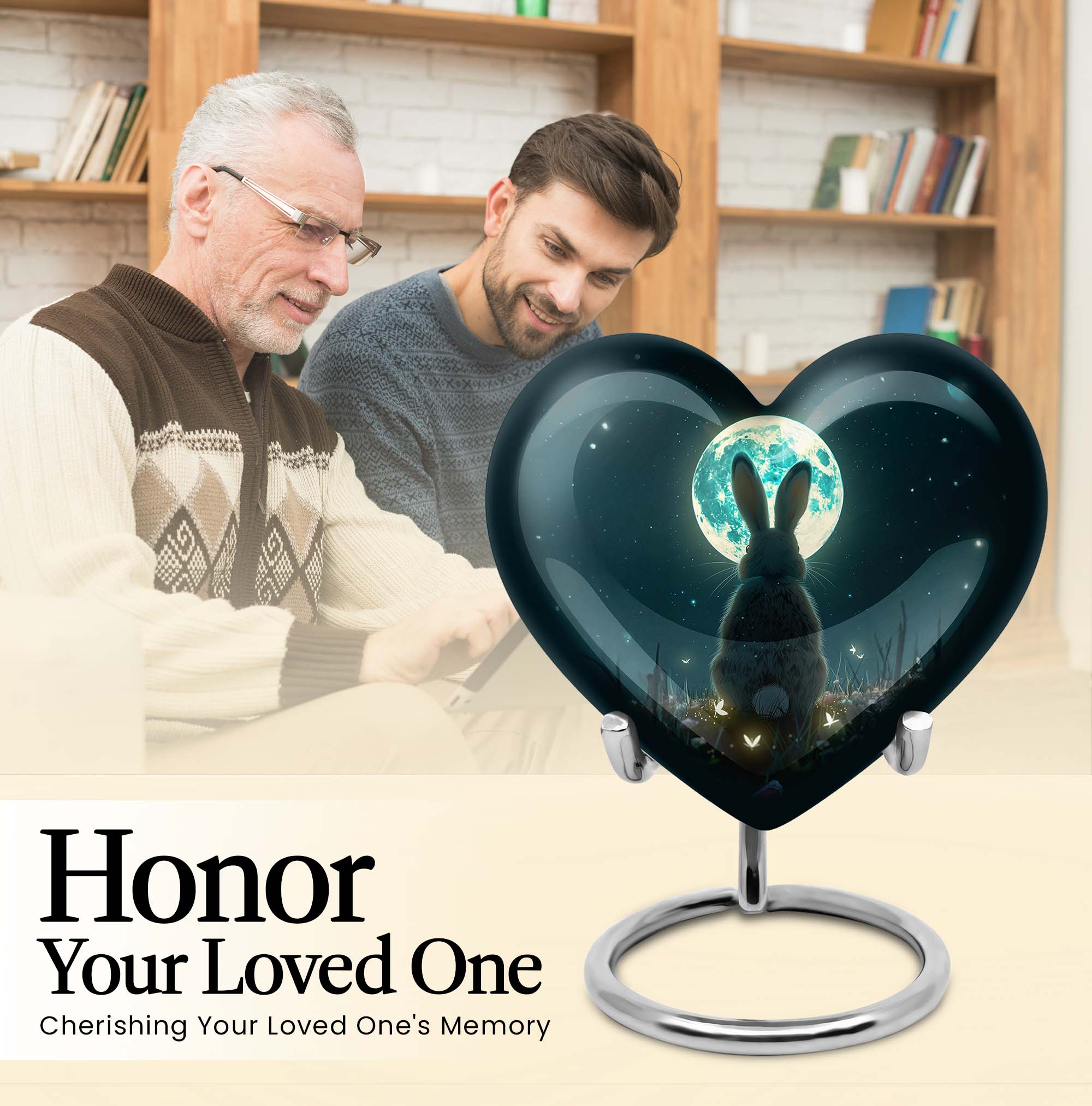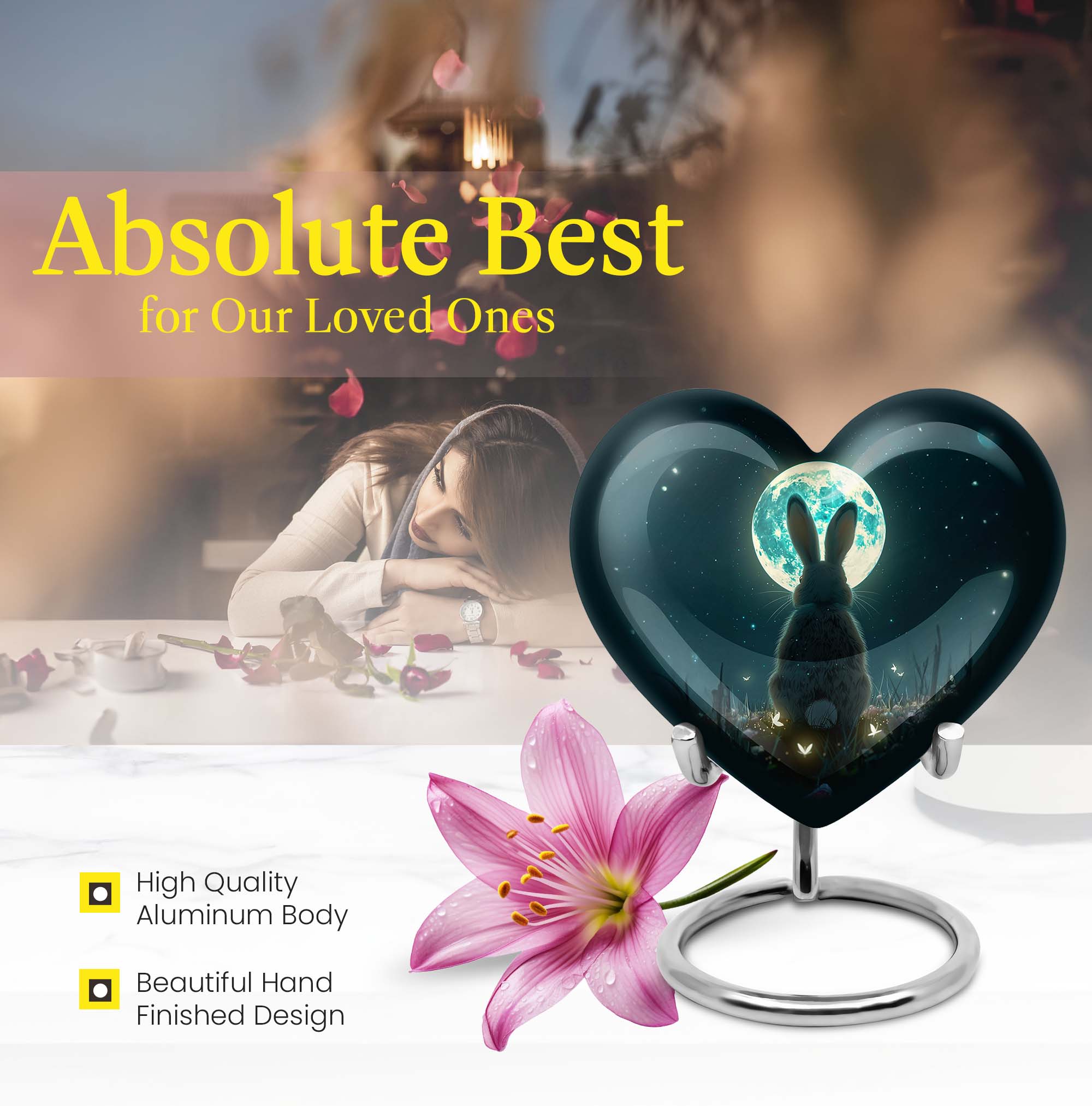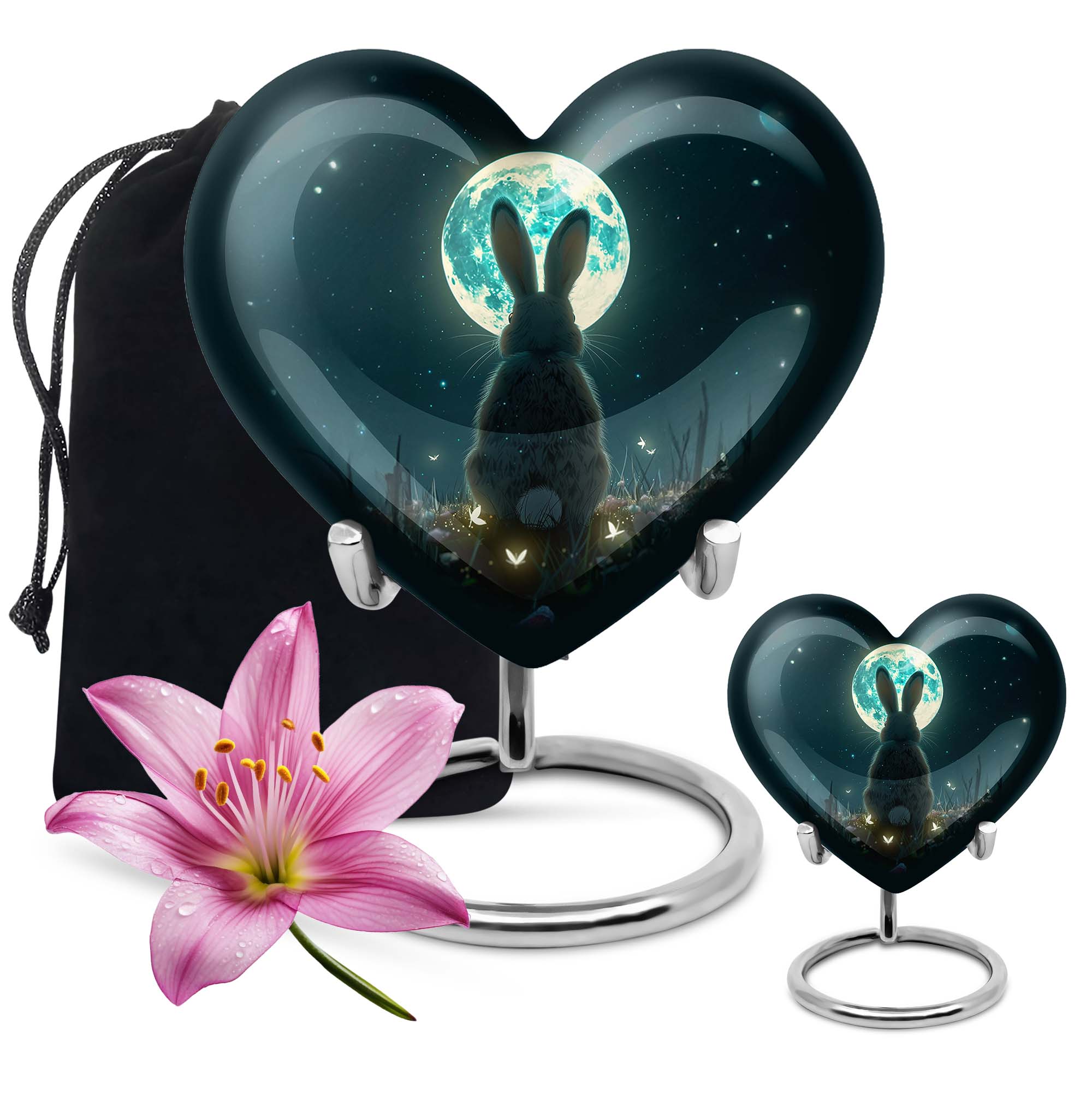 Behold the White bunny moon urn, a supreme example of skilled craftsmanship, designed with an abstract theme to honor loved ones passed. This memorial urn, meticulously carved from high-quality aluminium, stands proud at a height of 10 inches, and weighs in at a sturdy 3.3 pounds. Each detail of this large urn captures a unique essence, making it far more than a simple funeral urn for ashes. Functional yet extravagant, our urn offers an impressive capacity of 200 cubic inches, perfect for storing ashes of an adult male or dad with dignity and respect. The package includes a luxury velvet pouch for containment and secure keeping of the ashes. Moreover, our urn allows personalization with engraved names, adding an extra touch of homage to your beloved. Highly sought for its unique and uncommon design, reminiscent of serene moonlit nights, this is more than just an urn; it's a token of love and cherished memories. When searching for memorial urns, you won't find one quite likes this. It is a symbolic sanctuary, outdoing standard urn ash men with its radiant beauty and elegant construction.