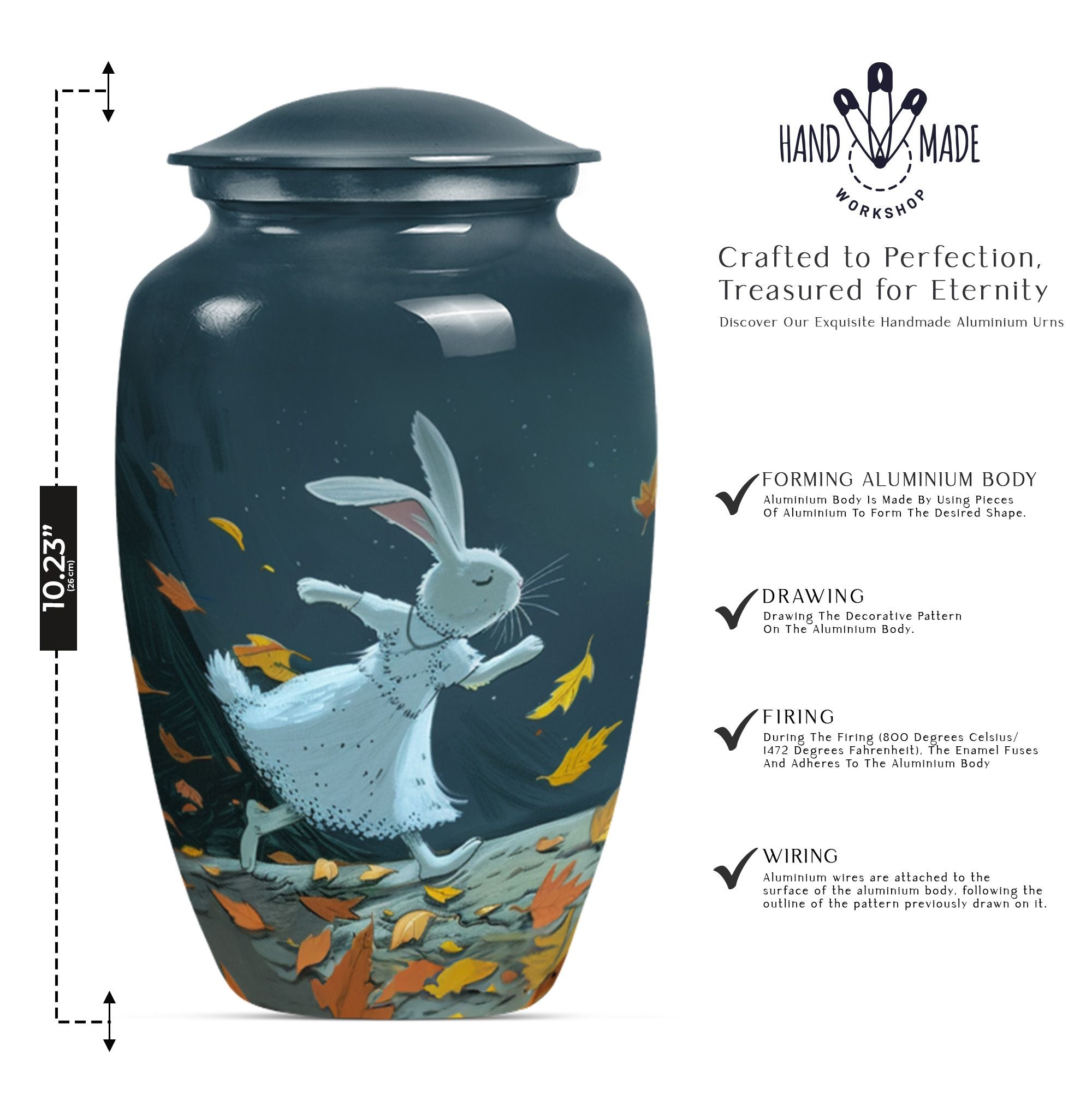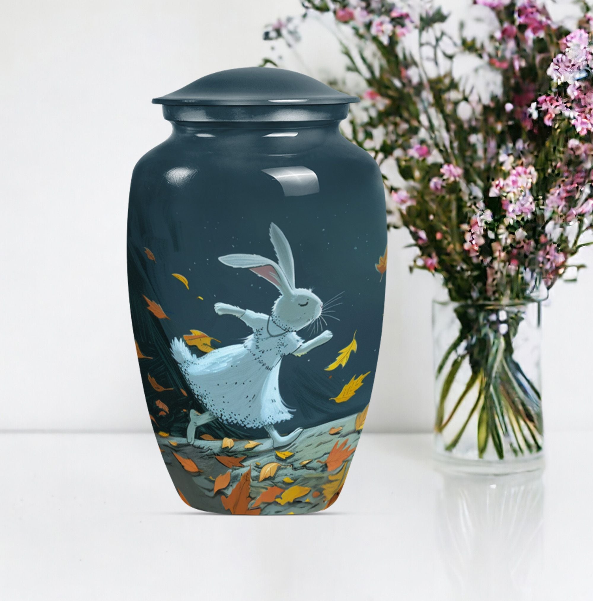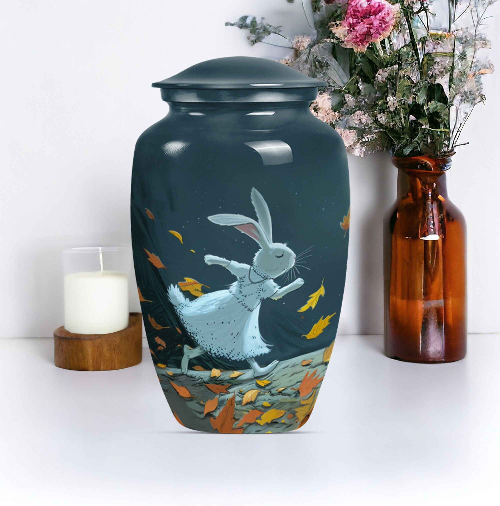 Discover the intimate detail and exceptional craftsmanship of this 'White Bunny Moon Urn'. Handcrafted using high-quality aluminium, this large urn is expertly designed with an abstract theme for a timeless appeal. Measuring 10 inches in height and weighing 3.3 pounds, it creates a classic and eternal resting place for your loved one. This 'cremation urn' can safely accommodate up to 200 cubic inches of ashes, ideal for adult females or humans. The urn offers personalization for an added touch; you can get names engraved on it. It also comes with a velvet pouch to securely contain the ashes. Whether you are searching for 'cremation urns for ashes,' 'burial urns for adult female ashes,' or 'modern urns,' this piece is not just an object but a symbol of respect, love, and remembrance. Find solace and peace in its uniquely minimalist design that brings comfort in its enduring presence.