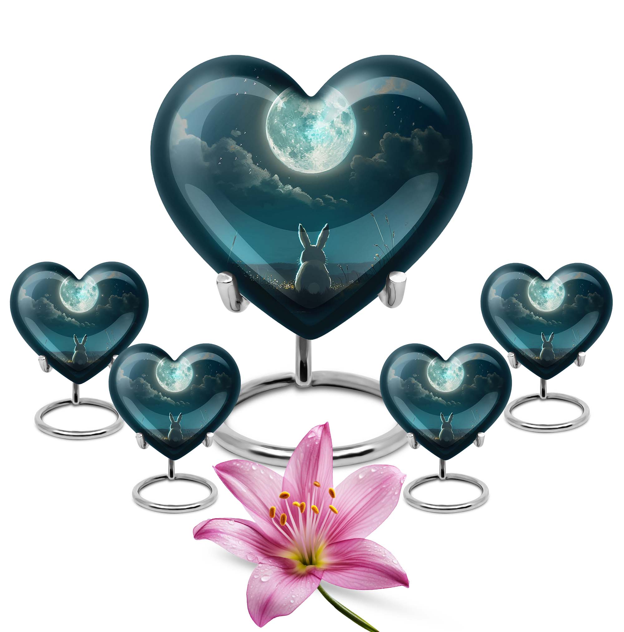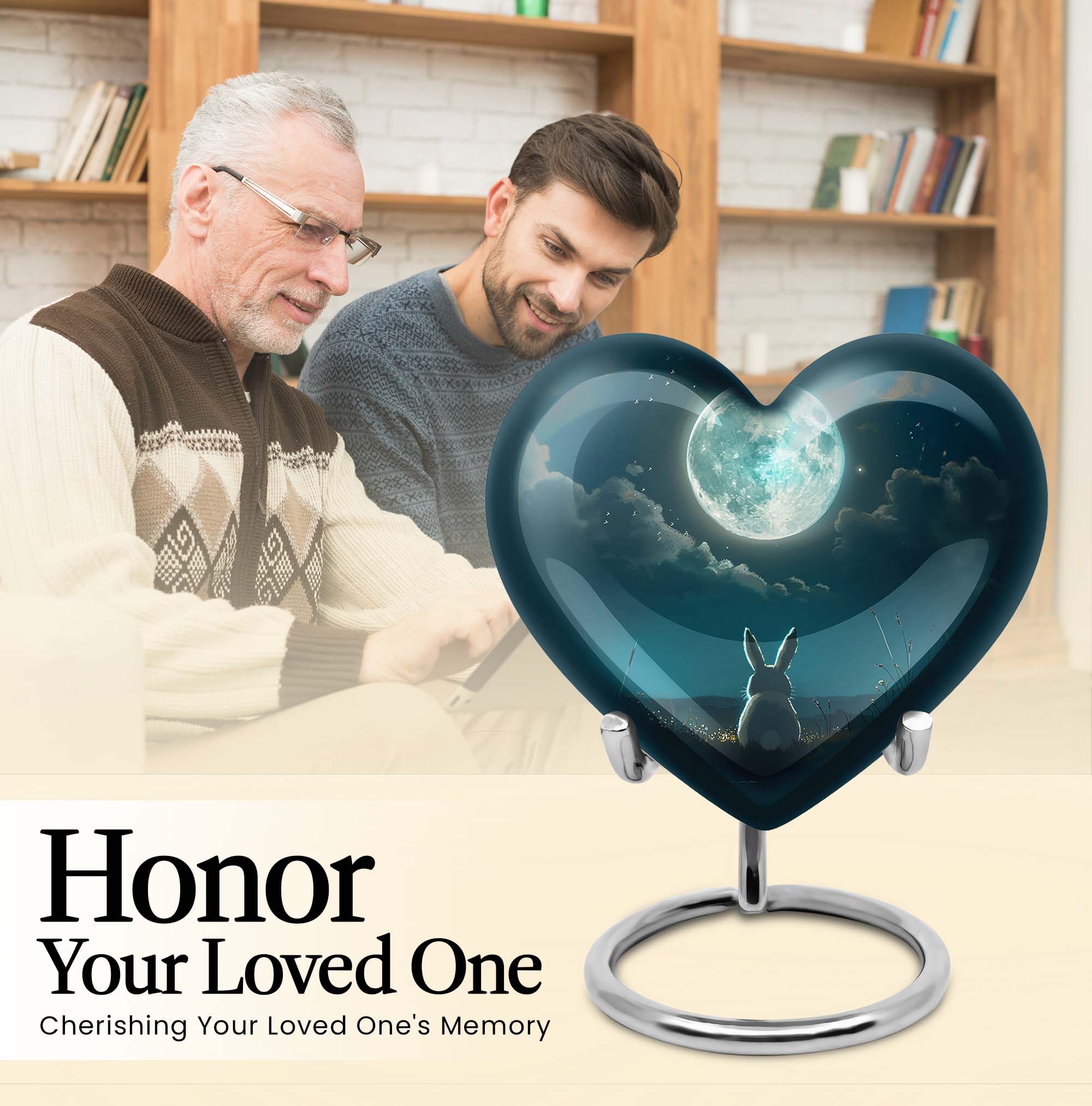 Capture the essence of undying affection with our 10-inch White Bunny Moon Urn, a tender relic for preserving the memory of your loved ones. Crafted with thorough diligence from superior aluminium, this large-sized cremation urn showcases an abstract theme that transcends conventional presentations. The heart urn design intricately weaves sentiment and aesthetic appeal into an artefact of symbolic remembrance. The urn's substantial 200 cubic inches capacity ensures comprehensive containment, while its 3.3-pound weight underscores its robust and sturdy build. Each purchase comes with a soft velvet pouch specifically designed for housing the ashes securely. And to make every urn distinctively personal, we offer customization options that let you engrave names. Ideal for both women and men, this burial large urn honors the cycle of life and death, making it a thoughtful, unisex gift for adults. Noted for its unmatched quality, the White Bunny Moon Urn signifies an enduring tribute to the remarkable journey of life.