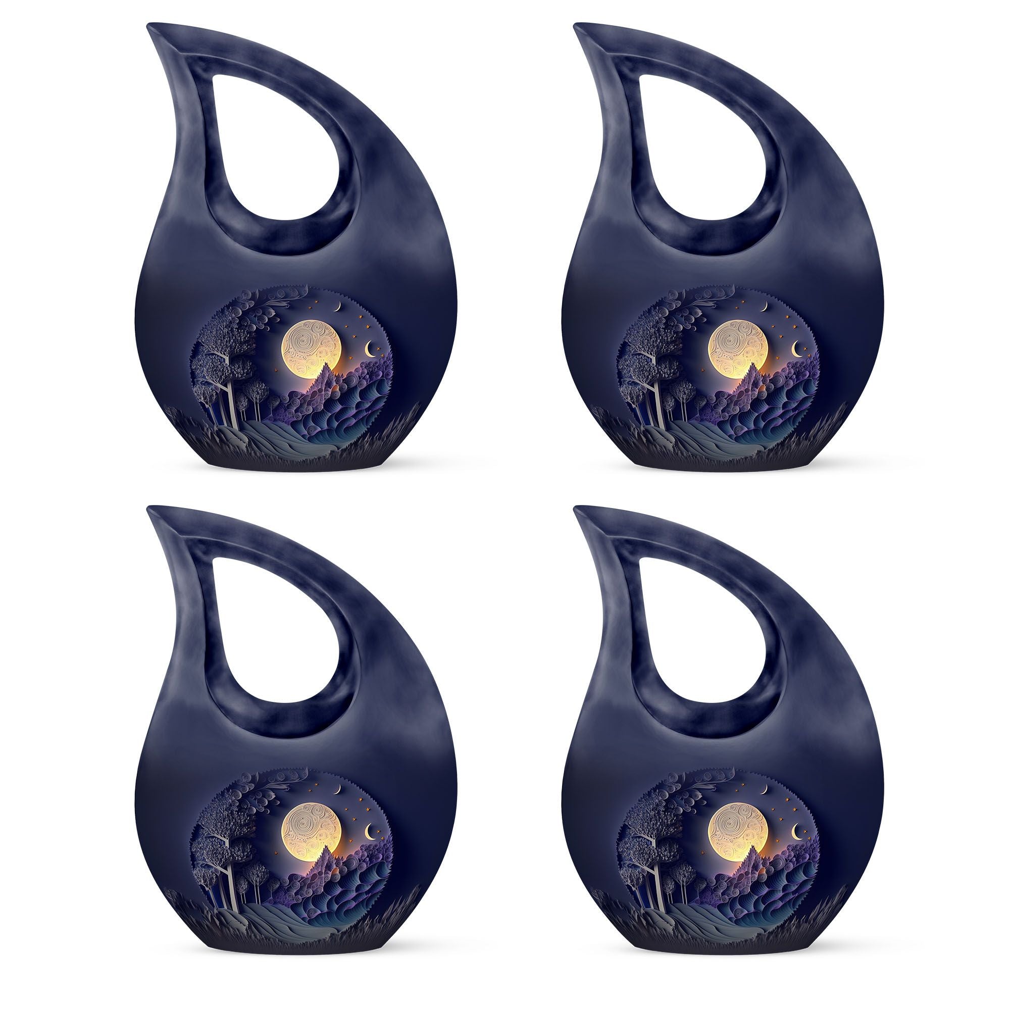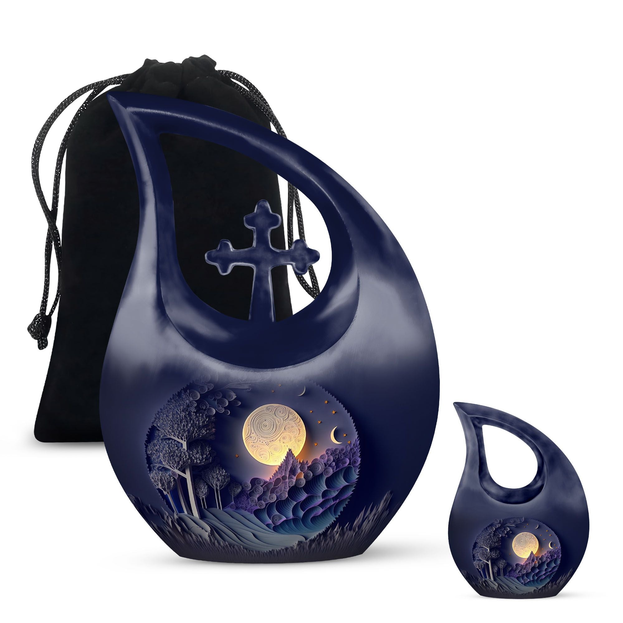 Celebrate a life as infinite as the night sky with our Blue Teardrop Burial Urn, featuring a Stylized Moon & Night Forest Design. This striking piece captures the calm beauty of nature and the mystery of eternity — a fitting symbol for a soul that continues to shine among the stars. Ideal as a burial urn for ashes for women or a burial urn men would find meaningful, it represents tranquility, strength, and remembrance.