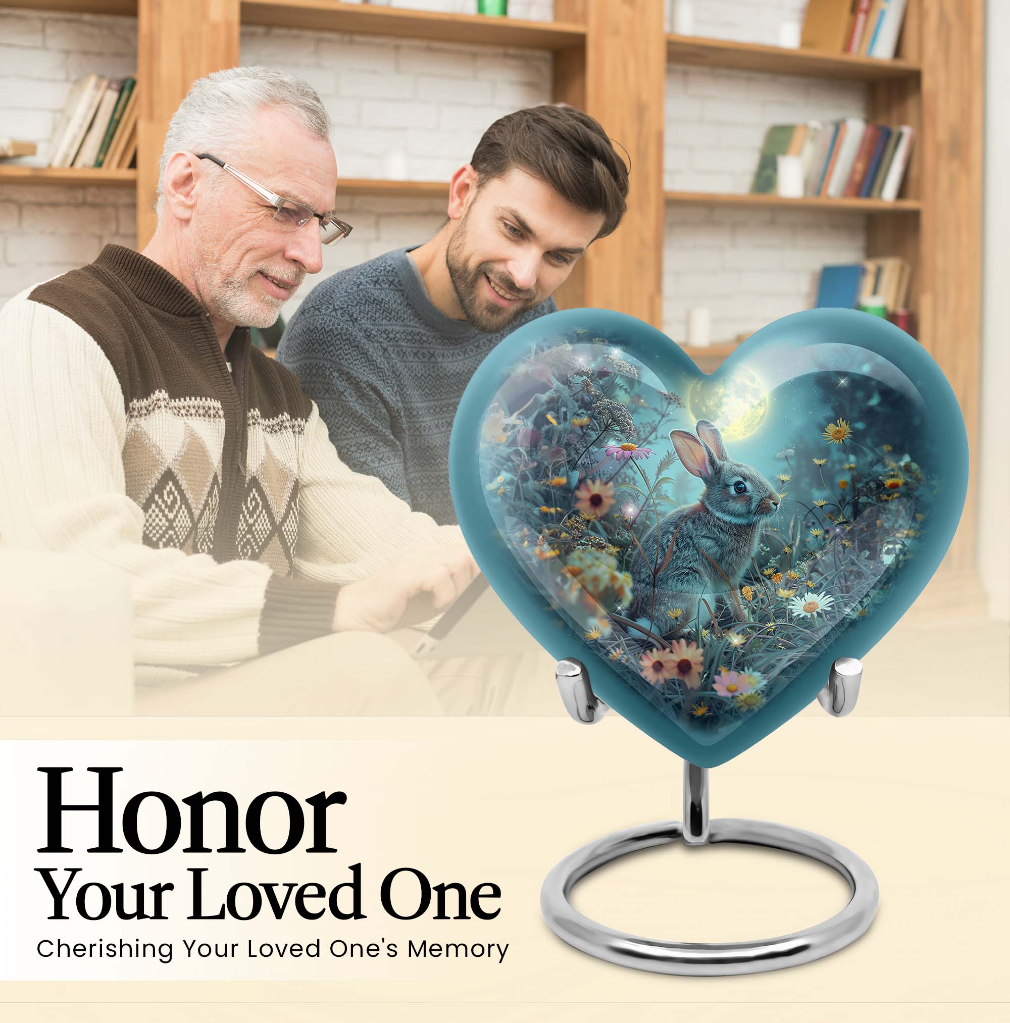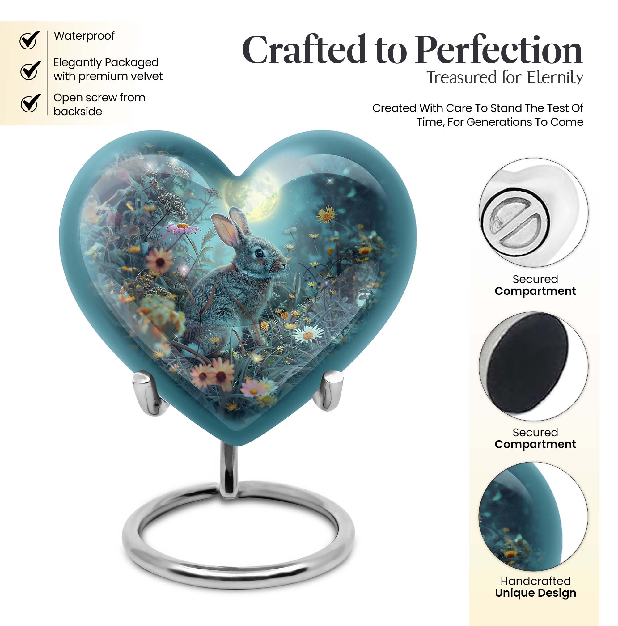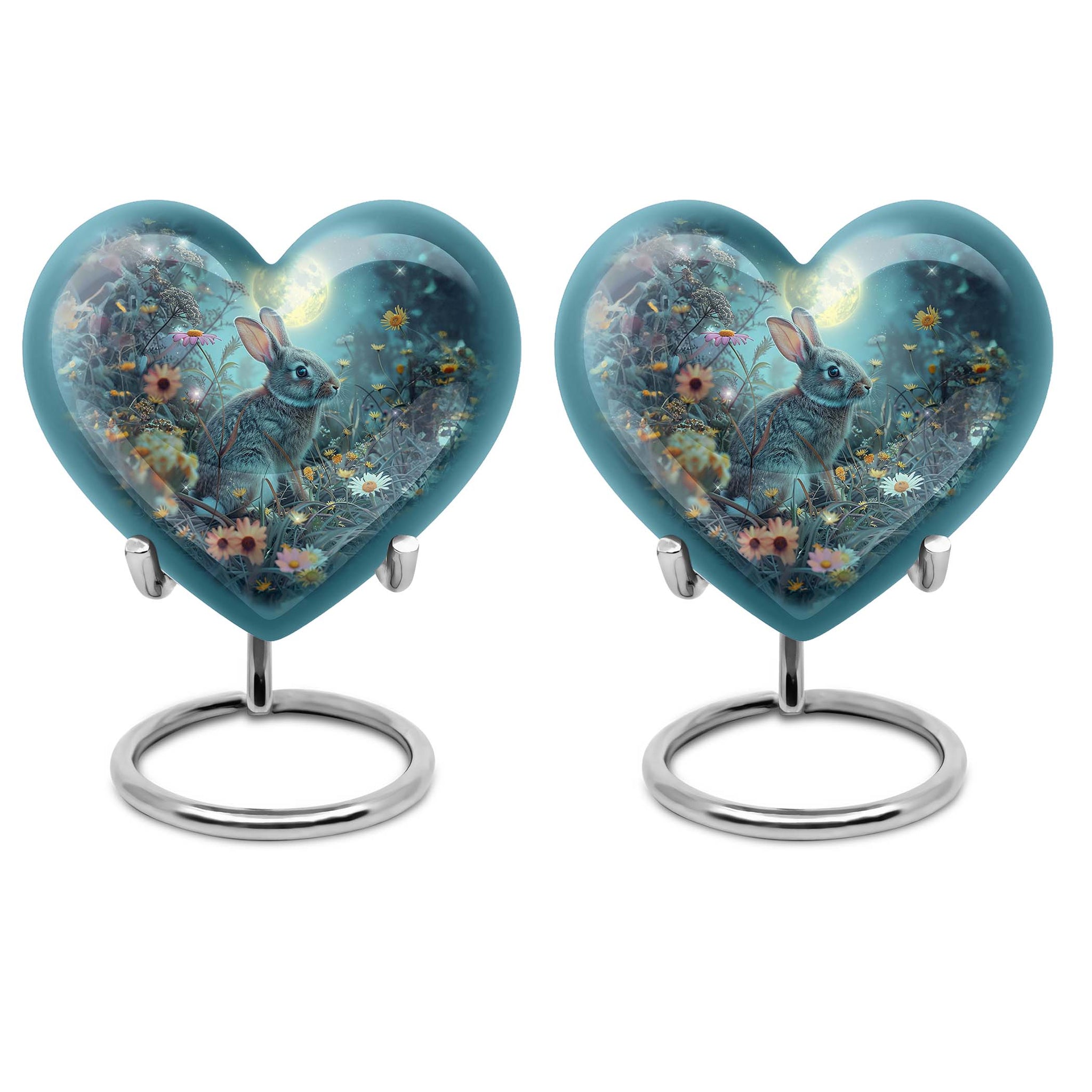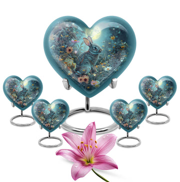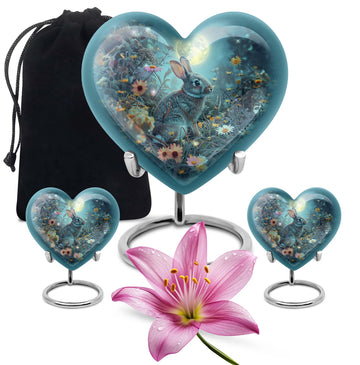 Discover the perfect remembrance piece with this White Bunny Moon Urn, an artistic piece from our large urns collection. Made from quality aluminium, this cremation urn stands 10 inches in height and embodies a touch of abstract art that can blend seamlessly with any interior décor. The heart urn design showcases our commitment to creating unique, memorable, and stylish designs. With a capacity of 200 cubic inches, this urn is suitable for holding sizable quantities of ashes, making it an ideal option for burial in the ground. This package comes with a velvet pouch for the containment of ashes, providing an extra layer of privacy and respect for your loved one. The urn weighs 3.3 pounds, a sturdy and substantial tribute to your dearly departed. For a more personalized touch, this urn allows you to engrave names, allowing you to keep your loved one’s memory alive. When searching for 'cremation urns for women', 'ash adult urns for ashes', or 'metal urns for burial in ground large', consider this white bunny moon urn for a thoughtful and heartfelt choice.