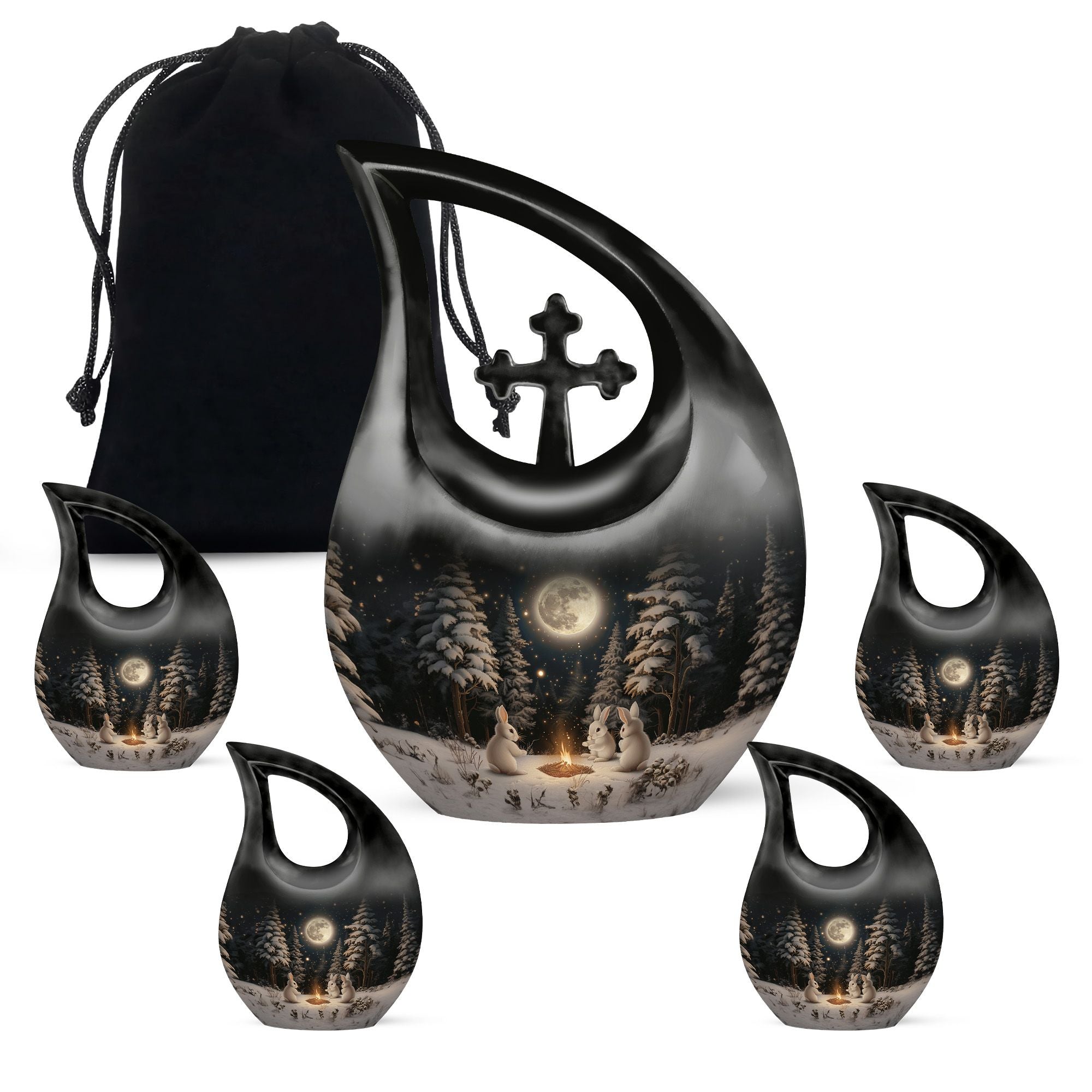 Presenting the White Bunny Moon Urn, a thoughtfully crafted keepsake to celebrate and perpetuate the memories of your loved ones. This 'Large Urn' derived from sturdy 'Aluminium' stands at a height of '10 inches', weighing '3.3 pounds'. It can house '200 cubic inches' of memories, adding a touch of serenity to its surroundings. Our 'Cross Drop' urn design is geared towards those seeking a modern approach to memorial practices. The urn encapsulates comforting warmth and legacy within its style, all while respecting the essence of traditional memorial urns. It comes with a delicate 'velvet pouch' for the containment of ashes, ensuring dignity to your beloved's farewell. In addition to aesthetic attributes, we offer the opportunity to 'Personalize with engraved names' on the urn, making it an even more special memorial. With our White Bunny Moon Urn, we promise a timeless tribute. Popular among searches such as 'Urn For Mom', 'Remembrance Urns For Ashes', 'Modern Urns For Ashes', and 'Burial Urns For Human Ashes', this unique piece blends grace and sentiment effortlessly.