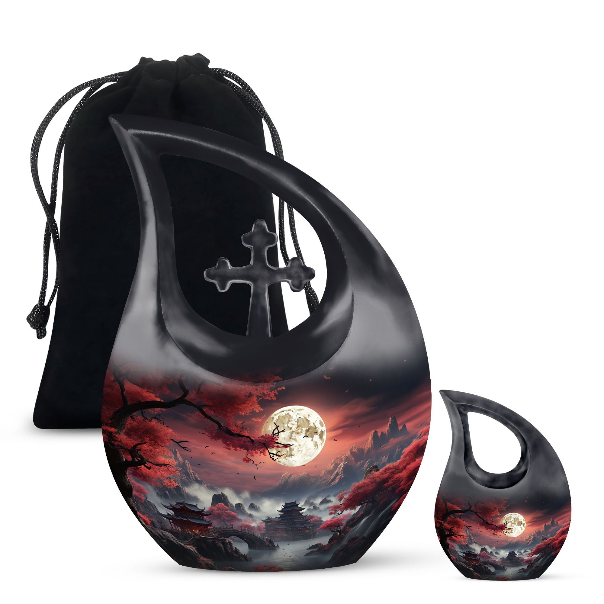 Every detail of this funeral adult urn captures the essence of artistic craftsmanship. Expertly made from high-quality aluminum, it features a hand-painted Japanese landscape illuminated by soft moonlight—an image of eternal tranquility. The smooth contours and lustrous finish make it a standout among funeral urn ashes options, while the sturdy structure ensures lasting protection. Whether displayed at home or in a memorial space, this funeral urn harmonizes art and remembrance in perfect balance.