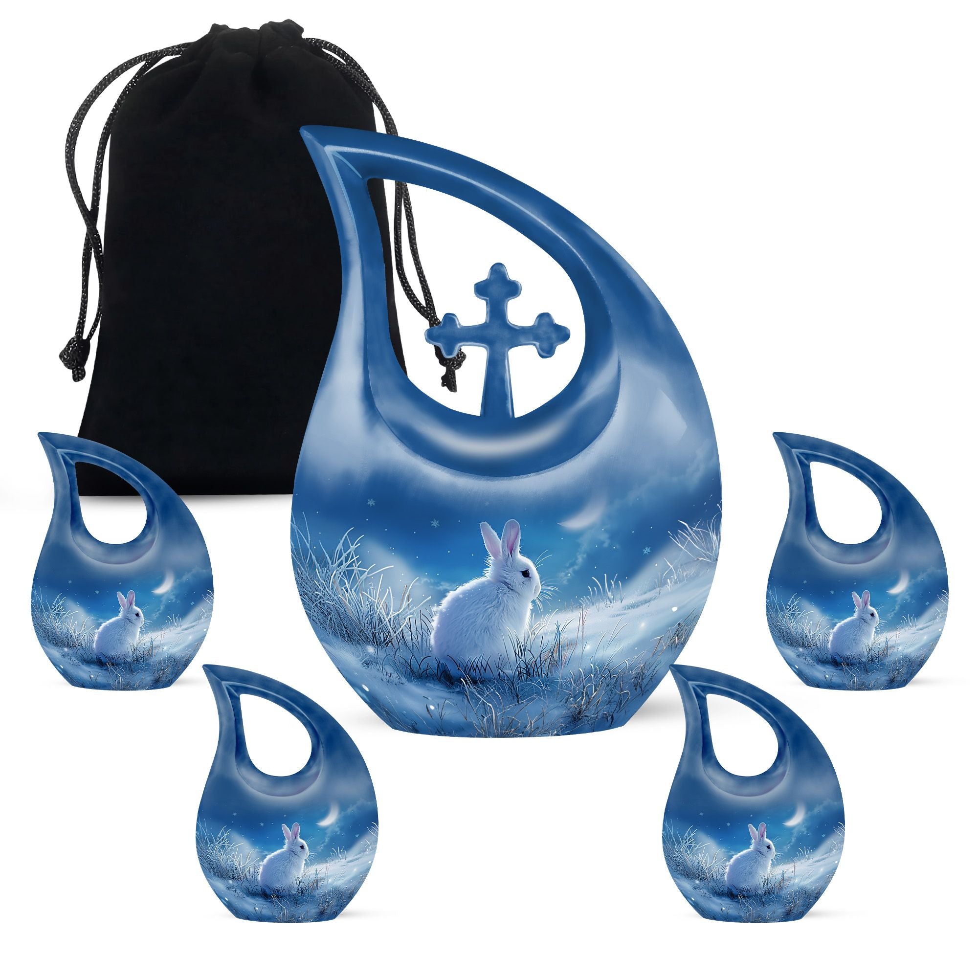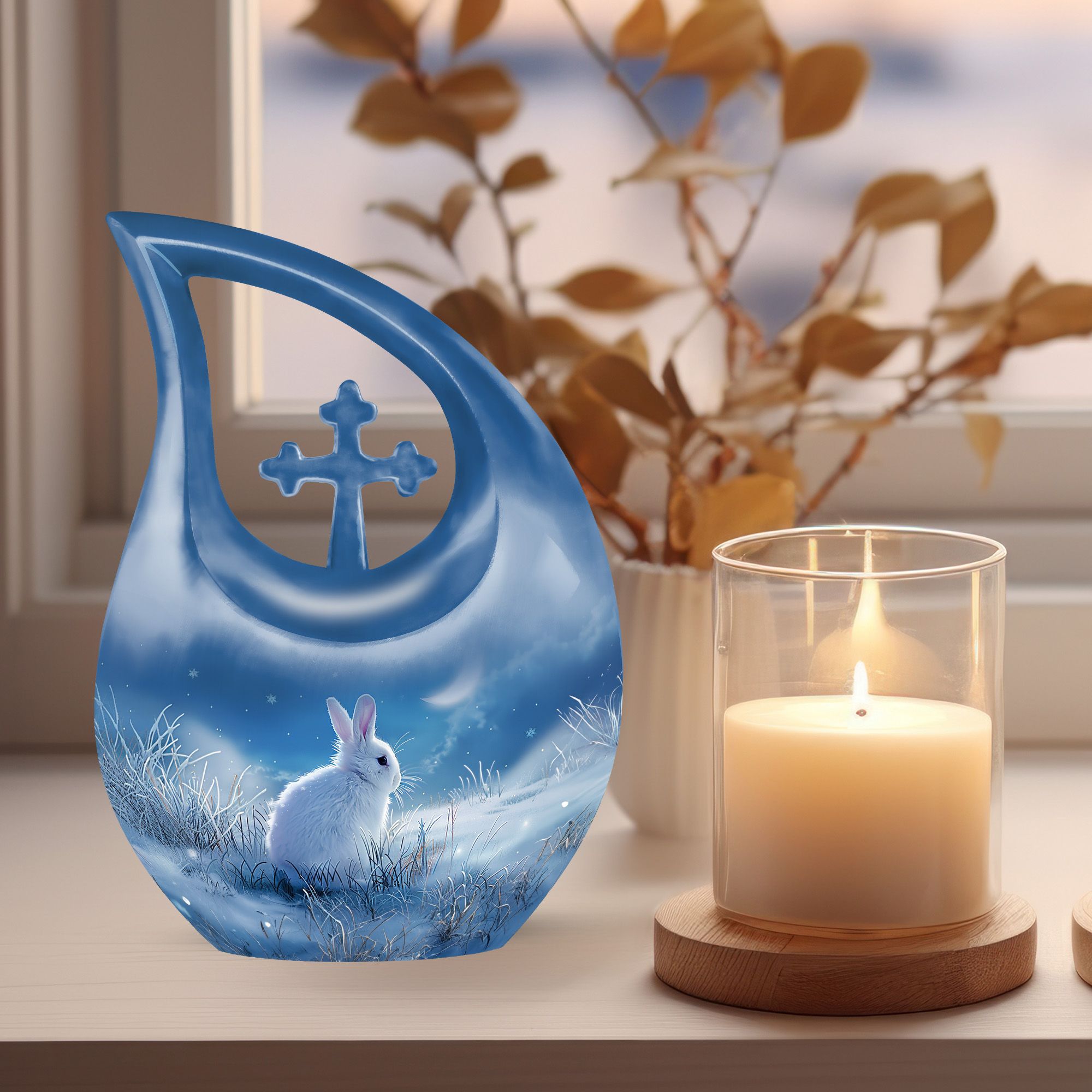 The White Bunny Moon Urn, a noteworthy piece from our collection of memorial urns, beautifully captivates the essence of remembrance. Sized at a generous 10 inches, each urn is fashioned from durable aluminium, promising long-lasting guardianship over cherished relics. A weight of 3.3 pounds ensures steadiness and resilience, and it possesses a substantial capacity of 200 cubic inches. The Cross Drop design imbues the urn with a grace that enhances its spiritual significance, yet it also leaves room for personalization, allowing engraved names to be etched upon request. Accompanying each urn is a velvet pouch, ensuring secure containment of ashes, and further reinforcing the importance of reverence and preservation. From the unique urns for dad to companion urns for adults, our offerings serve to symbolize a multitude of relationships, cherishing memories, and honoring lives lived. Large urns for ashes provide the physical space while the White Bunny Moon theme extends the spiritual expanse of your memory. Skip the crowds, shop urns online in the comfort of your home.