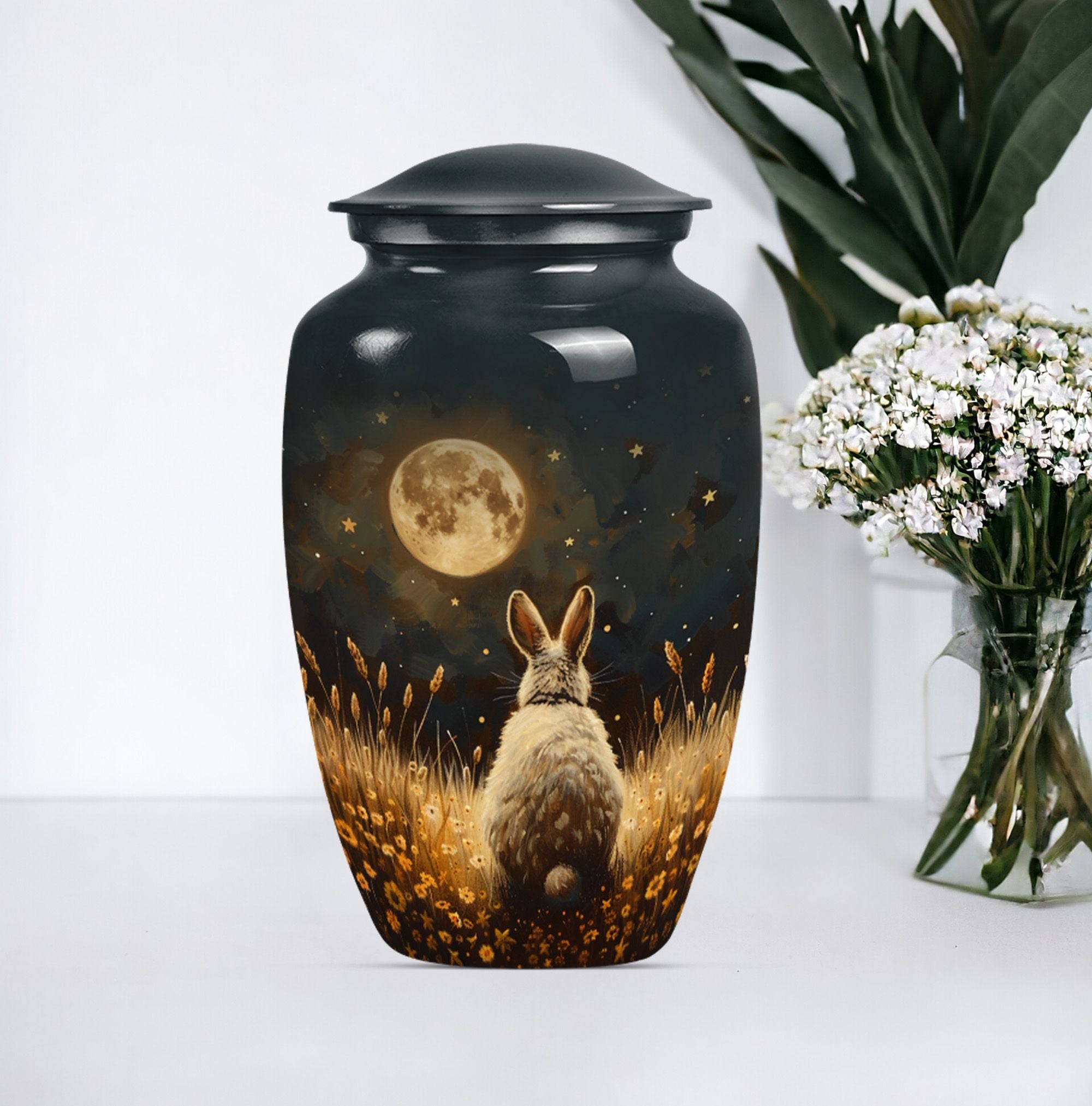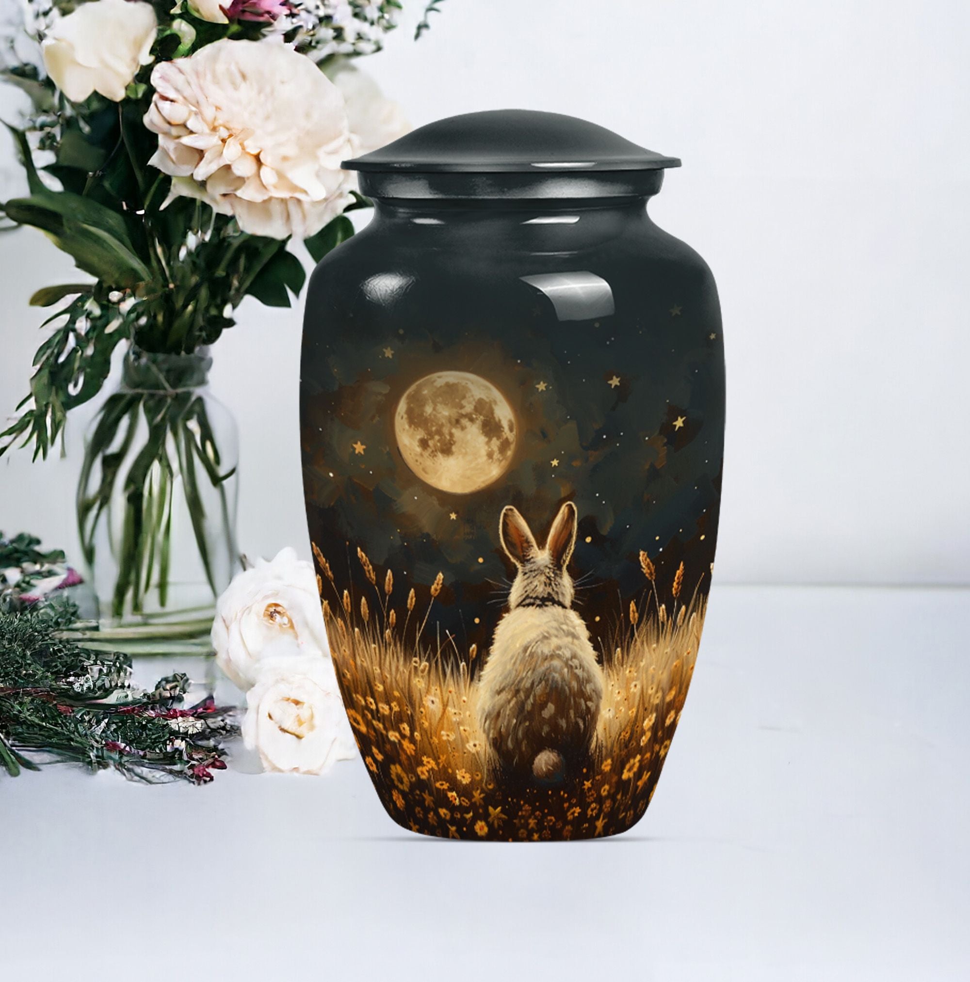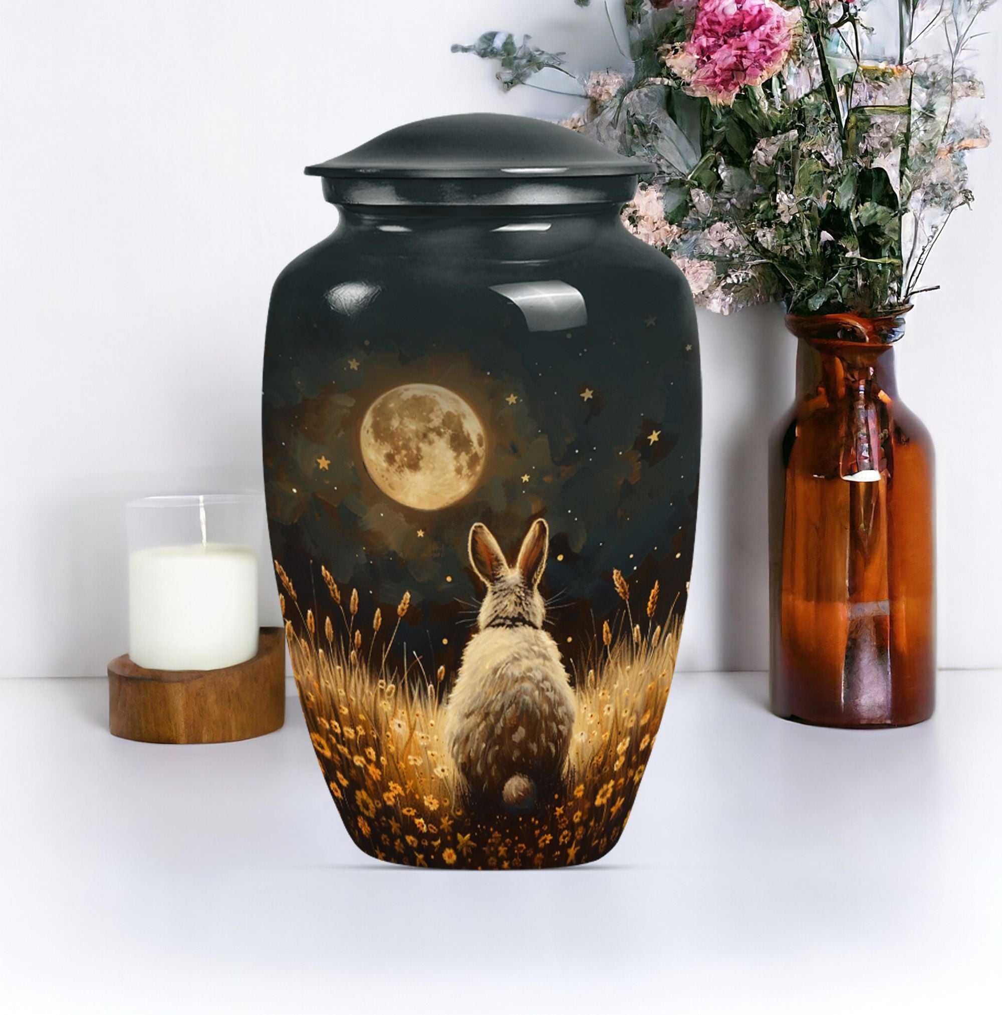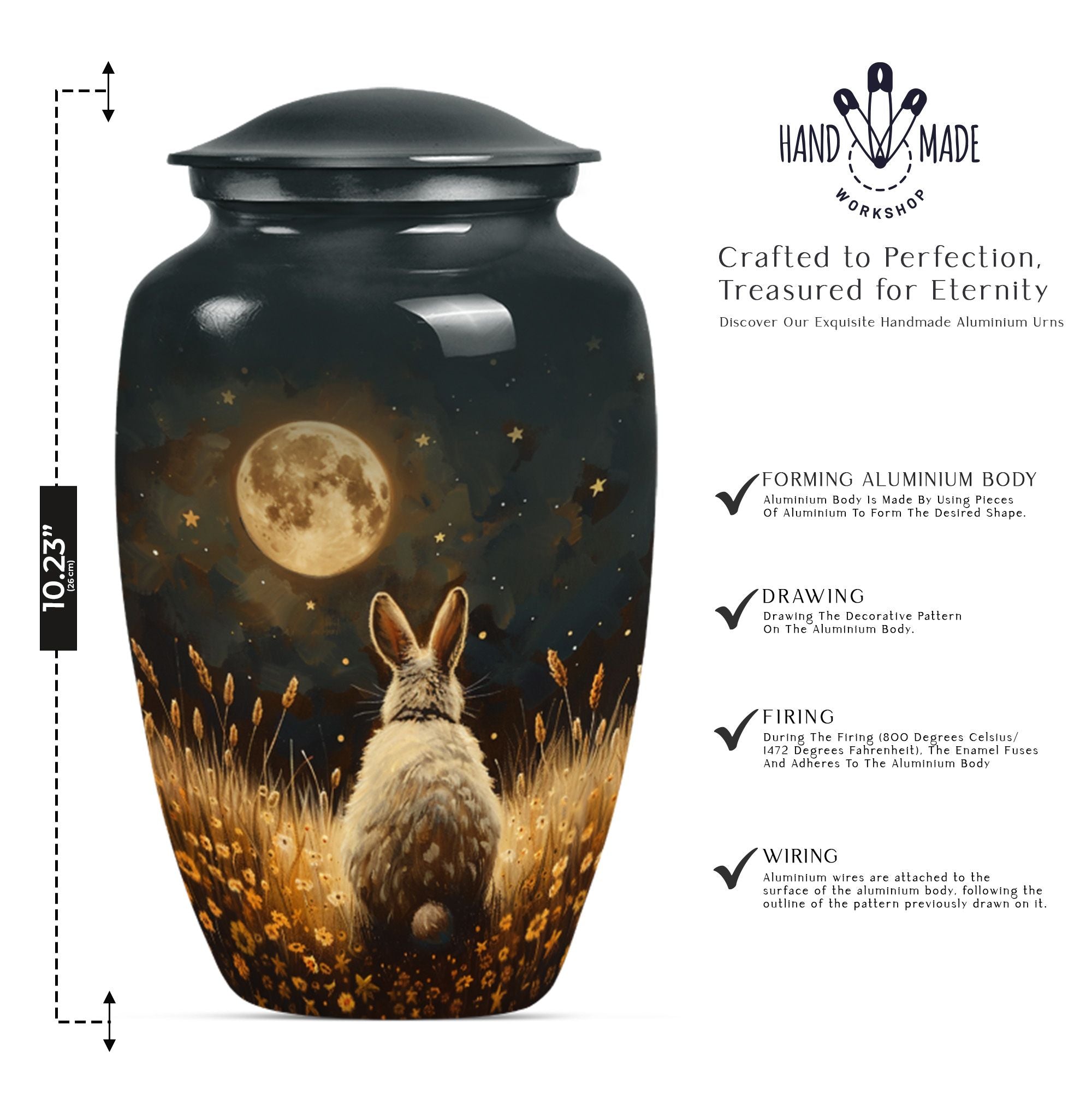 Immerse in the divine essence of your loved one's memories with our exquisite 'white bunny moon urn.' Crafted from premium-quality aluminium, this Classic Urn offers an abstract theme that distinguishes it from common memorial ash urns. With a height of 10 inches and weighing 3.3 pounds, this large urn offers a capacity of 200 cubic inches - ample room to keep the sacred ashes safely. This memorial urns' usability is enhanced by a thoughtfully included velvet pouch for containment of ashes, further ensuring serene intimacy. When it comes to personalization, engrave names or memorable quotes of your choice onto the surface, making these funeral urns a heartfelt remembrance for men and adults. Whether you are searching for 'funeral urns for men's ashes' or 'elegant urns,' our urn stands out as an emotion-imbued keepsake for your precious ones.