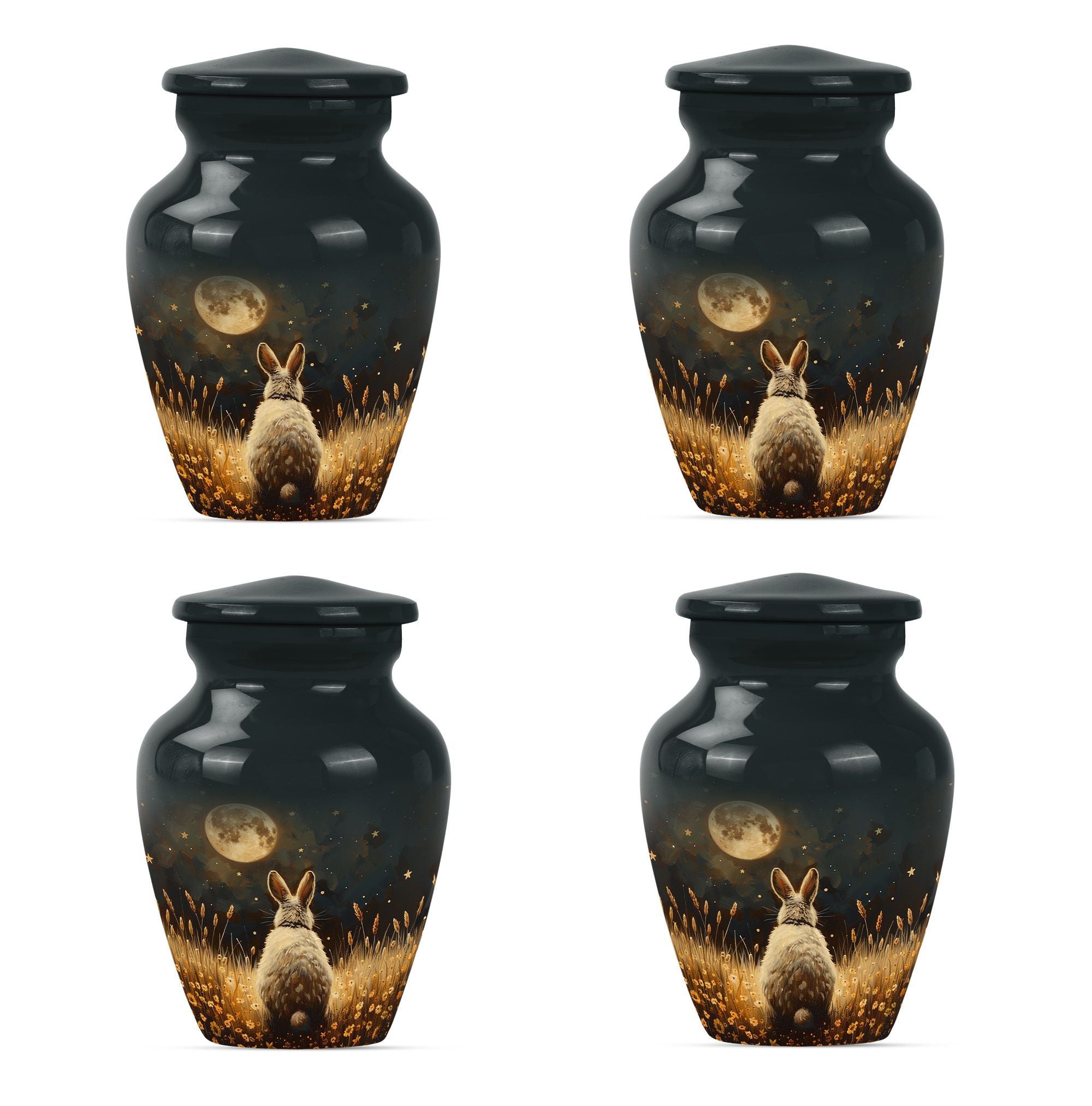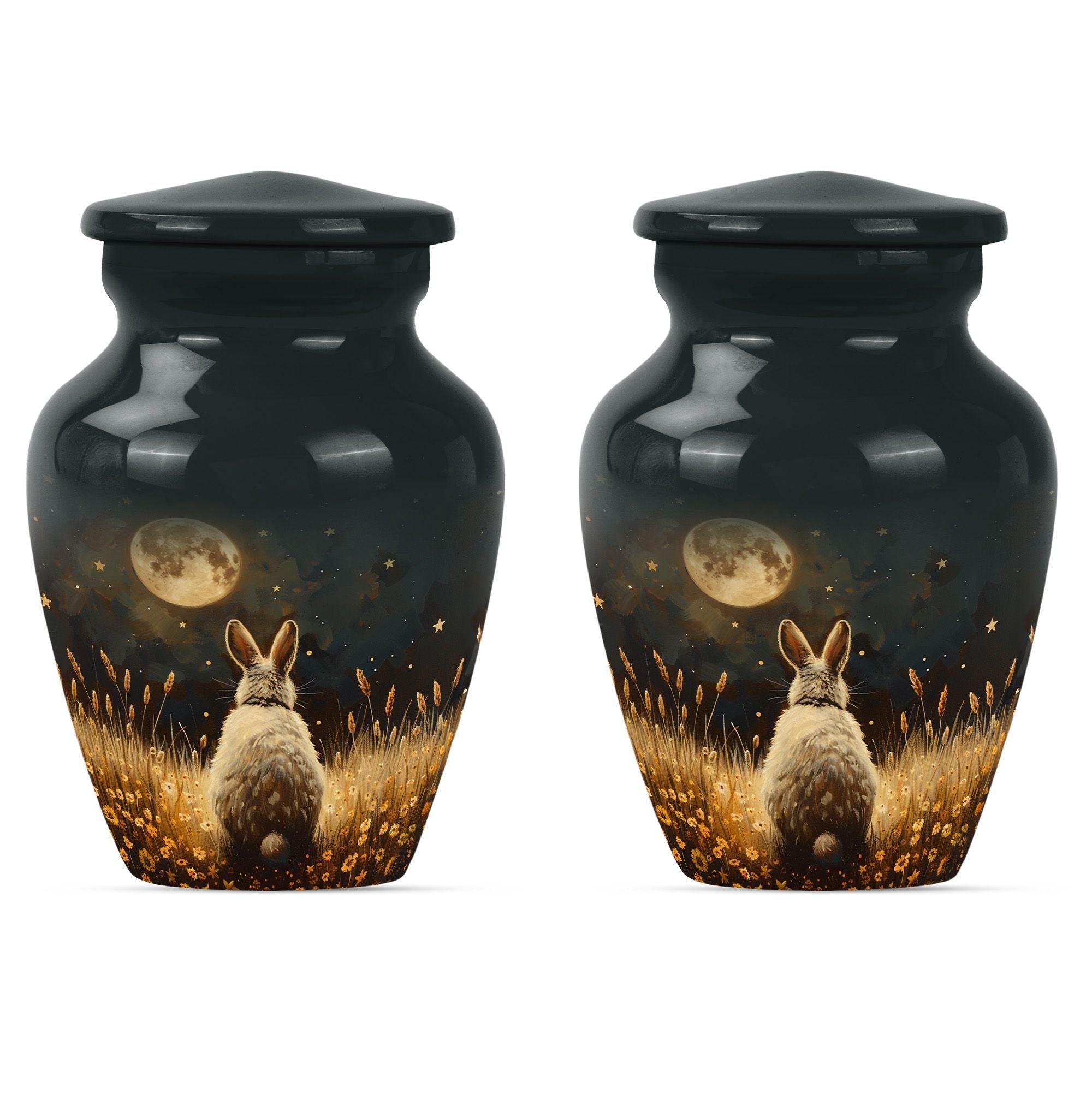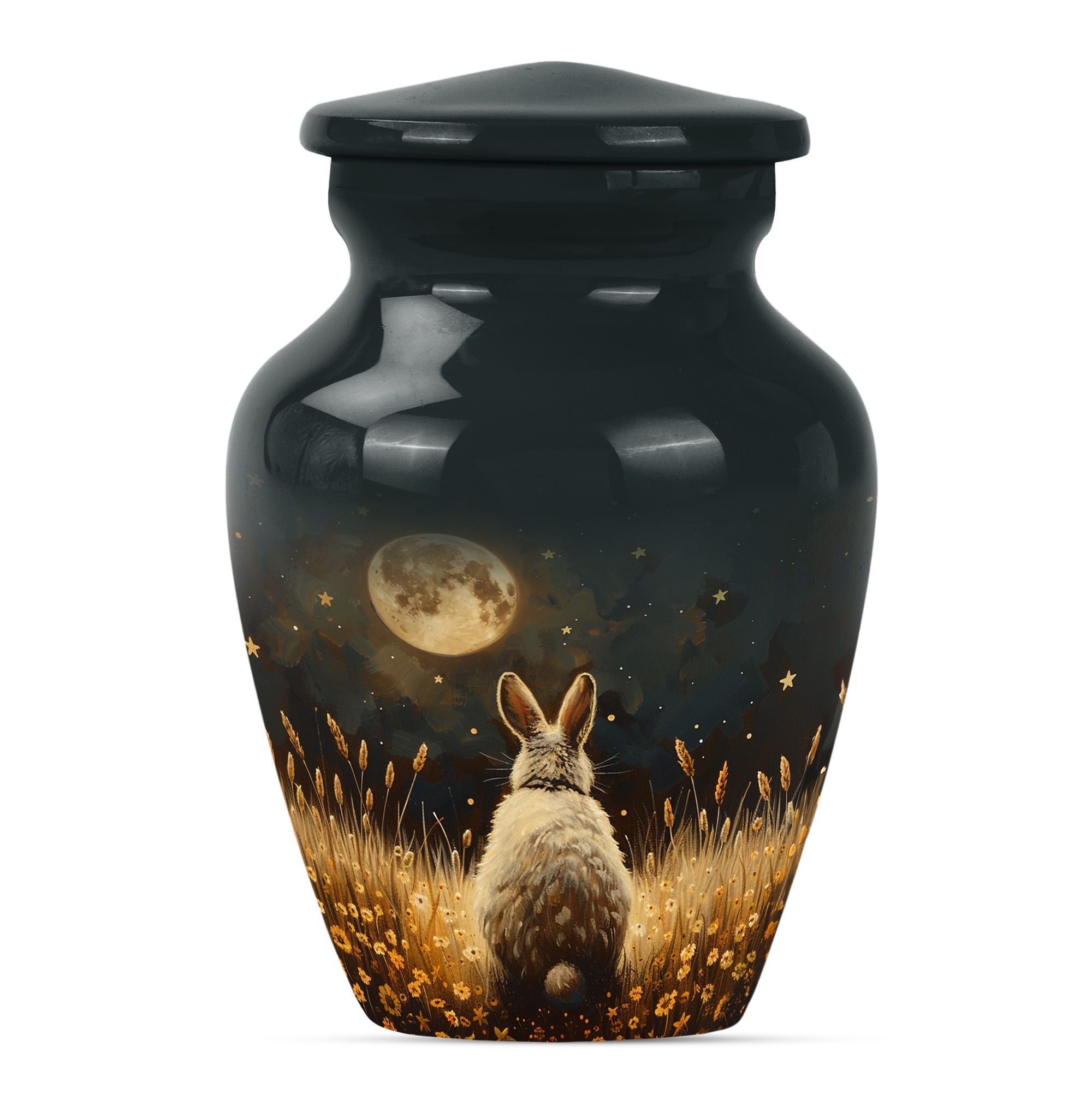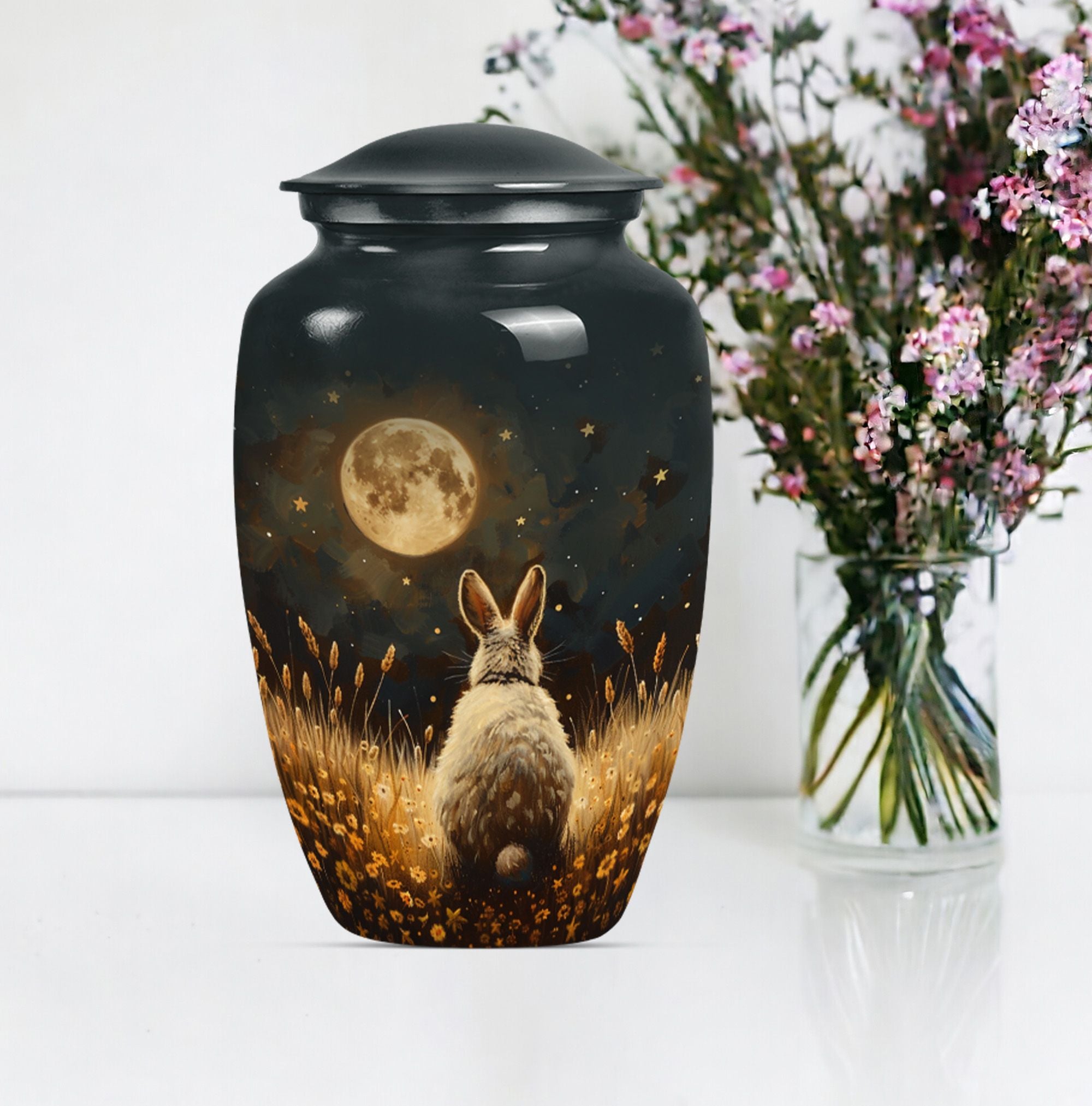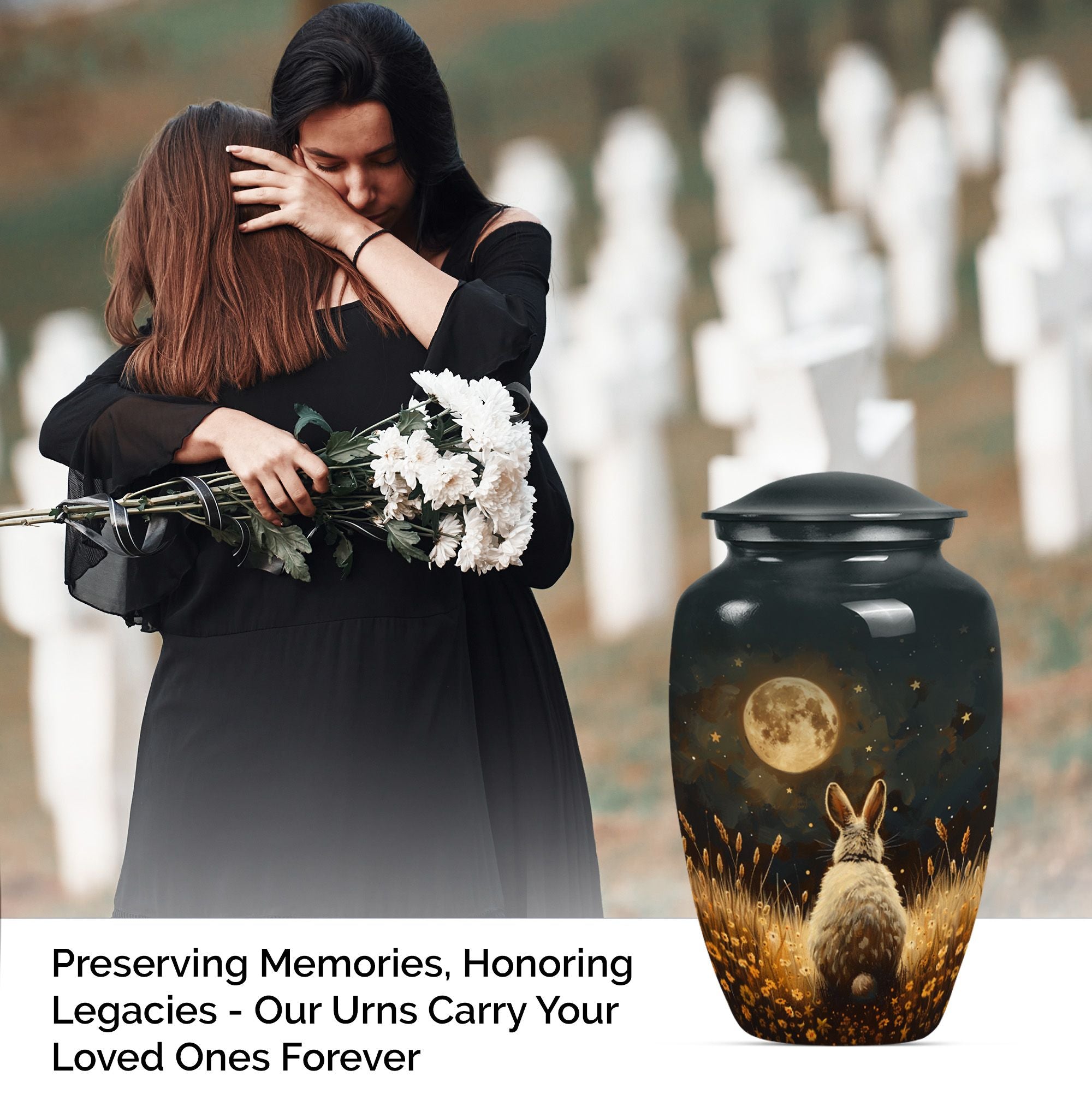 Immerse in the divine essence of your loved one's memories with our exquisite 'white bunny moon urn.' Crafted from premium-quality aluminium, this Classic Urn offers an abstract theme that distinguishes it from common memorial ash urns. With a height of 10 inches and weighing 3.3 pounds, this large urn offers a capacity of 200 cubic inches - ample room to keep the sacred ashes safely. This memorial urns' usability is enhanced by a thoughtfully included velvet pouch for containment of ashes, further ensuring serene intimacy. When it comes to personalization, engrave names or memorable quotes of your choice onto the surface, making these funeral urns a heartfelt remembrance for men and adults. Whether you are searching for 'funeral urns for men's ashes' or 'elegant urns,' our urn stands out as an emotion-imbued keepsake for your precious ones.