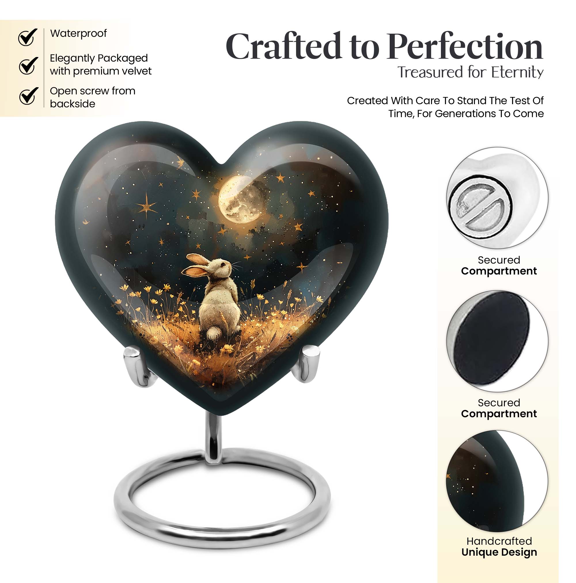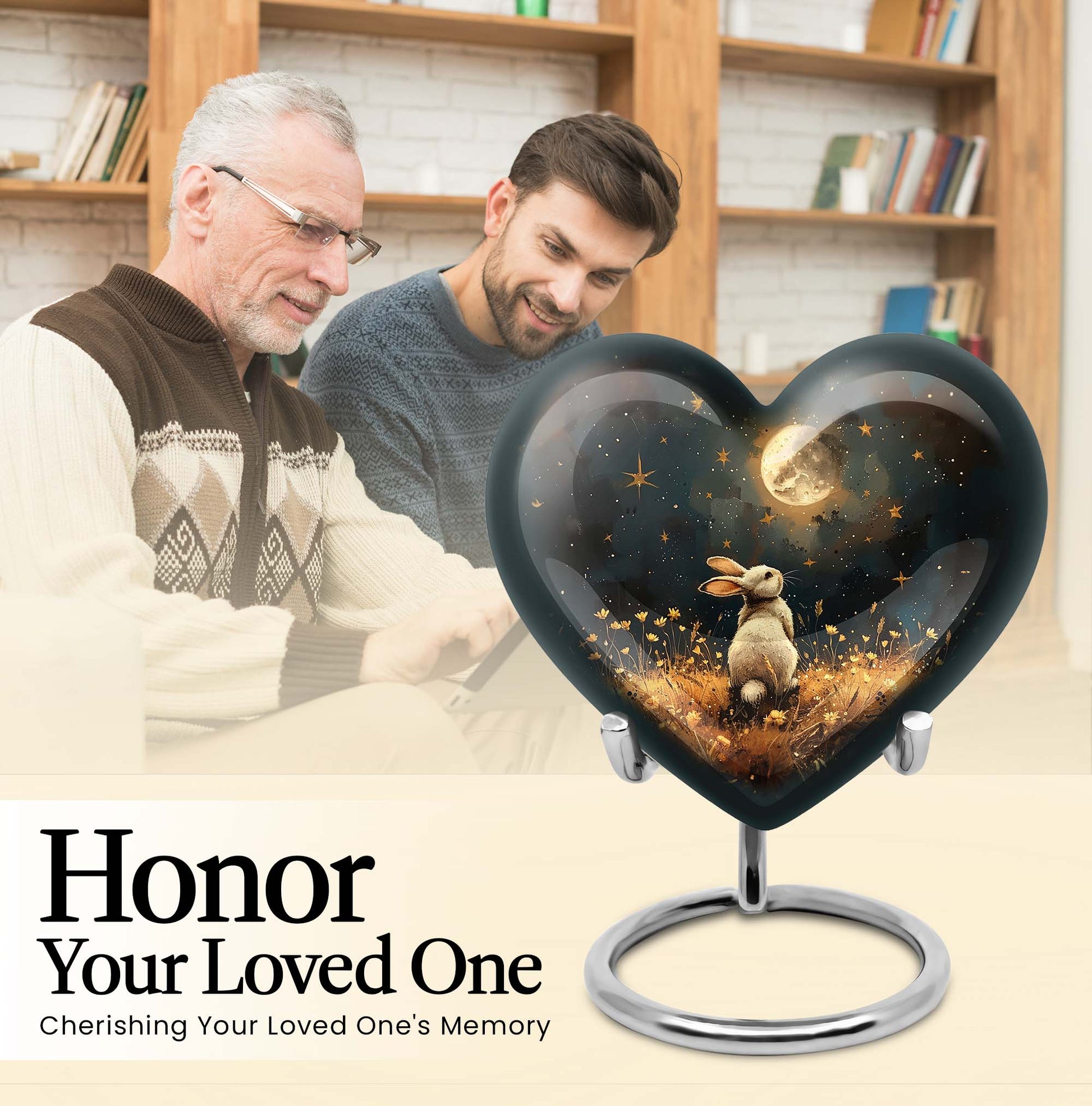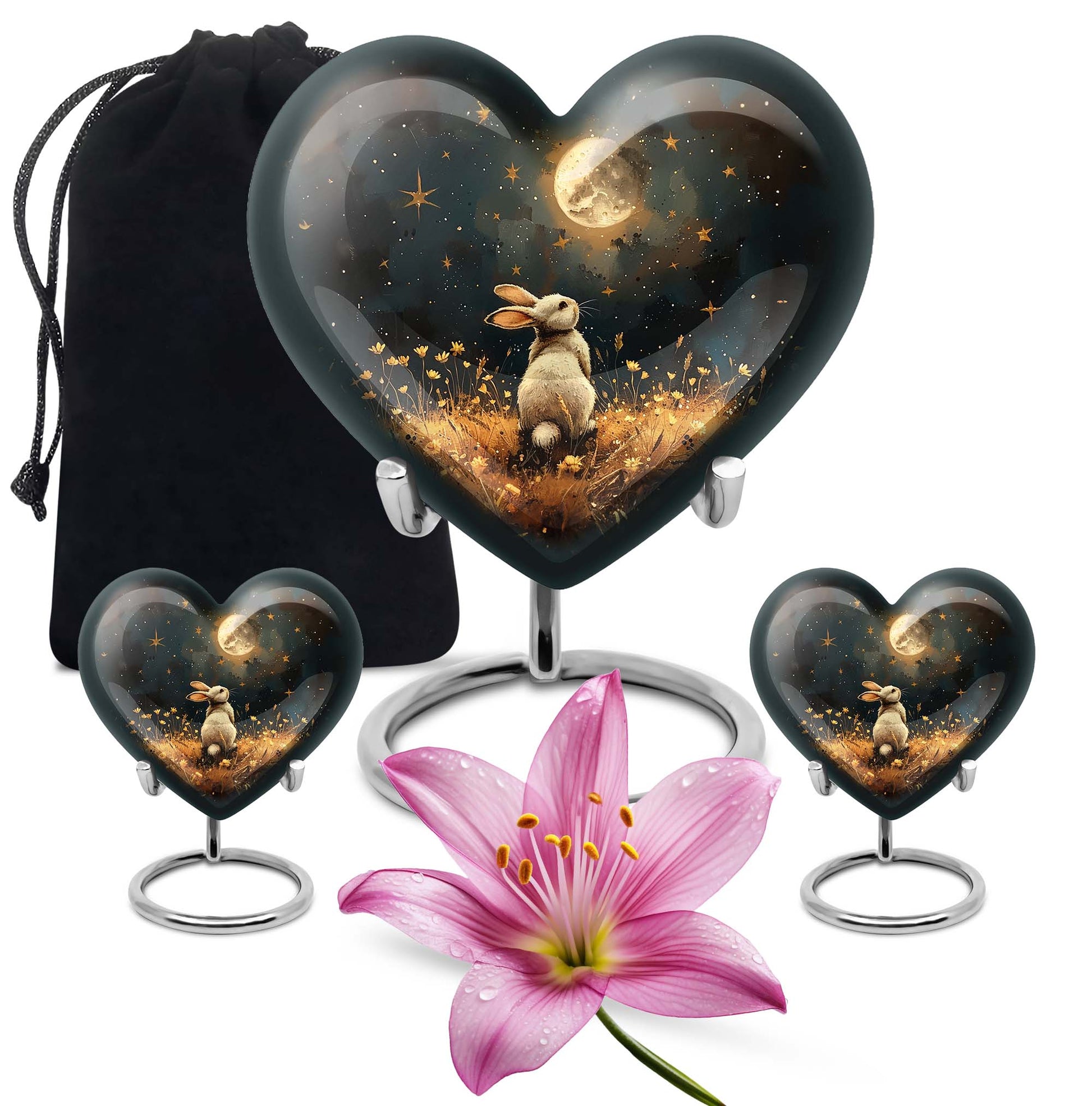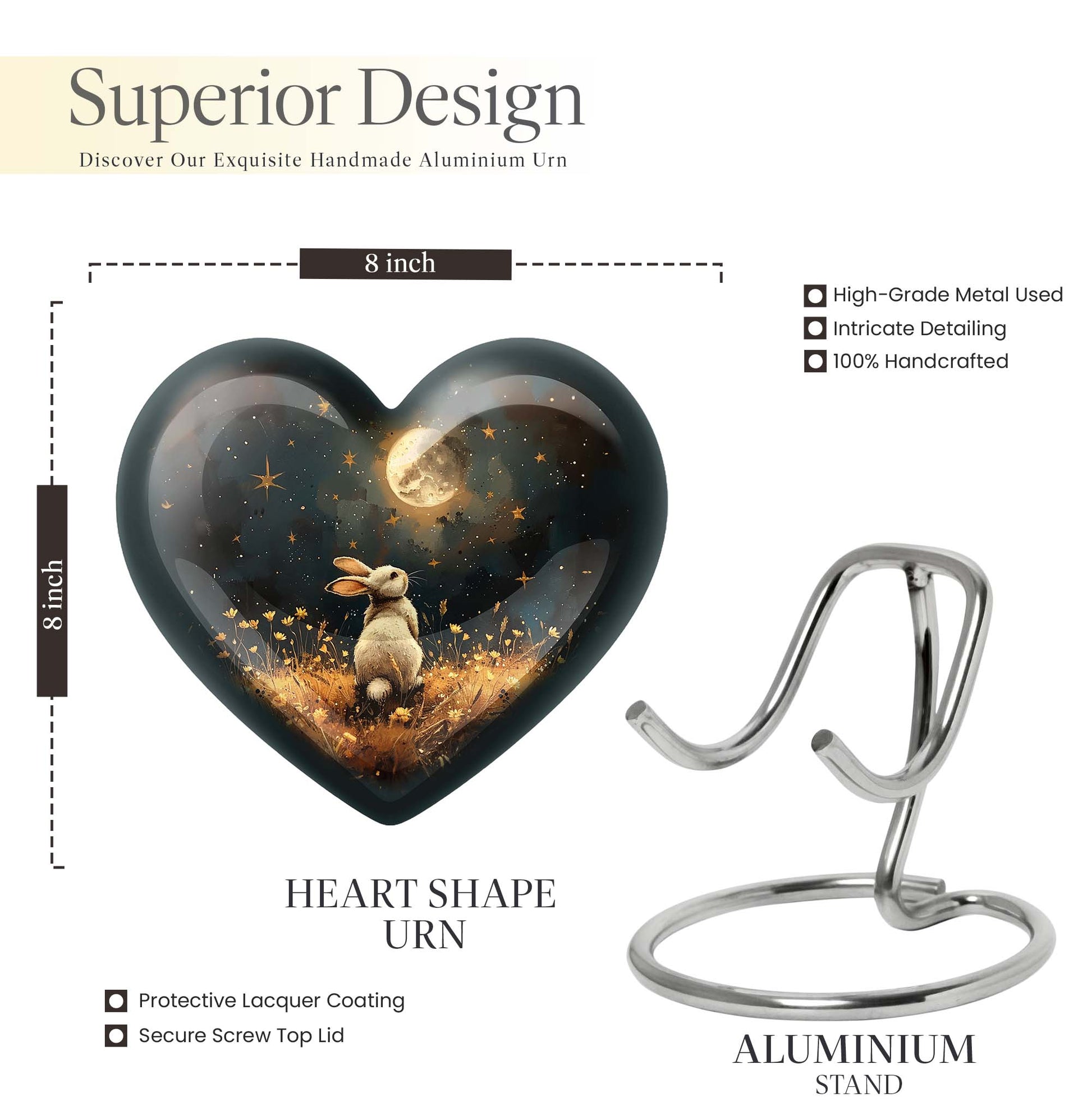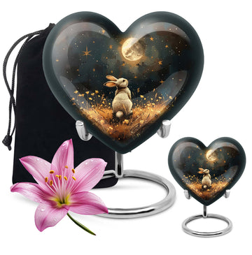 Discover a revered remembrance for your dearly departed one with the White Bunny Moon Urn. This large, 10-inch masterpiece pays homage to the celestial beauty, in an abstract theme, entirely crafted from sturdy aluminium. With a weight of just 3.3 pounds, the urn is both durable and has a thoughtful capacity of 200 cubic inches, permitting you to respectfully preserve the ashes of an adult. Harmoniously blend this memorial urn into your home decor, its unique heart design echoing a timeless connection. The urn additionally comes with a velvet pouch, providing a dignified containment for the treasured remains. Personalize this burial funeral cremation urn with an engraved name, enhancing its sentimental value. Its magnificent appeal positions it as an exquisite choice for man metal cremation or as an urn for human ashes for an adult woman. Cherish the beauty of memory with this distinctive urn.