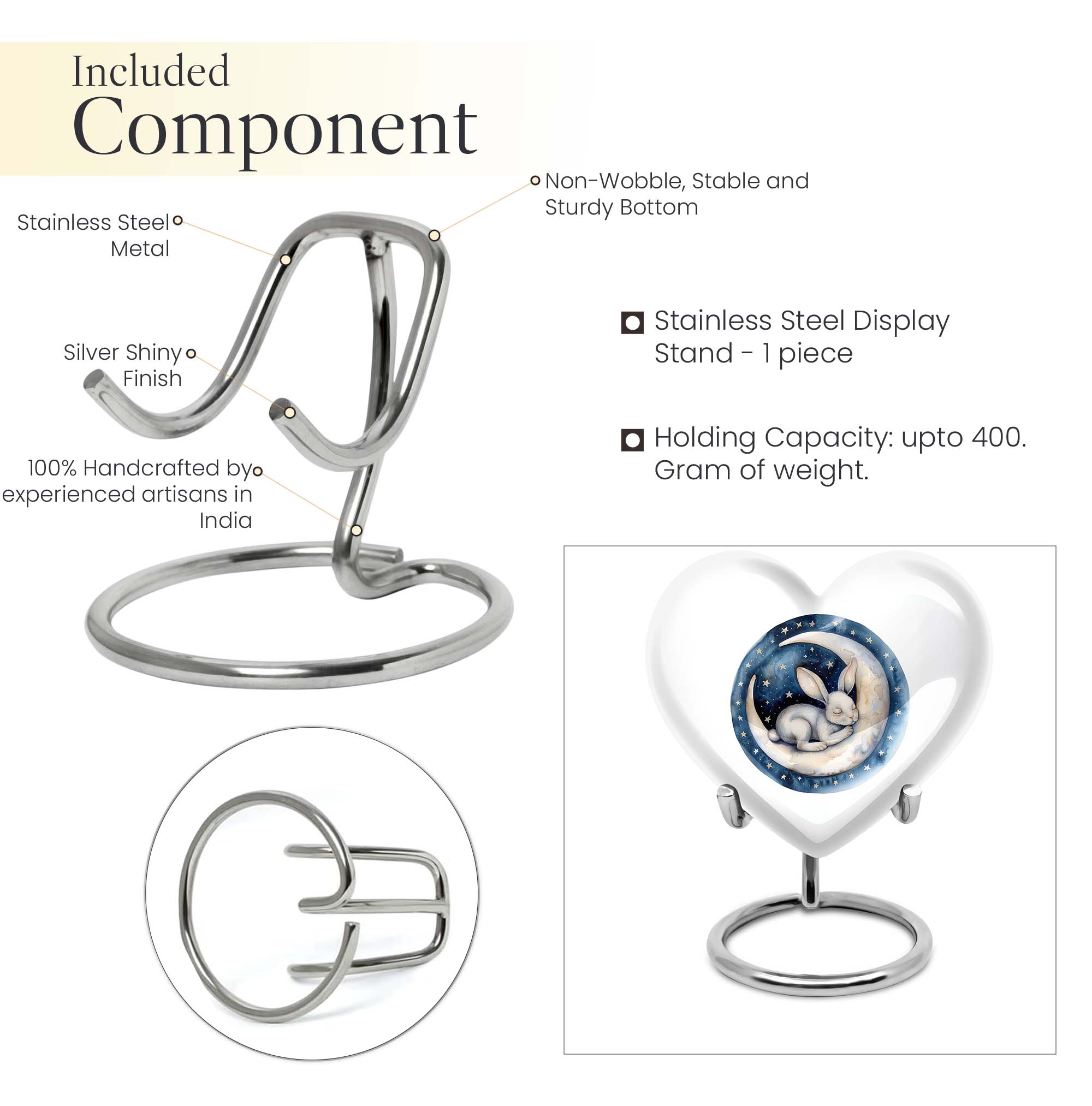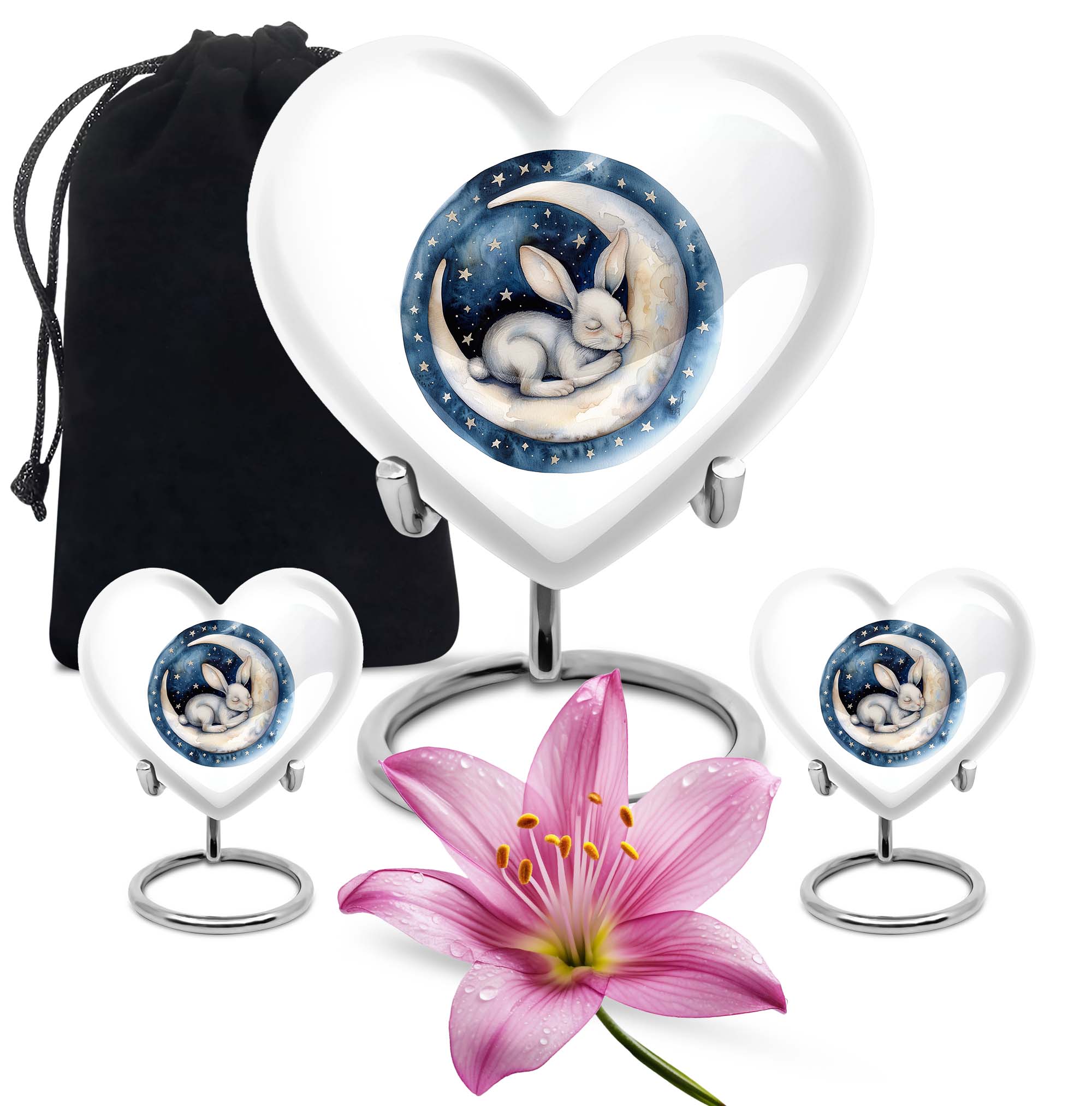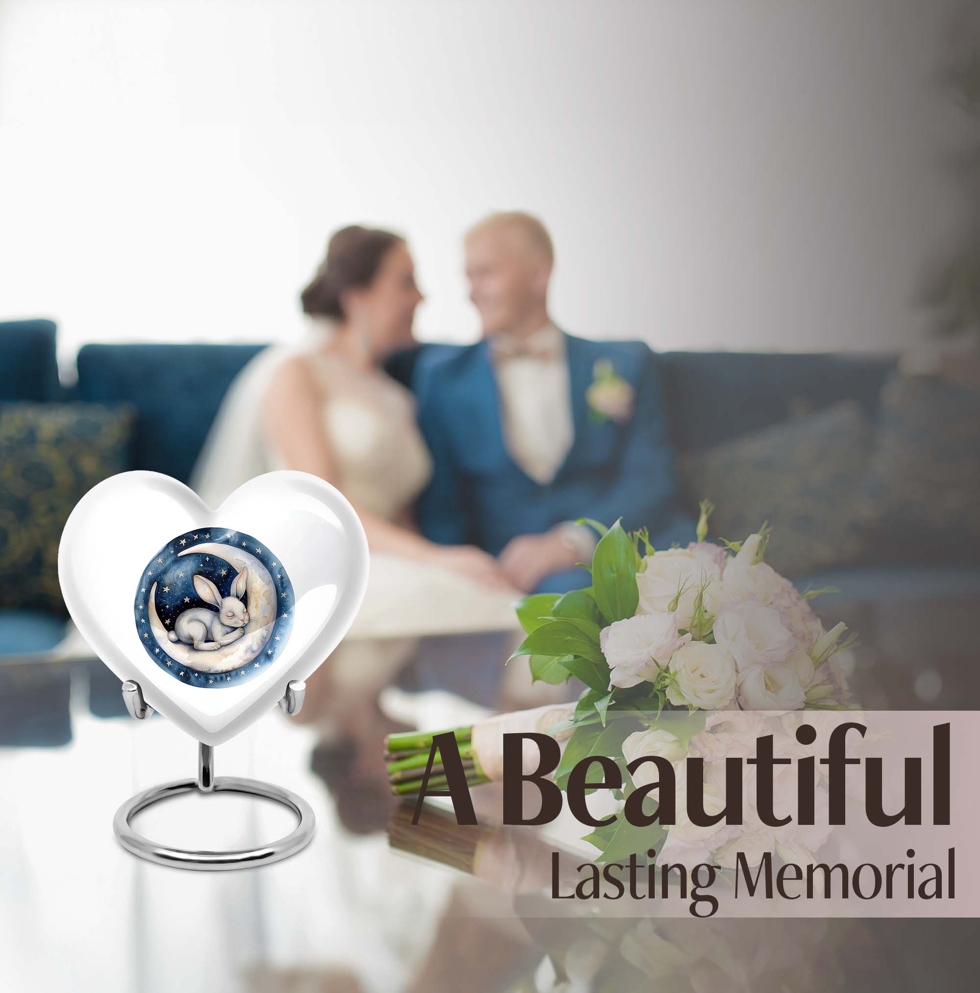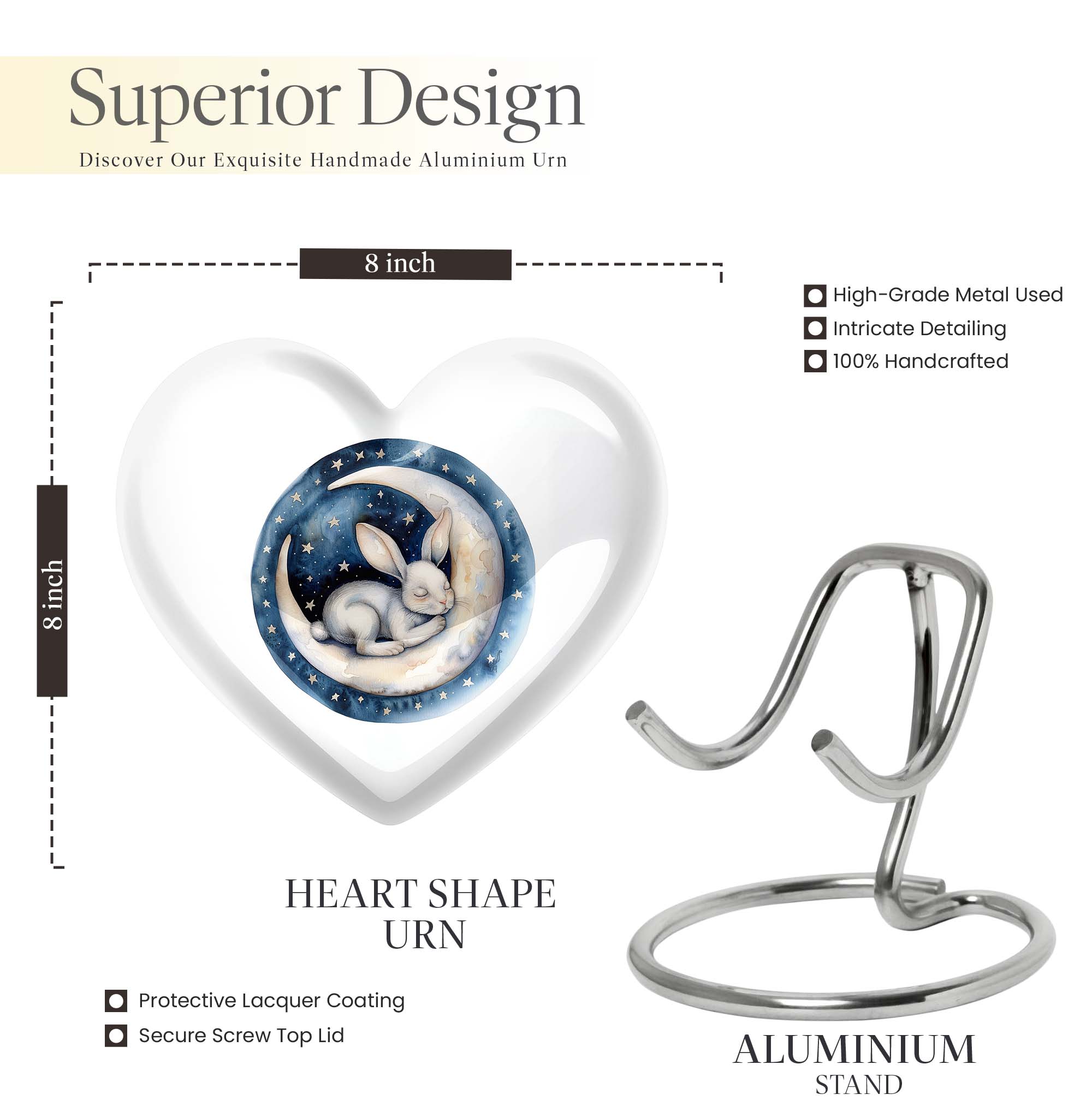 Gracefully crafted to honor your beloved departed, this 10-inch white bunny moon urn offers a beautifully unique and artfully abstract design, a perfect blend of solemnity and elegance. Weighing 3.3 pounds, it can comfortably hold up to 200 cubic inches of ashes. The heart-shaped urn, composed of top-quality aluminium, is not only supremely durable but also appeals with its mesmerizing aesthetics. Personalize this large urn with engraved names, letting it lovingly tell your dear one's story. The urn is perfect for those searching for 'white bunny moon Urn', 'funeral ash urn', 'memorial urns' or related keywords. Furthermore, each urn comes further contained in a velvet pouch for careful conservation of the ashes. This product appeals to those looking for 'memorial urn for mom ashes', 'human ashes urn', 'unique urns' or 'metal urns for adult human ashes'. Pay your respects to your loved ones with this stunning tribute that retains their memory in the heart.