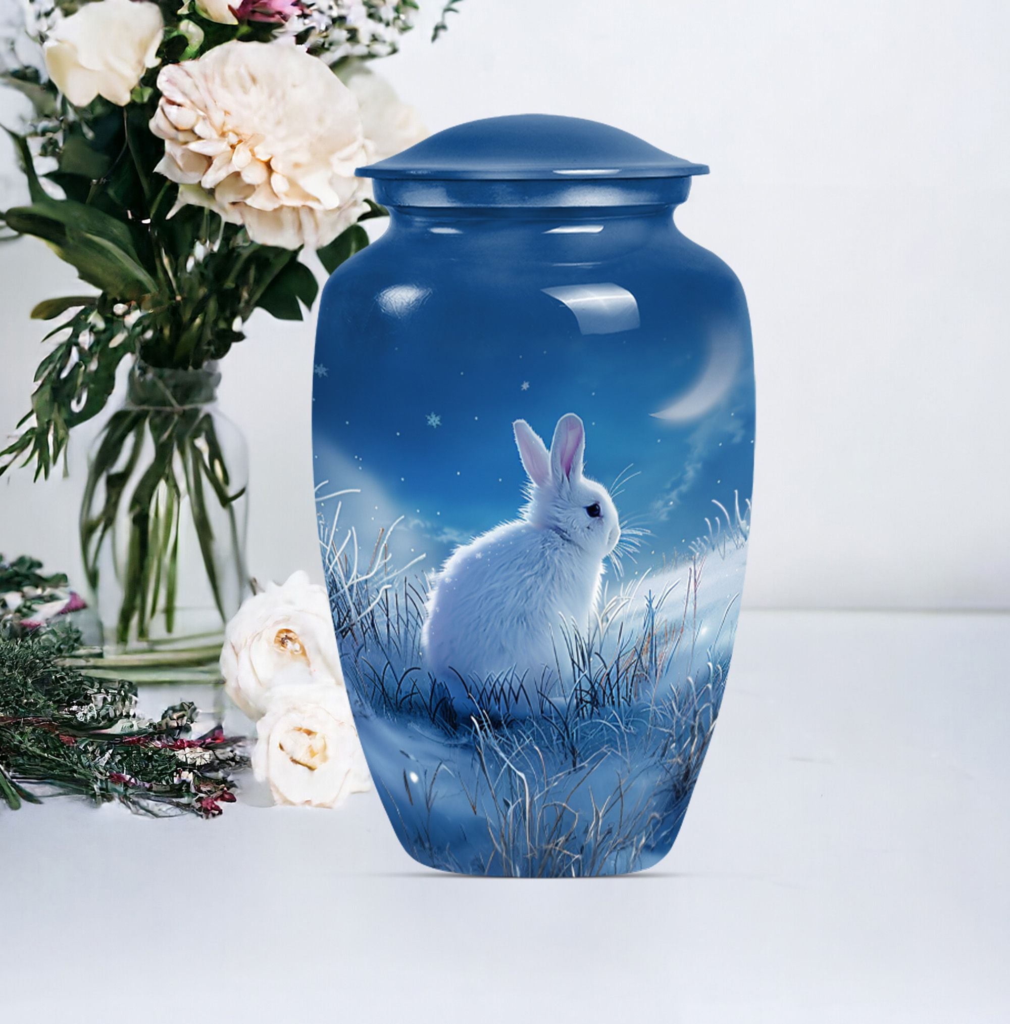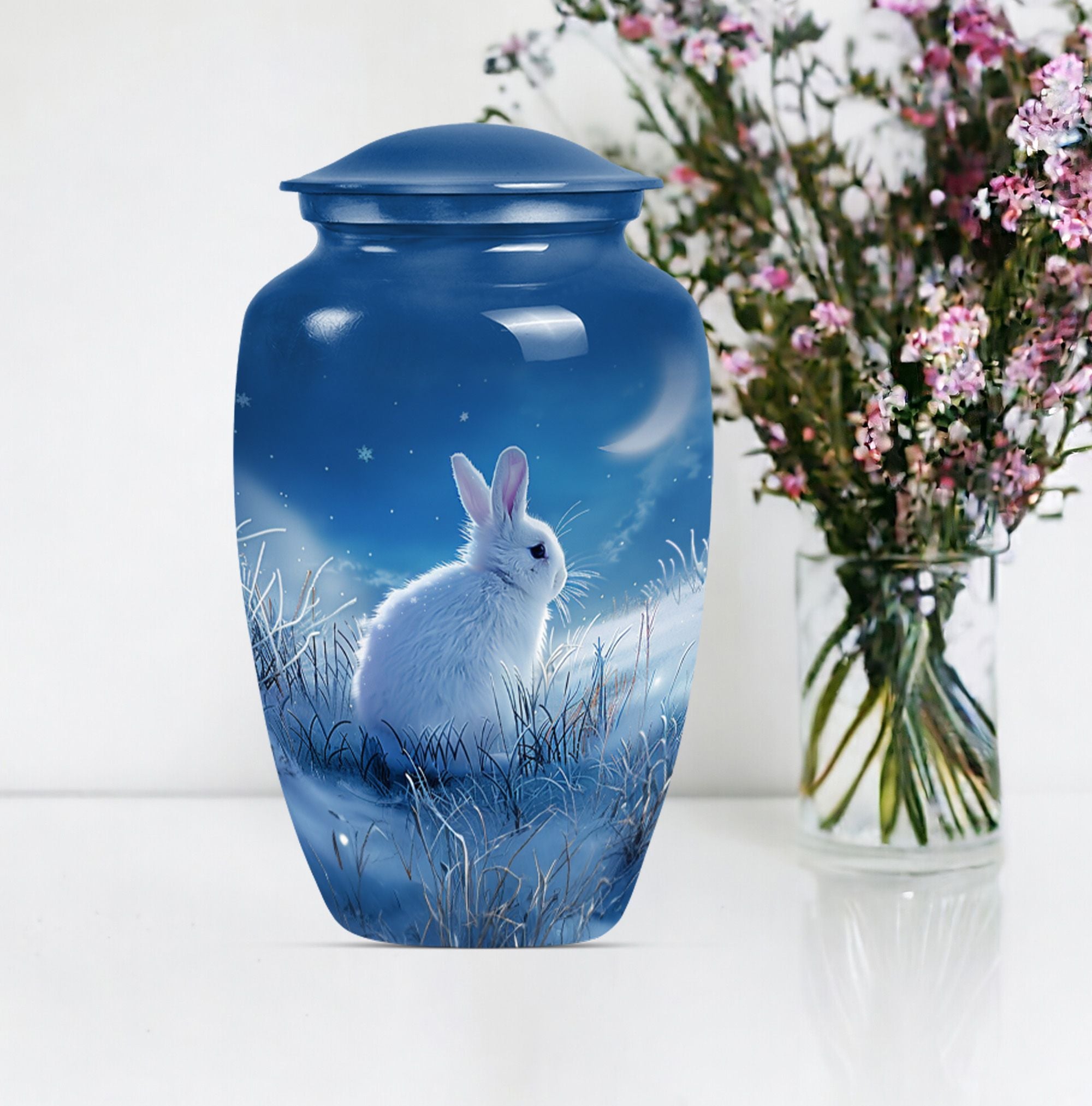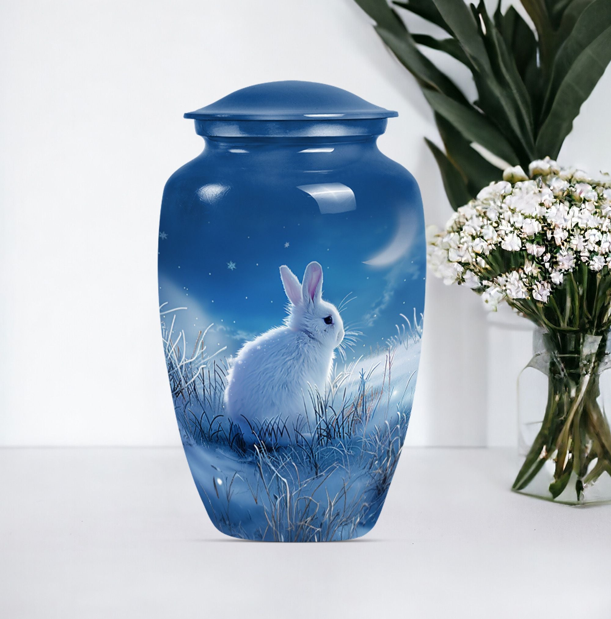 Looking for a unique and meaningful way to remember your loved ones recently passed? Our White Bunny Moon Urn, a large urn from the category of Memorial Ceremony Supplies, might be just the testament you're after. Constructed from sturdy aluminium and furnished with an abstract theme, this 10-inch cremation urn brings a touch of elegance to any setting. It'll safely maintain up to 200 cubic inches of ashes, secured in an provided velvet pouch, symbolizing an everlasting tribute to a beloved life. Standing firm at 3.3 pounds, this durable human cremation urn is not only a visual pièce de résistance but also a vessel of timeless memories. To make it more personal, you have the option to customize it with engraved names, making this not just an urn, but a lasting testament to a loved one. When your search for 'Funeral urns for human ashes adult' or 'memorial forever urns' leads you here - rest assured, you’ve identified an item of unique quality and value to favorably celebrate a precious life.
