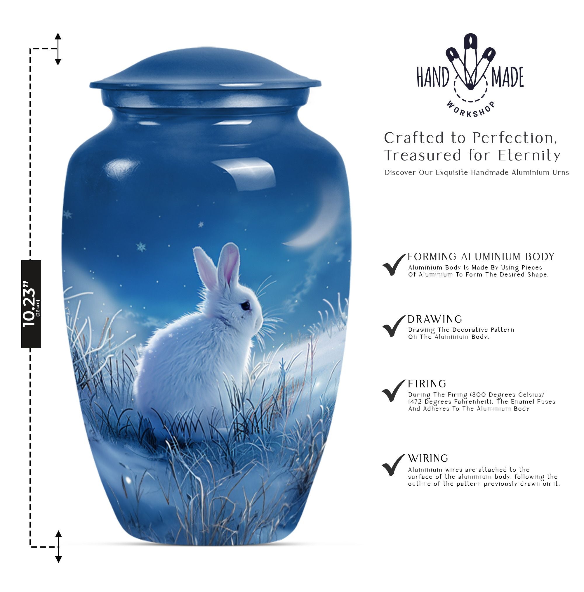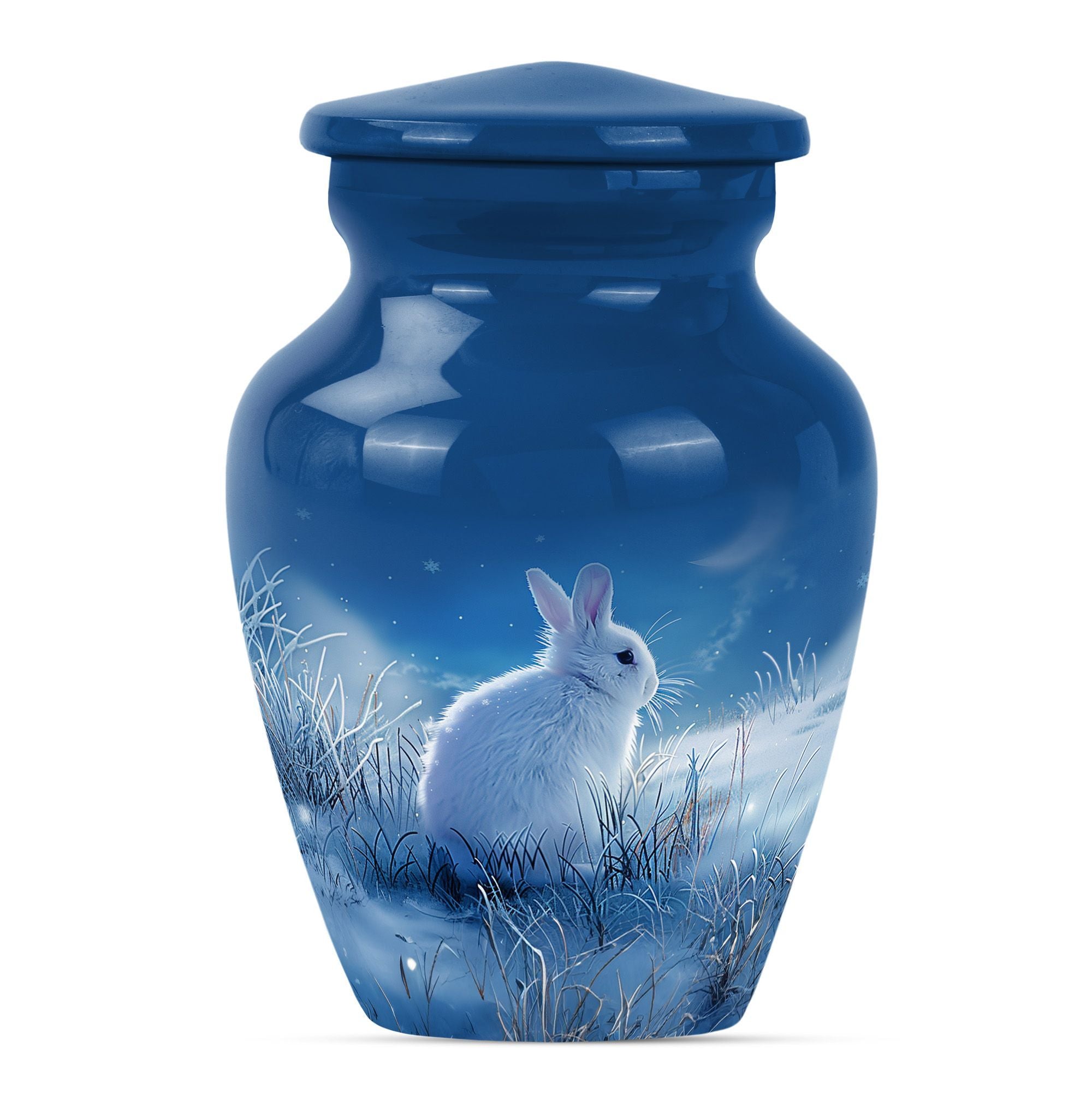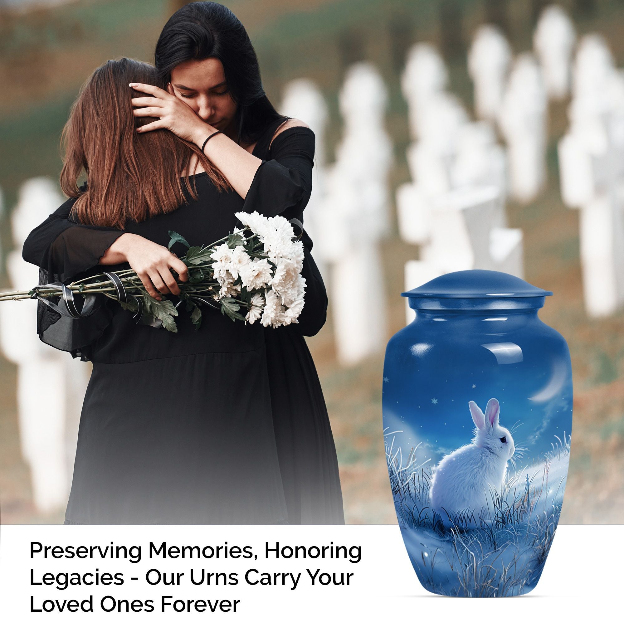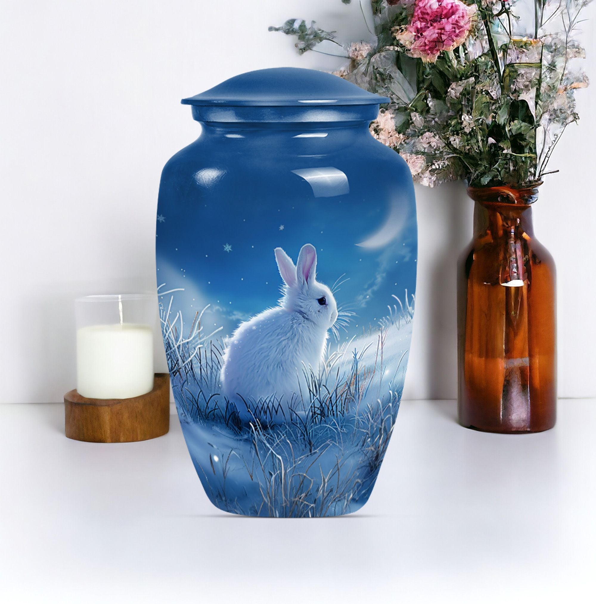 Looking for a unique and meaningful way to remember your loved ones recently passed? Our White Bunny Moon Urn, a large urn from the category of Memorial Ceremony Supplies, might be just the testament you're after. Constructed from sturdy aluminium and furnished with an abstract theme, this 10-inch cremation urn brings a touch of elegance to any setting. It'll safely maintain up to 200 cubic inches of ashes, secured in an provided velvet pouch, symbolizing an everlasting tribute to a beloved life. Standing firm at 3.3 pounds, this durable human cremation urn is not only a visual pièce de résistance but also a vessel of timeless memories. To make it more personal, you have the option to customize it with engraved names, making this not just an urn, but a lasting testament to a loved one. When your search for 'Funeral urns for human ashes adult' or 'memorial forever urns' leads you here - rest assured, you’ve identified an item of unique quality and value to favorably celebrate a precious life.