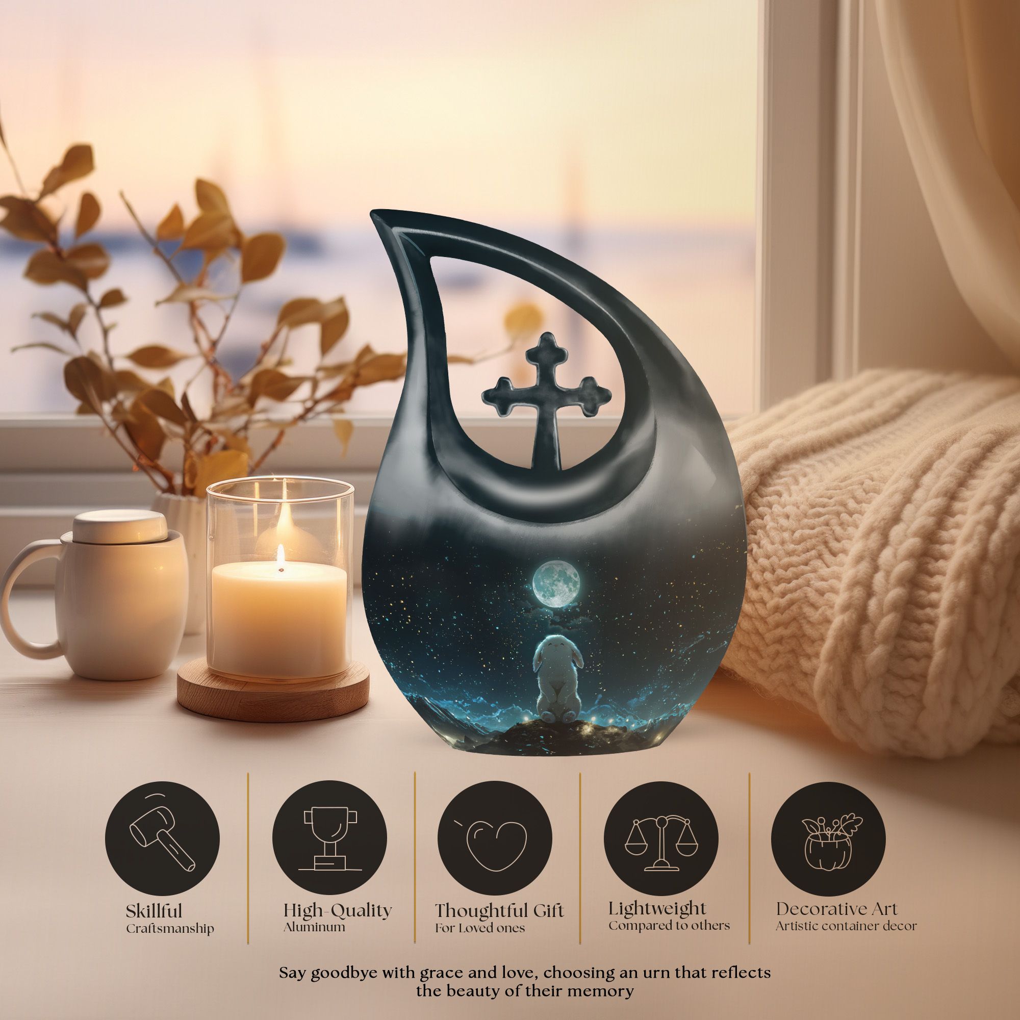 Crafted of robust aluminium, our White Bunny Moon Urn presents a thoughtful blend of durability and elegance for those shopping in the Religious & Ceremonial->Memorial Ceremony Supplies category. With its full size, the urn stands 10 inches tall and can accommodate up to 200 cubic inches of ashes, an ideal capacity for adult and senior use. Its weight of 3.3 pounds and the subtle Cross Drop motif emphasise the solid, enduring character of this product. Ensuring secure containment, the urn comes with a plush velvet pouch. Refined further by offering personalization, families can engrave their loved one's names on the urn, adding a unique touch of tribute. Avoid the common, opt for this Beautiful Urn that serves as a commendable vessel for your beloved's final rest. Remember, this Large Urn is not merely a memorial urn, it’s a piece that’s as precious and singular as the memories held within. Consider our product if you are seeking decorative and burial urns for human ashes.