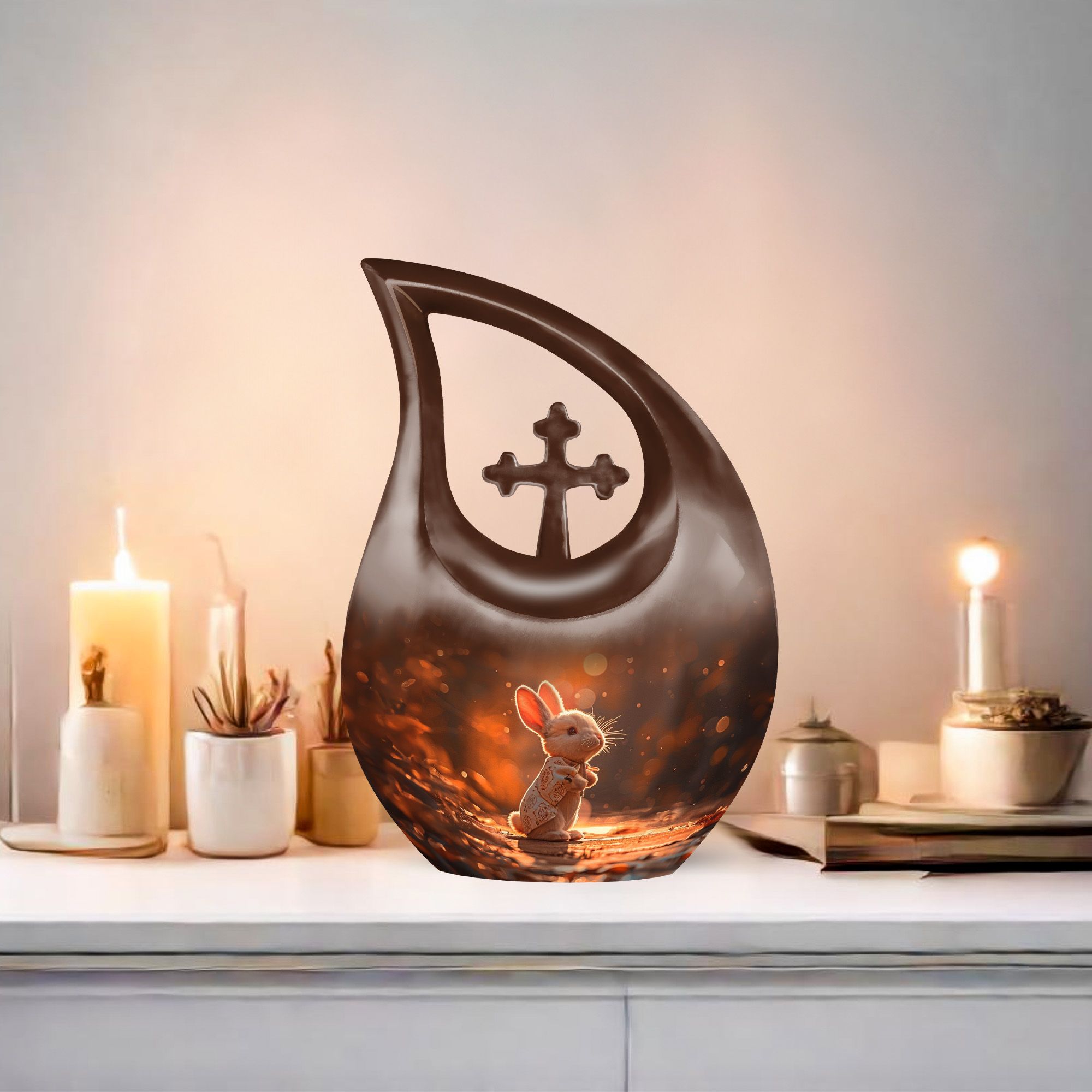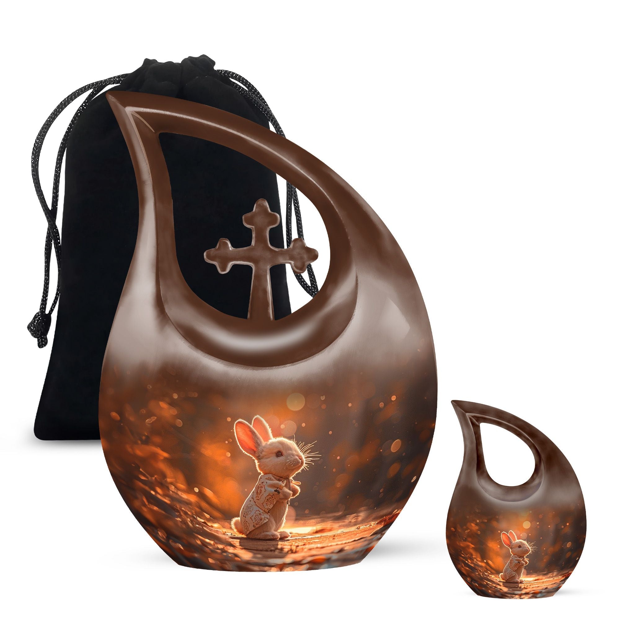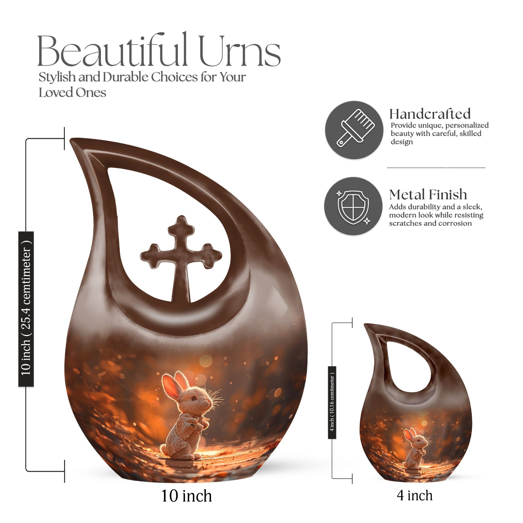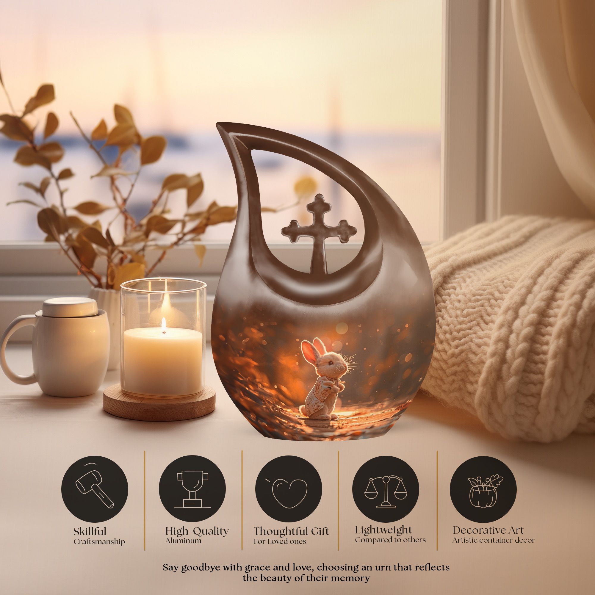 Celebrate and honor the cherished memories of your dear departed with the White Bunny Moon Urn, an exquisite piece from our collection of memorial urns. Developed from premium quality aluminium, this larger sized urn measures 10 inches in height and weighs 3.3 pounds. Its unique Cross Drop theme embodies a serene yet compelling aesthetics that's sure to bring a sense of tranquility. Measuring a capacity of 200 cubic inches, it's amply sized to securely conserve the ashes of your loved one. The urn comes with a plush velvet pouch, ensuring the contained ashes are safeguarded with utmost respect and dignity. For a more personalized touch, customers can opt for an engraving of their loved one's names on the urn. Uniquely themed as White Bunny Moon, this urn serves as a beautiful keepsake memory box, subtly incorporating the often searched keywords like 'Cool Urns', 'Cremation Boxes For Adults', and 'Metal Urns For Ashes'. Honor your beloved with dignity and grace, encapsulating their essence with our exquisite White Bunny Moon urn.