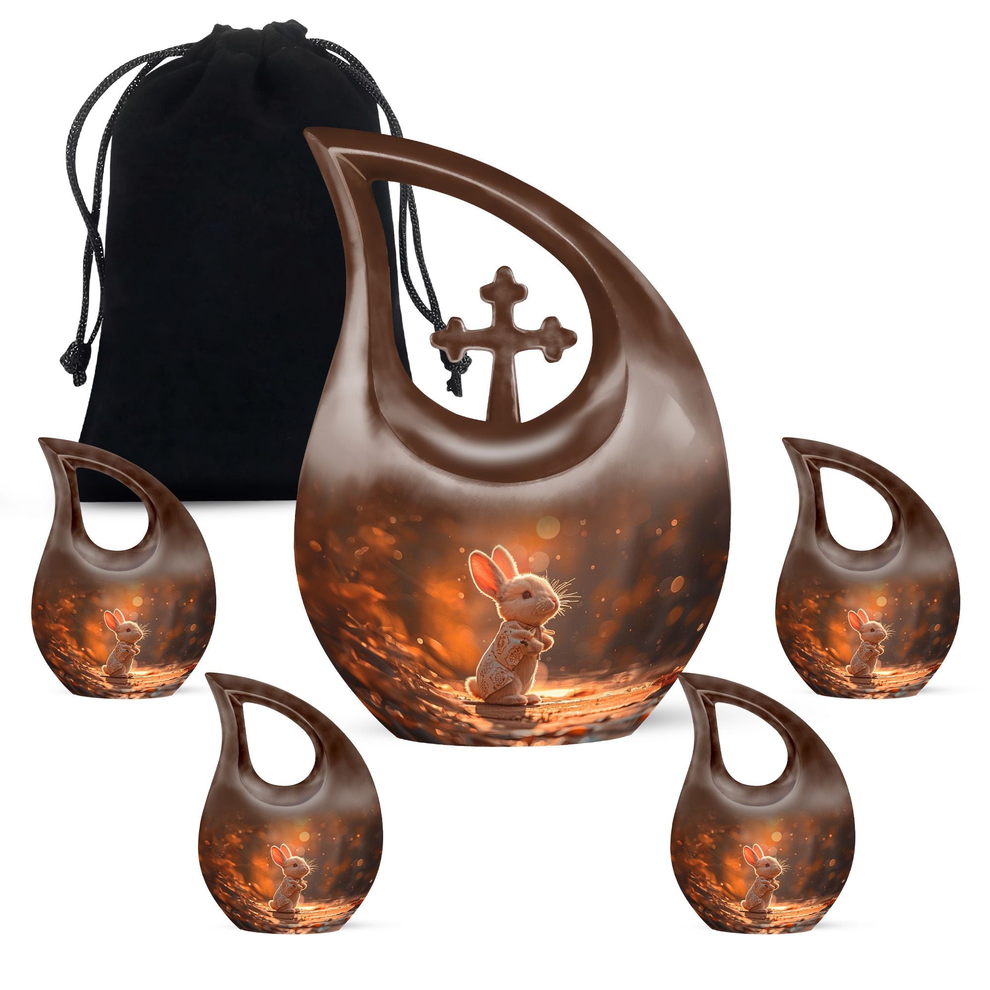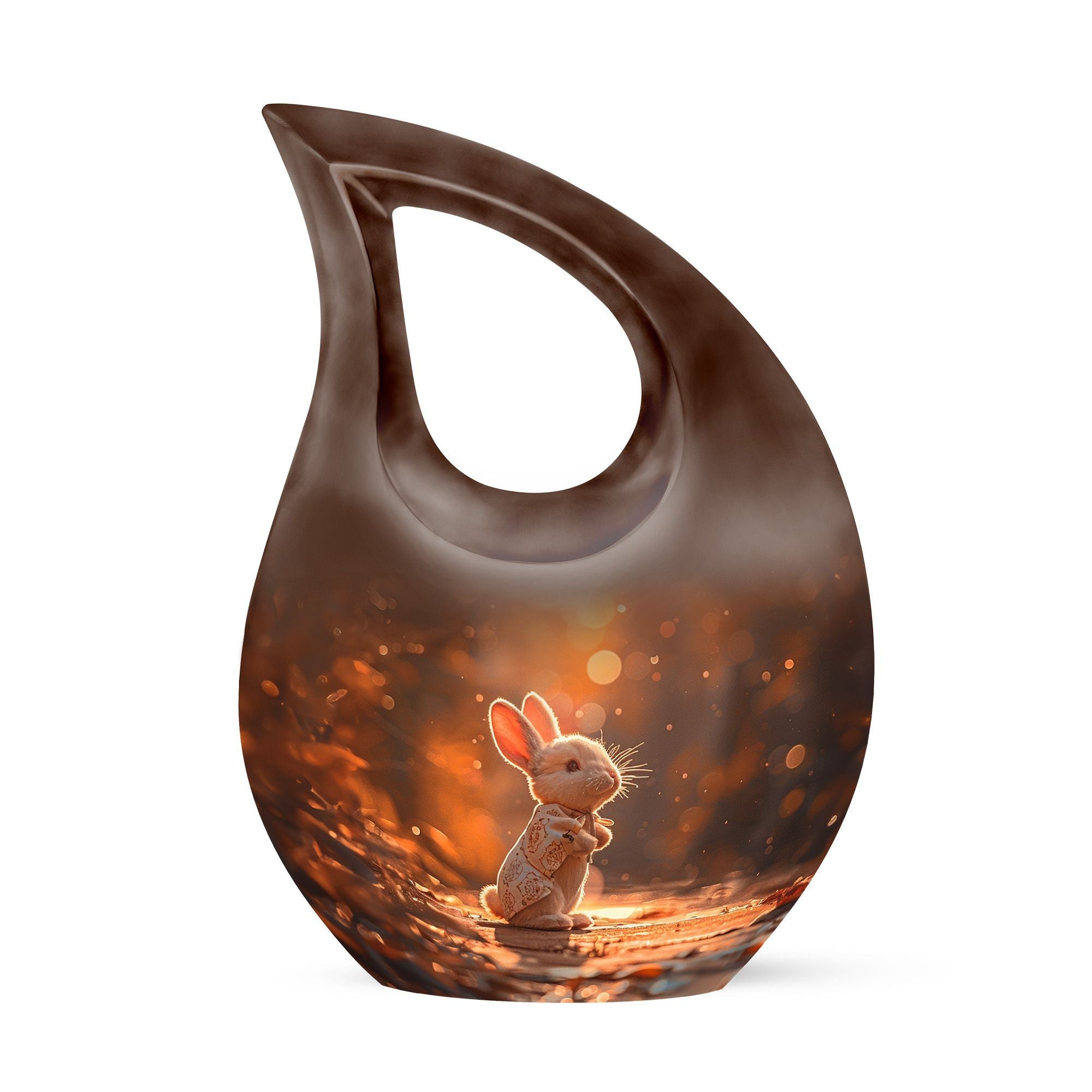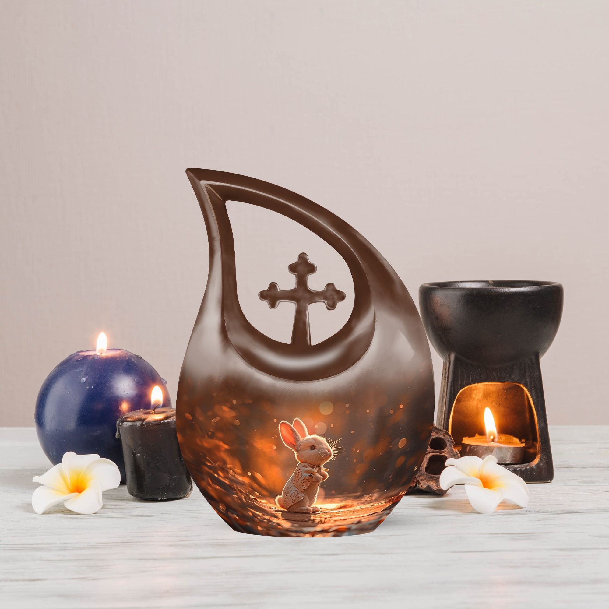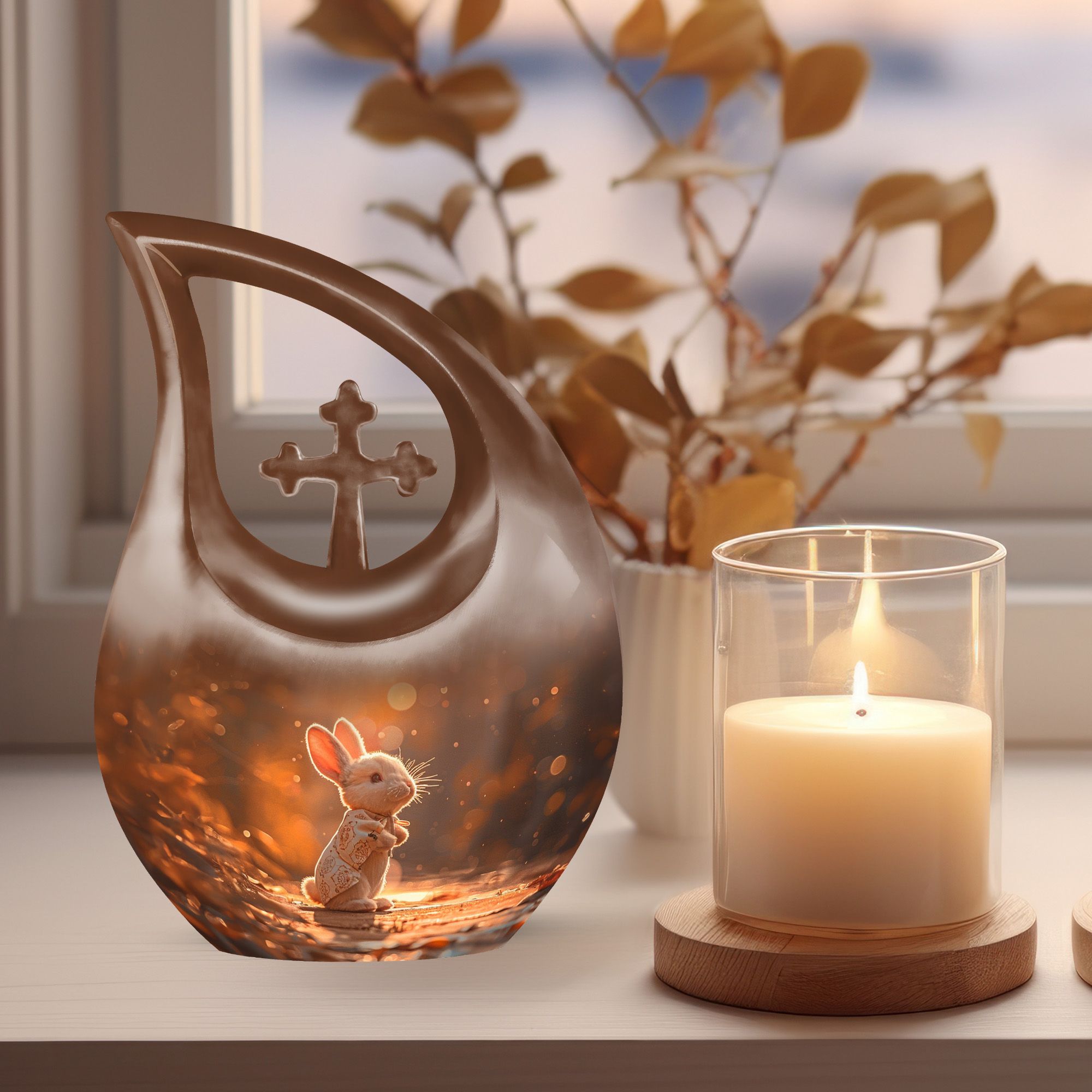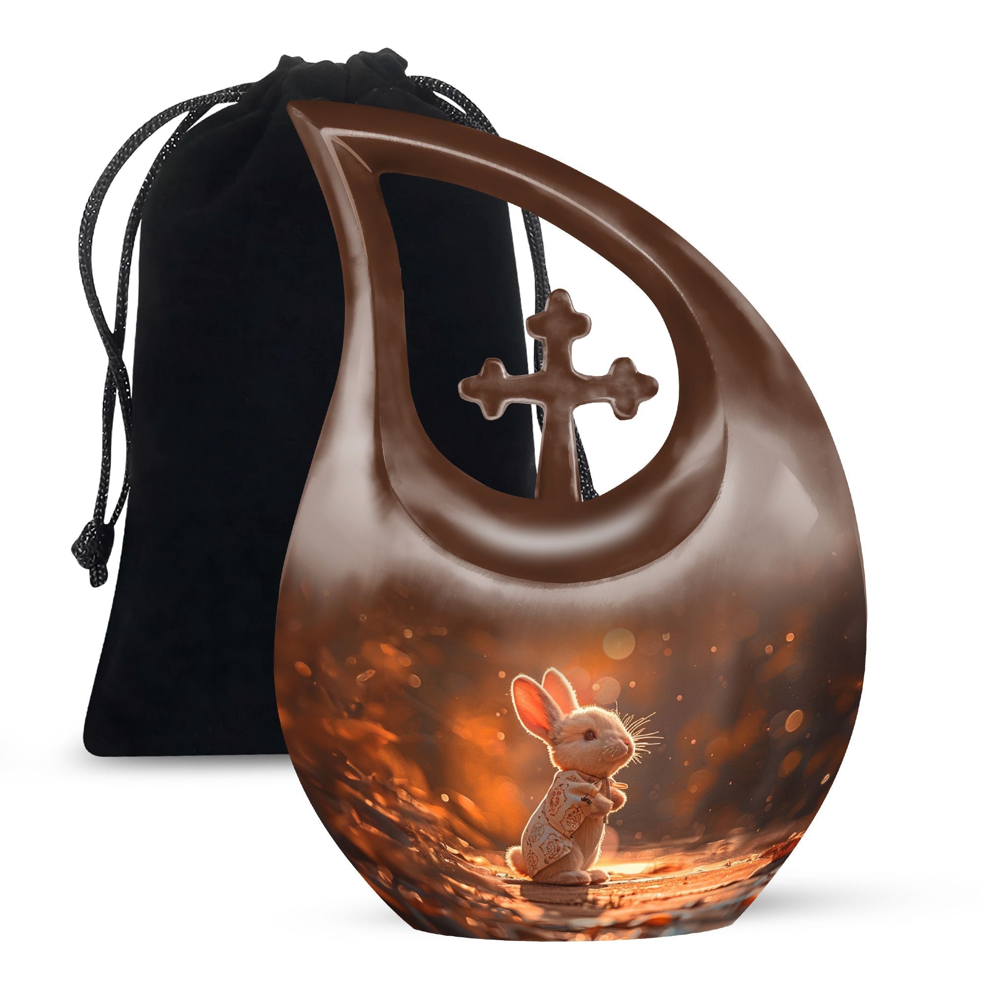 Celebrate and honor the cherished memories of your dear departed with the White Bunny Moon Urn, an exquisite piece from our collection of memorial urns. Developed from premium quality aluminium, this larger sized urn measures 10 inches in height and weighs 3.3 pounds. Its unique Cross Drop theme embodies a serene yet compelling aesthetics that's sure to bring a sense of tranquility. Measuring a capacity of 200 cubic inches, it's amply sized to securely conserve the ashes of your loved one. The urn comes with a plush velvet pouch, ensuring the contained ashes are safeguarded with utmost respect and dignity. For a more personalized touch, customers can opt for an engraving of their loved one's names on the urn. Uniquely themed as White Bunny Moon, this urn serves as a beautiful keepsake memory box, subtly incorporating the often searched keywords like 'Cool Urns', 'Cremation Boxes For Adults', and 'Metal Urns For Ashes'. Honor your beloved with dignity and grace, encapsulating their essence with our exquisite White Bunny Moon urn.
