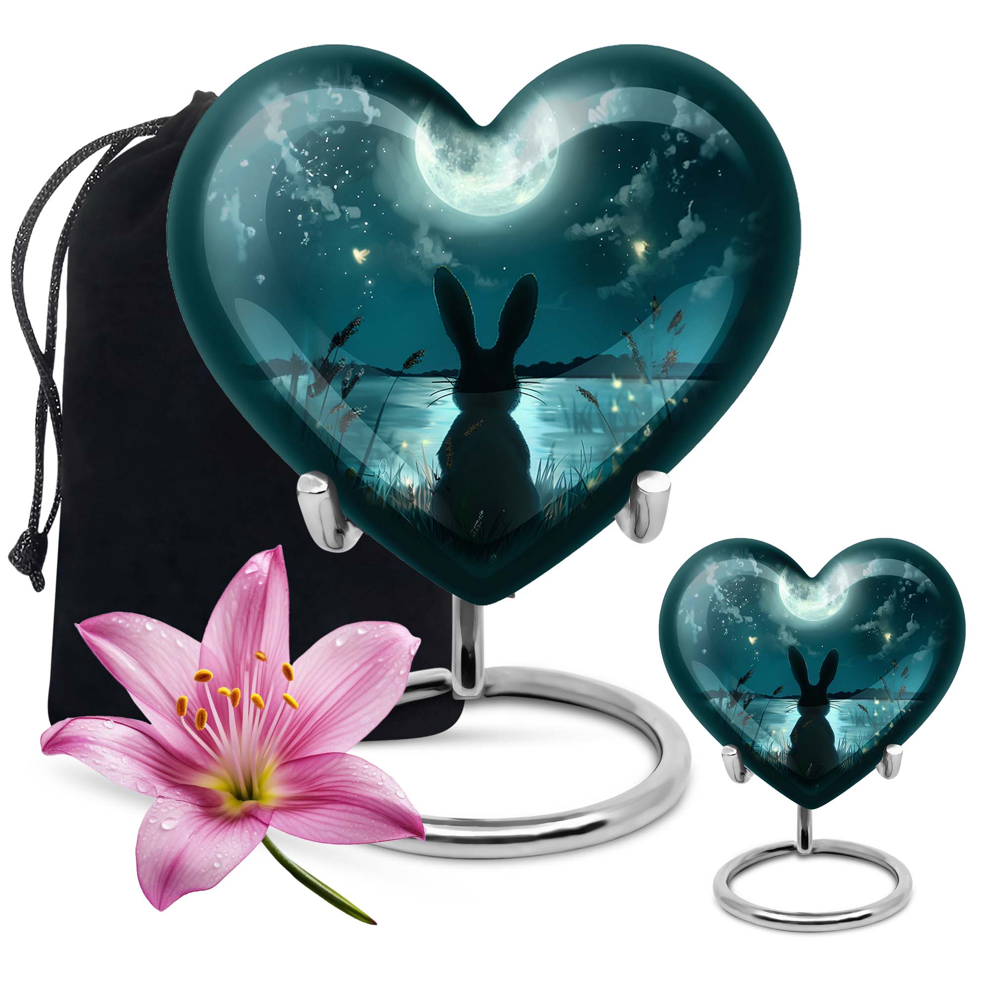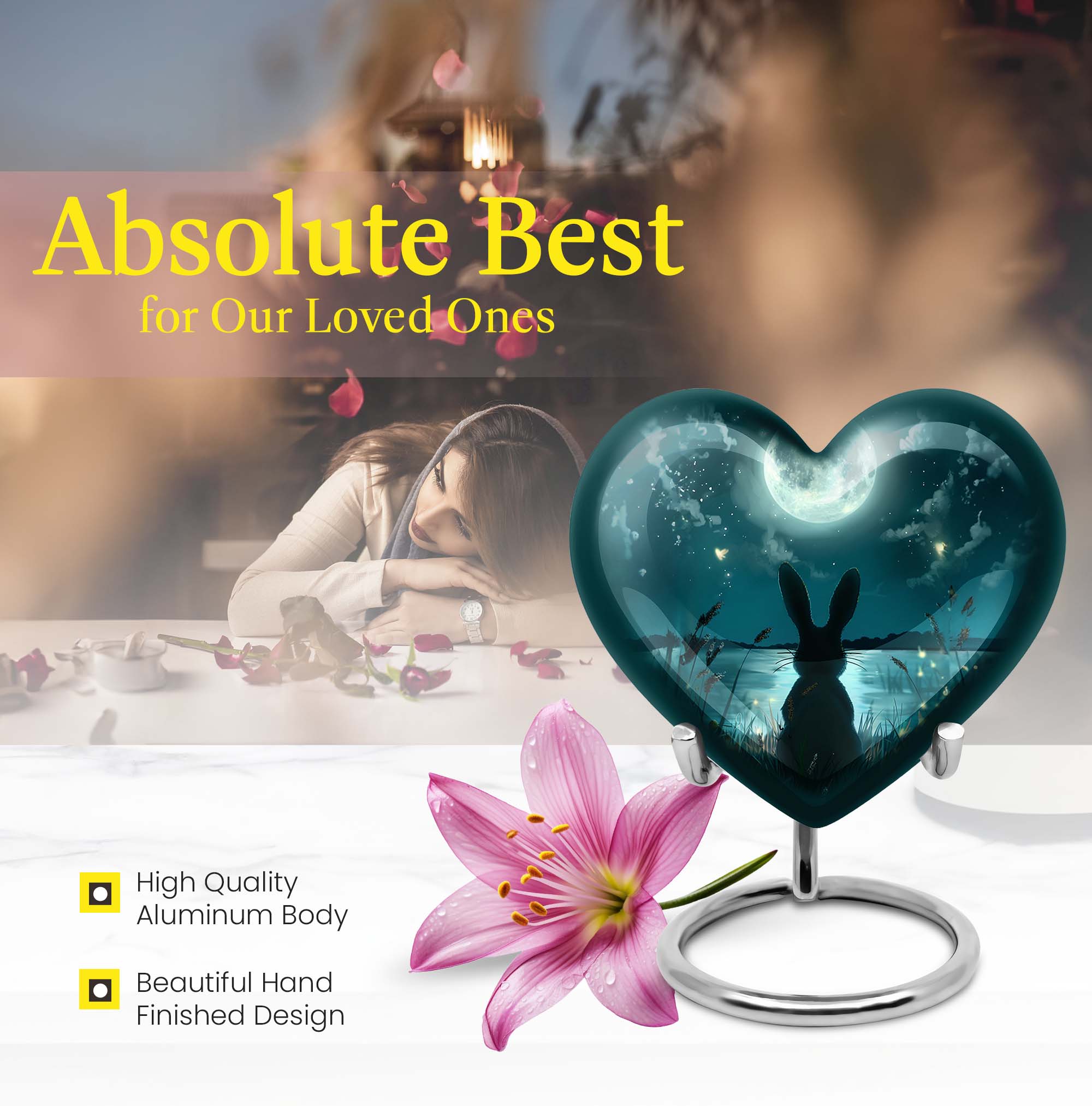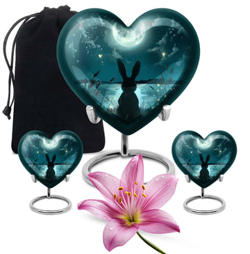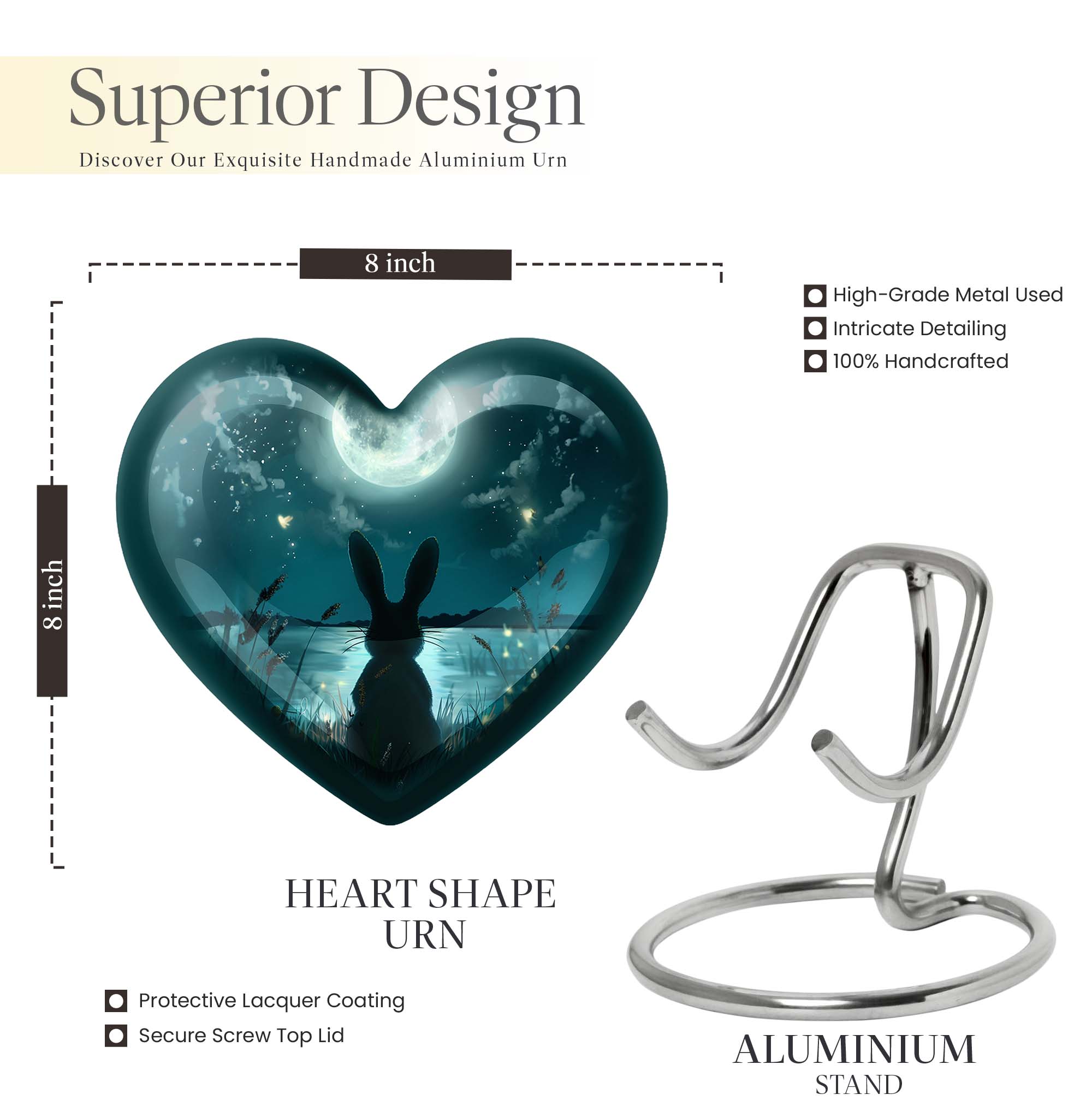 Honor the life of a cherished one with our beautiful Heart Urn. Resonating with the abstract theme, this Large Urn is meticulously crafted from high-quality Aluminium, providing a lasting tribute to your beloved. It stands at 10 inches in height, striking a commanding yet elegant silhouette. At a weight of 3.3 pounds, it offers sturdy and durable containment. This urn is designed to hold up to 200 cubic inches of ashes, making it suitable for both adult males and females. For an added touch of personal sentiment, you can customize it with engraved names. Our White Bunny Moon Urn package also features a velvet pouch for the secure storage of ashes. The diverse utility of this product makes it an ideal choice as a memorial gift. This urn captures the heart's timeless essence and the spiritual bond that is created through remembrance. Explore our range of memorial urns to find the perfect resting place for your loved ones. Keywords: Burial funeral urns, cremation urn funeral urn adult ash, metal urn for ashes adult male.