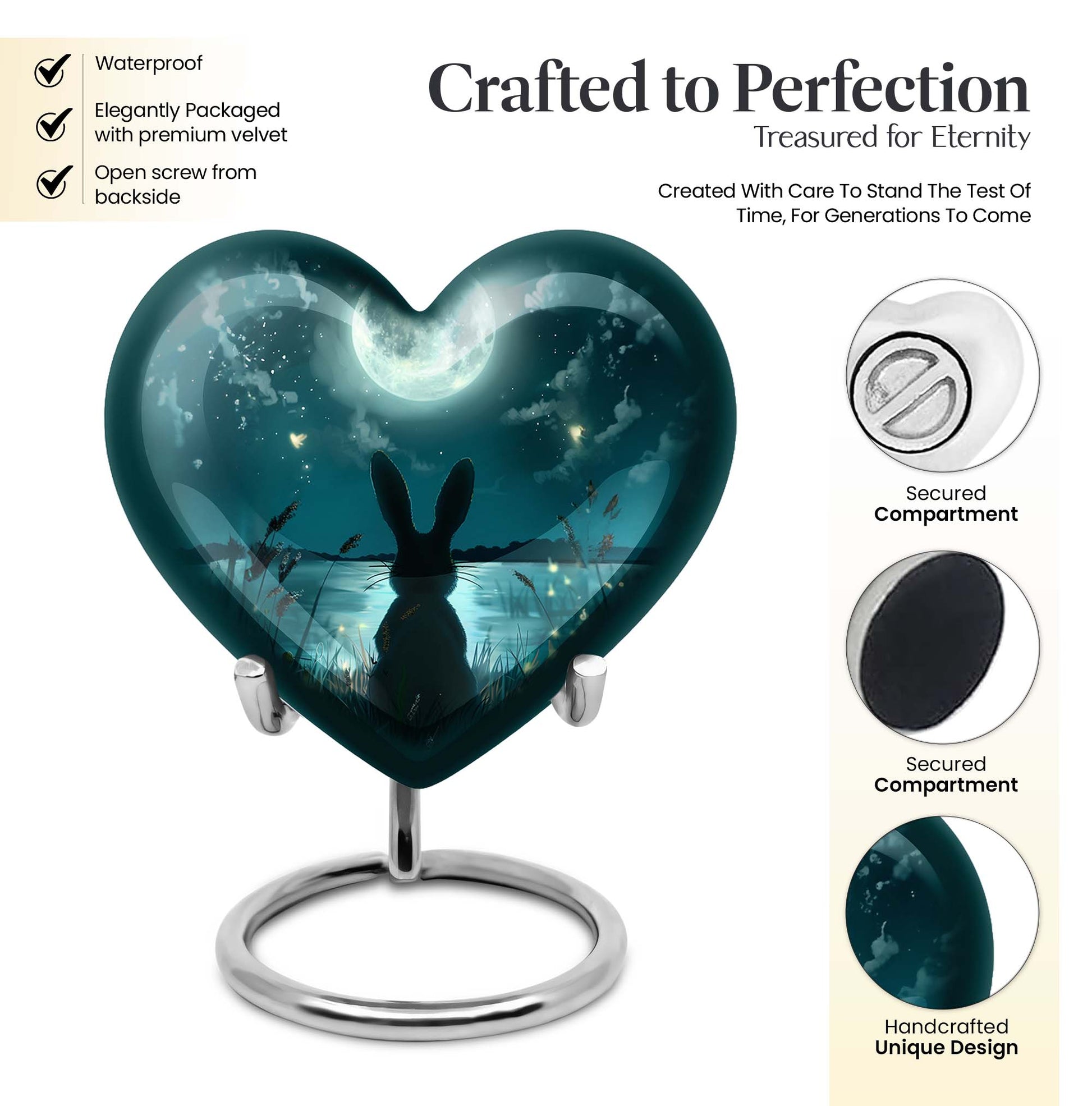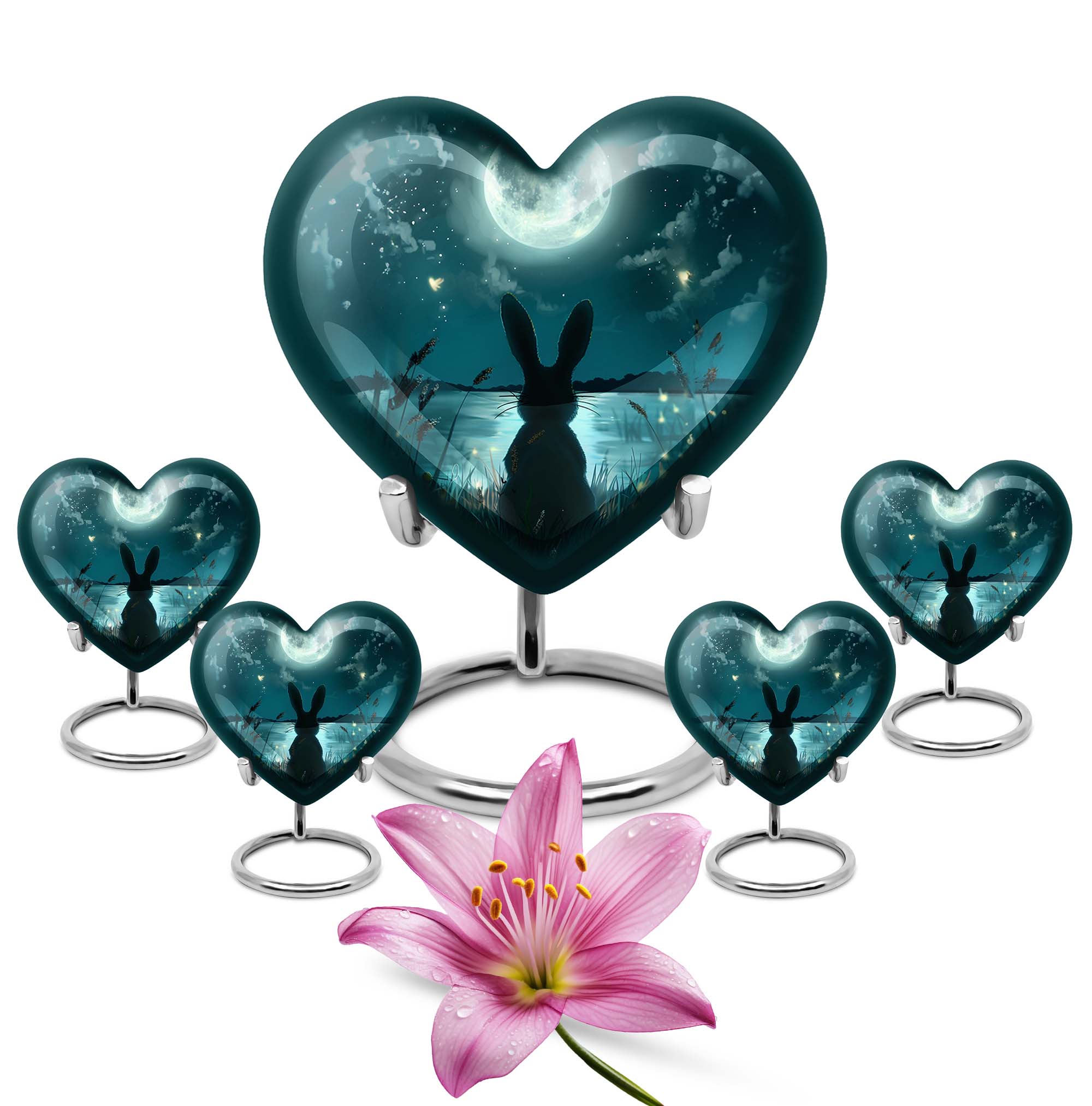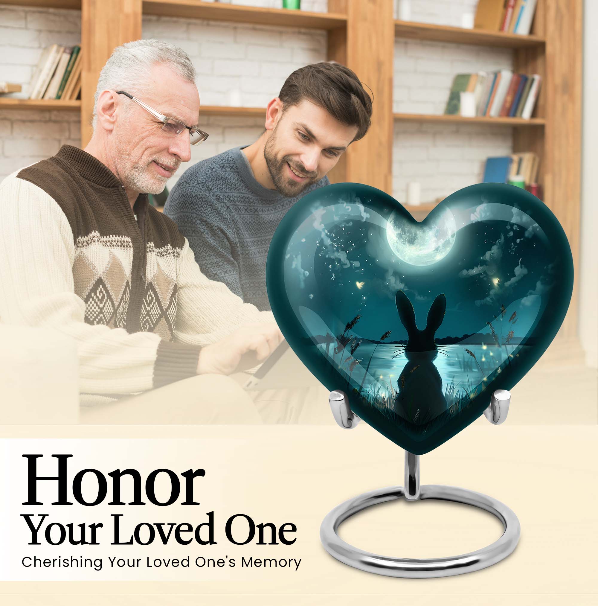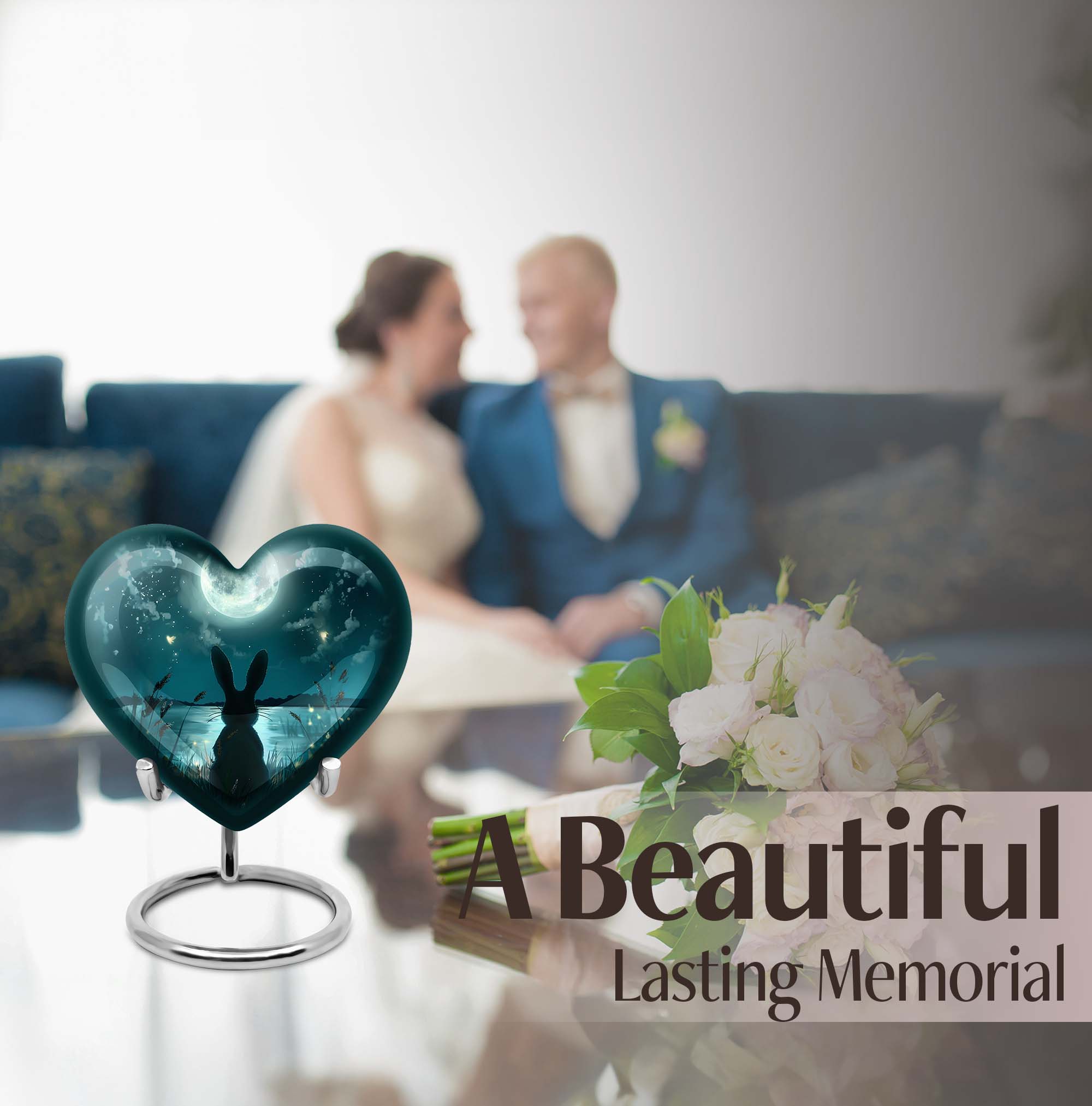 Honor the life of a cherished one with our beautiful Heart Urn. Resonating with the abstract theme, this Large Urn is meticulously crafted from high-quality Aluminium, providing a lasting tribute to your beloved. It stands at 10 inches in height, striking a commanding yet elegant silhouette. At a weight of 3.3 pounds, it offers sturdy and durable containment. This urn is designed to hold up to 200 cubic inches of ashes, making it suitable for both adult males and females. For an added touch of personal sentiment, you can customize it with engraved names. Our White Bunny Moon Urn package also features a velvet pouch for the secure storage of ashes. The diverse utility of this product makes it an ideal choice as a memorial gift. This urn captures the heart's timeless essence and the spiritual bond that is created through remembrance. Explore our range of memorial urns to find the perfect resting place for your loved ones. Keywords: Burial funeral urns, cremation urn funeral urn adult ash, metal urn for ashes adult male.