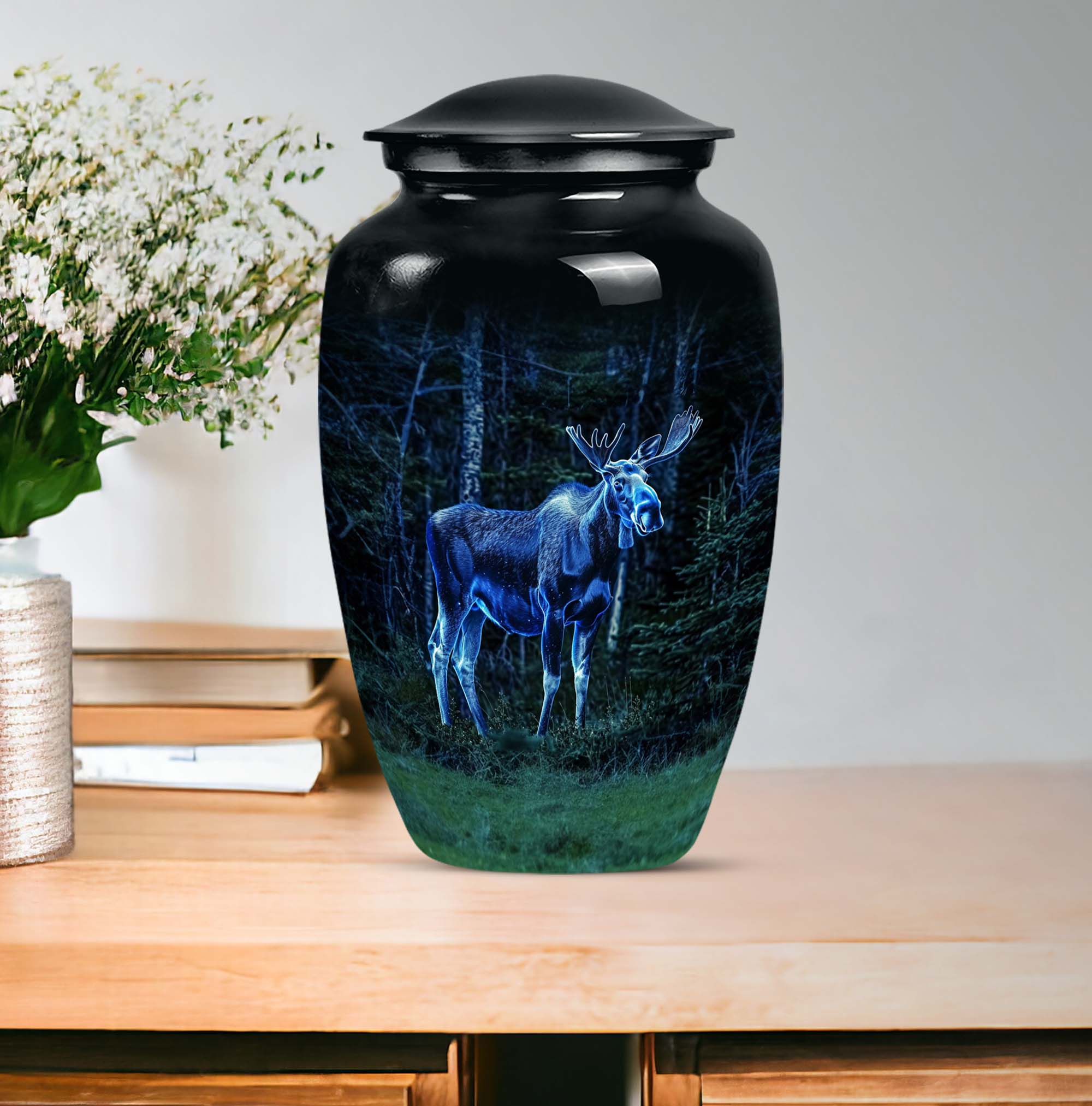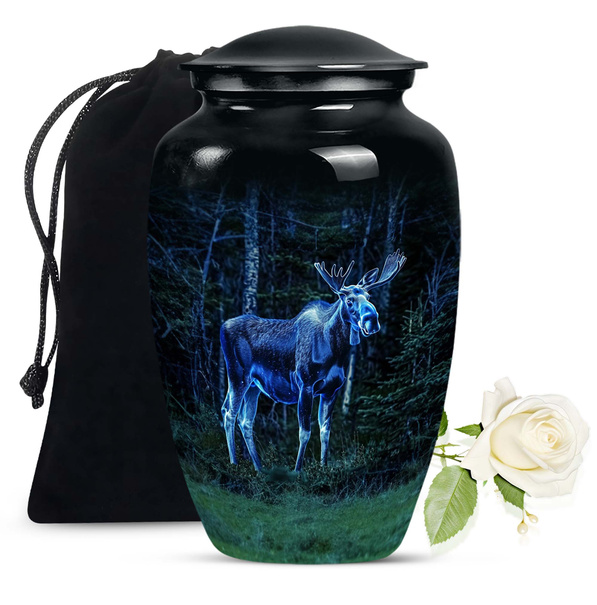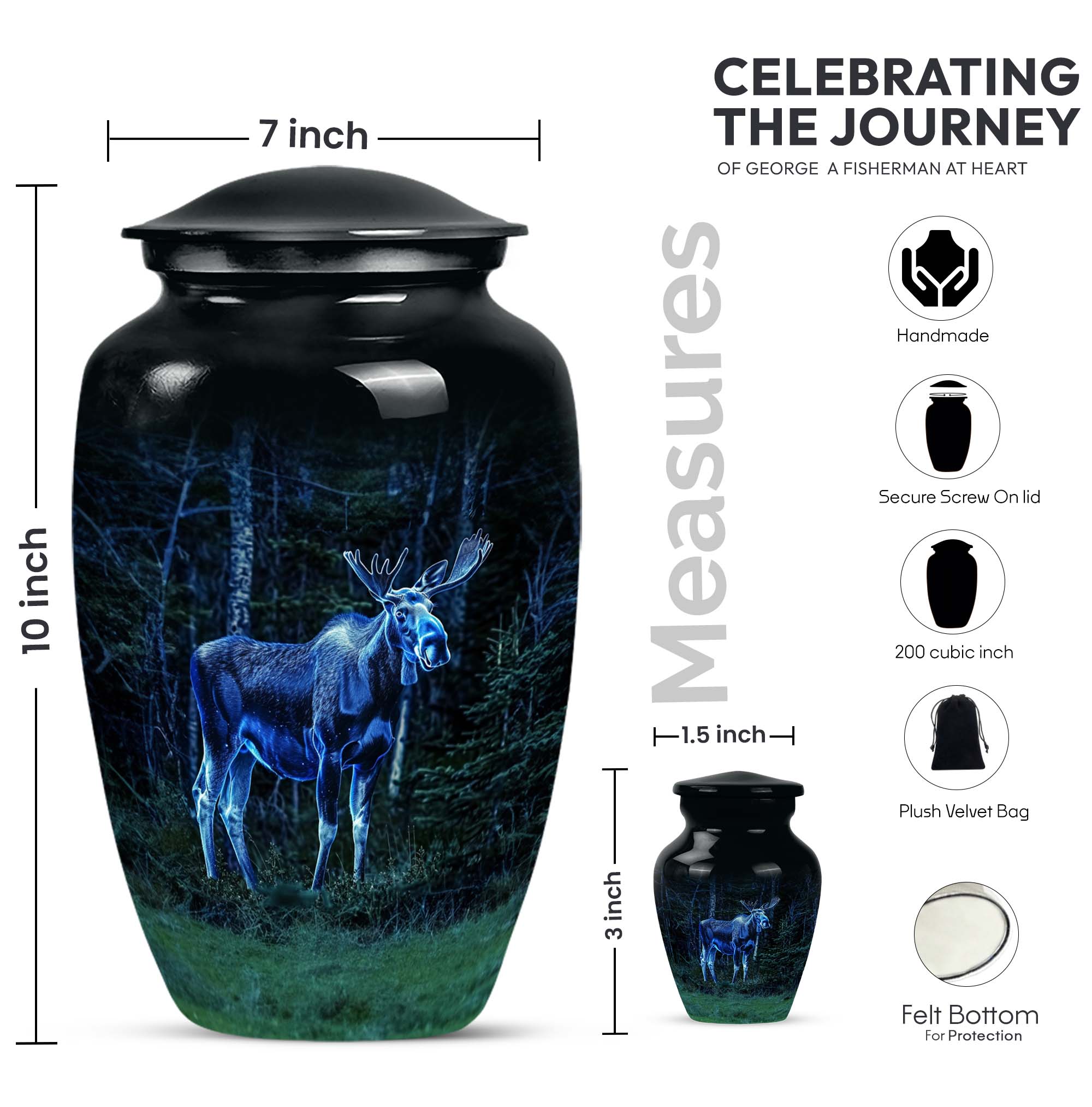 Looking to pay tribute to a cherished one with a unique touch? Discover our Moose Walking Urn, an exquisite and substantial memorial urn to honor your loved one's life journey. Composed of high-quality aluminium, this funeral urn for burial is intricately designed to embody abstract themes in a sophisticated 10-inch classic urn format. The large urn weighs a sturdy 3.3 pounds, signifying the heaviness of remembrance and unshakeable love. Designed to accommodate up to 200 cubic inches of cremains, this memorial powerfully symbolizes the spirit of your departed loved one. With an added option to personalize with engraved names, it enables an intimate connection with the essence they left behind. The urn arrives with a plush velvet pouch, ensuring containment of ashes is done with respect and dignity. Recommended keywords for search might include 'cremation urn for dad', 'urn human adult urns', and 'adult burial cremation urns'. This elegantly-crafted urn encapsulates the timeless bond between you and your beloved, serving as a beacon of their life and love.