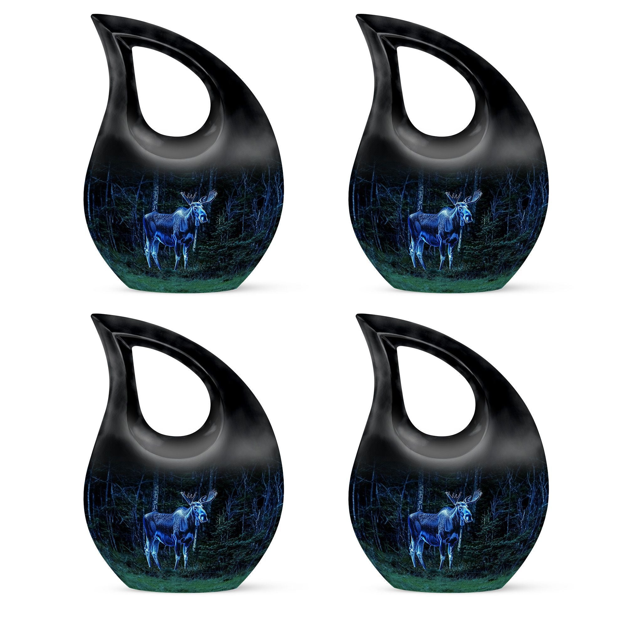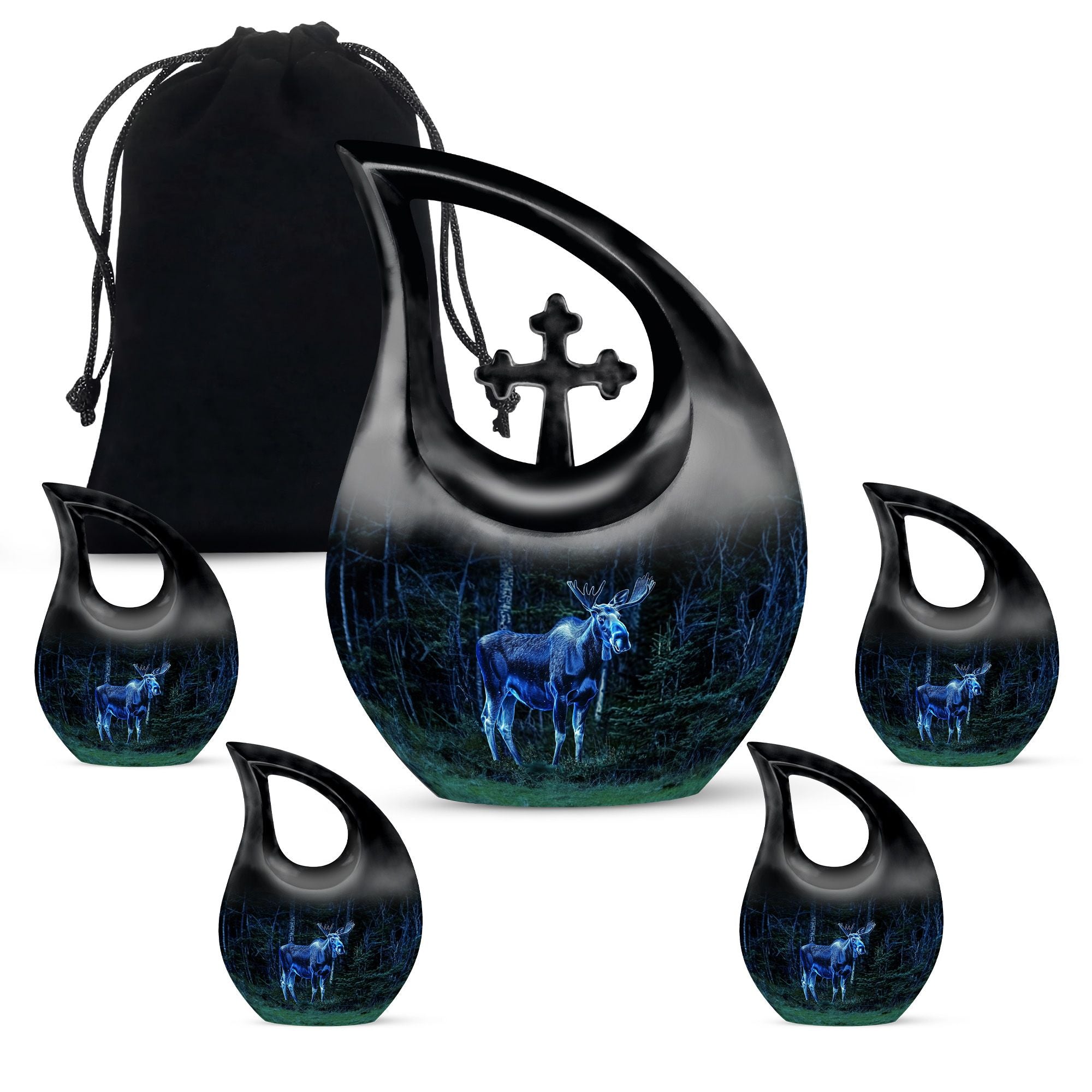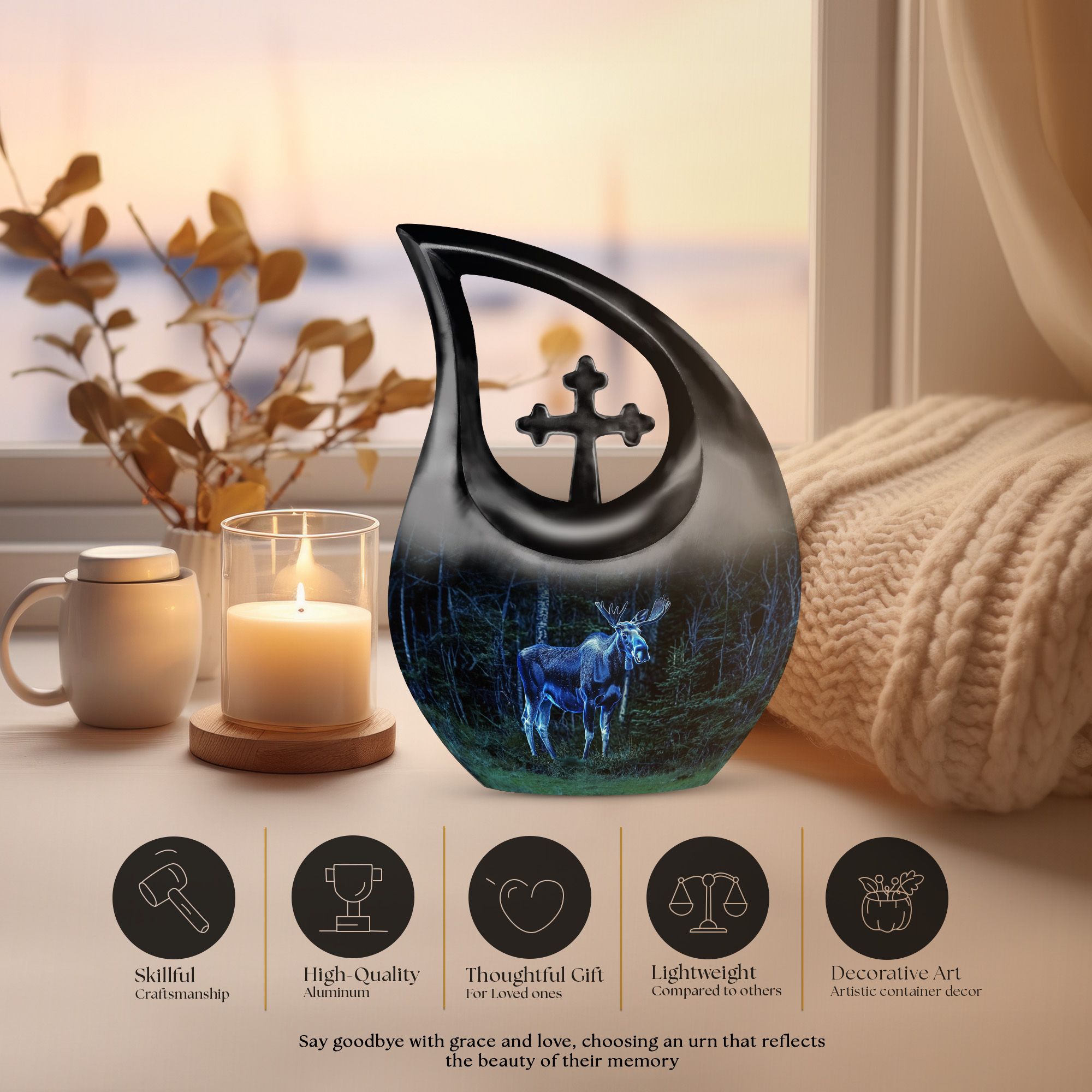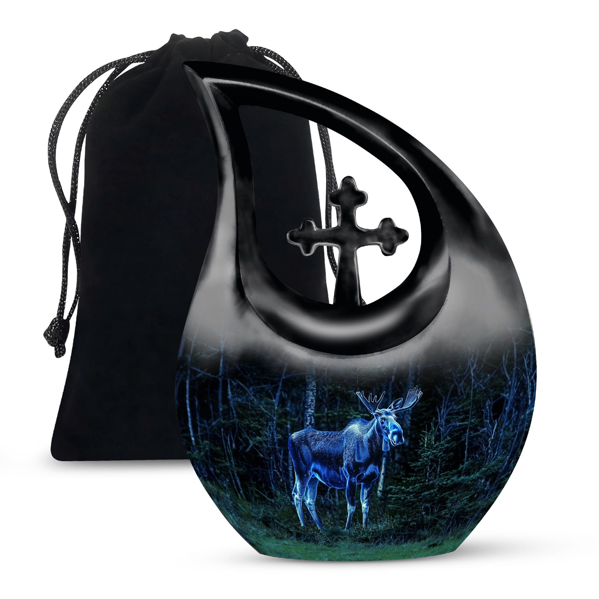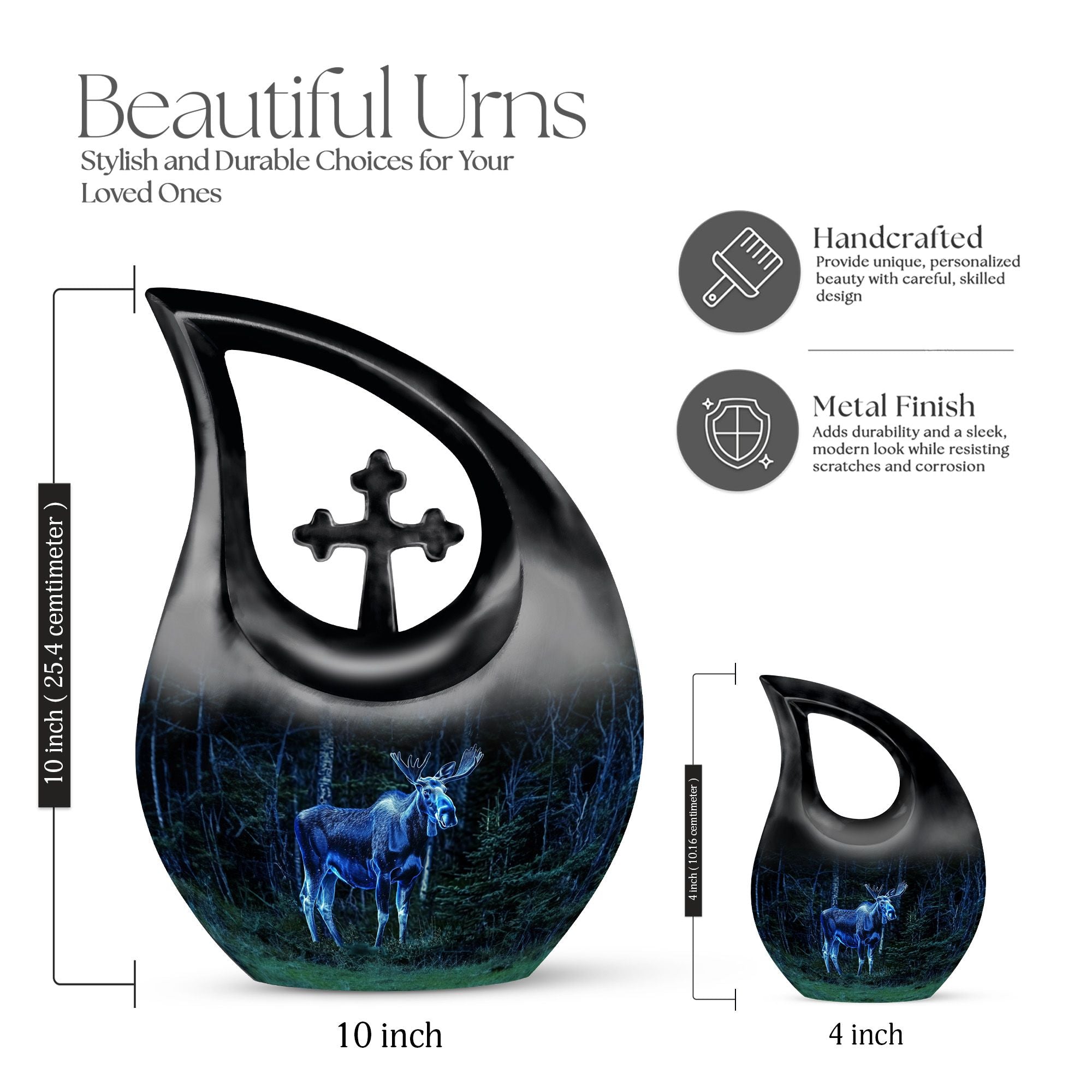 From unspoken sentiments that wish to be conveyed, to the eternal resting place of a loved one, the Moose Walking Urn represents a thoughtful way to bid farewell. This Large Urn, made of sturdy Aluminium, is not just a Metal Cremation Urn, but a unique piece that sympathetically captures your sentiments. With the Cross Drop theme subtly representing a journey towards eternal peace, this 10-Inch urn is perfect for containing the ashes of the departed. The urn comes with a velvet pouch enhancing secure containment. Weighing 3.3 pounds and with the dimensions of 10 inches in height, it has a generous capacity of 200 cubic inches. This urn allows you to personalize with engraved names, making it not simply an urn, but a heart touching memorial that resonates with love and remembrance. Whether you're looking for Miniature Urns For Ashes, Blue Urn For Ashes, Ashes Urns For Sale, or Garden Urns For Ashes, our Moose Walking Cremation Urn stands as a gentle reminder of the universal cycle of life.