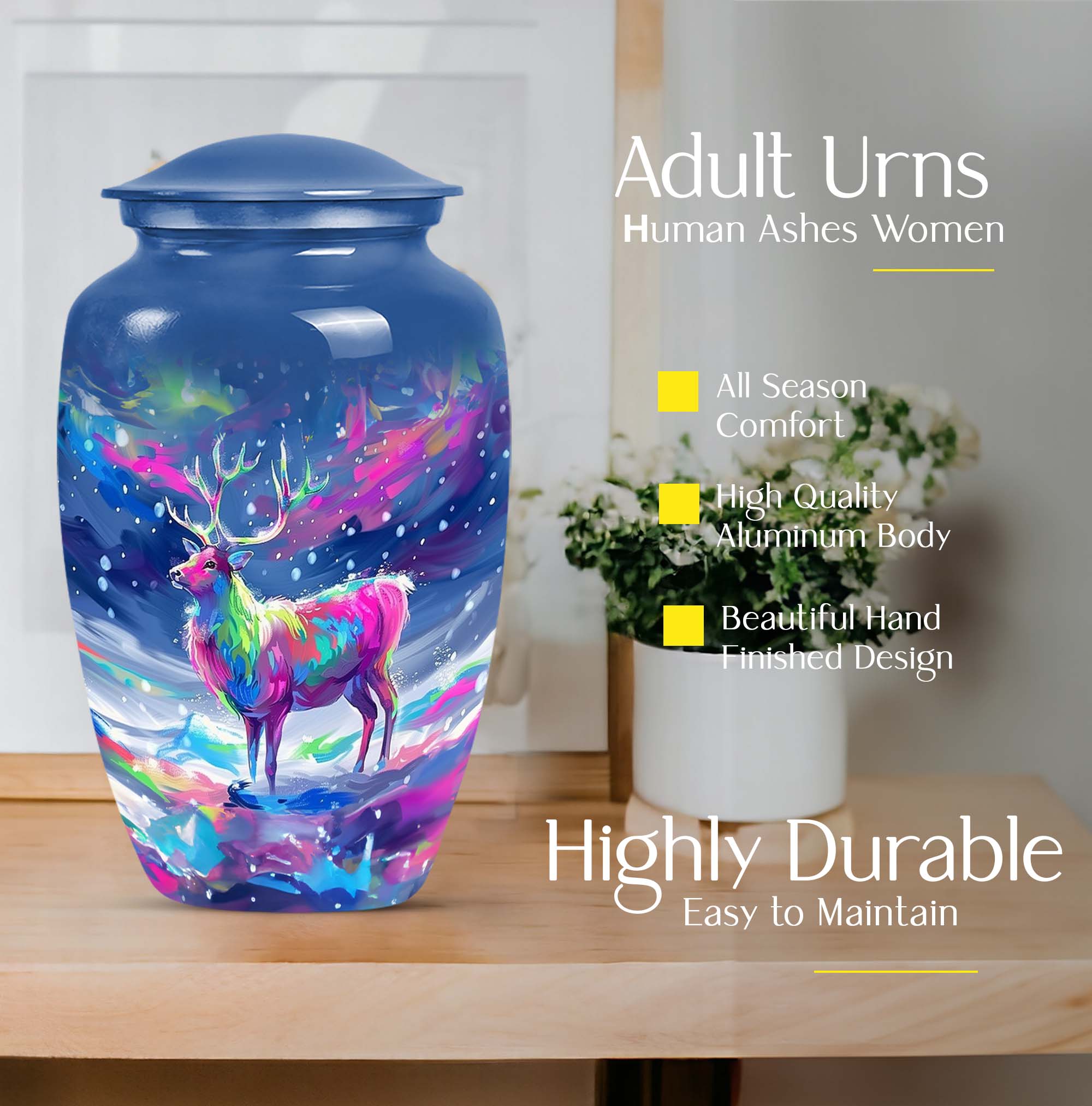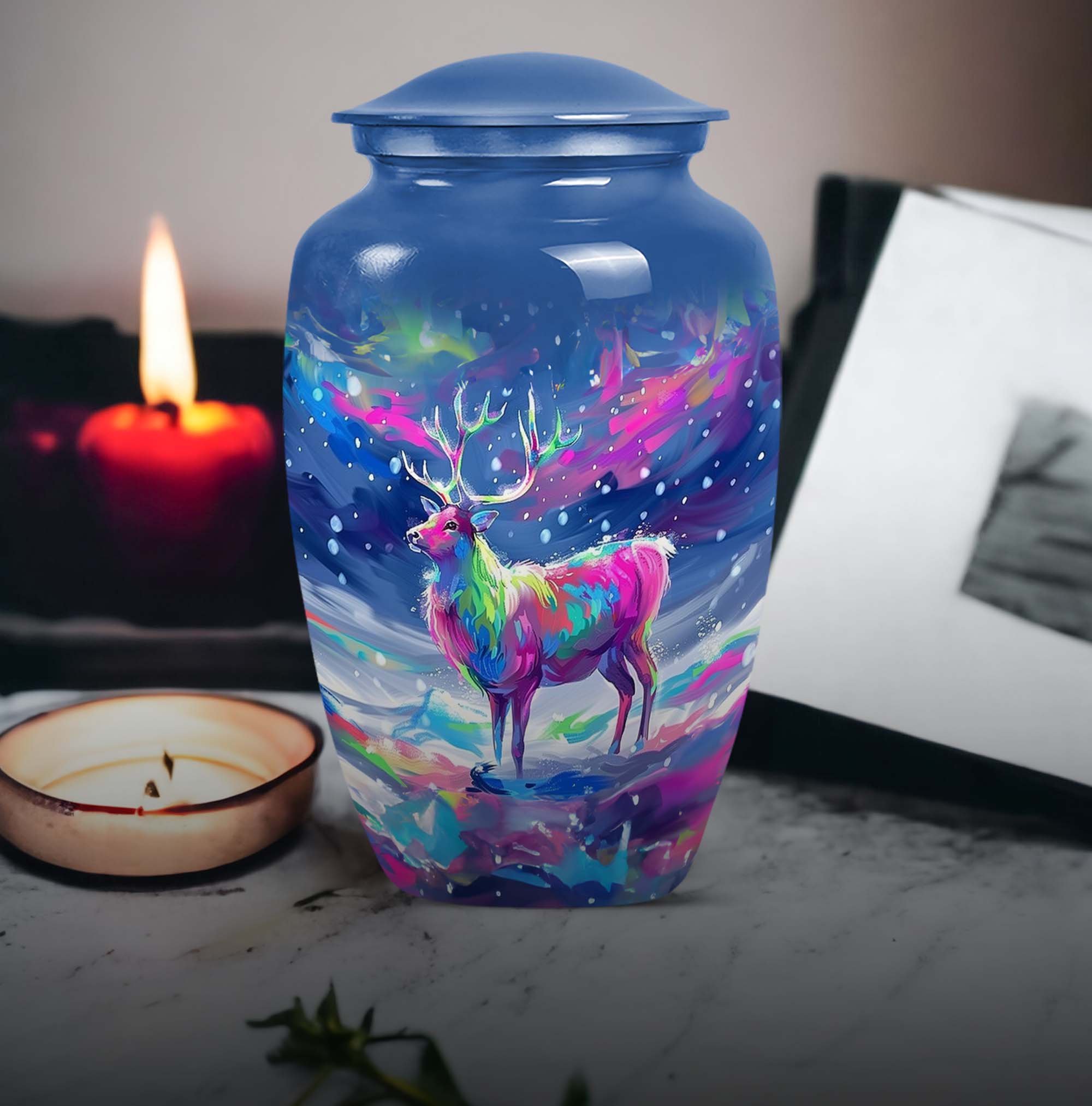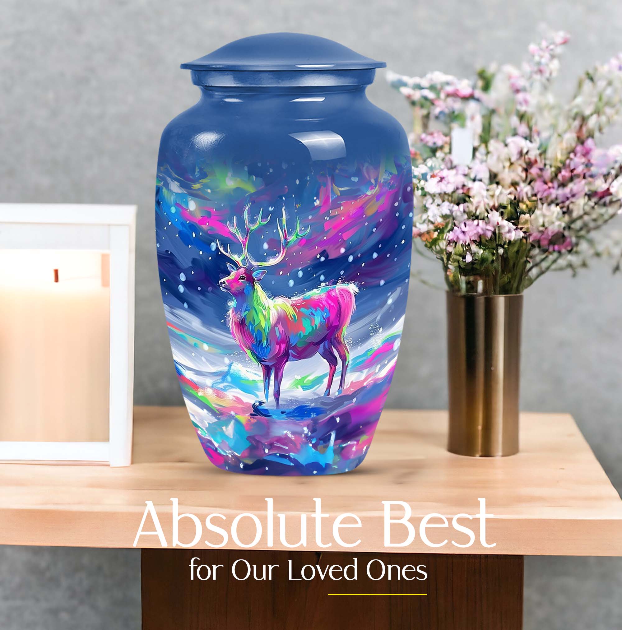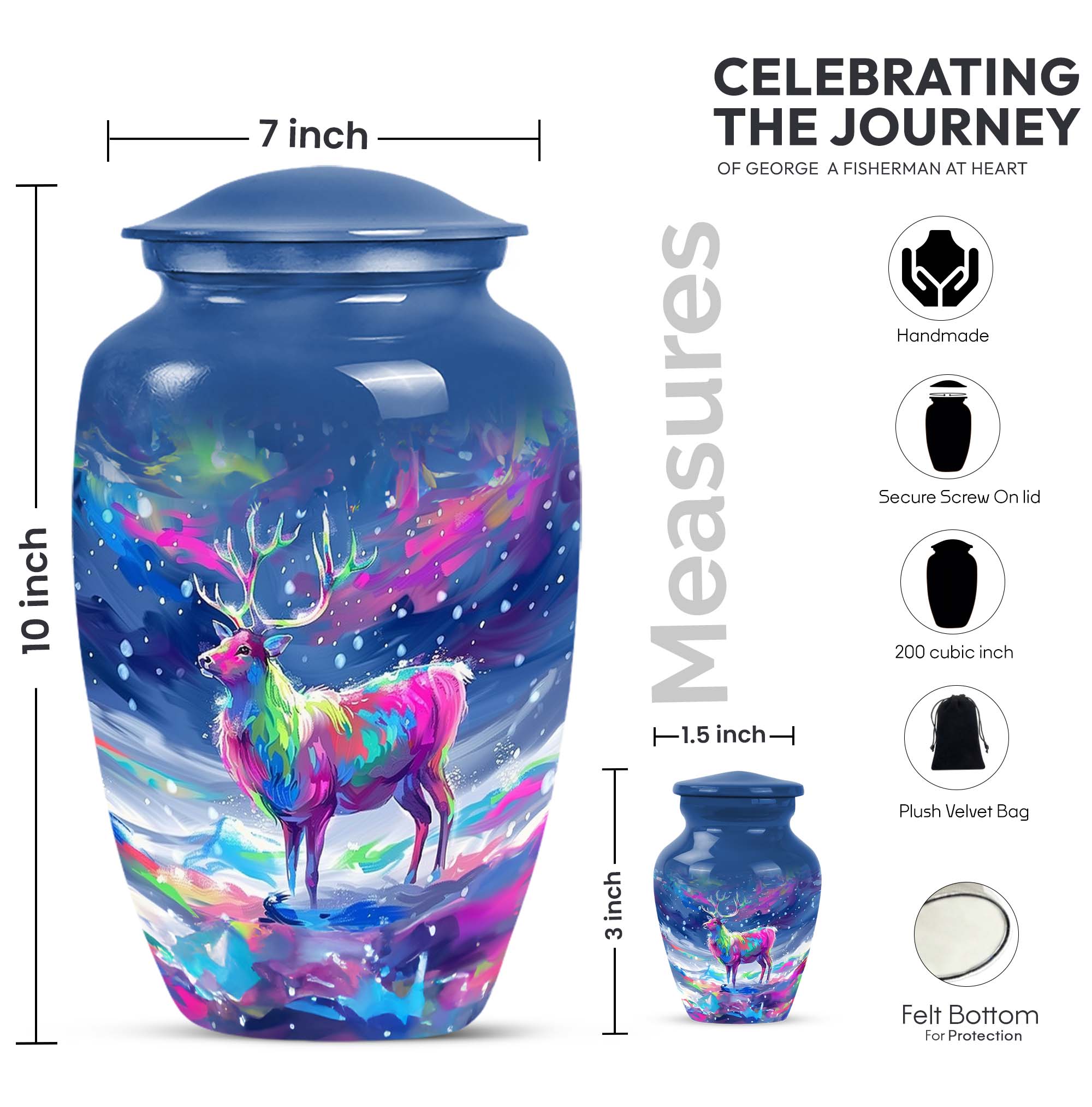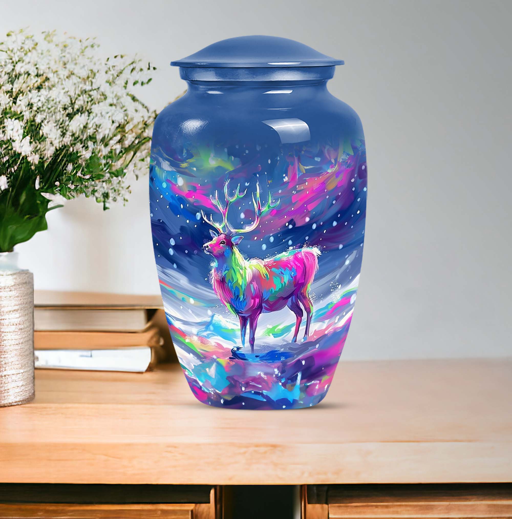 Meet our remarkable moose walking urn, exuding a timeless and abstract theme. This unique piece serves as a memorial funeral urn, a perfect resting place for your loved ones. With a size of 10 inches, this large urn adds an unprecedented depth of emotion and respect to a memorial ceremony. It's made from premium quality aluminium, ensuring durability and a lasting legacy. The urn weighs a substantial 3.3 pounds and carries a capacity of 200 cubic inches, adequately accommodating the ashes. Adding to its uniqueness, the urn allows for personalization; engraved names can be added for that personalized touch. Each purchase includes a velvet pouch for dignified containment of ashes. Designed with meticulous detail, this urn is not just a receptacle but a symbol of love and memory. You would be hard-pressed to find a cremation urn that combines style, function, and sentiment as compellingly as this. Notably, these funeral urns for burial, and urns for human ashes make a fitting tribute to anyone’s final disposition journey, and especially befitting for a mom cremation urn.